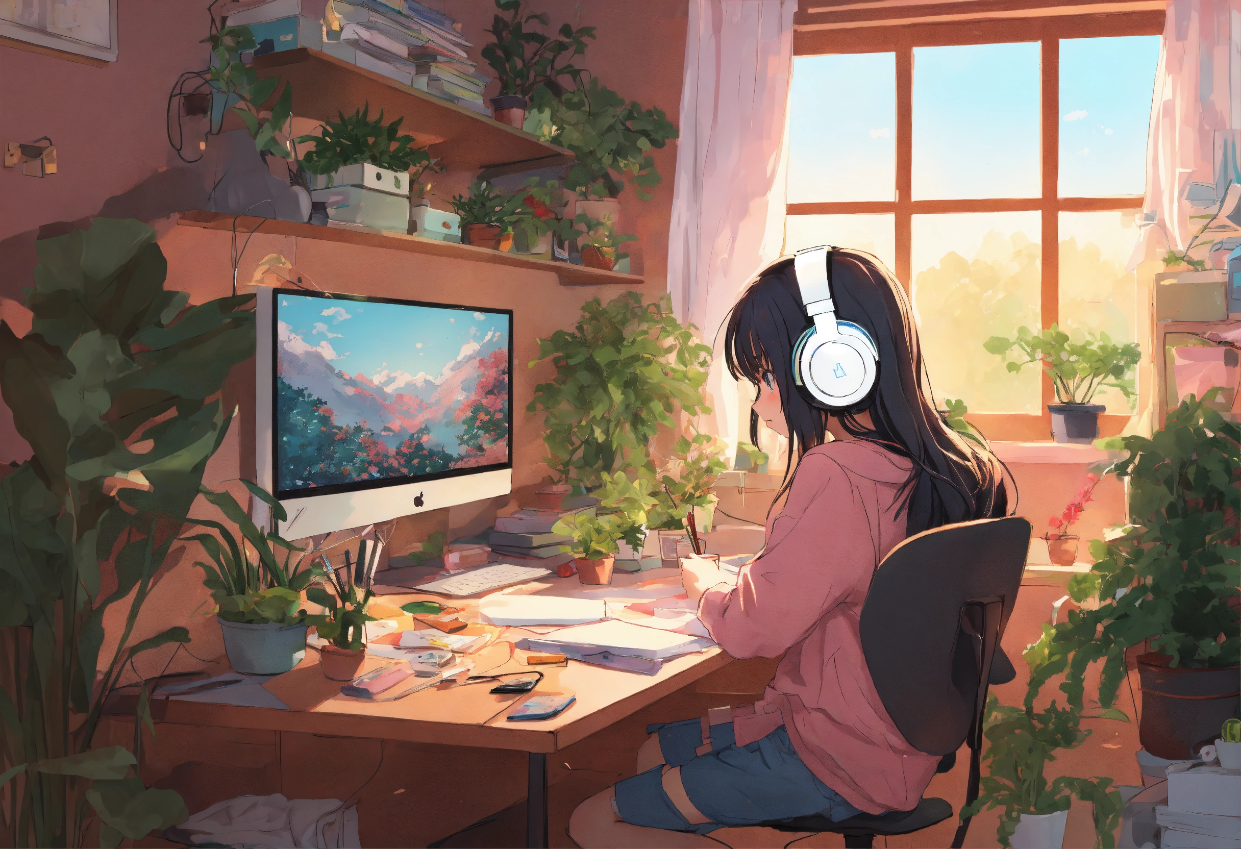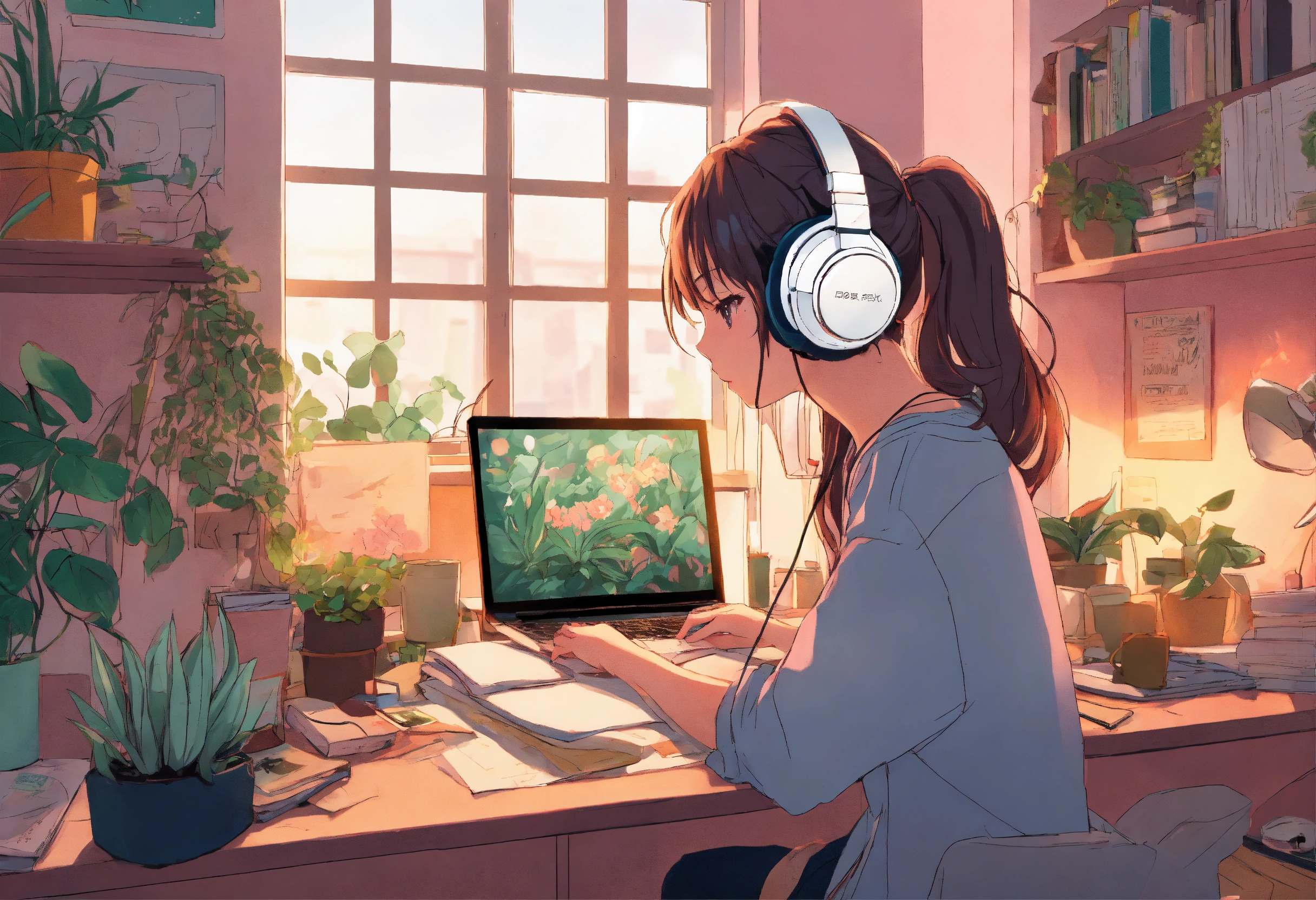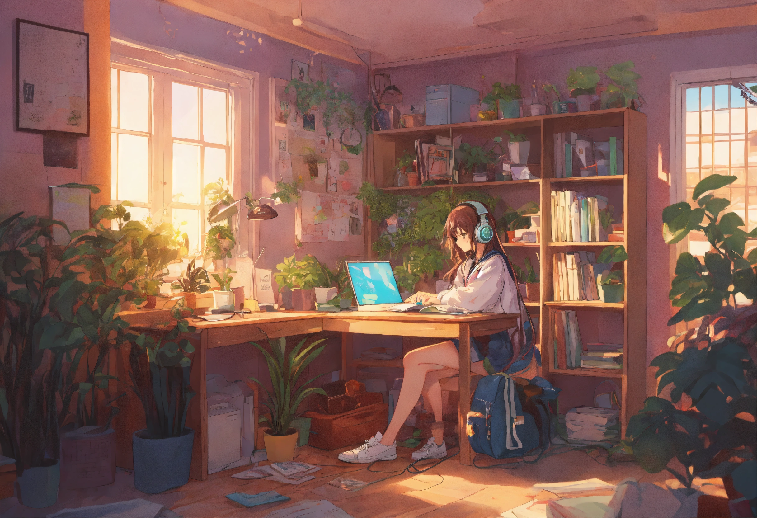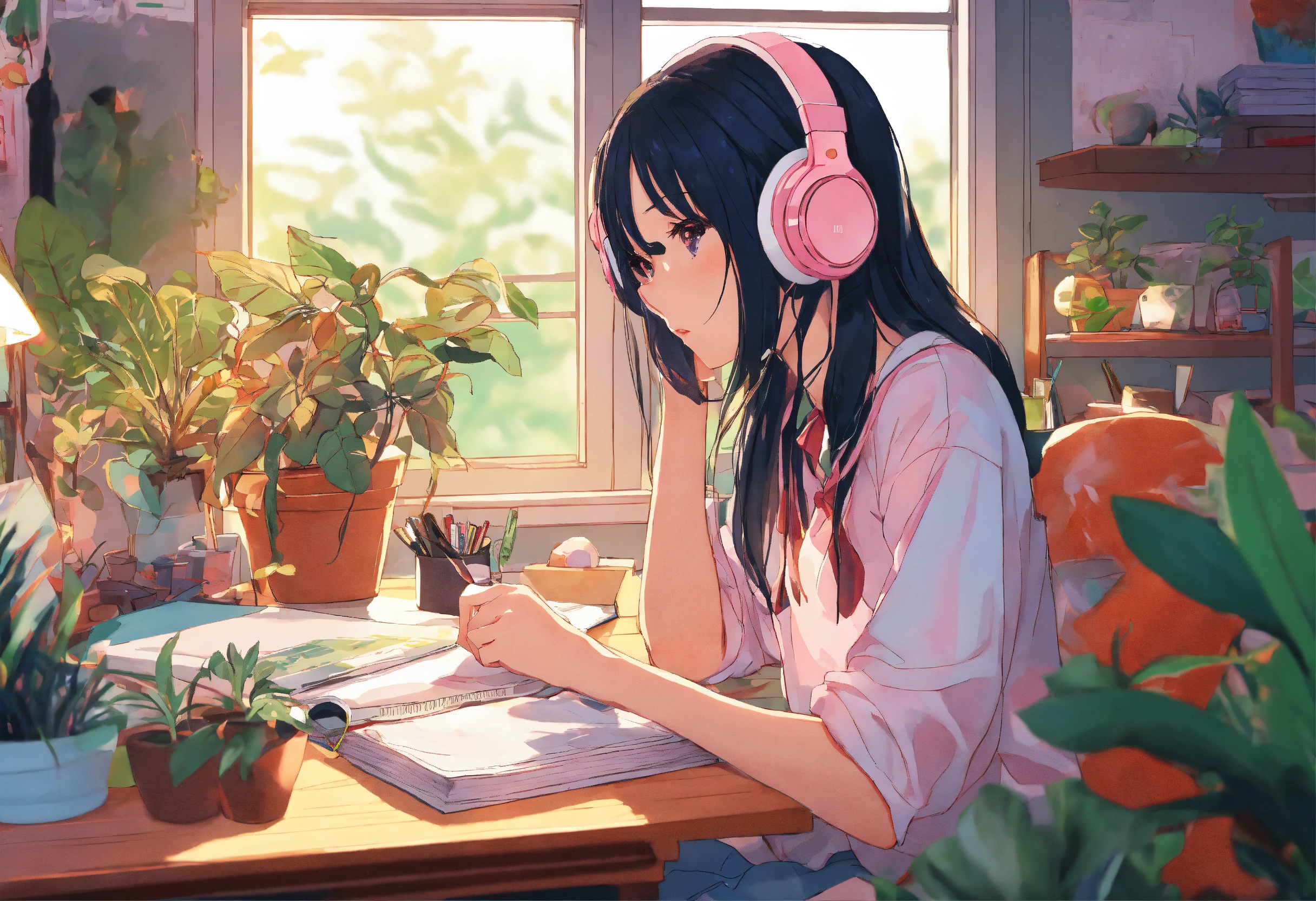 Anime girl at, her desk in the college dorm doing homework with headphones on pastel colors highly detailed, lots of plants and messy room