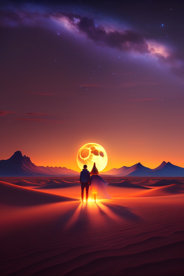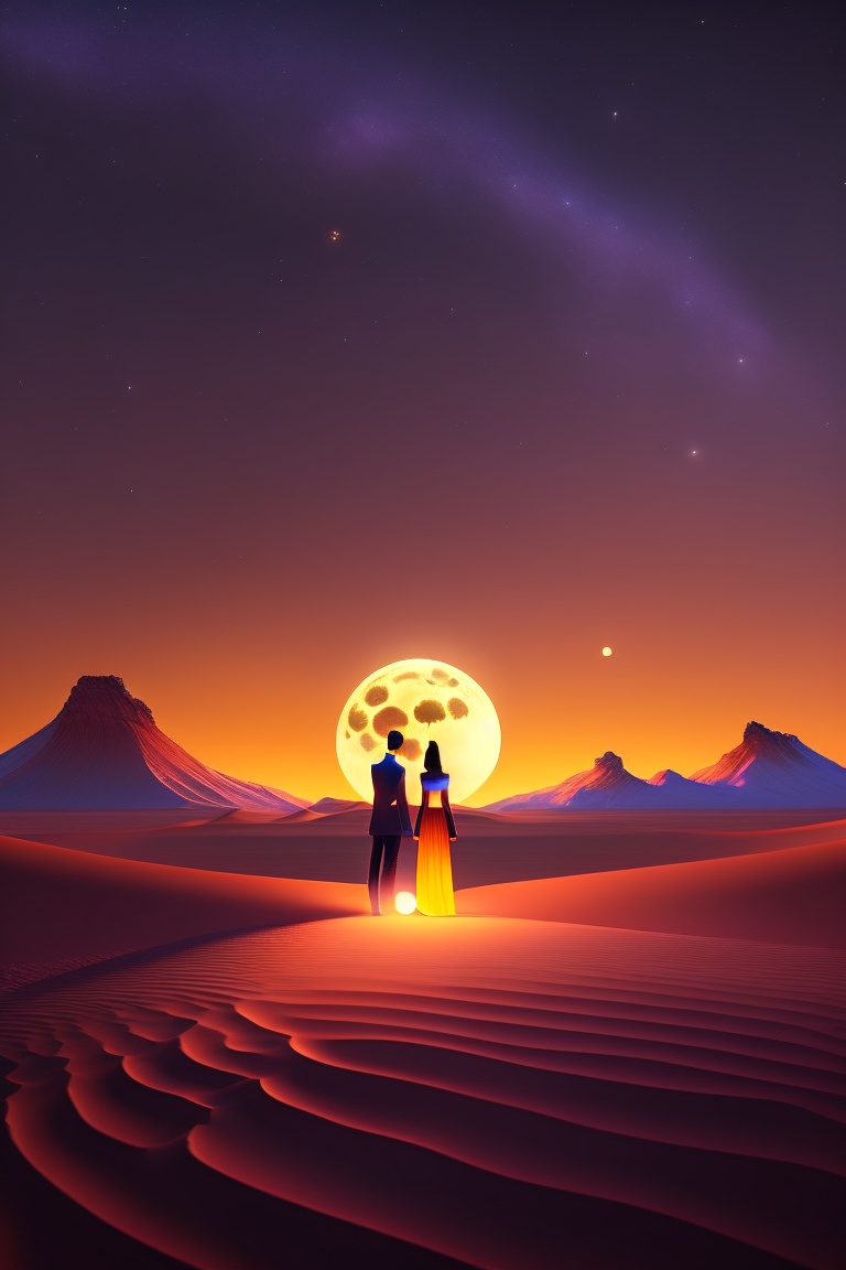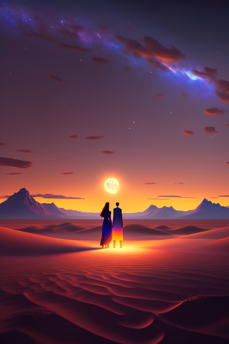 A vast, lonely desert under a starlit sky, shadows dancing in the soft glow of the moon. a couple stands amid this desolation, their faces a mix of determination and apprehension. show their faces. animation style: 3d animation and cel-shading.