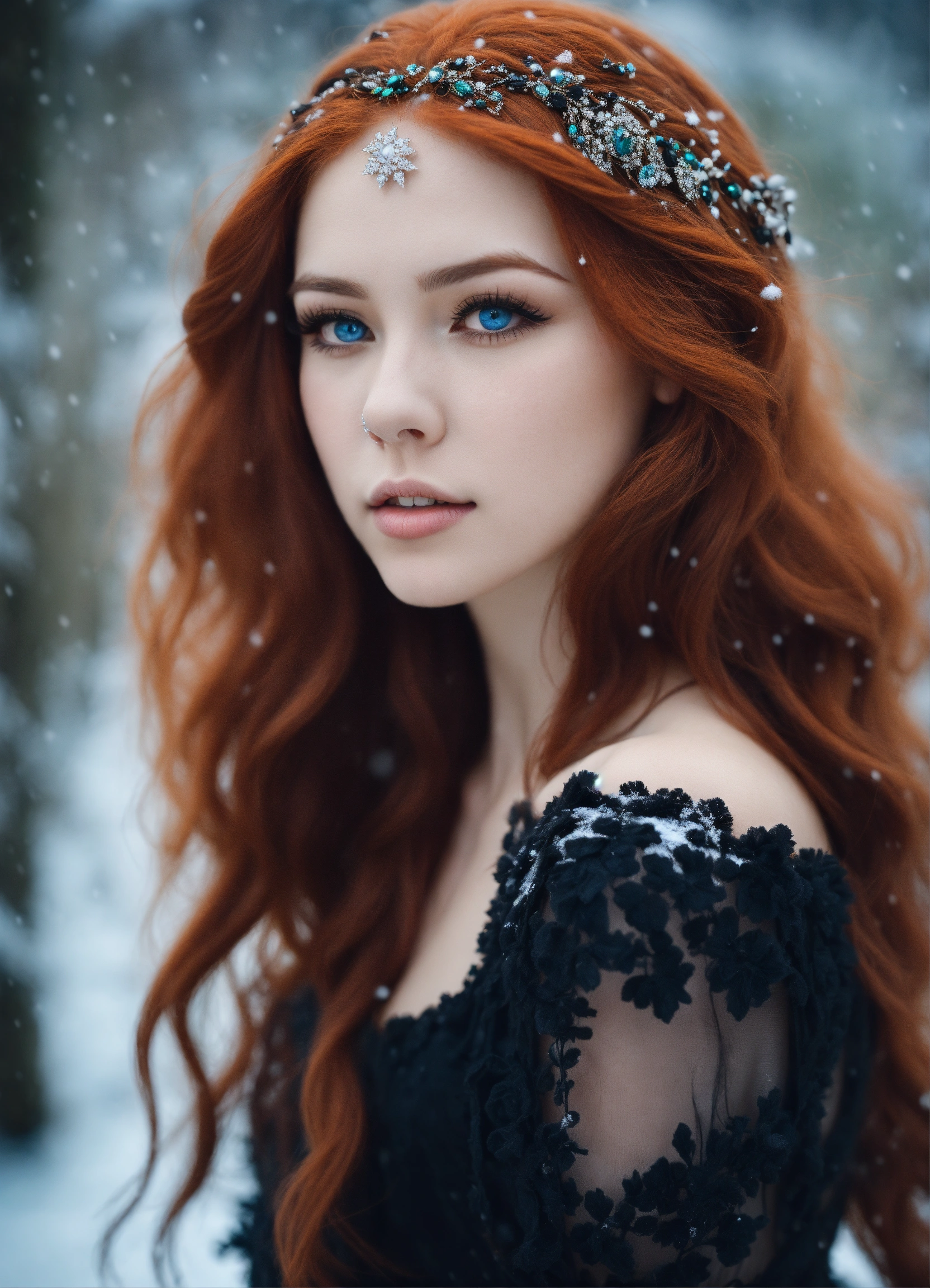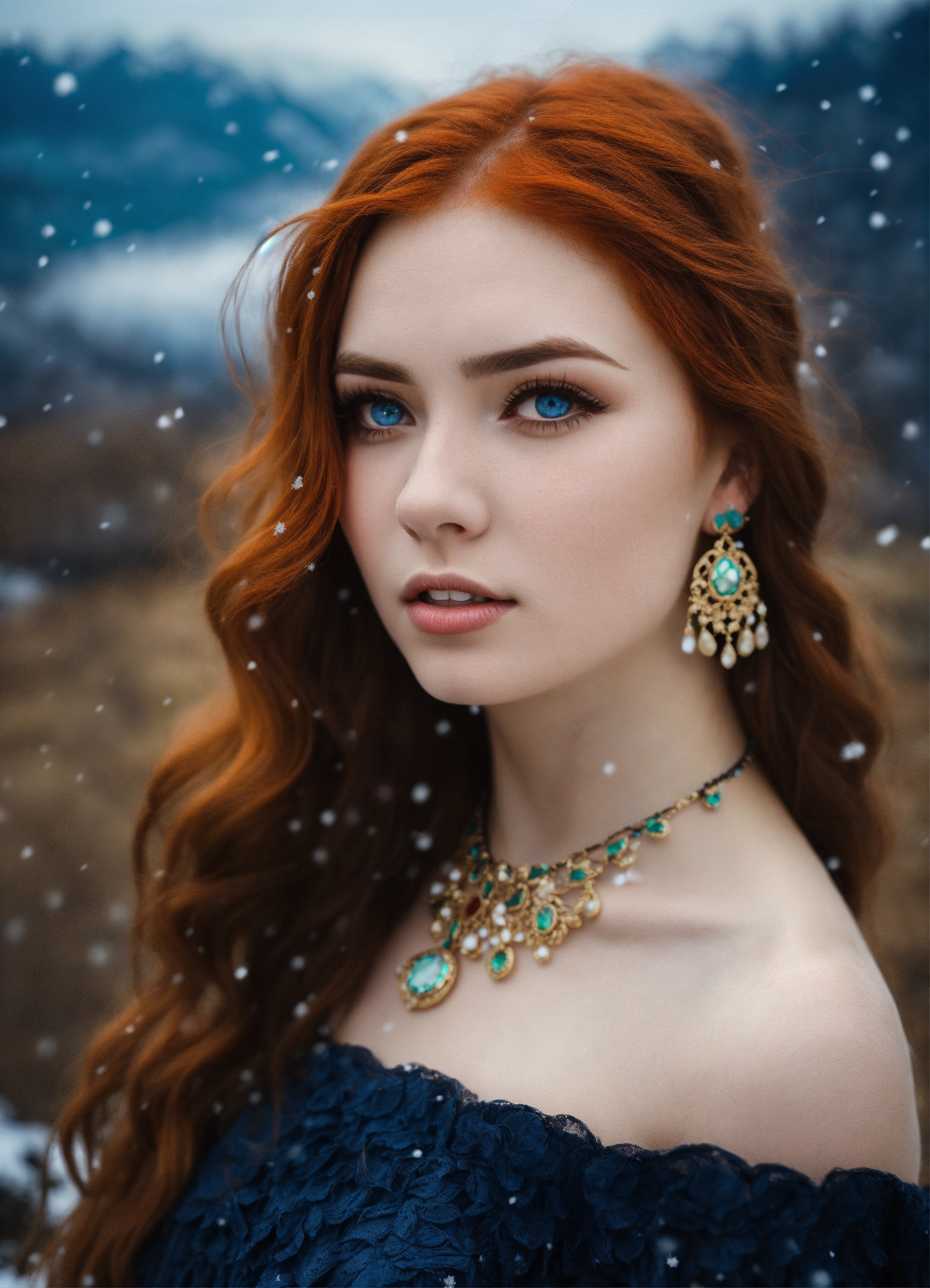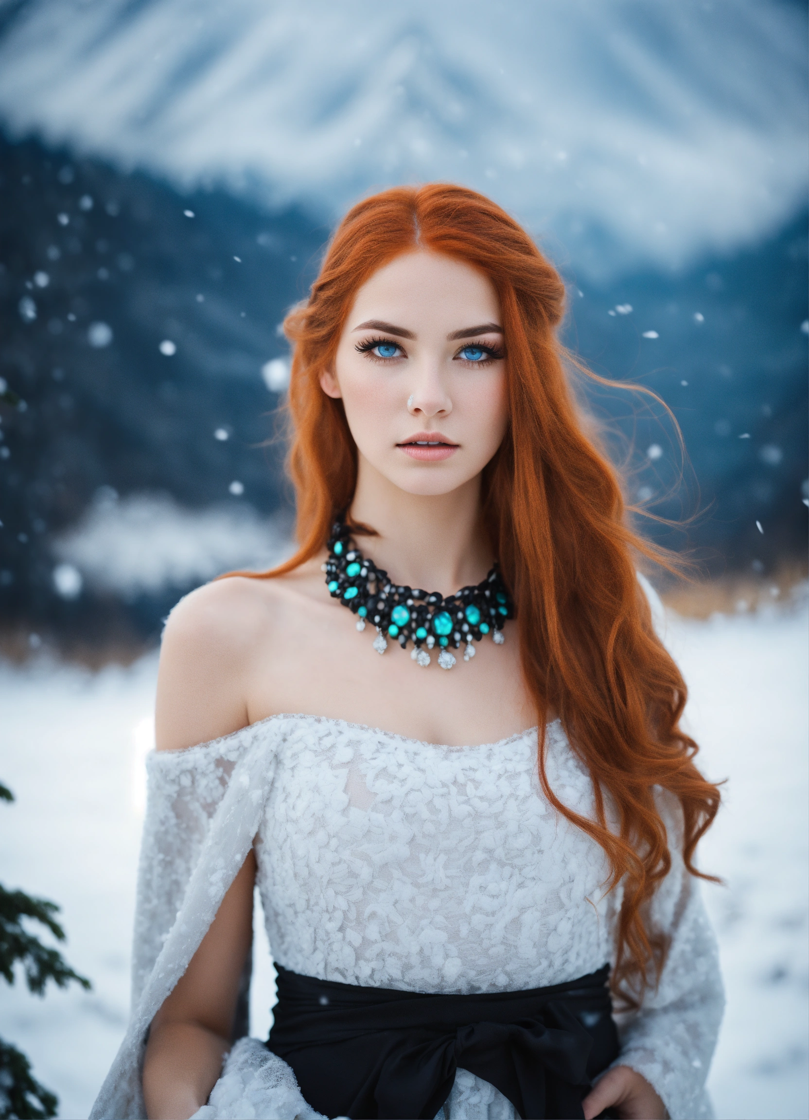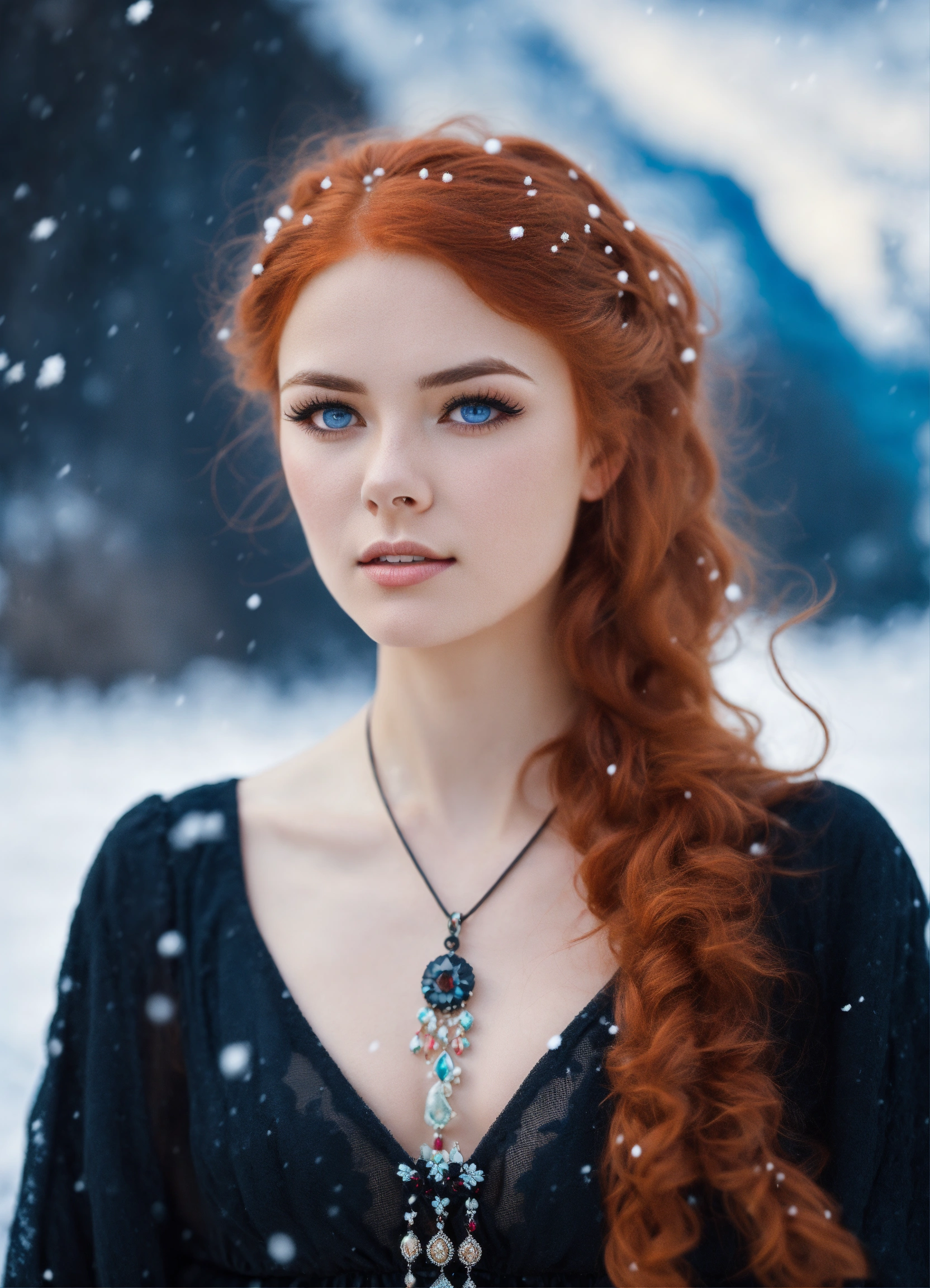 Beautiful red hairs girl with blue eyes and extremely white fair skin and big eye lashes and black eyebrows, wearing jewellery, and wearing black dress, background of snowfall with mountains