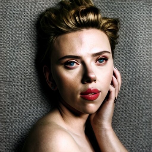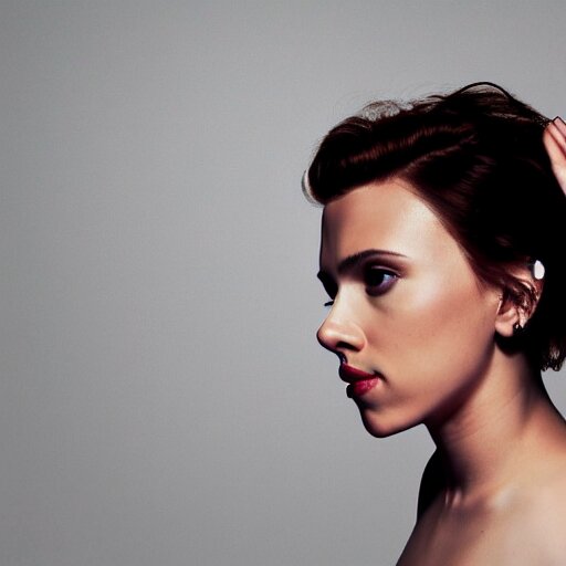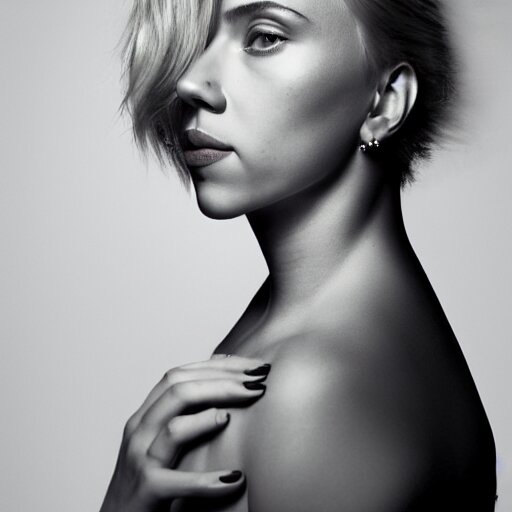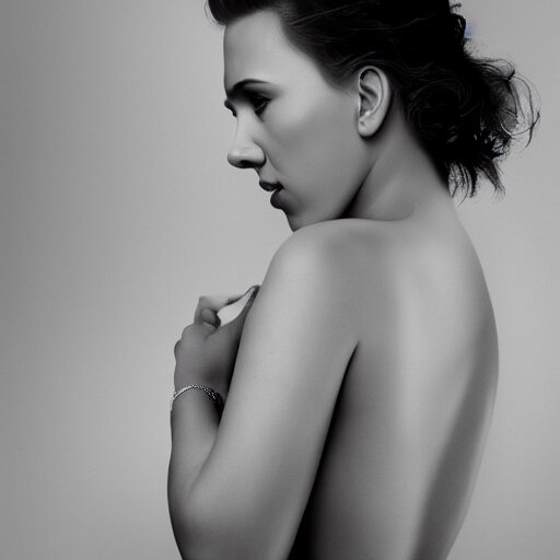Beautiful portrait photo of scarlett johansson, 85mm, white studio backdrop. she is bending over to pick something important up. you cannot see her face in the image.