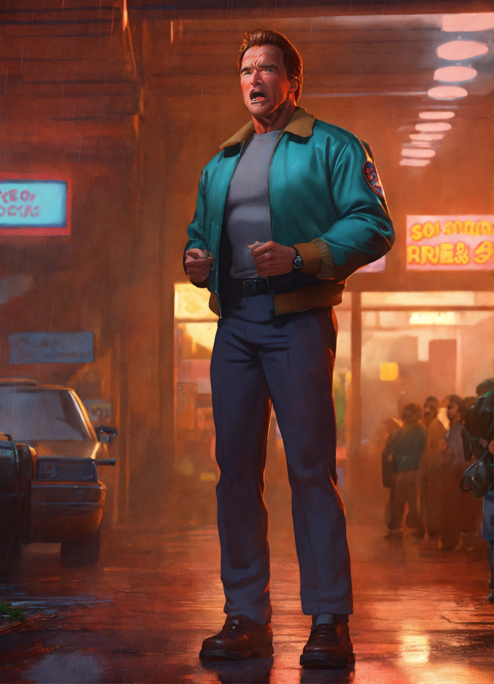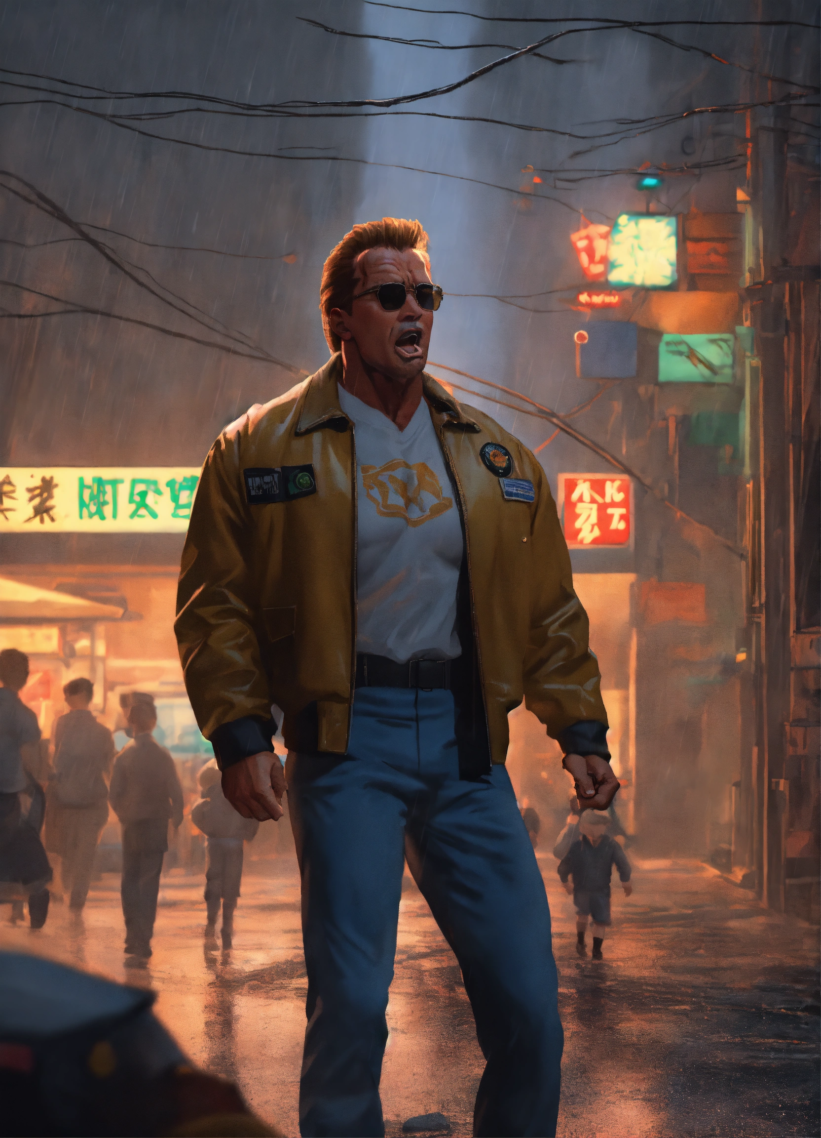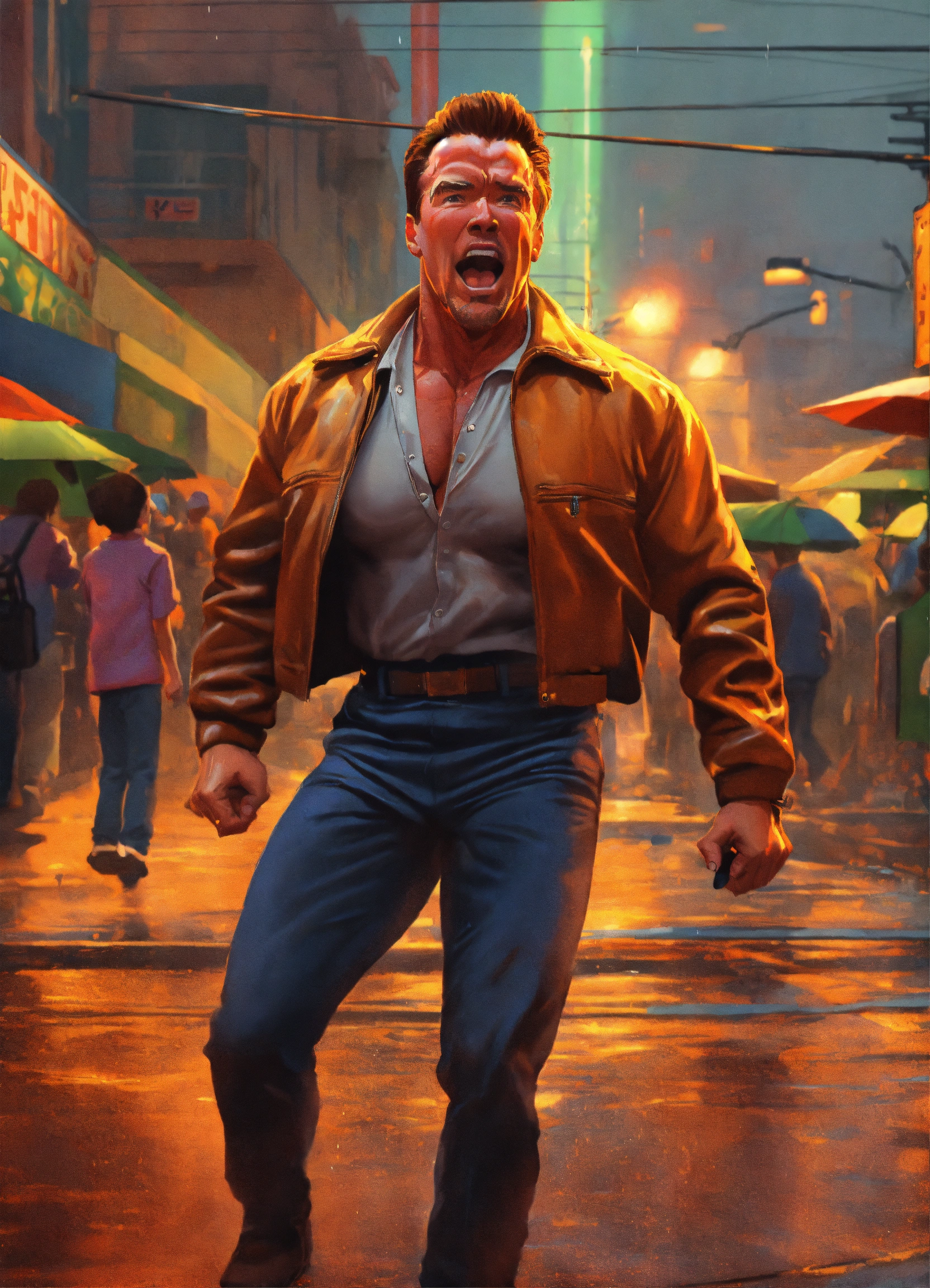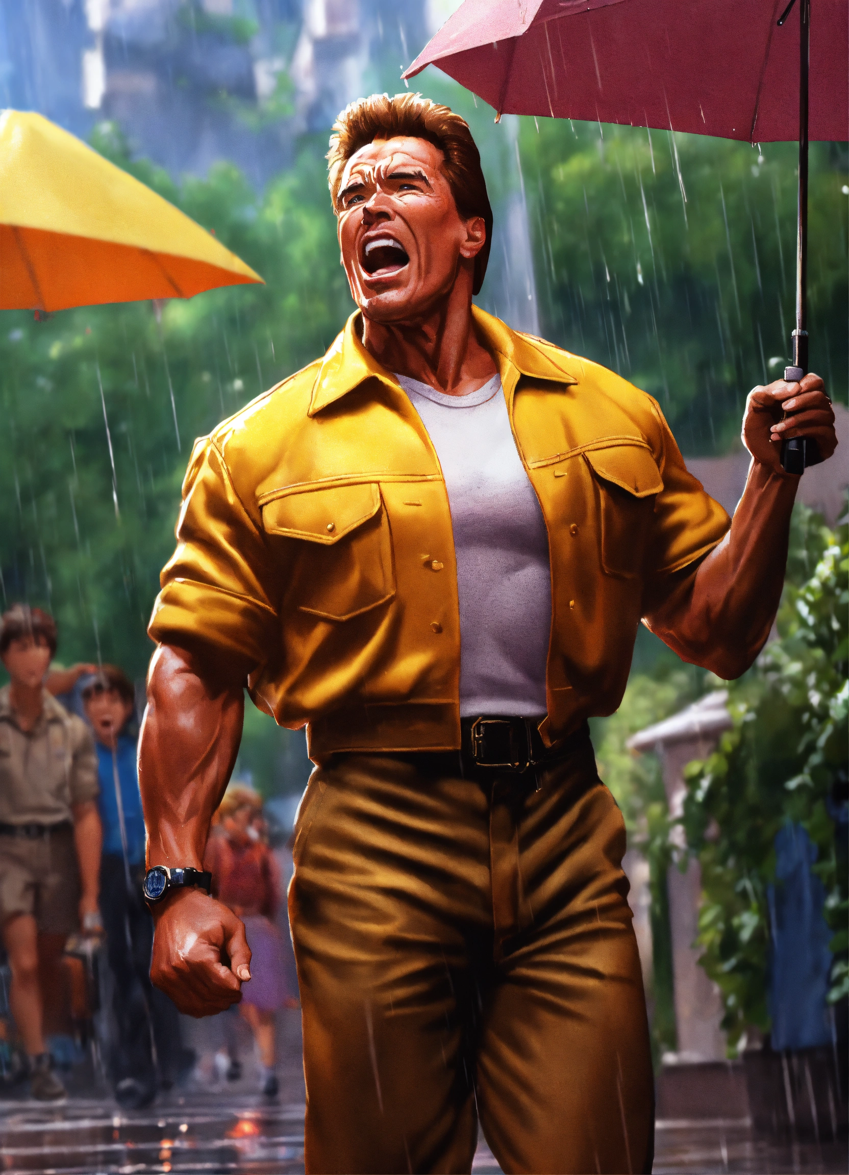 Arnold schwarzenegger, yelling, t's not a tumor, kindergarten cop, illustrator, stunningg details, full body, trending on artstation, rainy day, ray-traced environment, vintage 90's anime artwork, stunning lighting