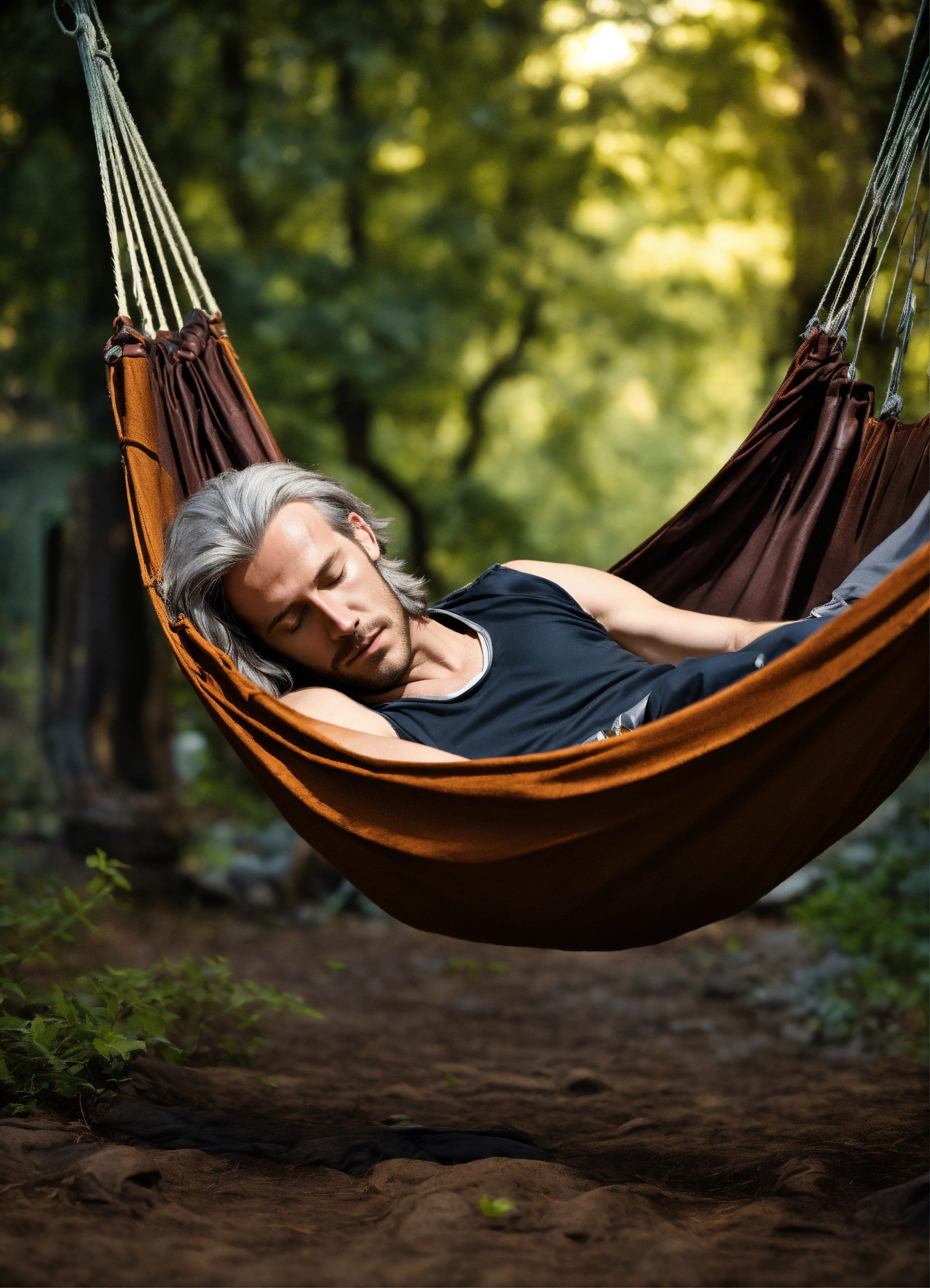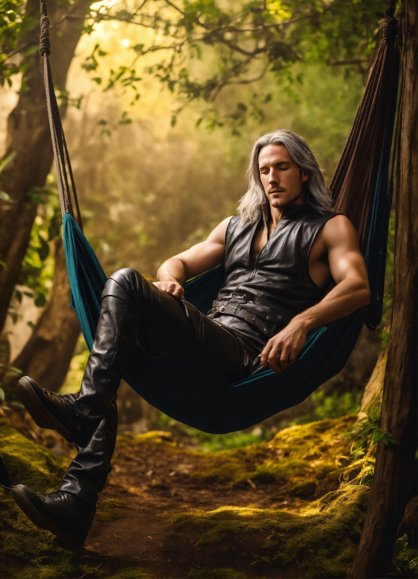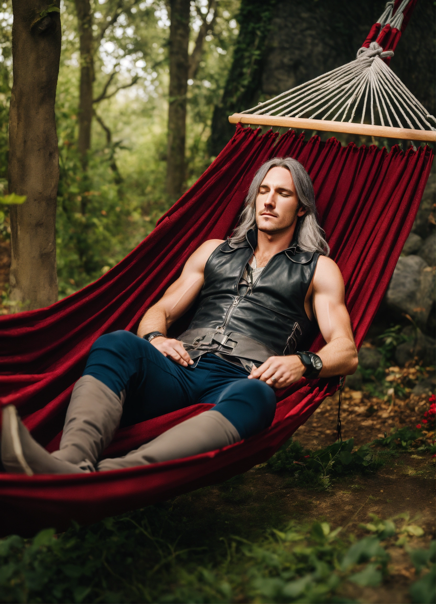 In photographic style matt mercer as a tall long distance runner with long straight gray hair wearing sleeveless leather vest lying prone asleep in a medieval hammock