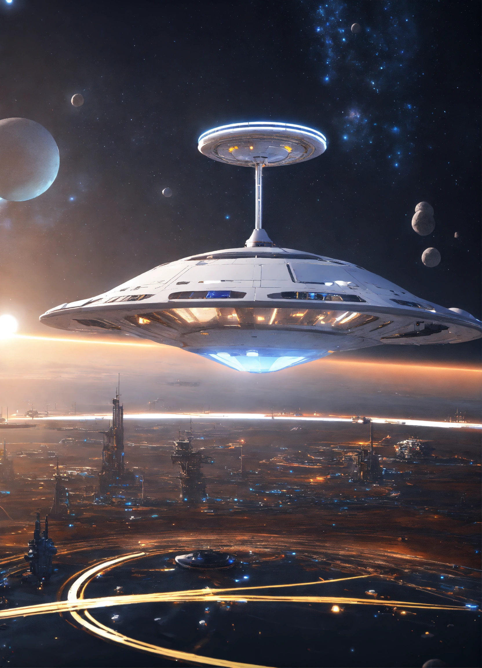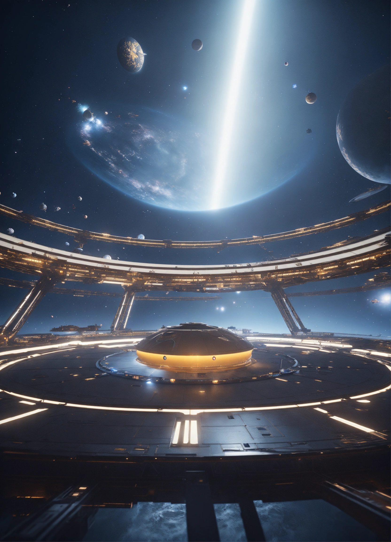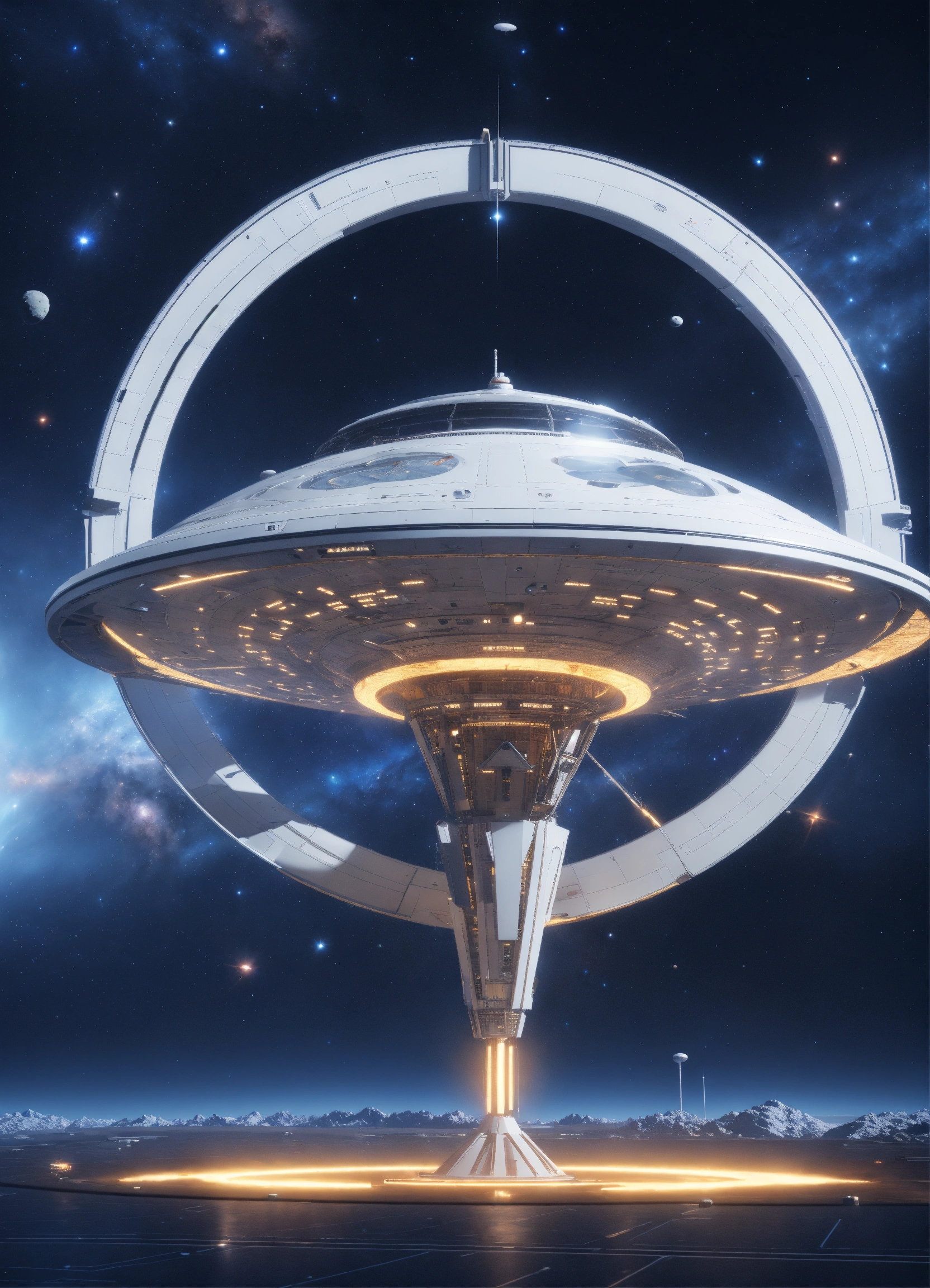 Beautiful white disc shaped spaceport hub flying floating in deep space, artificial star, futuristic, sci-fi, 8k, unreal engine, pixar