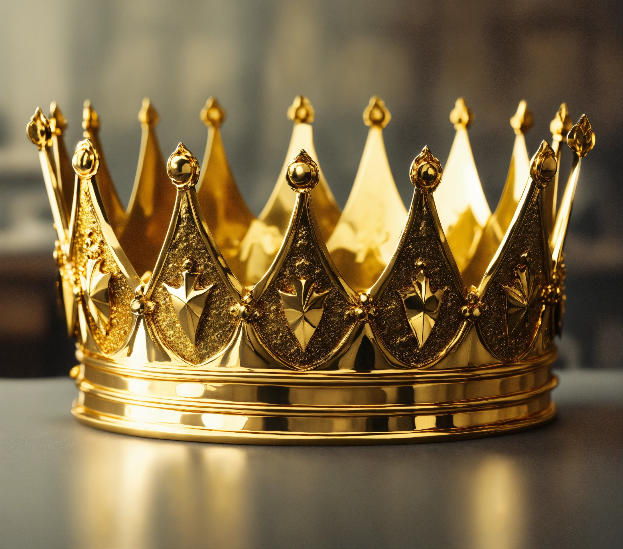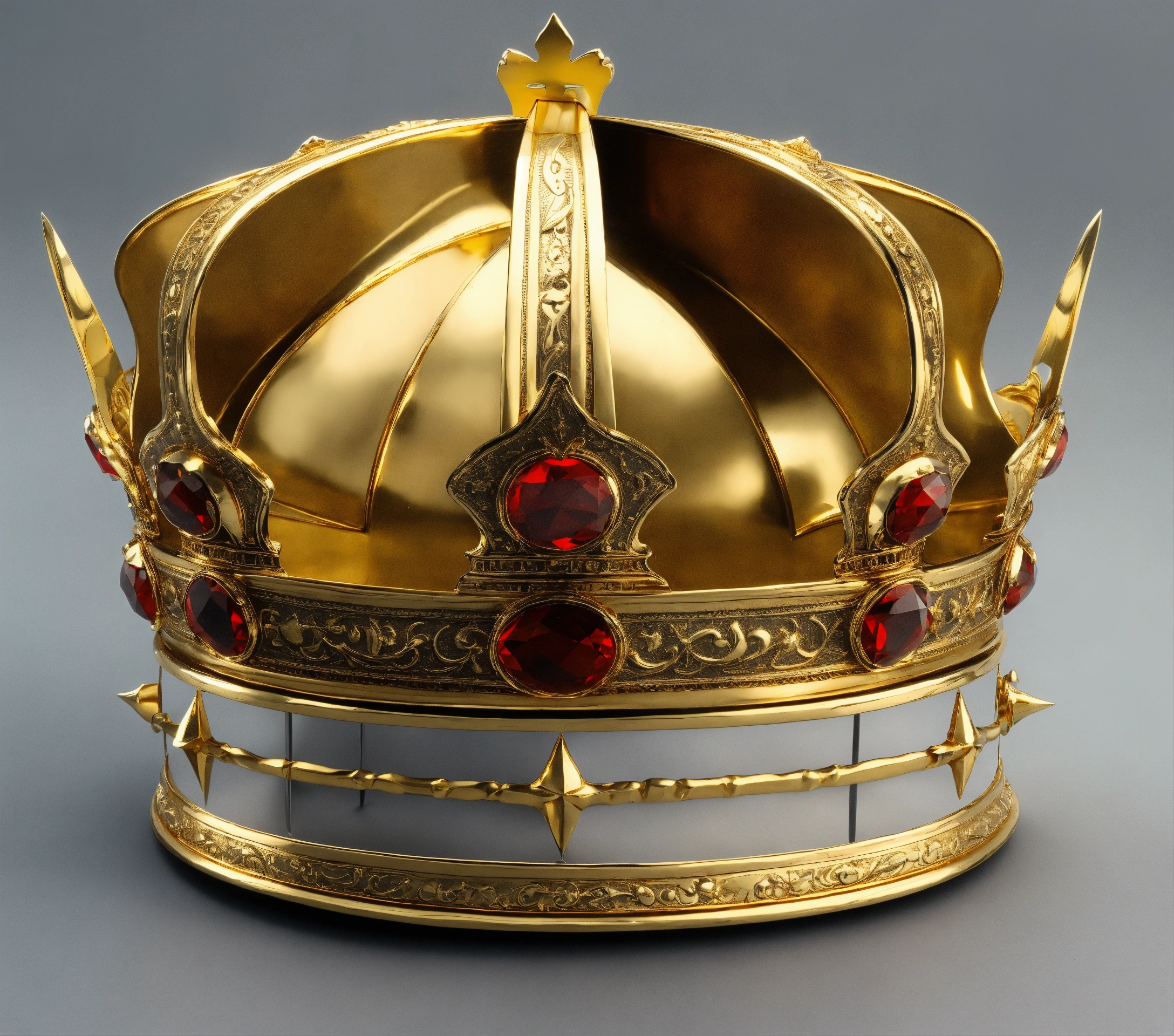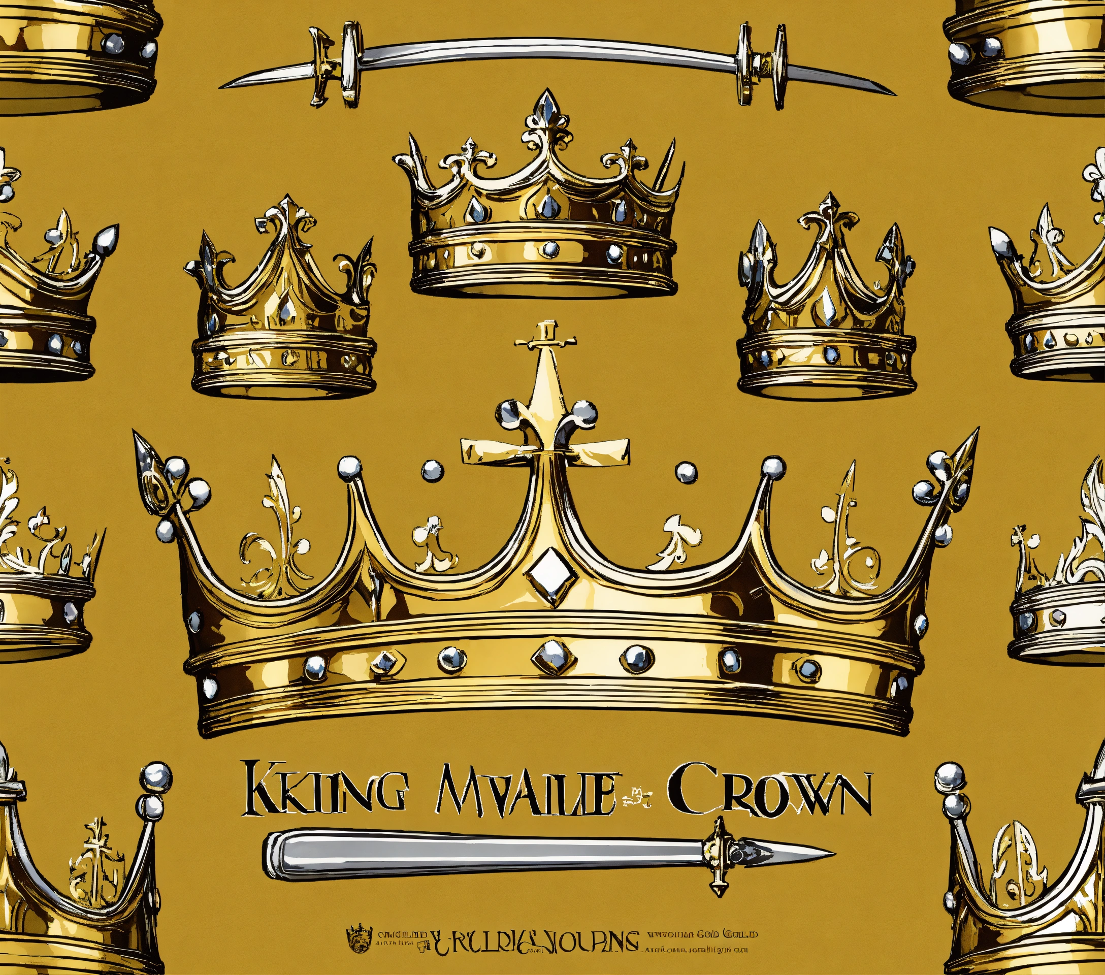 Create a medieval king crown plain gold, white background, plain gold crown, with 5 sword tips, shape like sword the tips of it