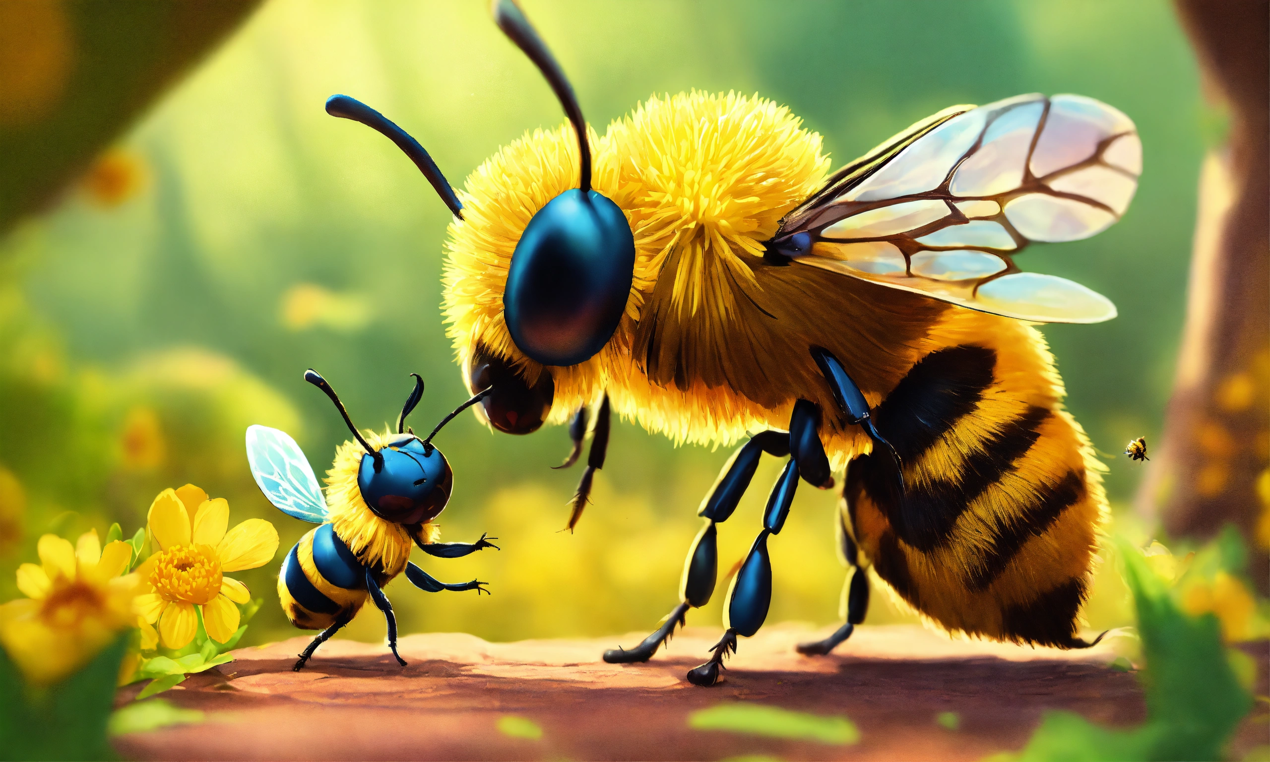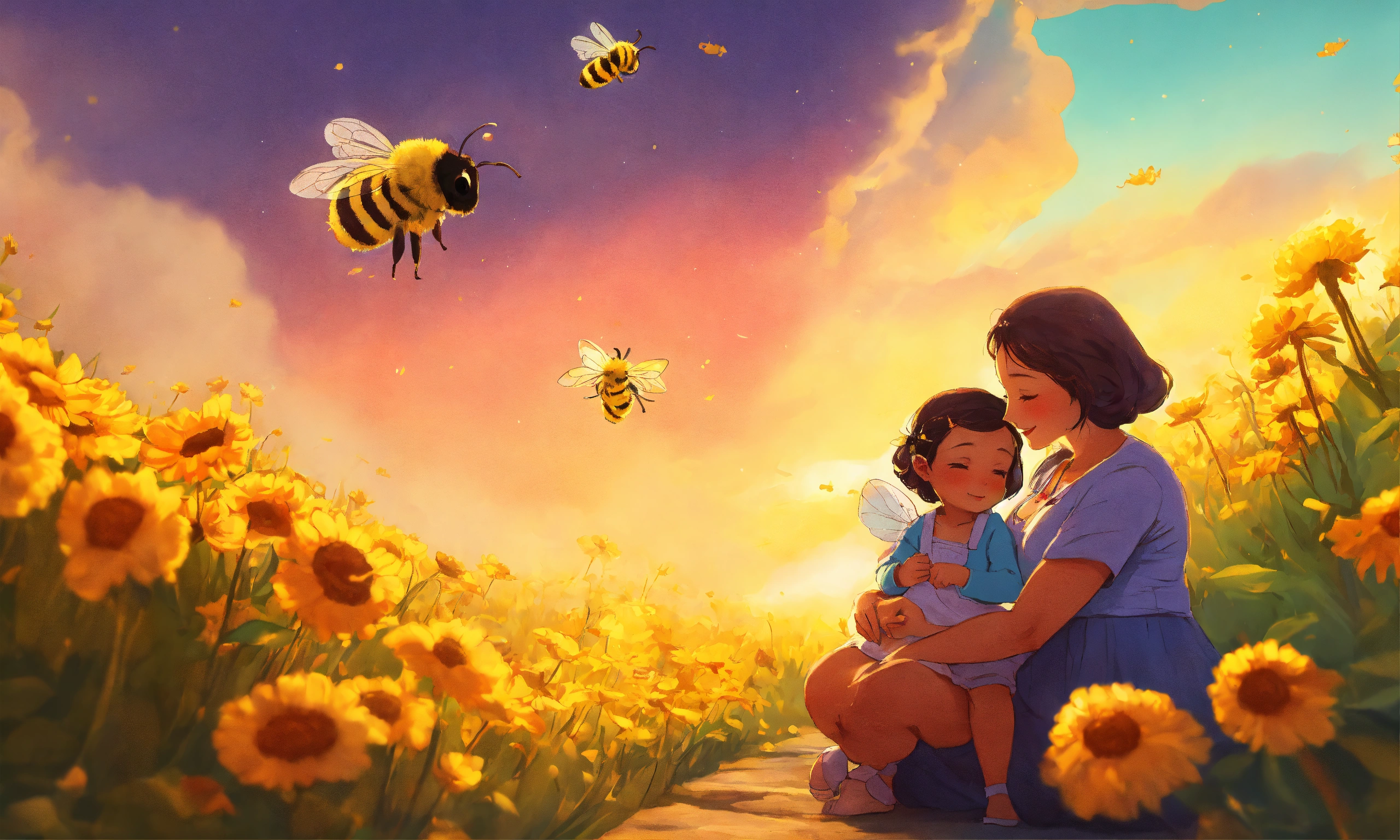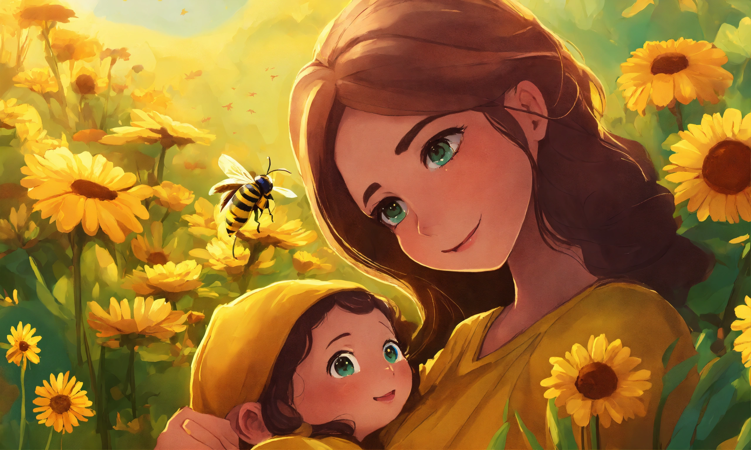 Abeja maya y su mamá abrazándose en la entrada de la colmena, mostrando su cariño mutuo, vibrant, dibujo para niños, 8k