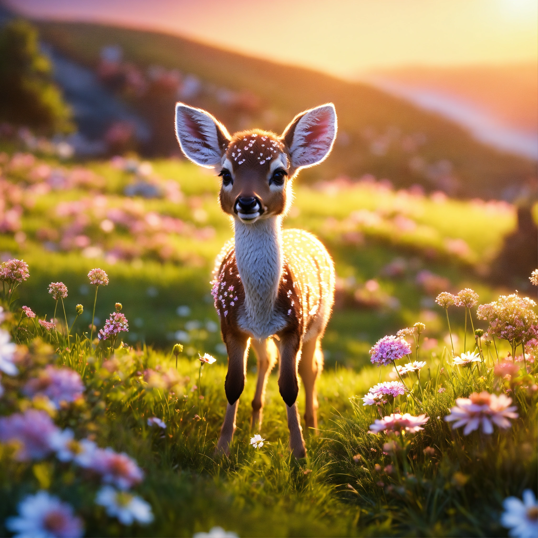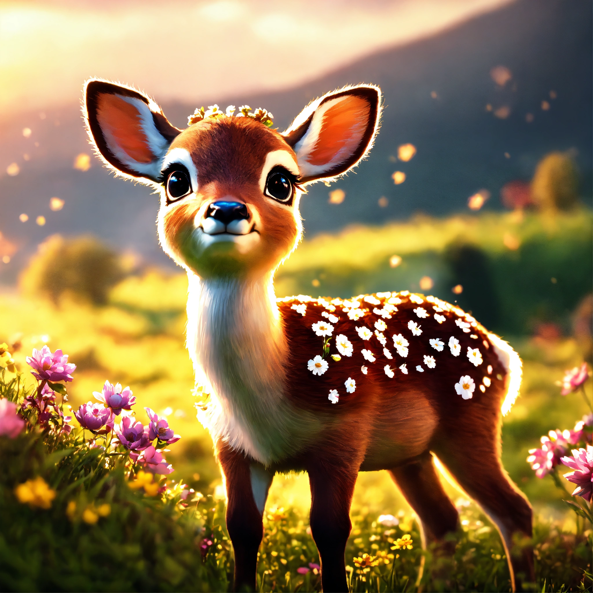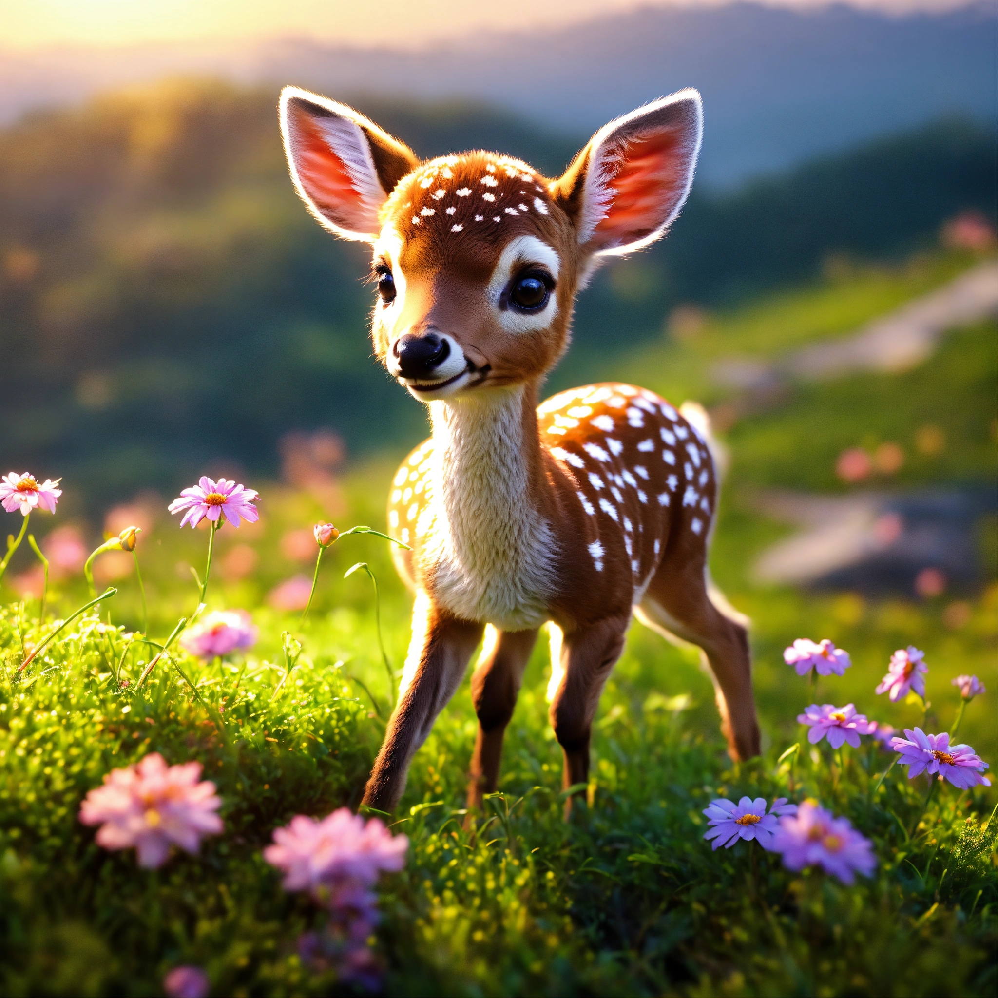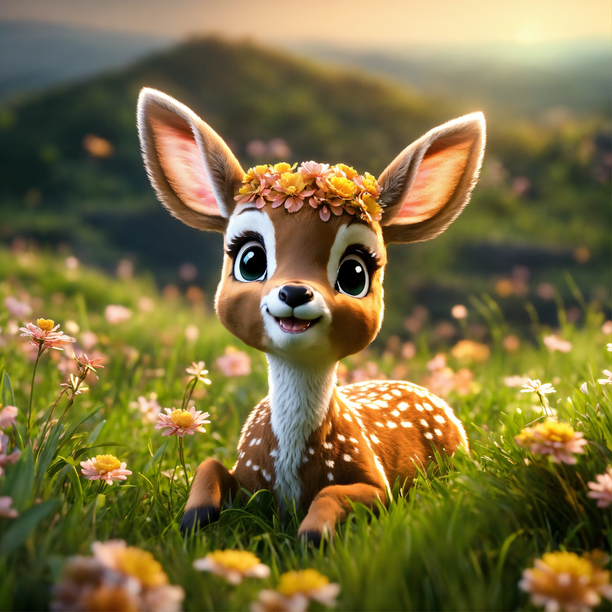 Cute, happy, smiling, baby, deer, on top of grassy, flowers, hill, realistic, unreal engine render, cinematic, backlight, 4k
