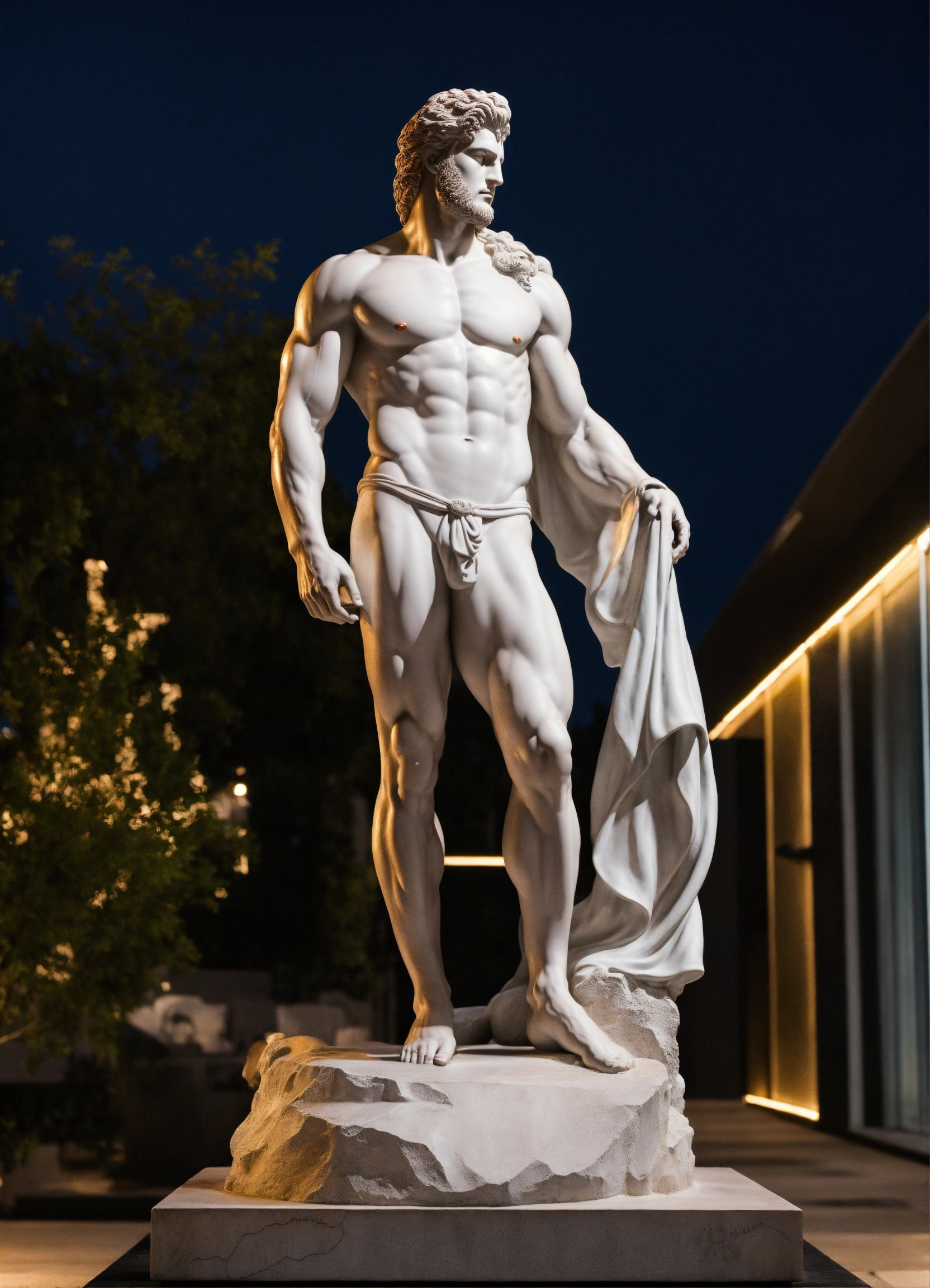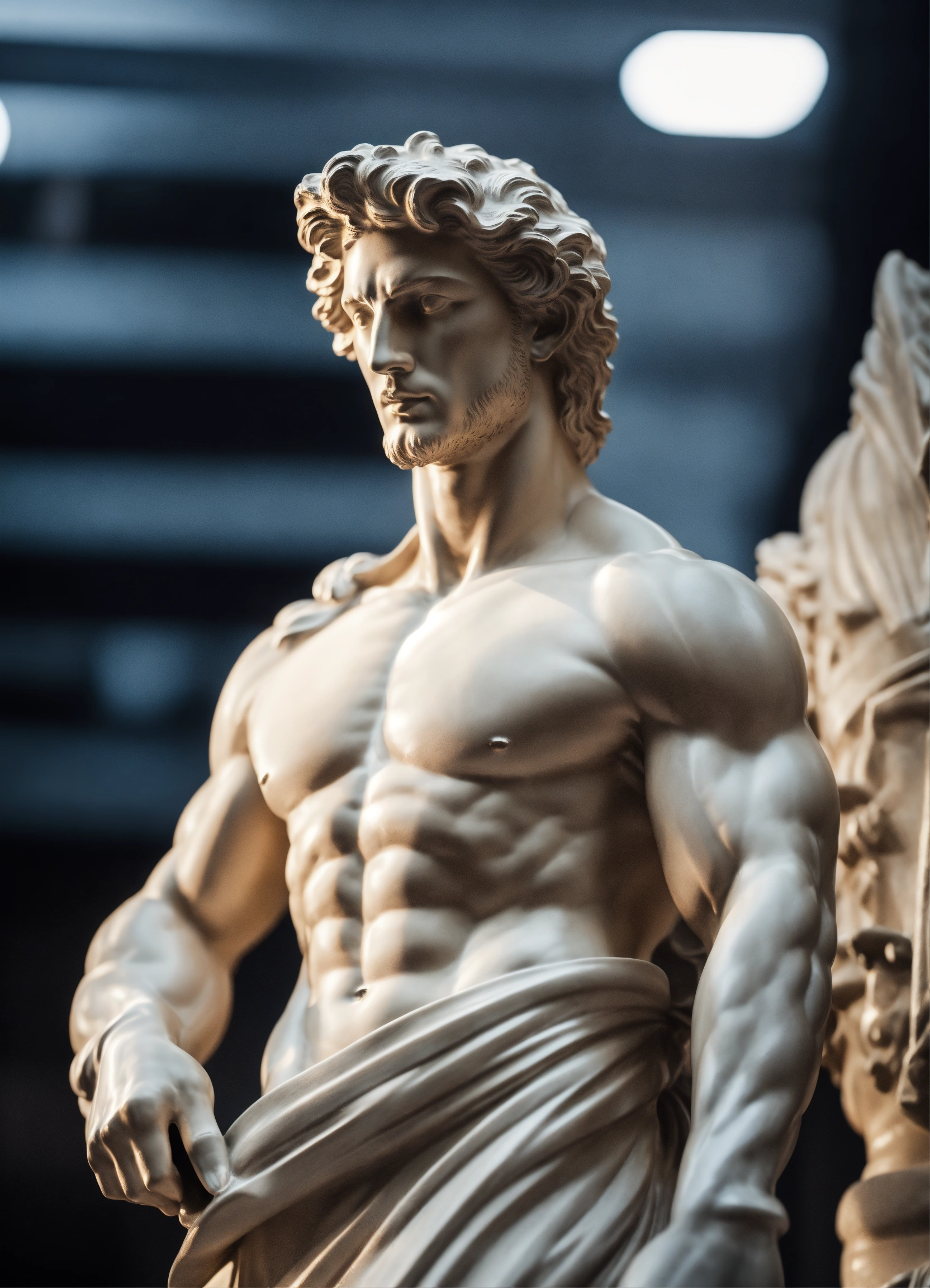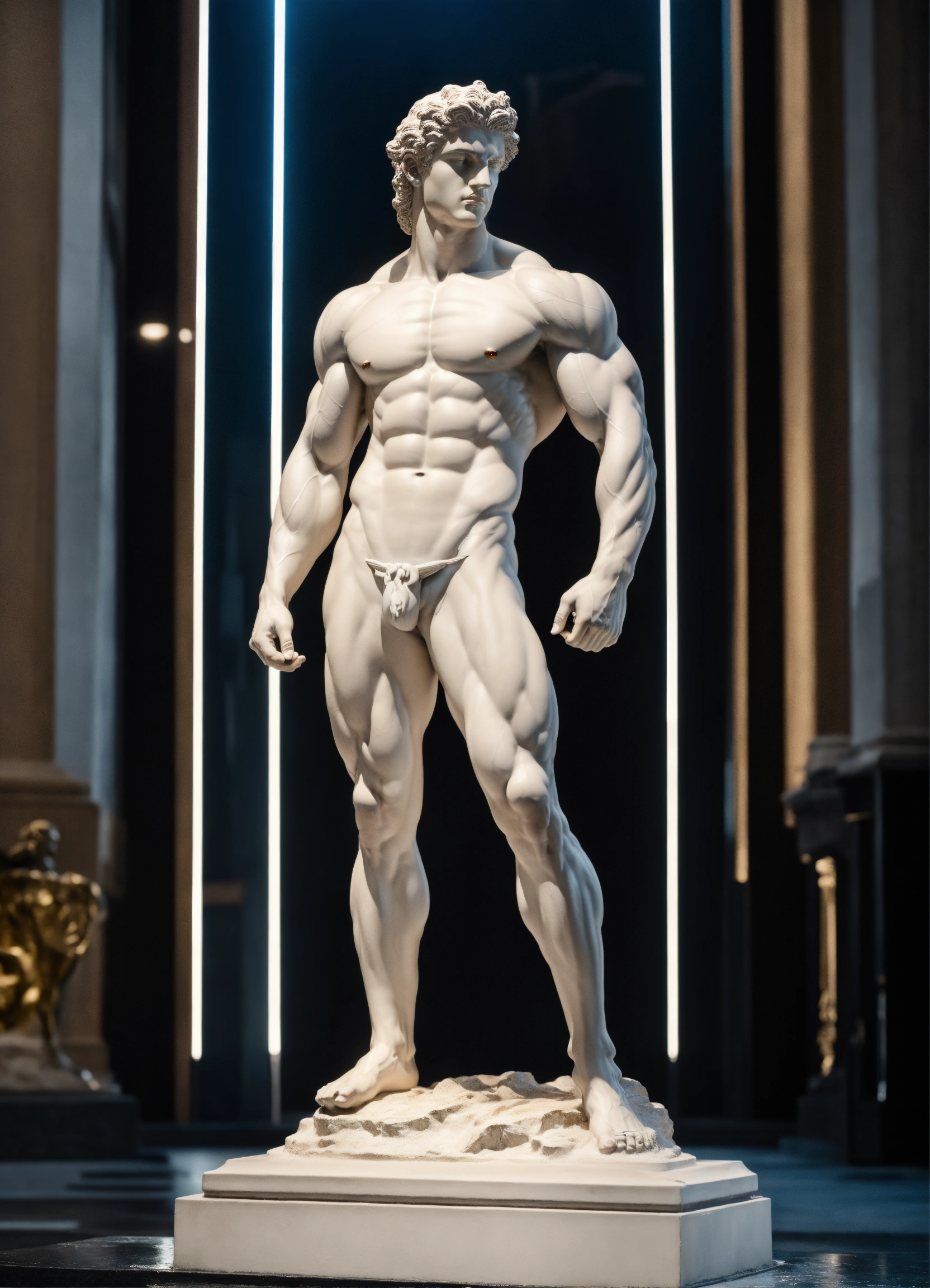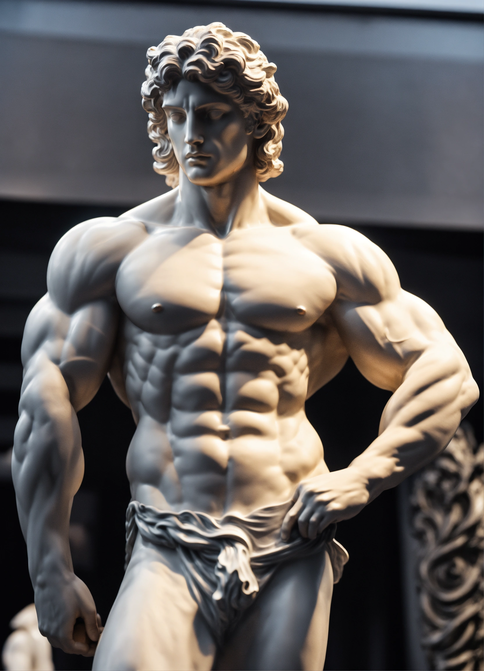 A statue from a muscular greek god statue with a wavey middel parting hair with white color on his body with a black backround standing on a podest 8k standing next to a lamborghini