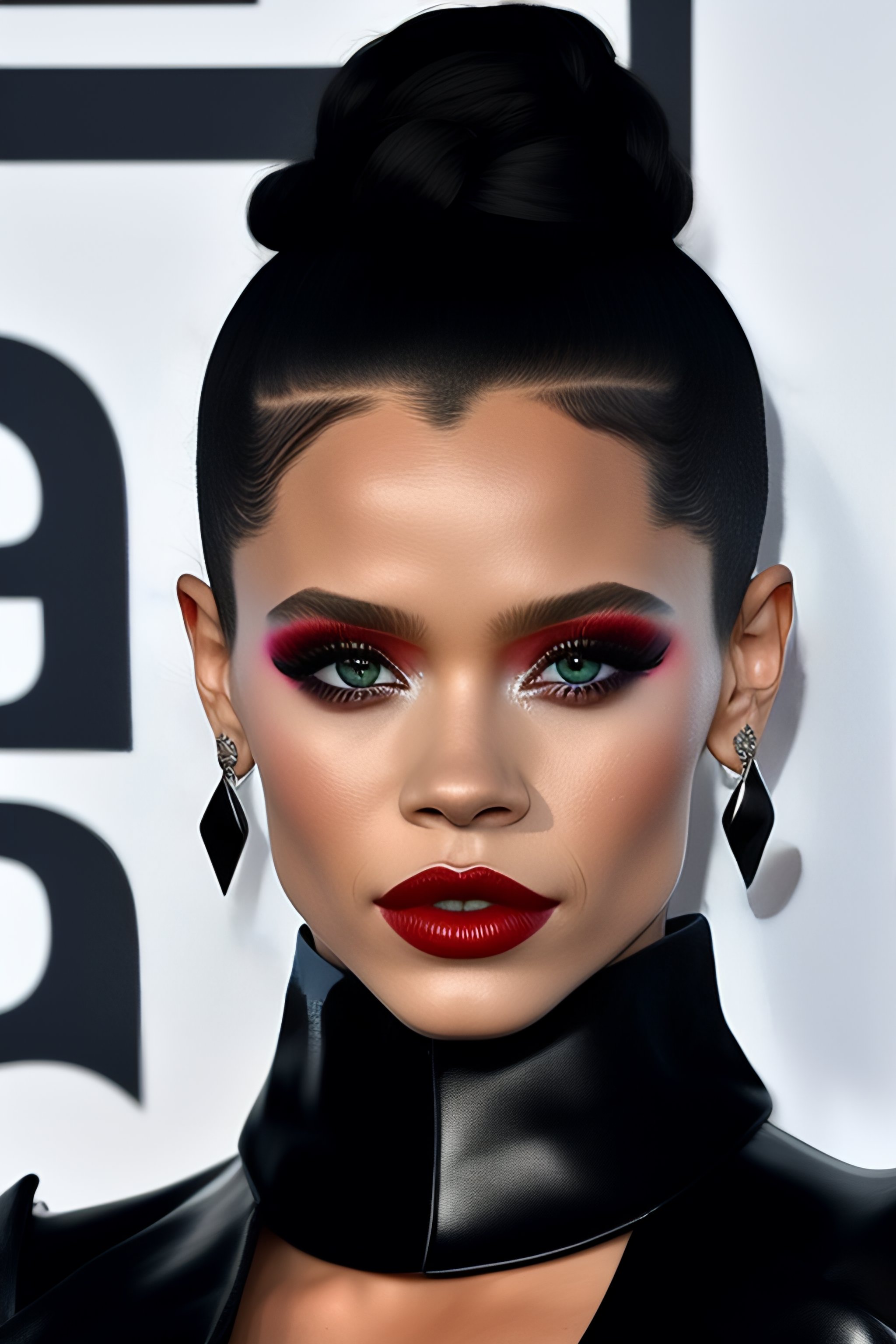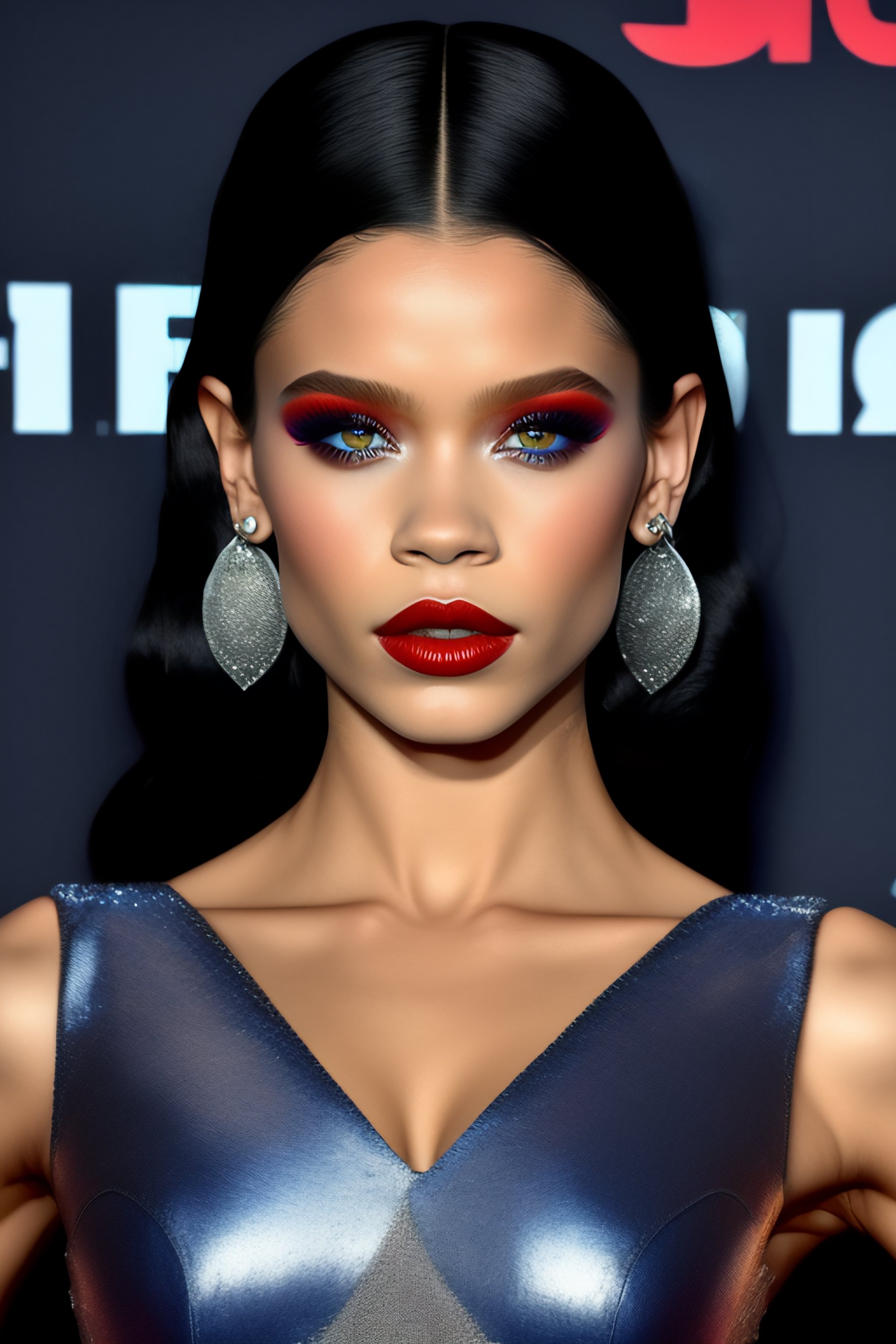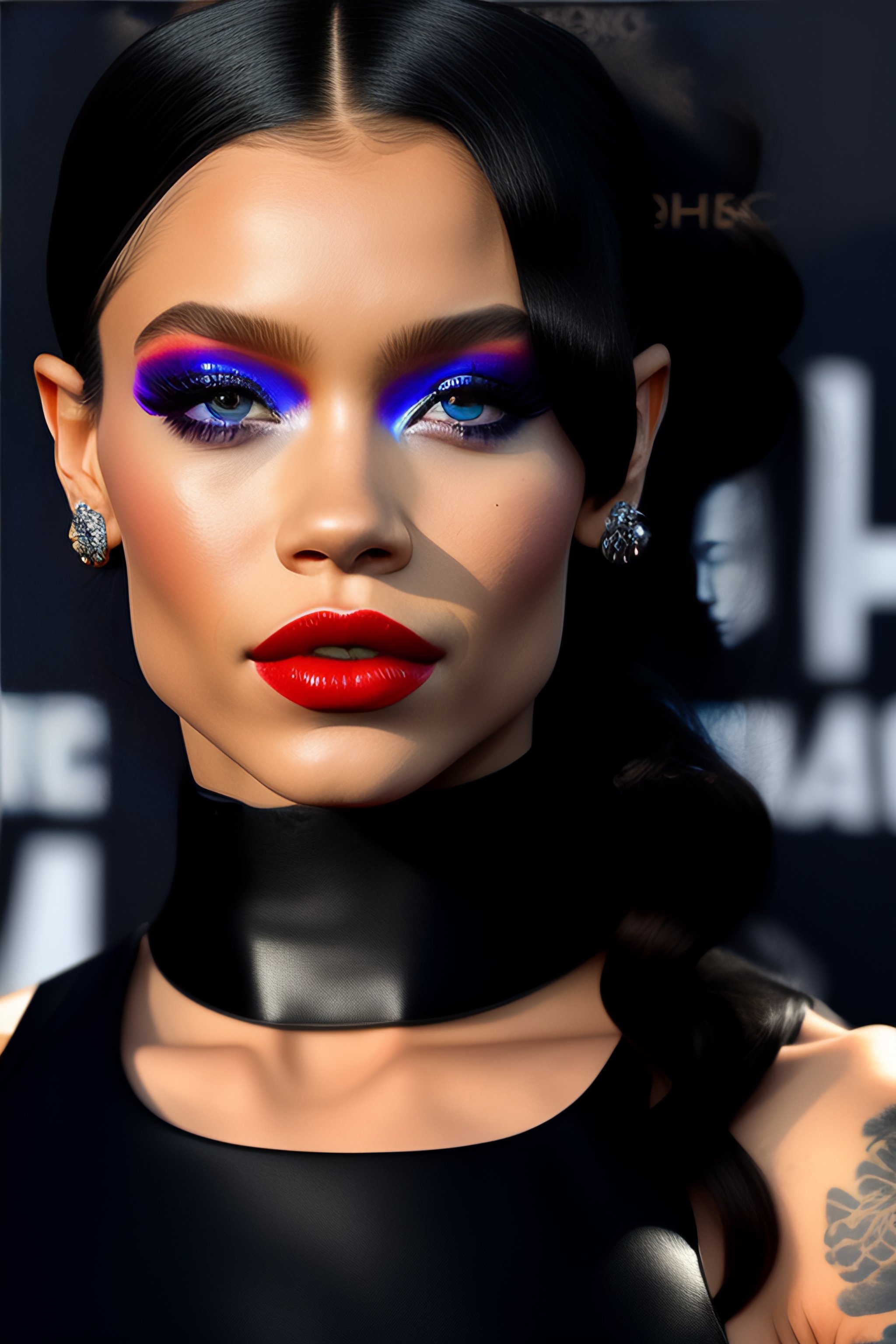 Blue eyes, very big full lips, jenna ortega in a goth outfit, red lipstick, dark eye shadow, tattoos on both arms and shoulders, pale skin, big eyes, black nails