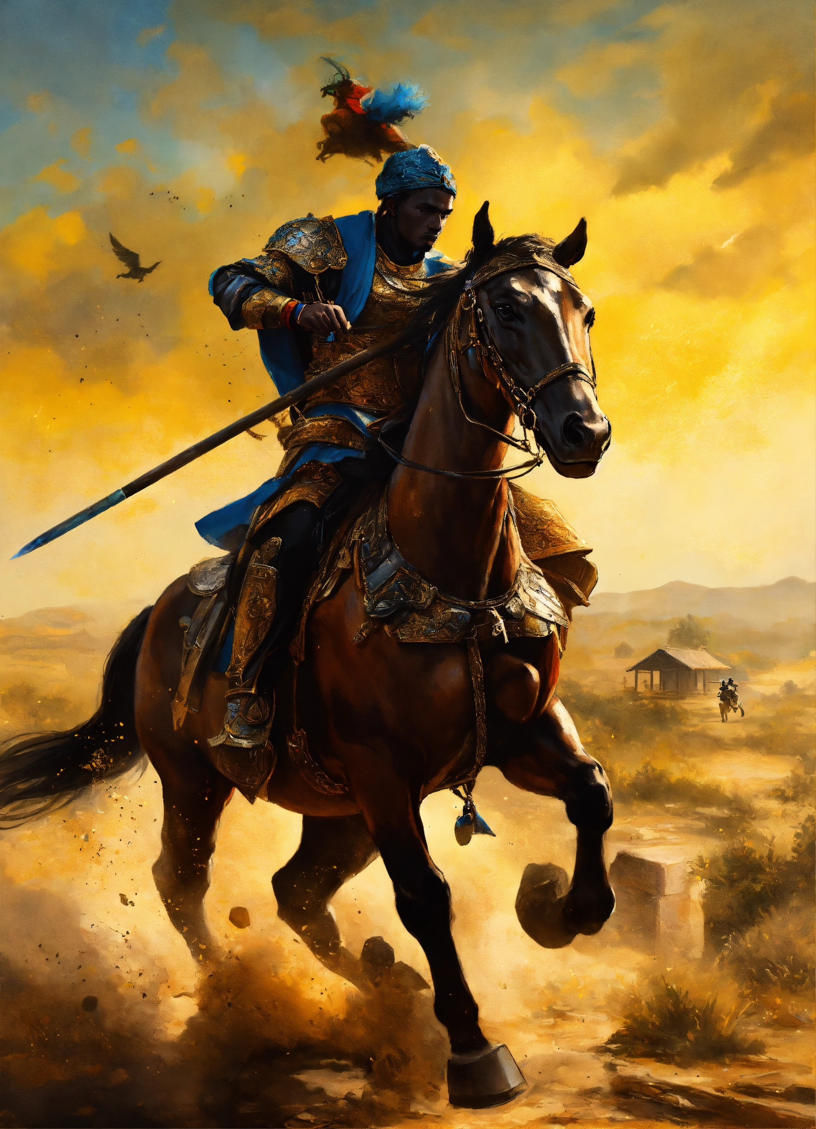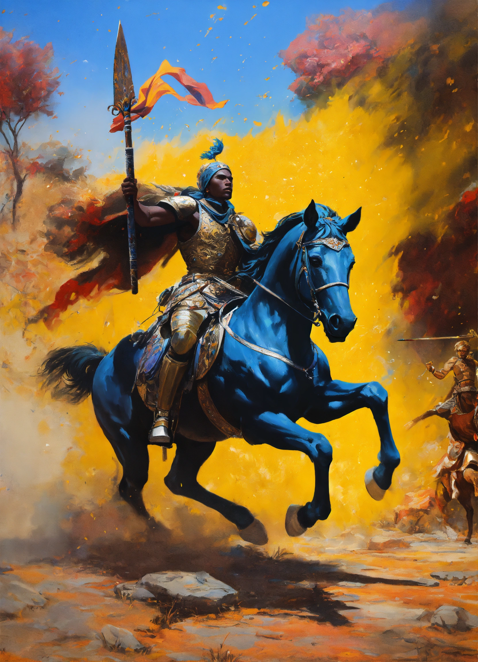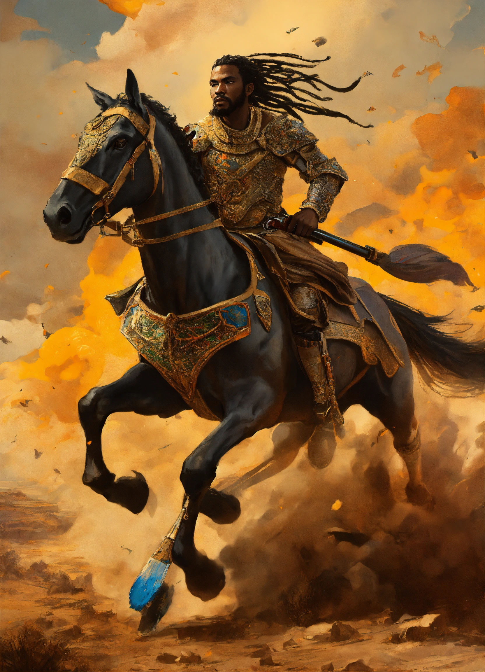 A battle black wearing armor, running across a a battle cat wearing armor, running across a battlefield. riding on top of the horse, action shot., action shot, gladi-art-tor african, a male artist fights against a large paint pot, african modern warrior artist, he carries a large paintbrush as a weapon, beautiful matte realistic painting of a of a fantasy landscape, african sculptor, african sculptor, a man carving wood, surreal enigma, creative, surrealism, imaginative, paint splatter, ripped canvas, baroque style, caraggio design, leonardo style