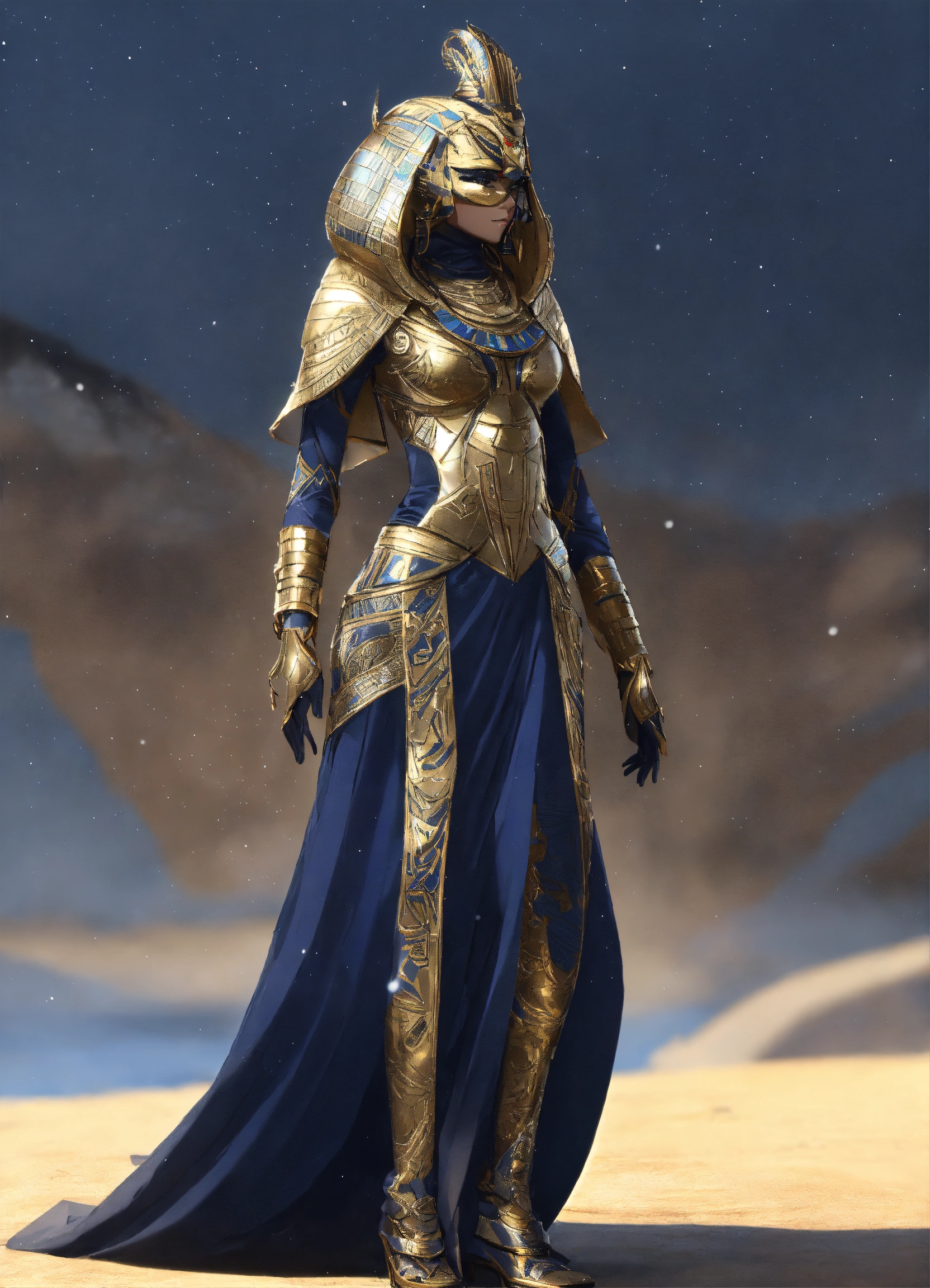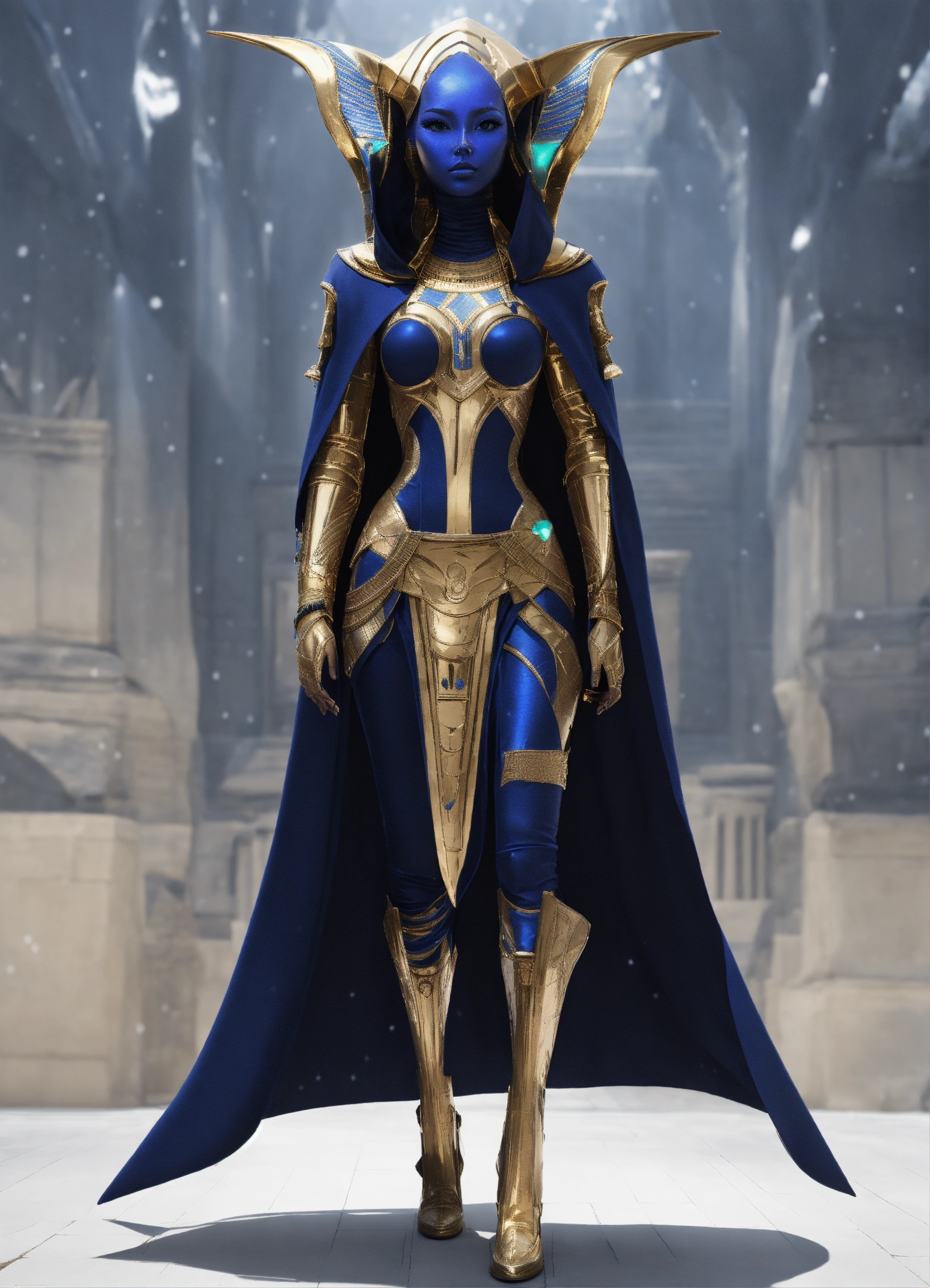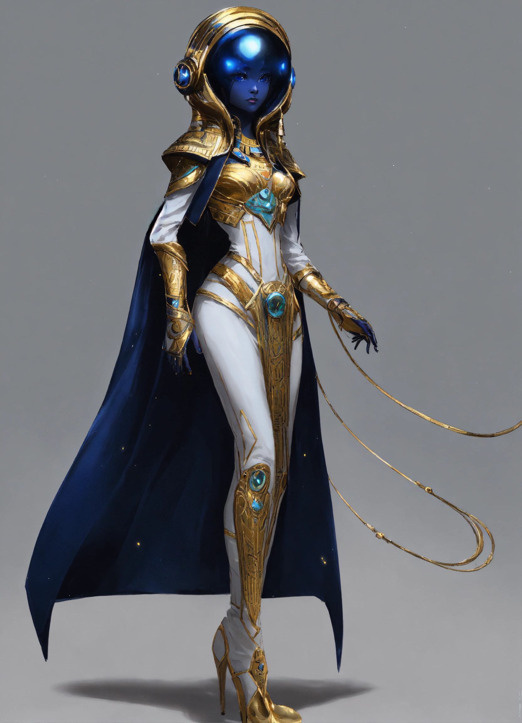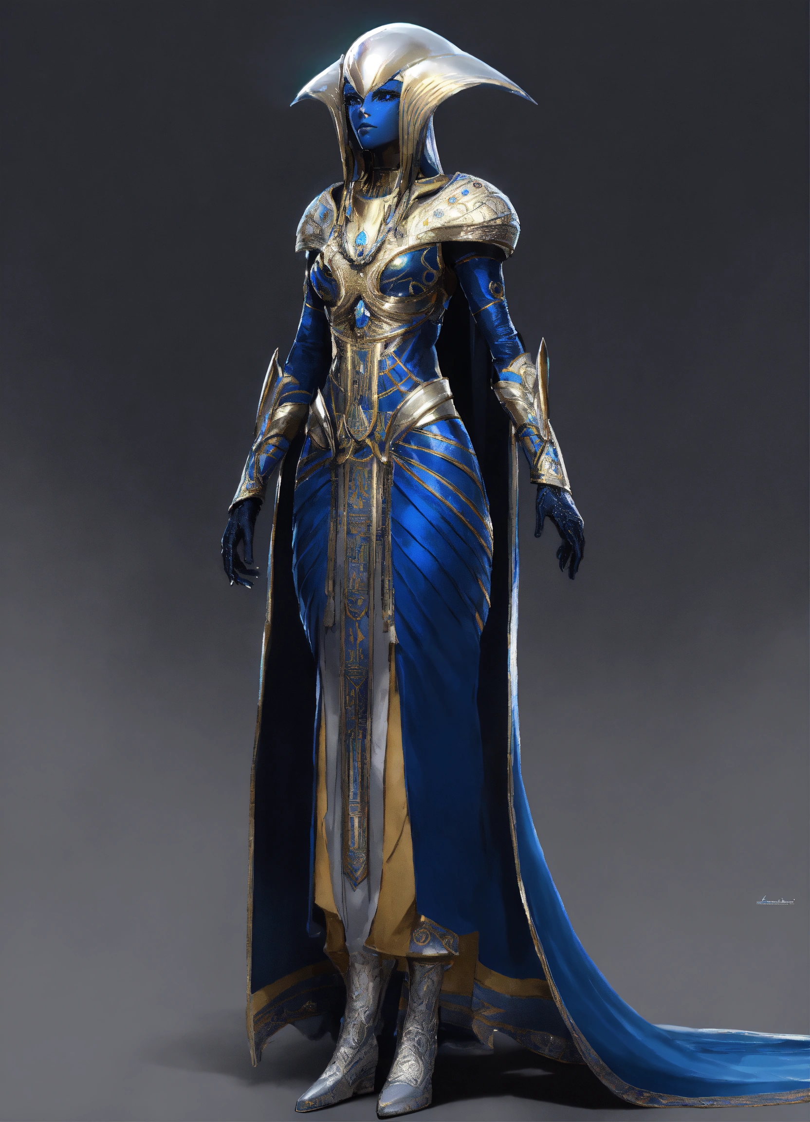 A alien, alienrace woman, alien_ pharaoh pharaoh clothings long dressed, colored dark navy blue, ivony shiny, with silver dekoredet, winter clothings, full body wide shot, walking pose, intricate, sharp_focus, concept_art, simple white backround
