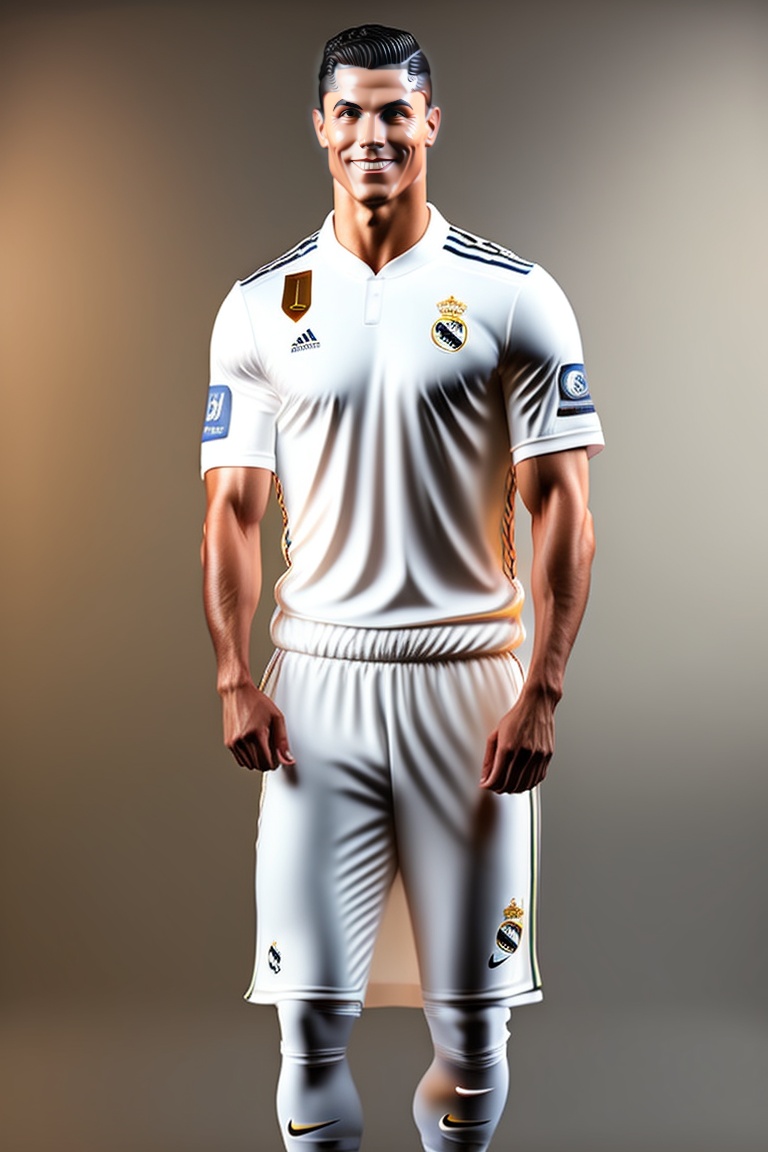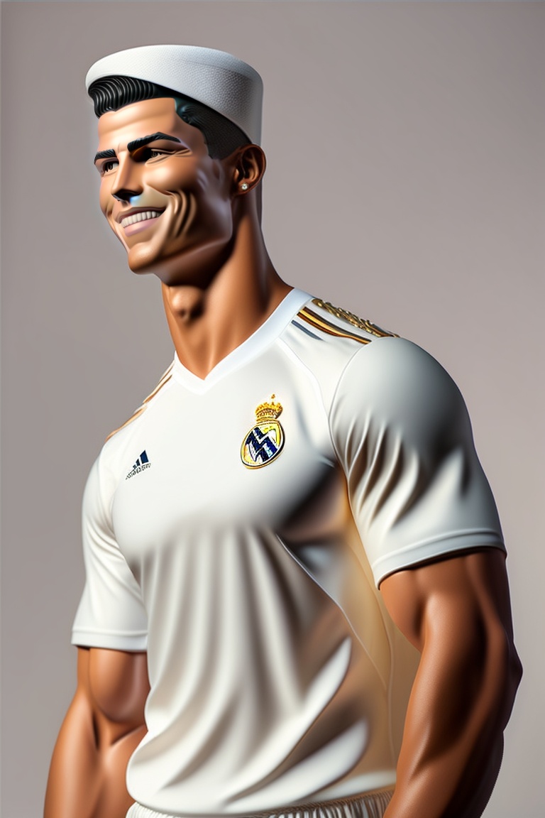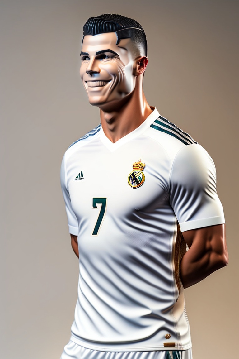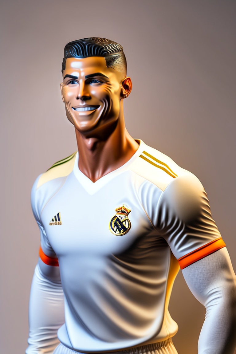 A realistic full body white greek marble statue of cristiano ronaldo wearing a real madrid jersey neutral background, moody, smiling, photo realistic, movie scene, super detailed, hyper realistic, bright lights