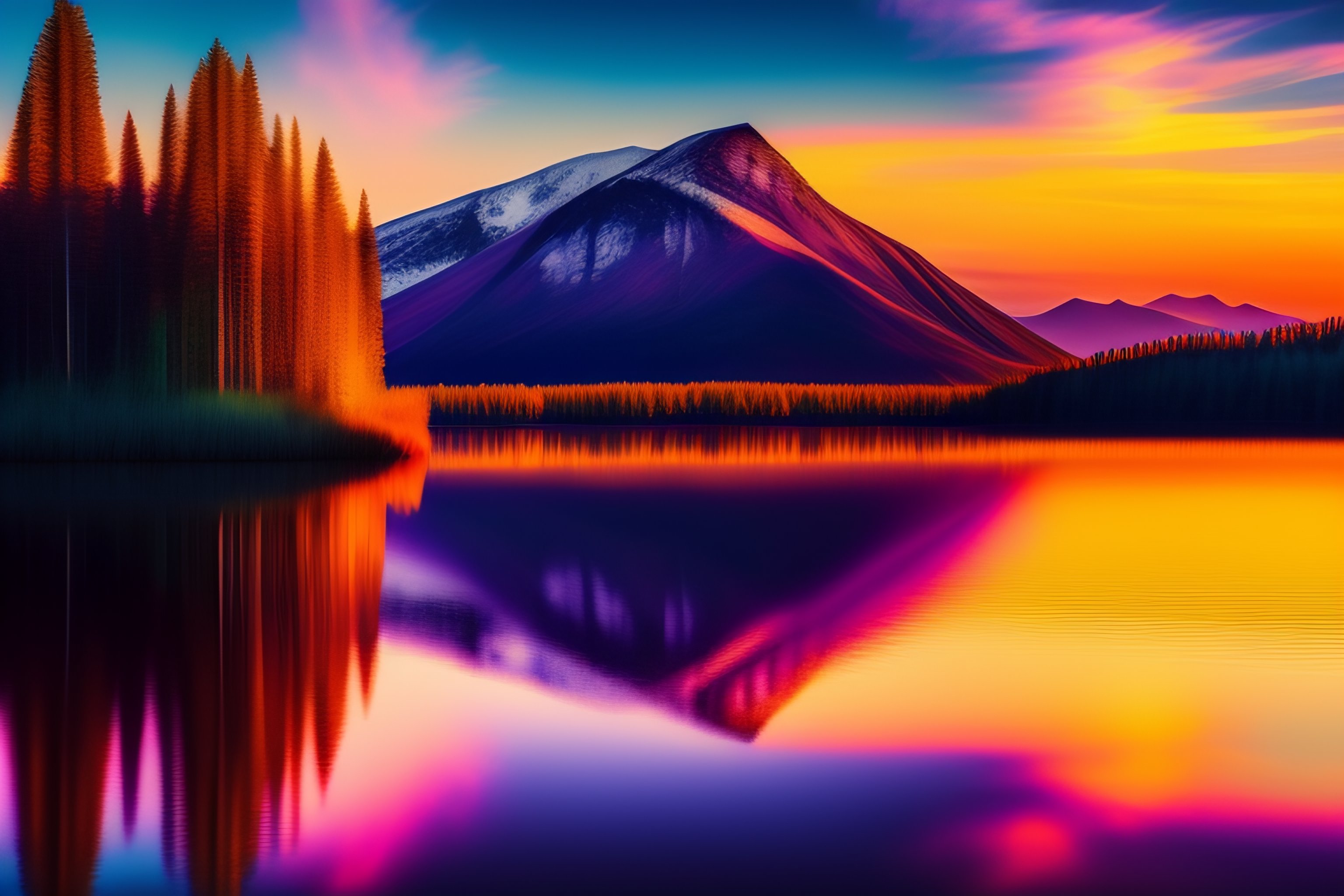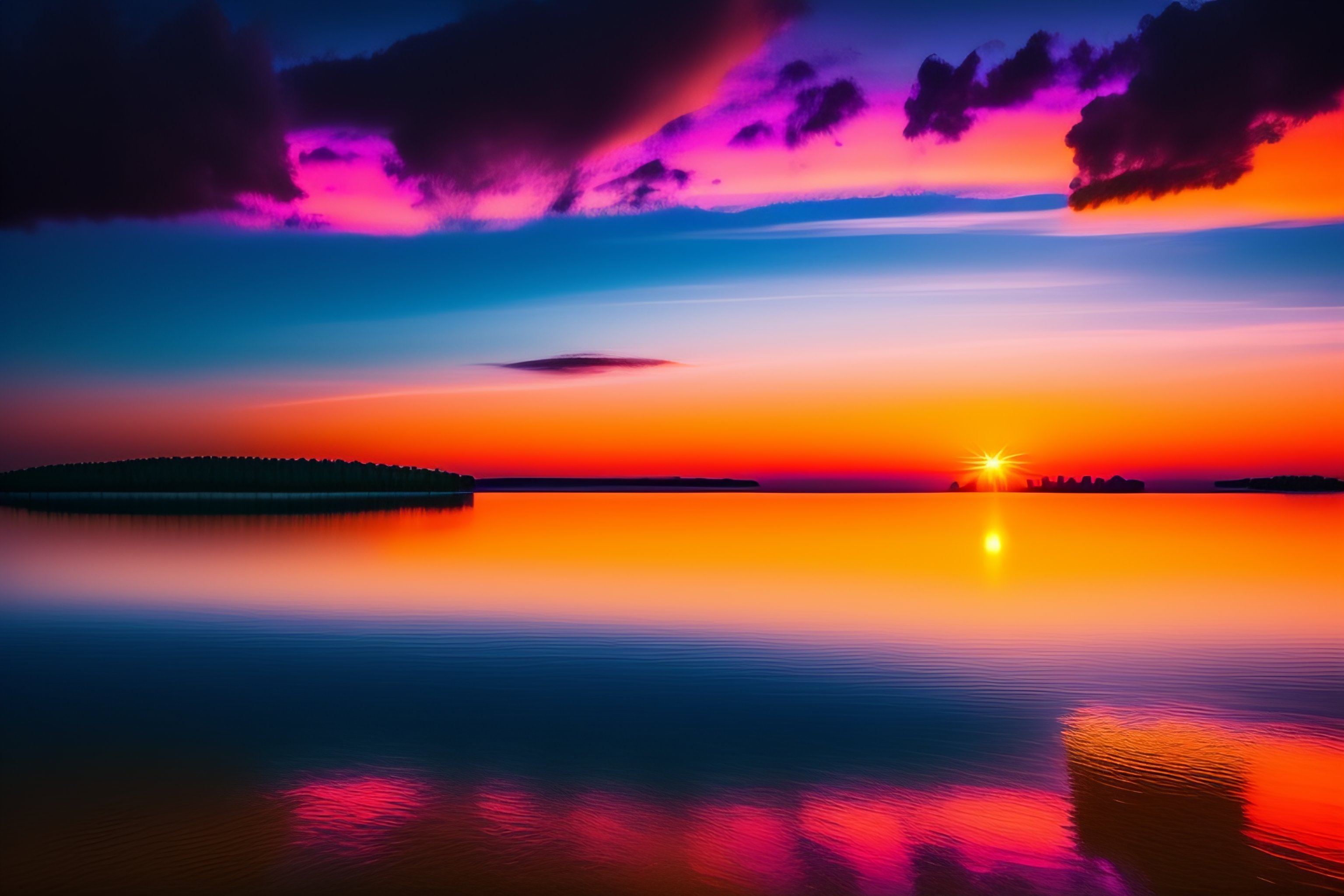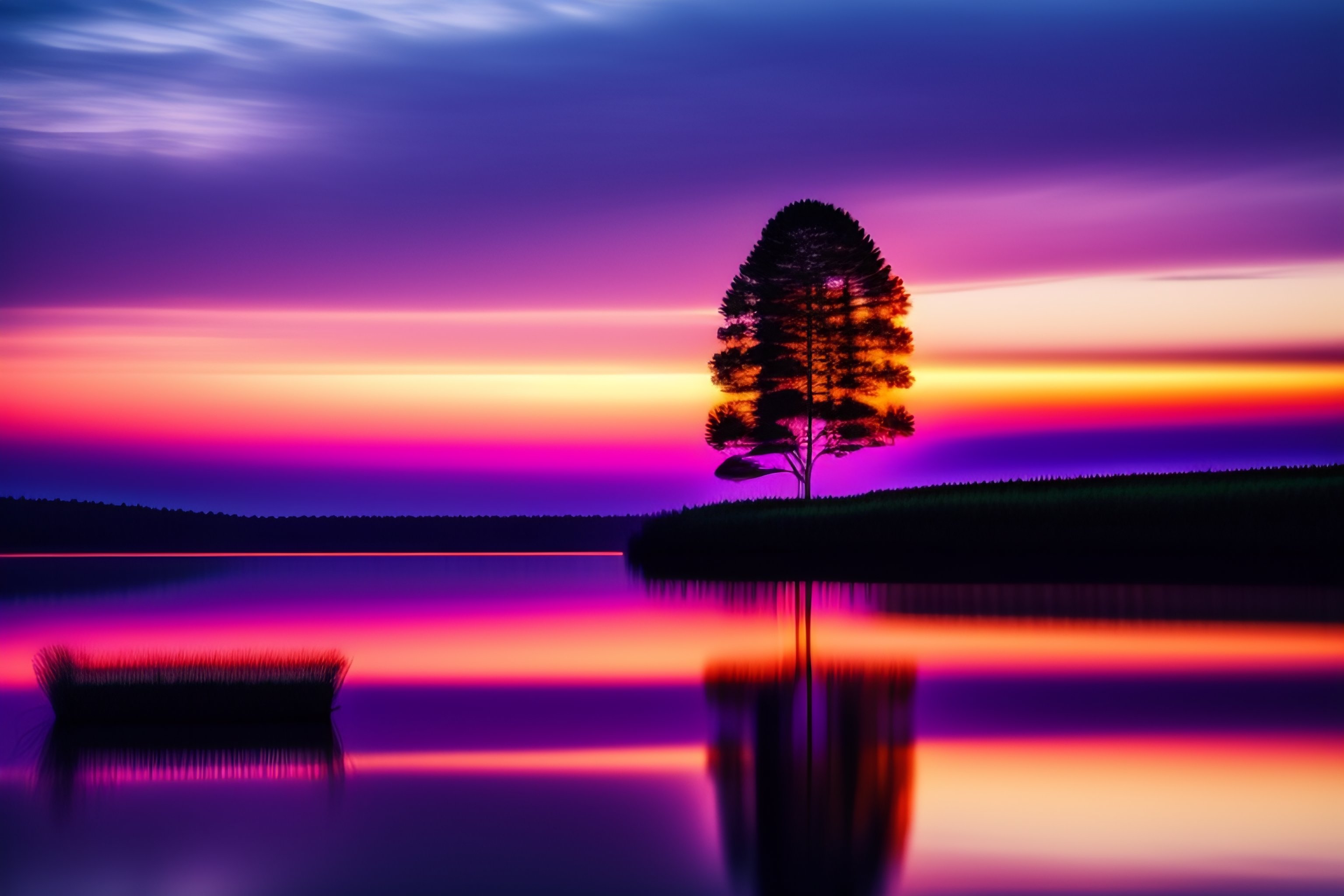 This photo represents a peaceful sunset over a lake. in the middle of this lake, a tree grows. we see different shades of purple and colors between light yellow and orange reflecting on the calm water of the lake. clouds cover the horizon. this photo represents inner peace.