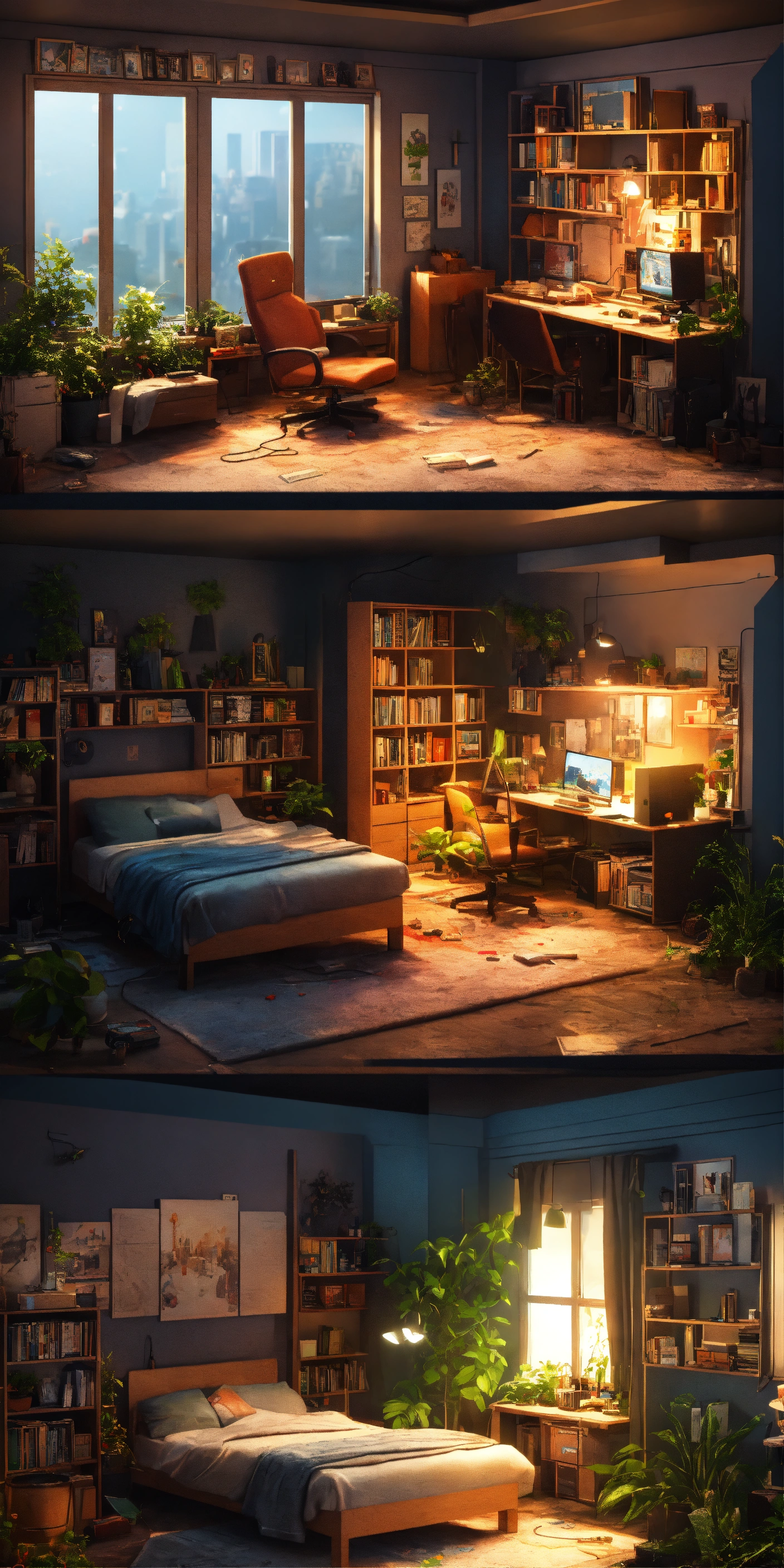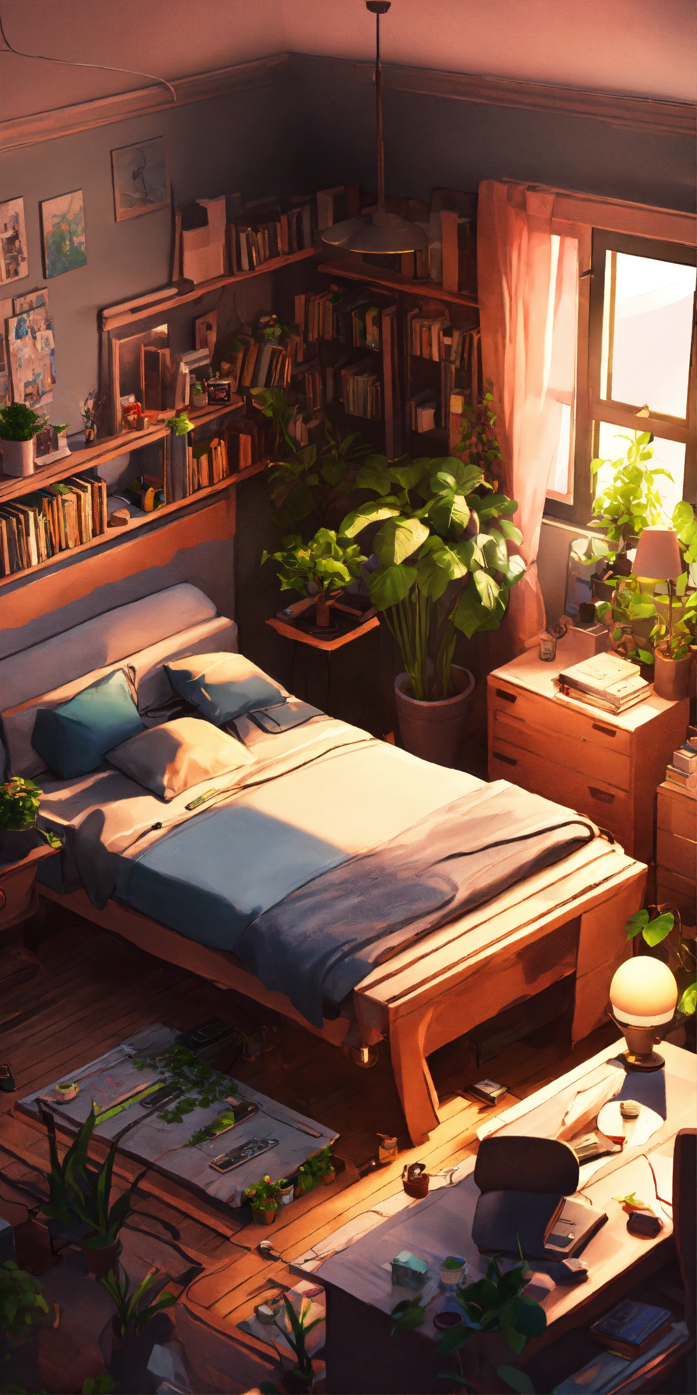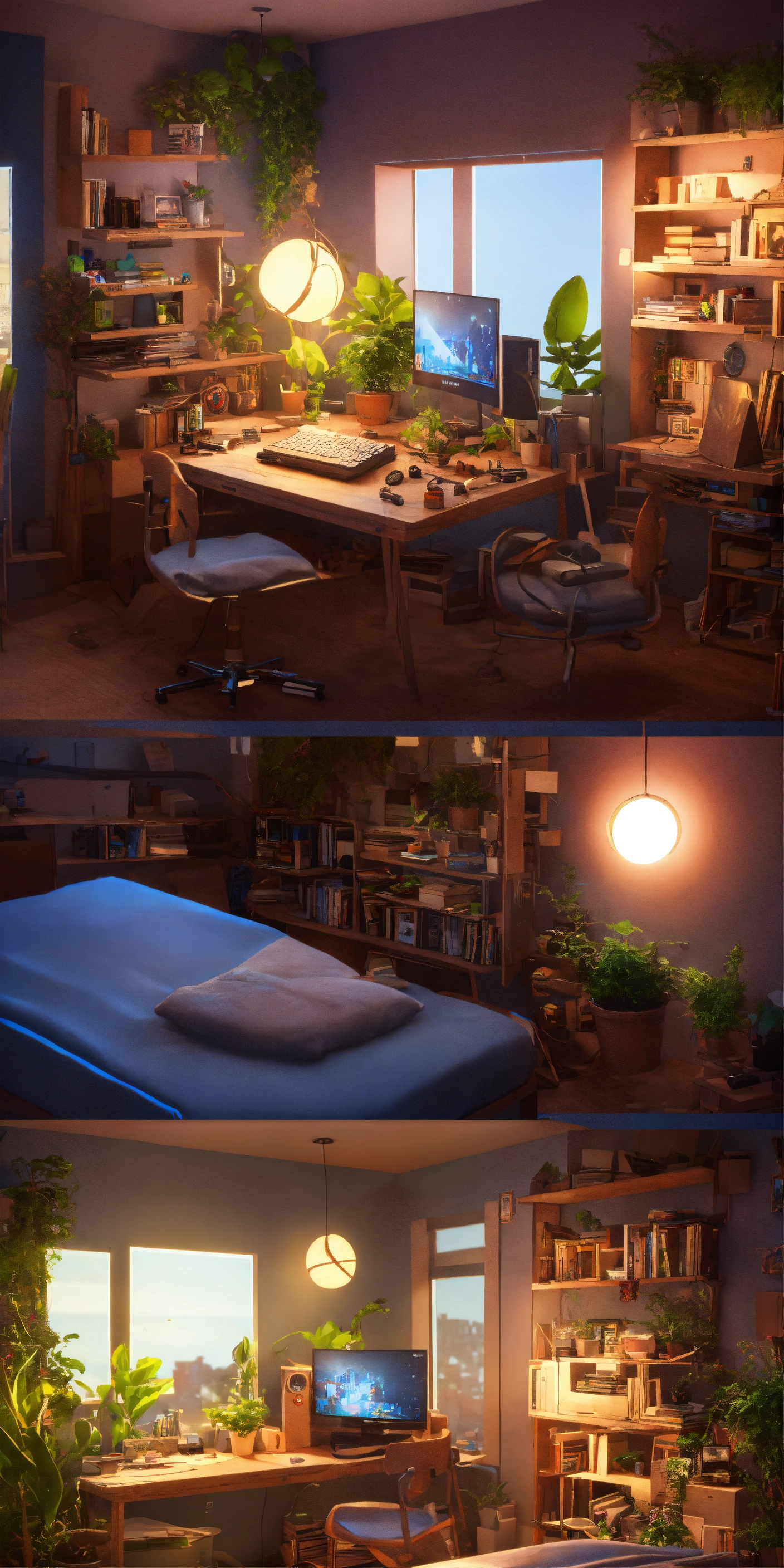 Isometric messy nostalgic bedroom with a gaming pc, windows, plants bookshelves, desk, 3d art, muted colors, soft lighting, high detail, concept art, behance, ray tracing, volumetric lighting