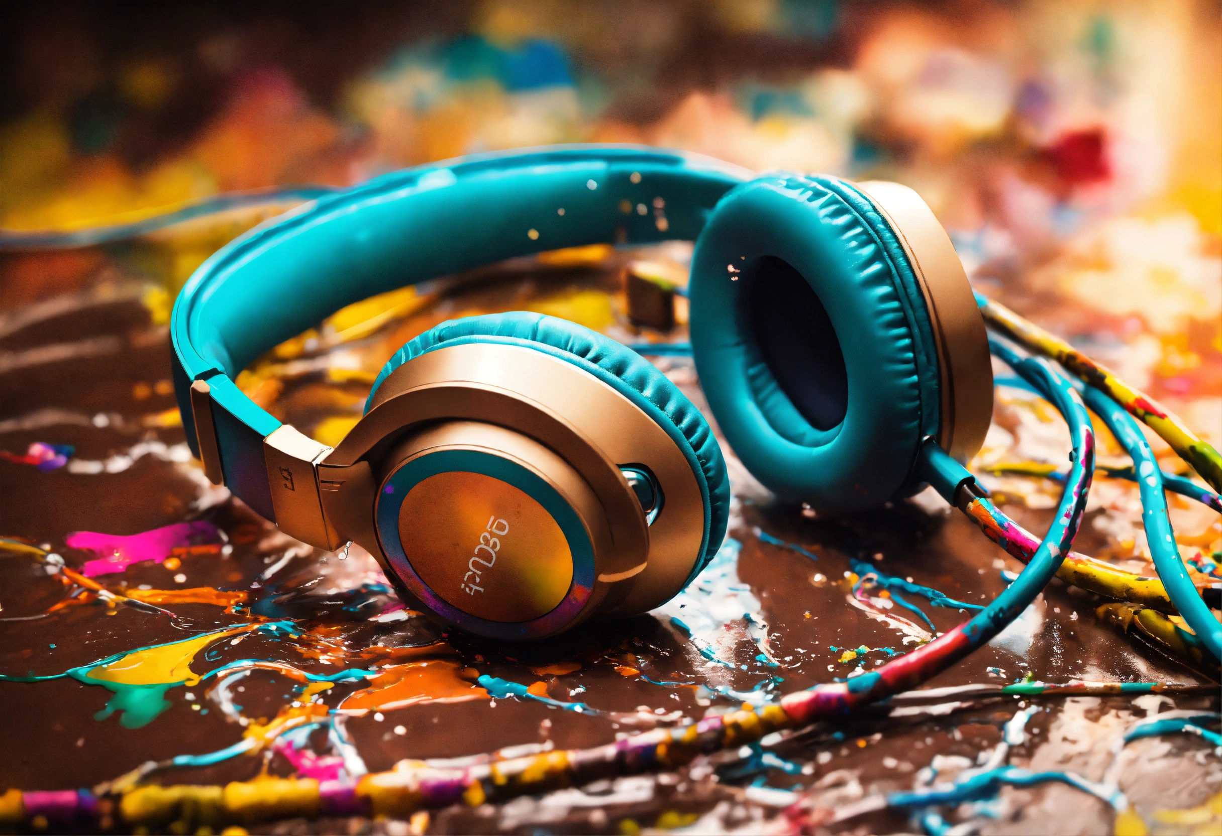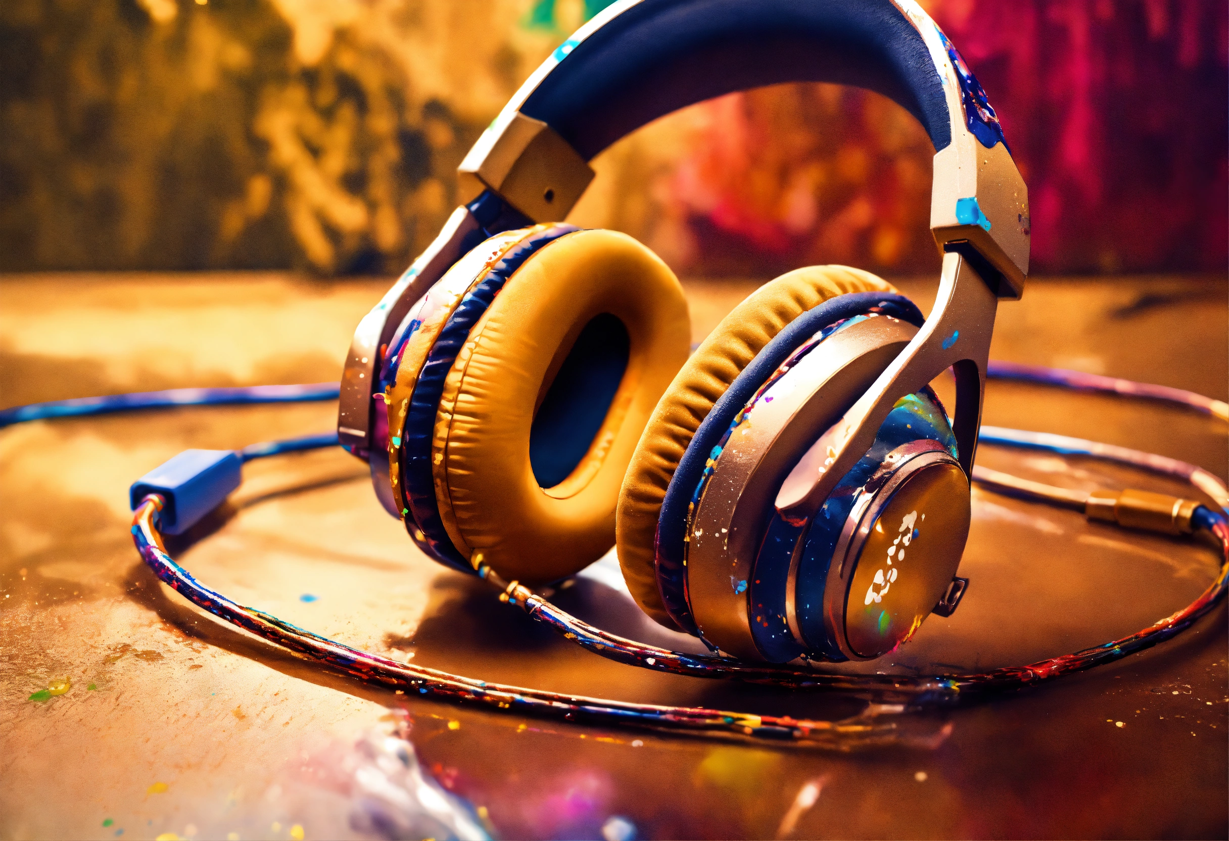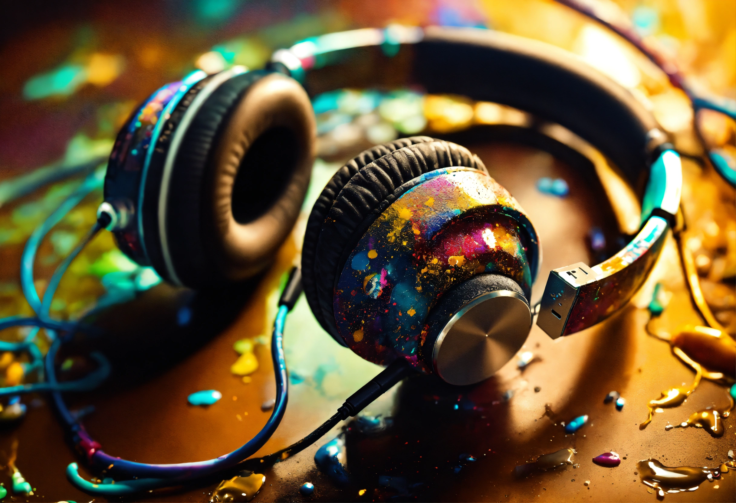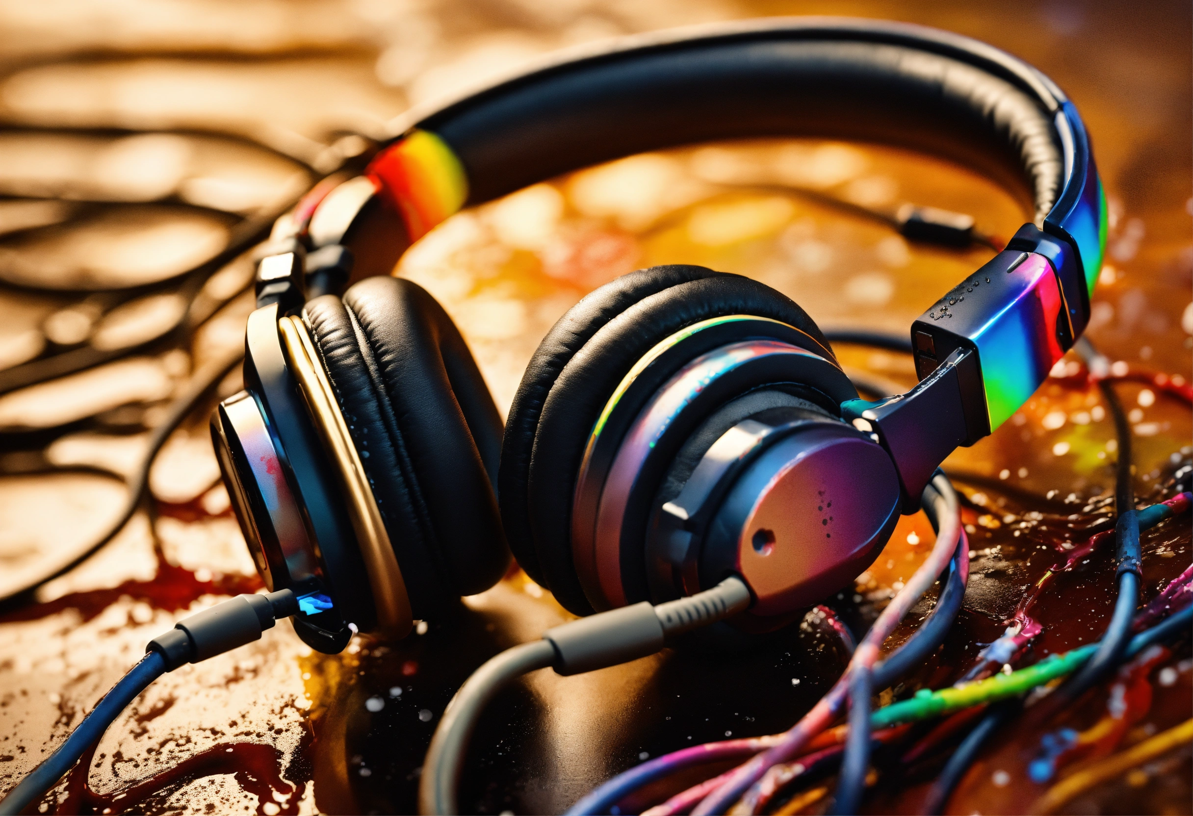 Drip paint headset. usb-c cables tangled with hdmi cables colorful brilliant tones. paint splatters in sepia toned background. water condensation effect, photograph, hyper realistic, intricate detail