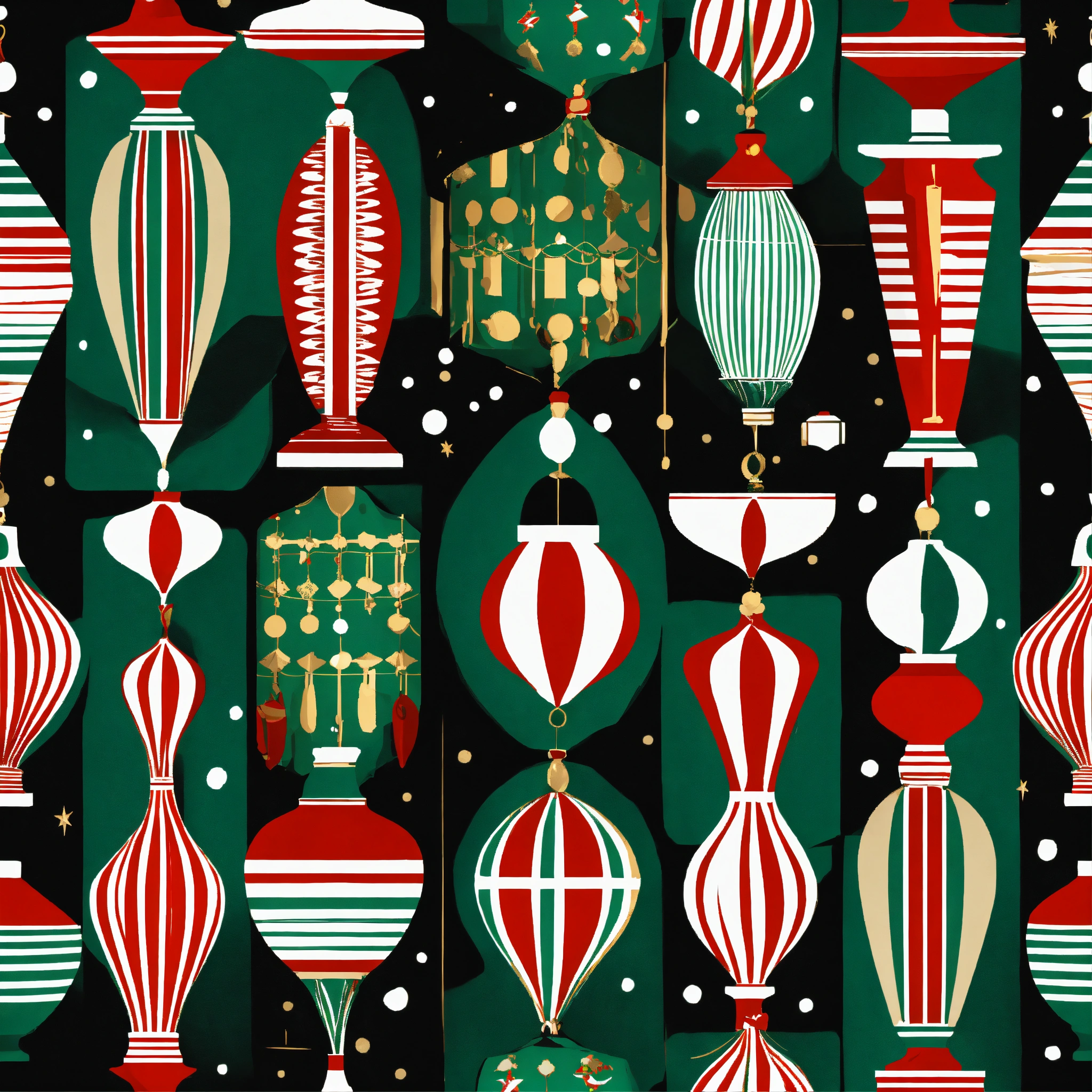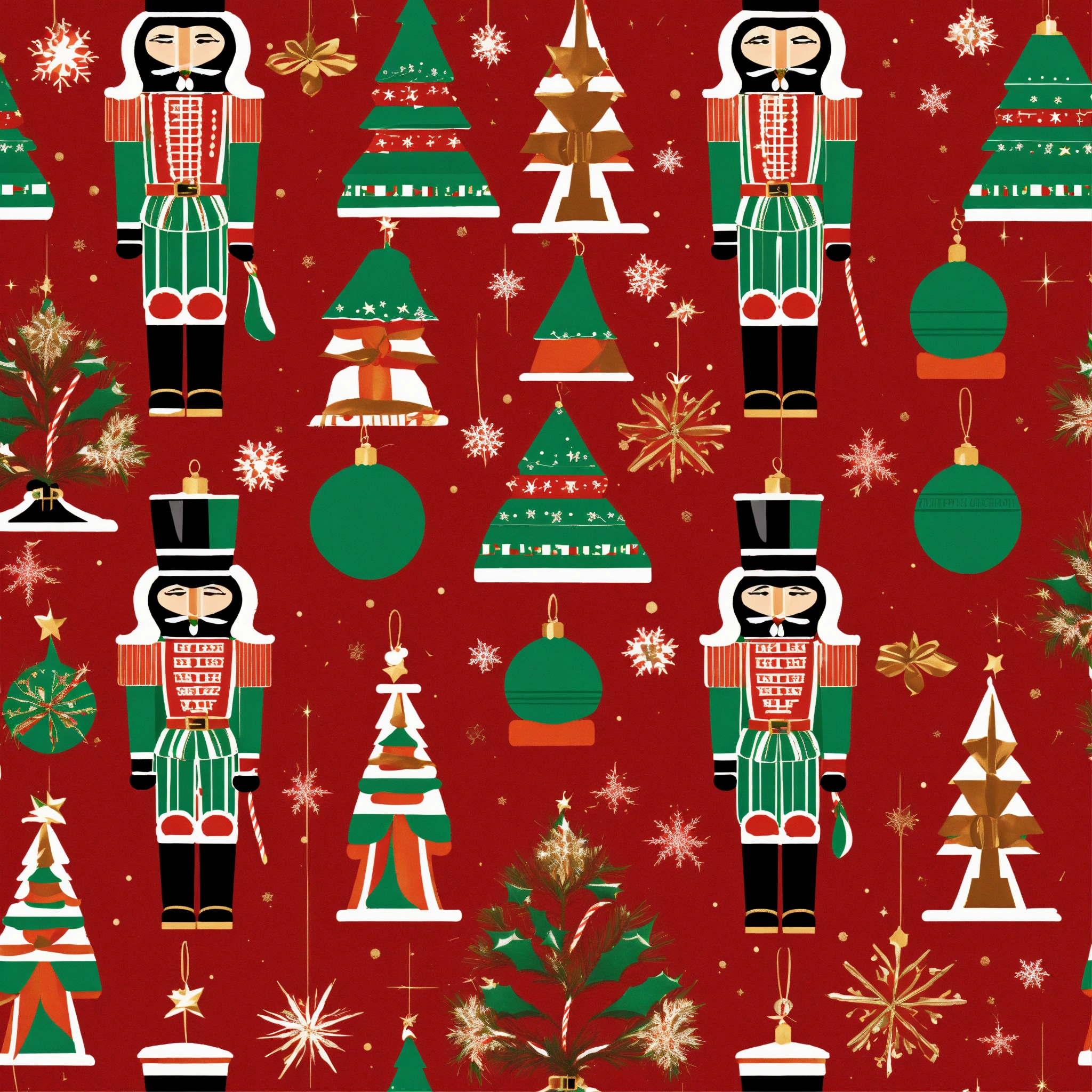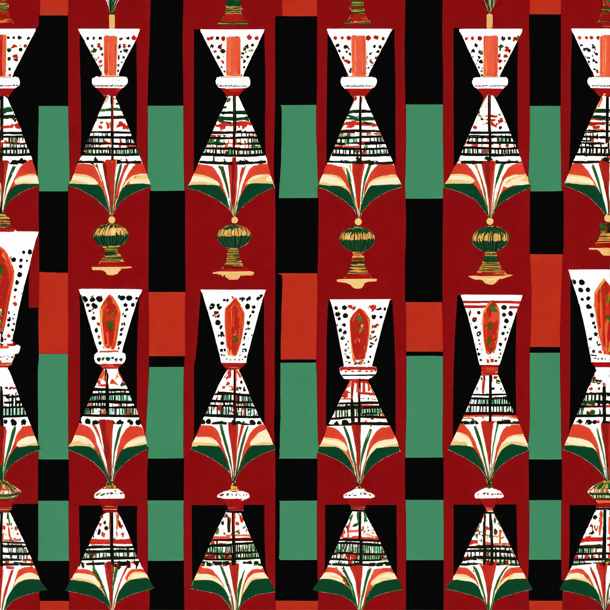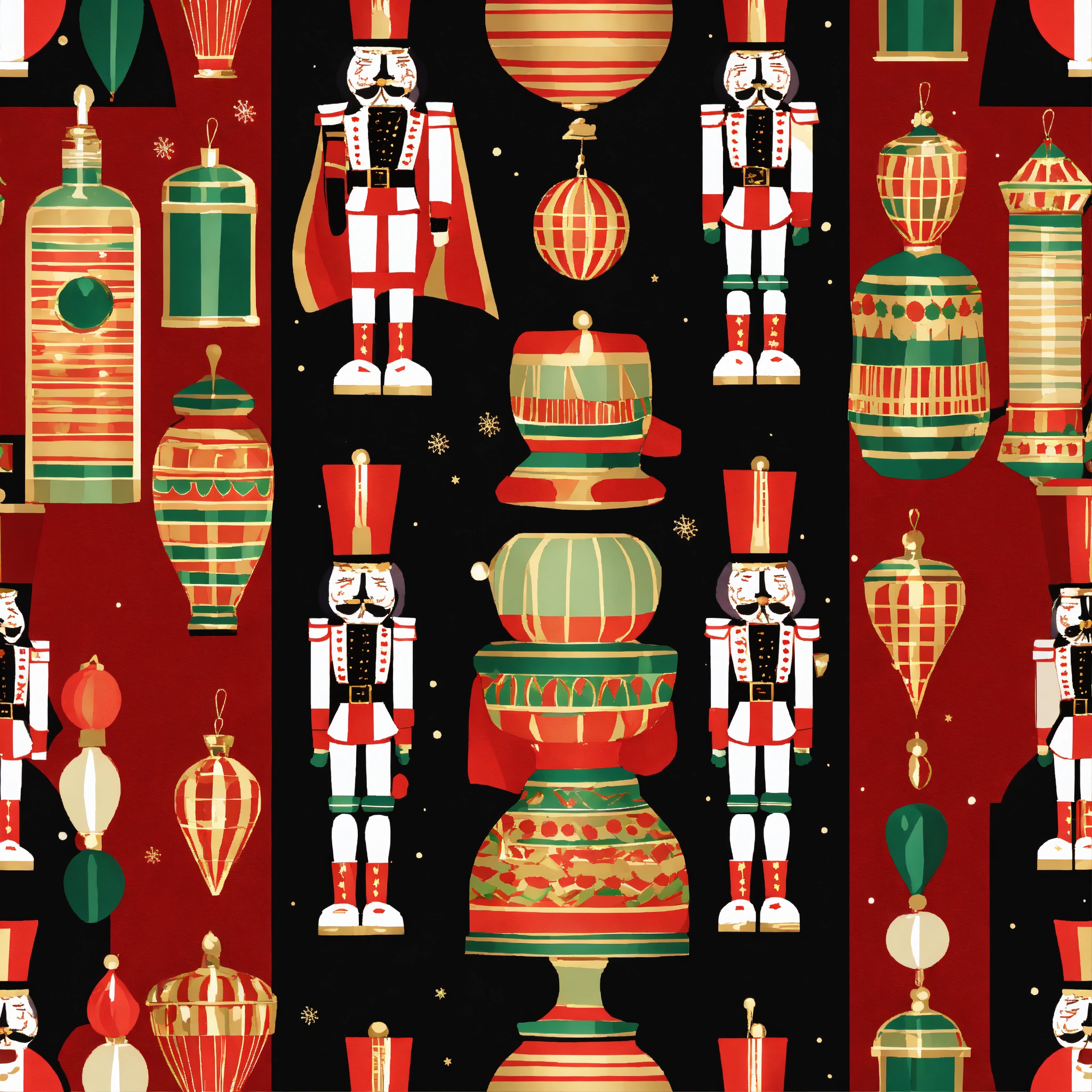 Afrocentric christmas seamless repeating pattern create black nutcracker, vintage christmas ornaments, milk glass vases, retro christmas, 4d, traditional christmas colors. art deco.