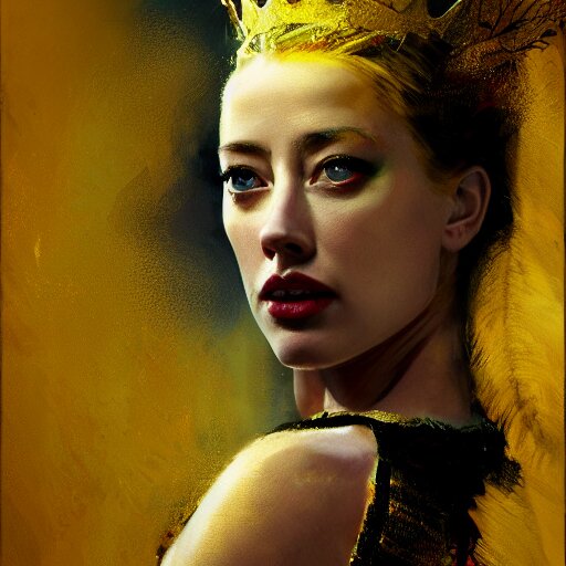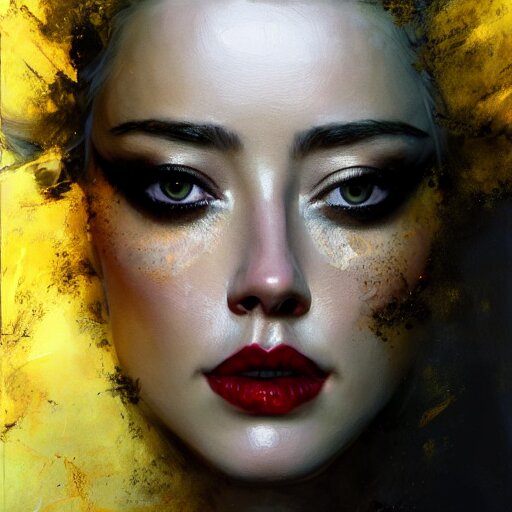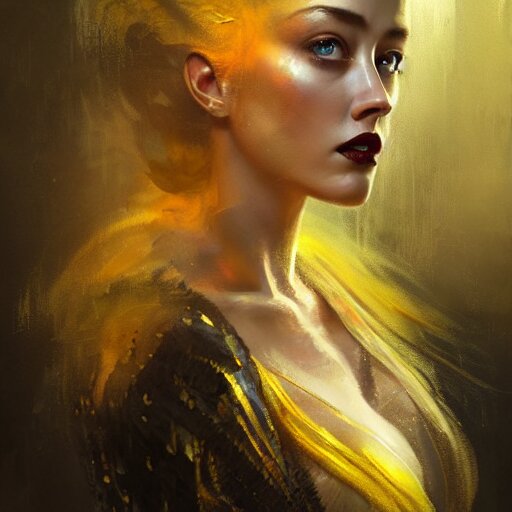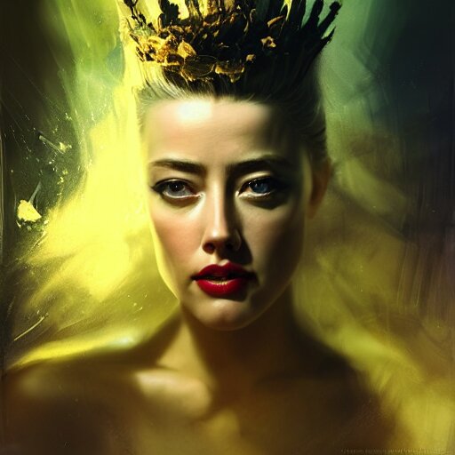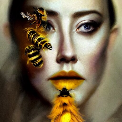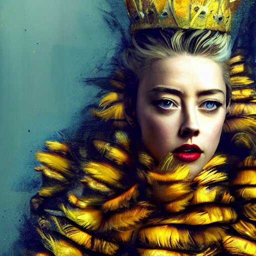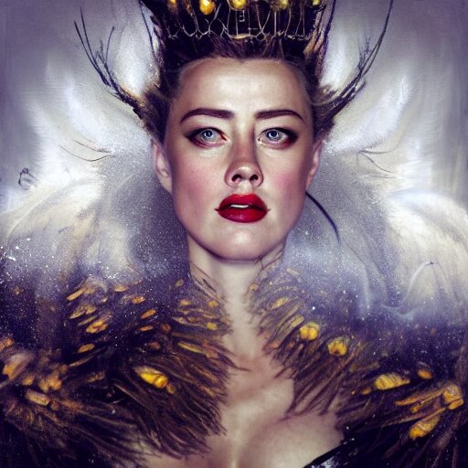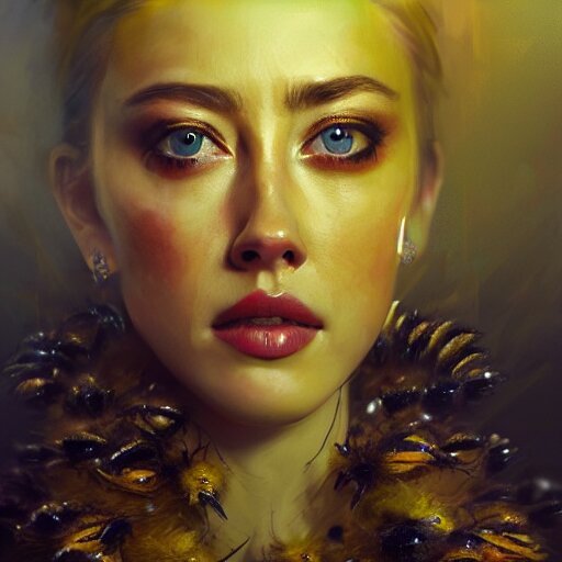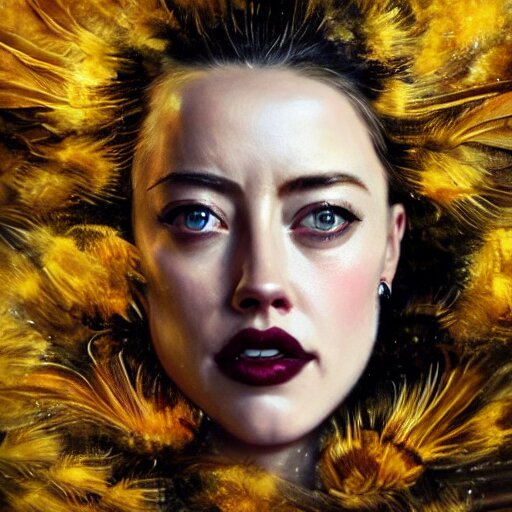 Hyperrealistic portrait of high detail amber heard as a bee queen in ornate black robe yellow swan feathers as the mistress in fear being chased horror. by jeremy mann, fantasy art, photo realistic, dynamic lighting, artstation, poster, volumetric lighting, 4 k, award winning