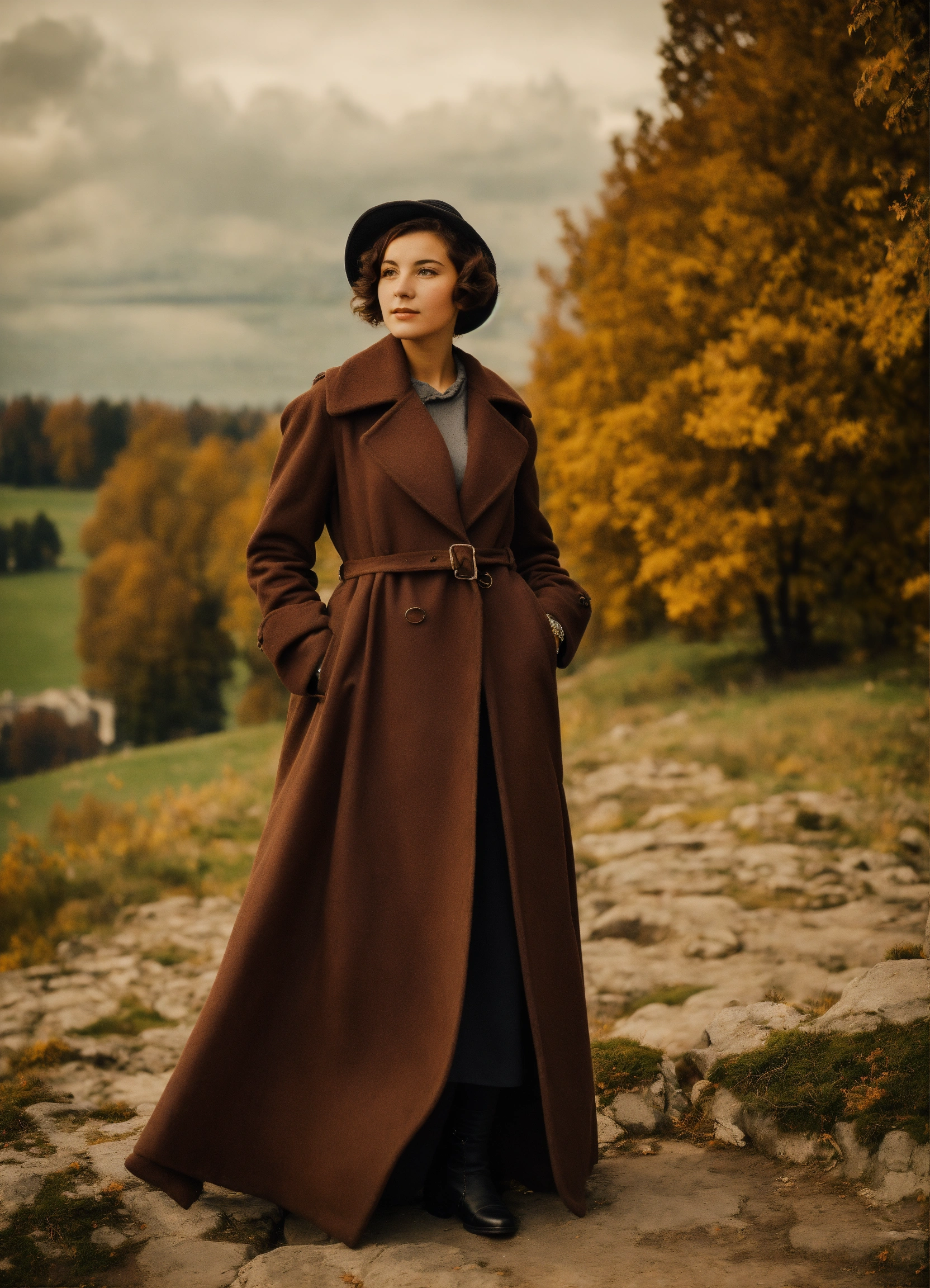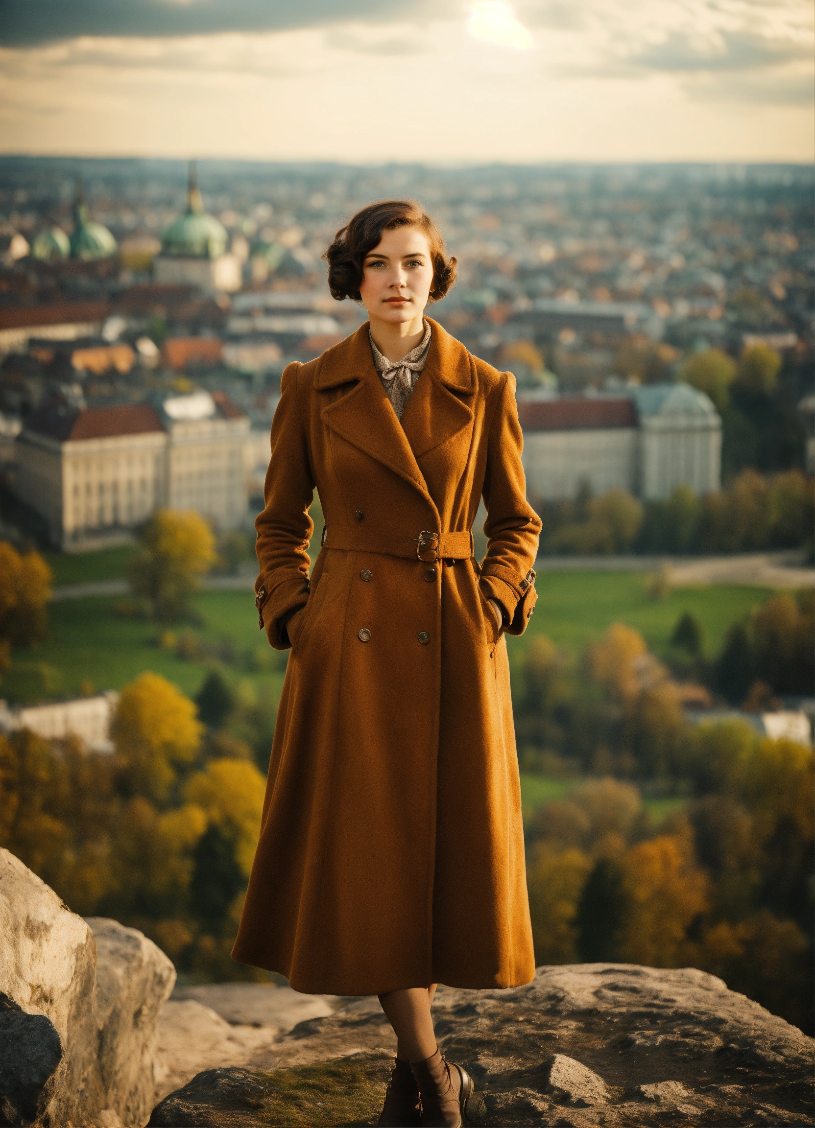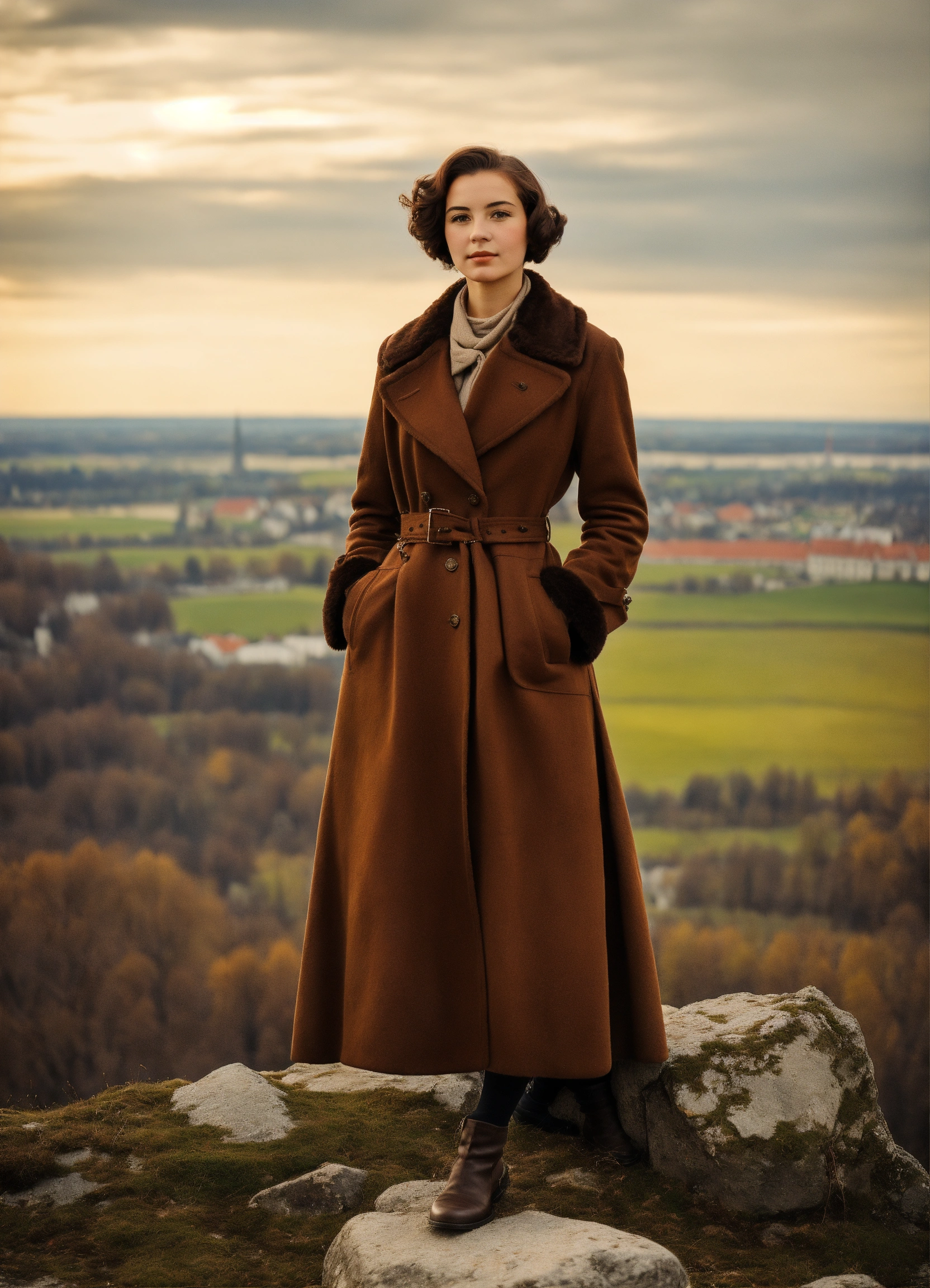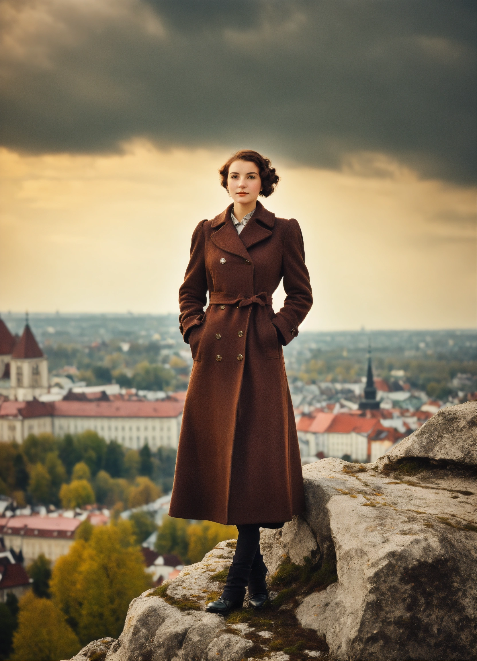 Retro warszawa 1920-1930, europian woman age 20, on top of a mountain, looks at the camera at full height, bald, retro style. clothing long dark coat. brown hair.