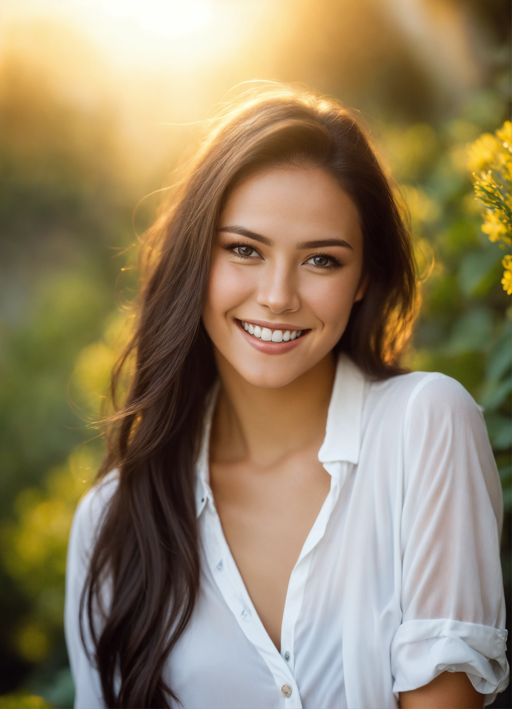 Portrait of the best beautiful young woman in the world, long dark hair, perfect brown eyes, perfect smile, wearing open white shirt and swimsuit in a natural background