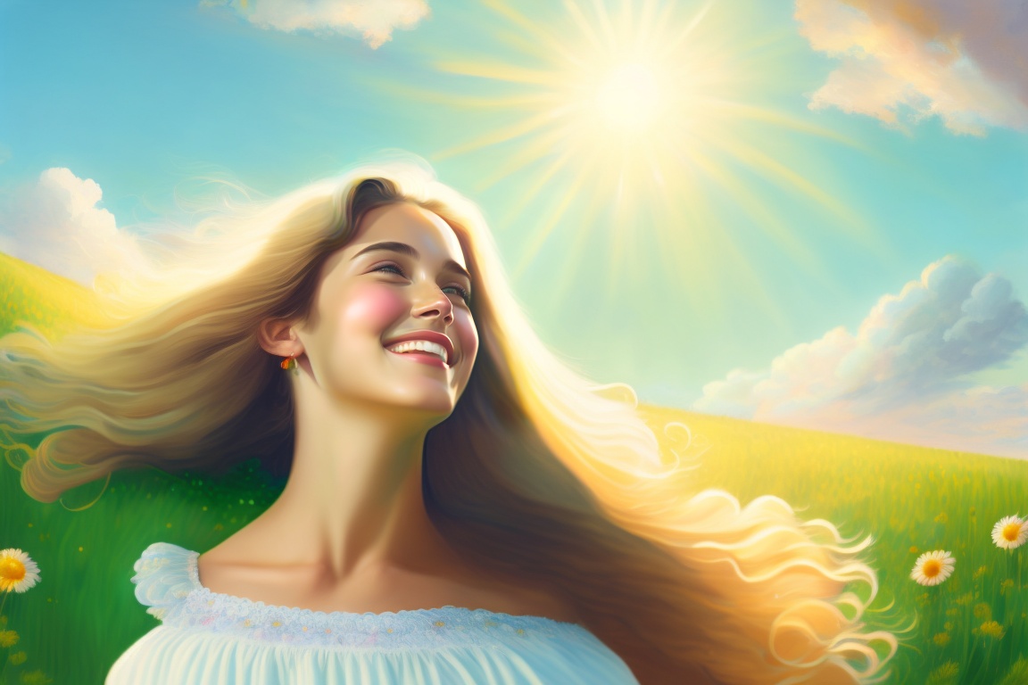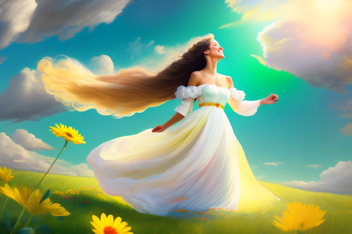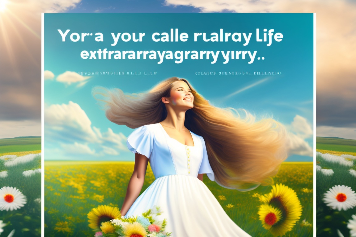 An image of a smiling person looking up at the sky, with the sun shining behind them. the person is in a green field, with colorful flowers around. the sky is light blue, with white clouds. the person is a young woman with long, flowing hair. she is wearing a flowing white dress with yellow flowers printed on it. at the bottom, the phrase "your call to an extraordinary life" is written in large, white letters, realistic image, 8k, i don't want two people or children