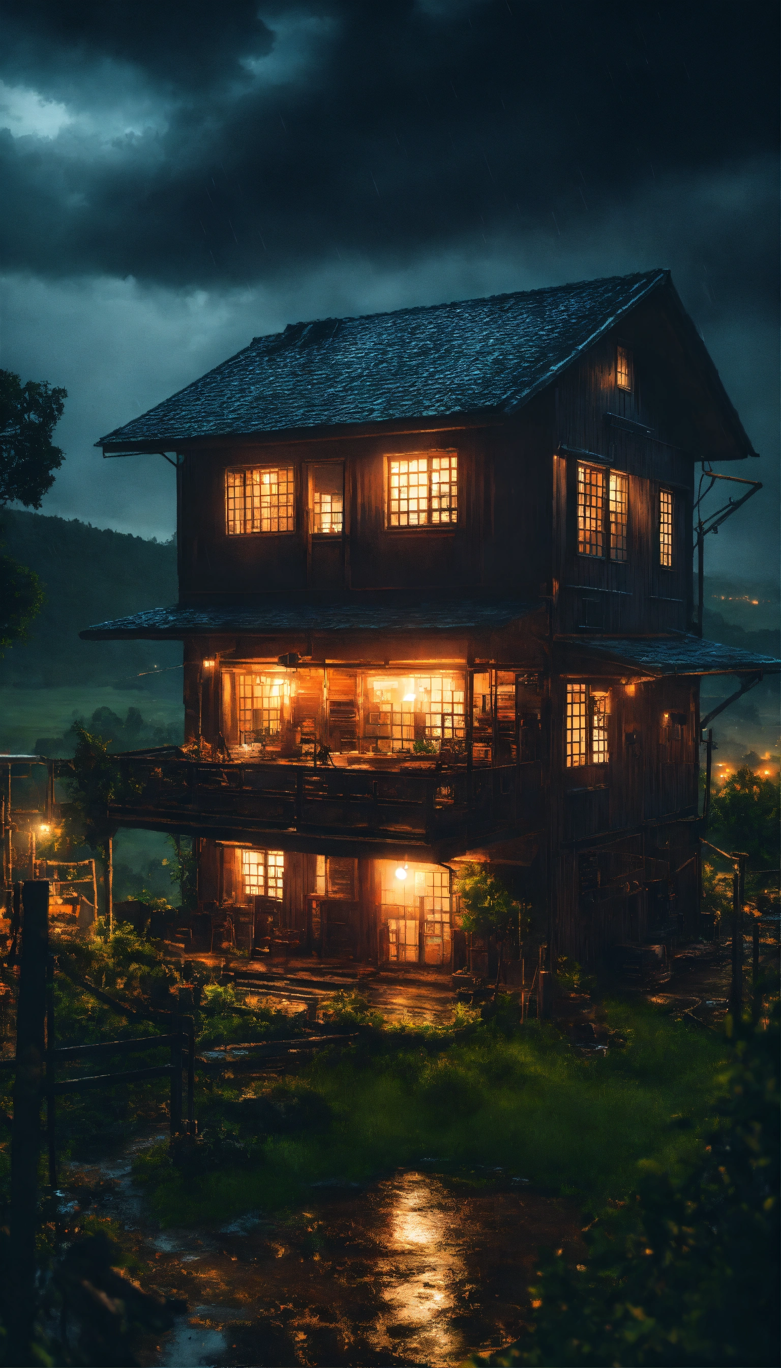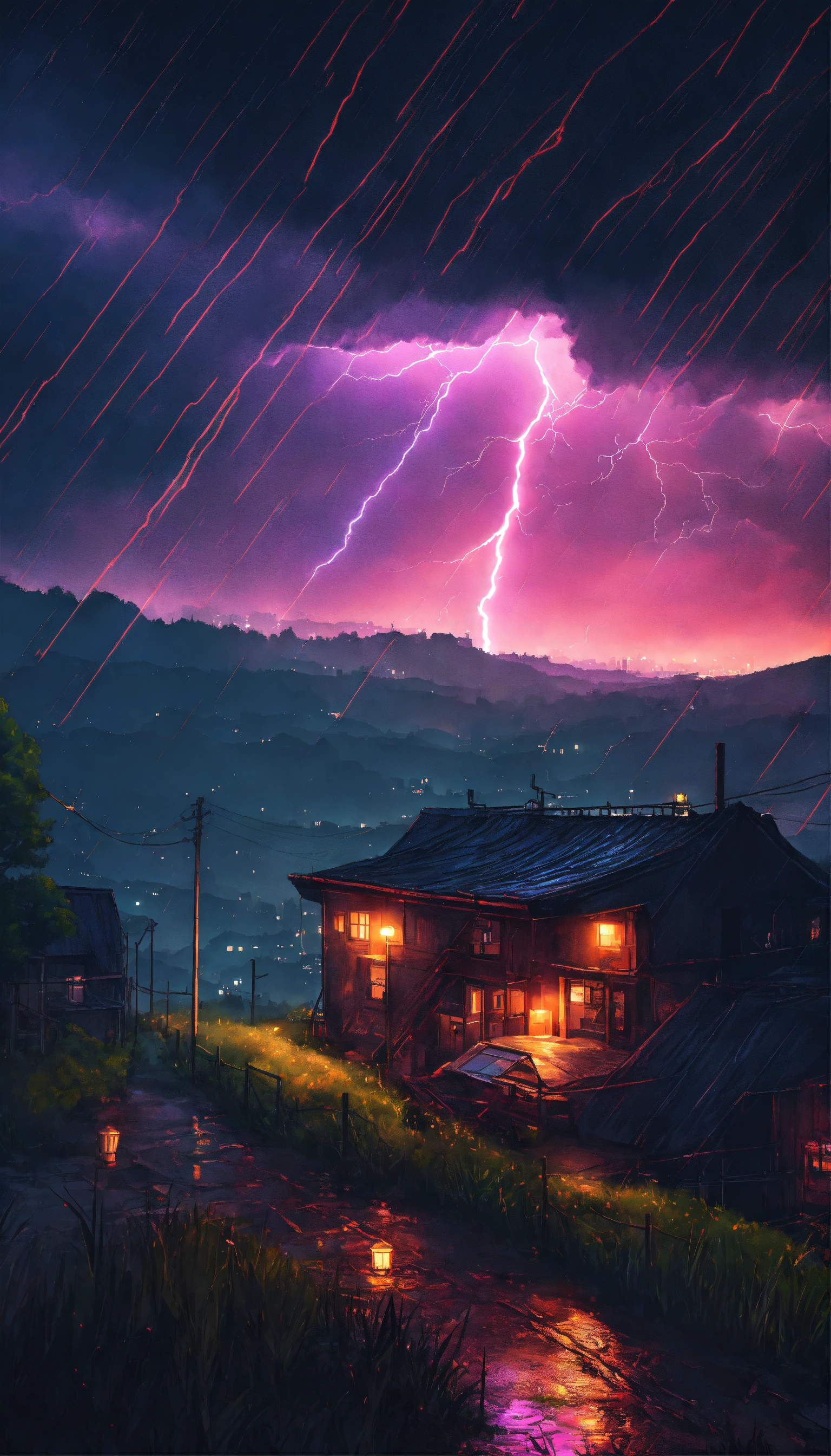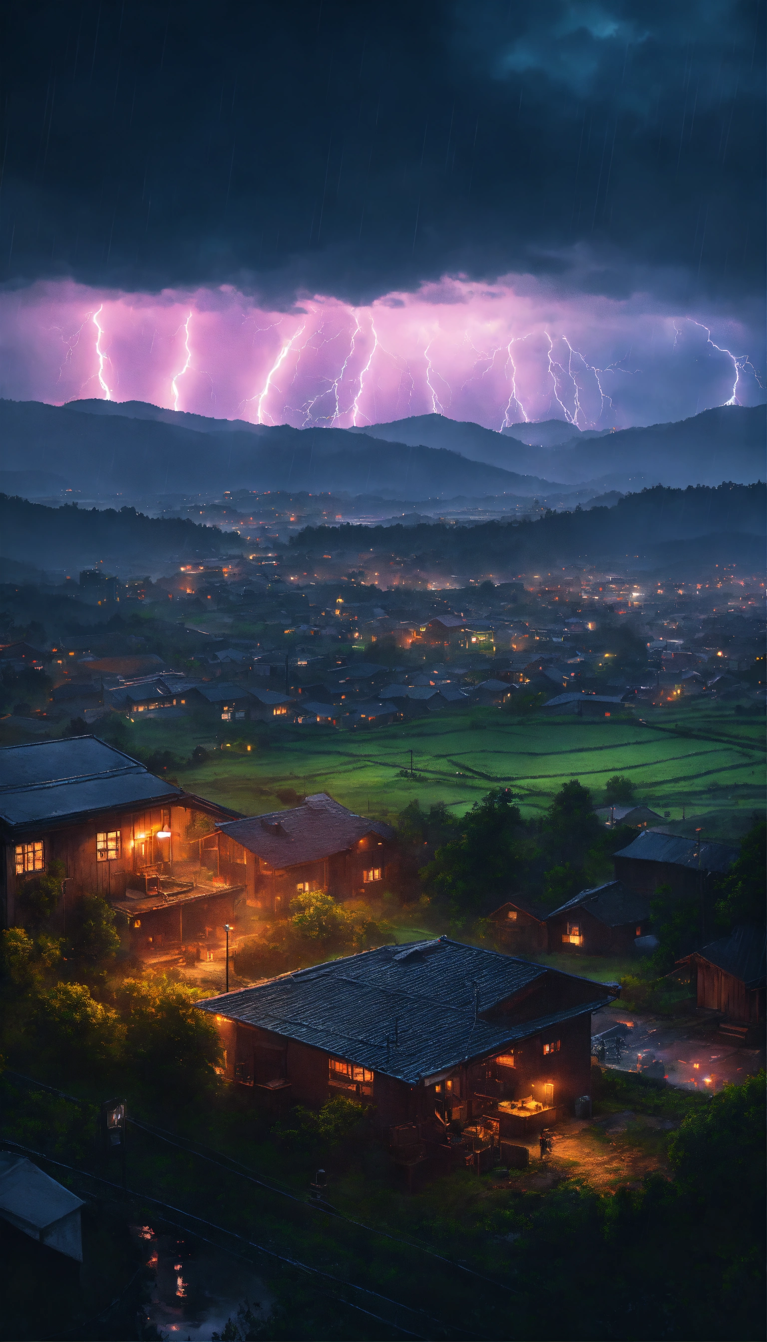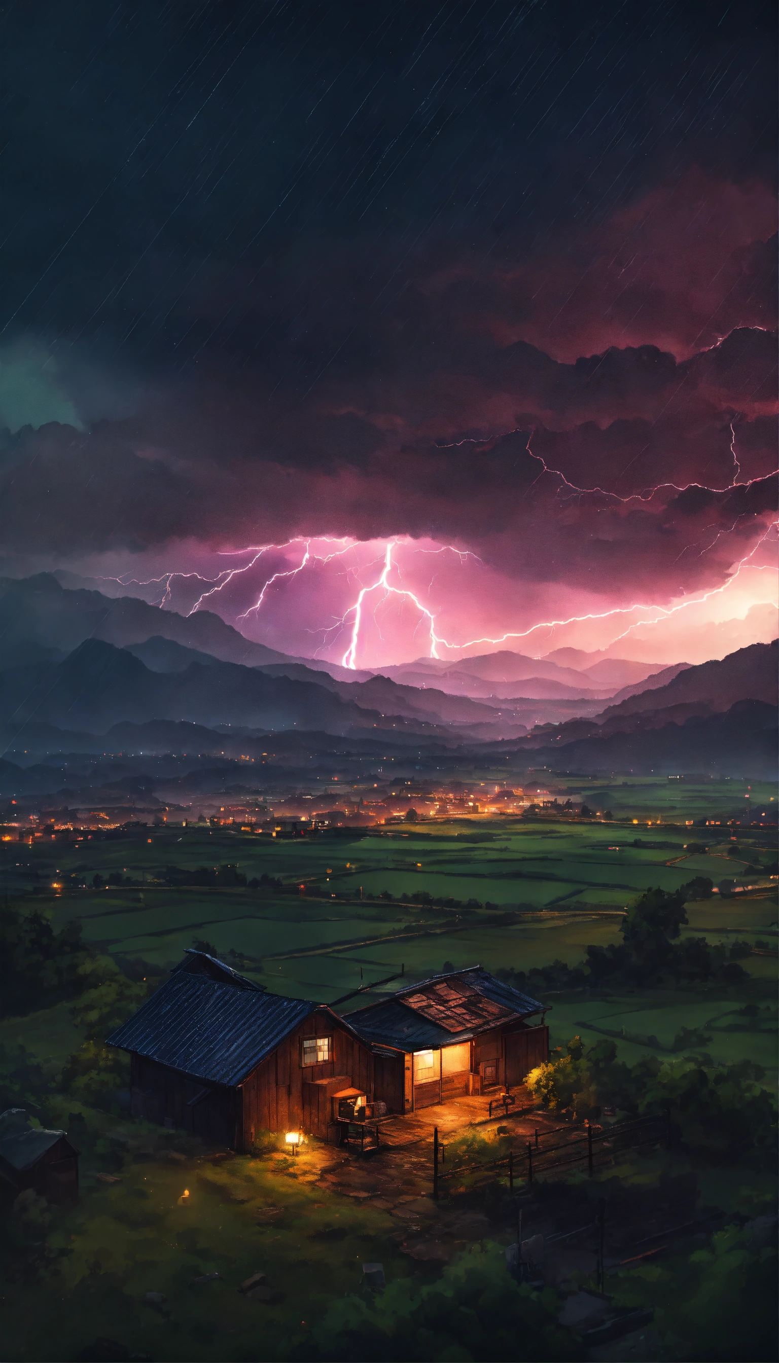 Beautiful cozy countryside with a view overlooking a cyberpunk countryside at night, thunderstorm outside with torrential rain, detailed aesthetic, nature, dark, gloomy and moody