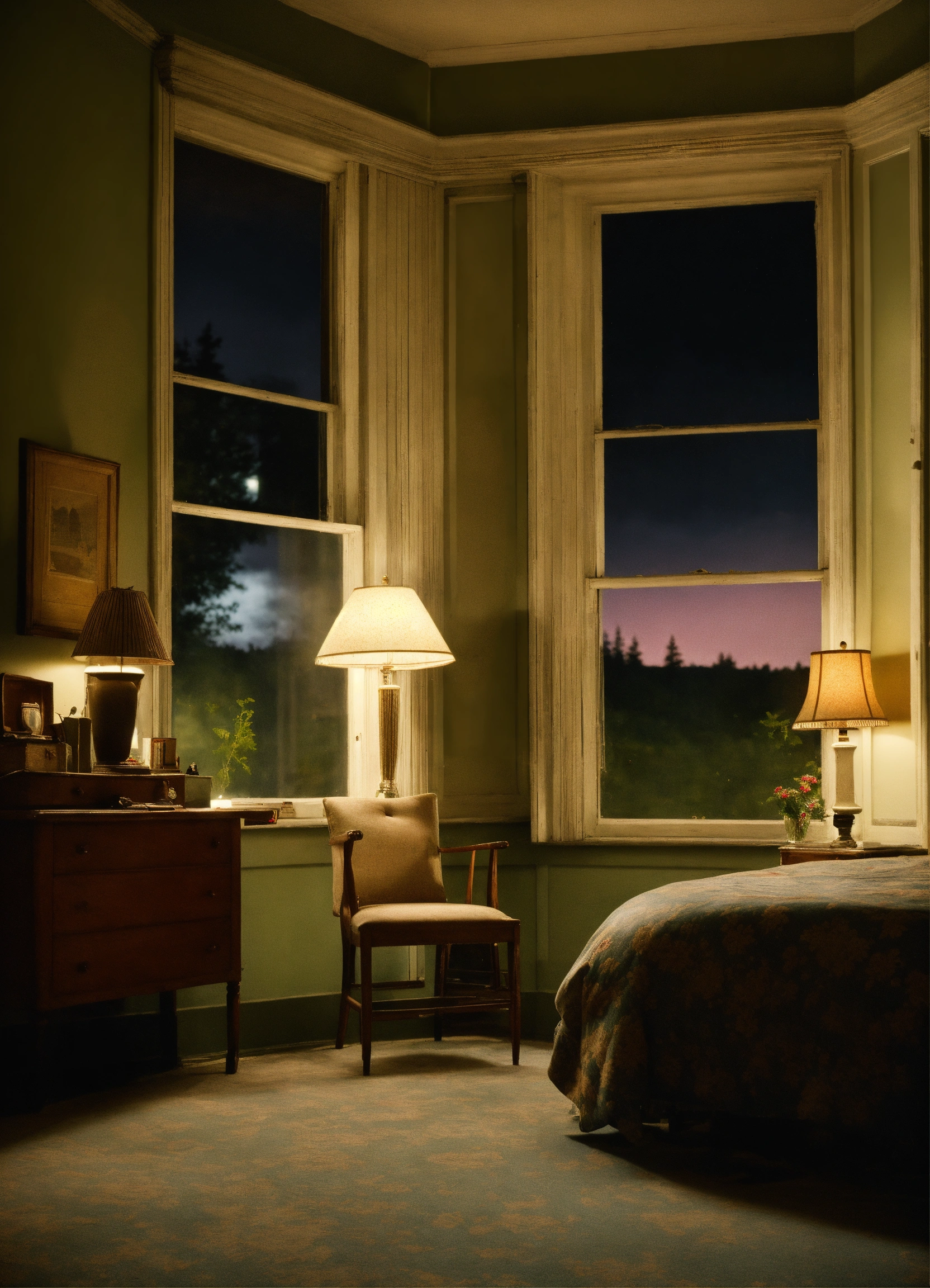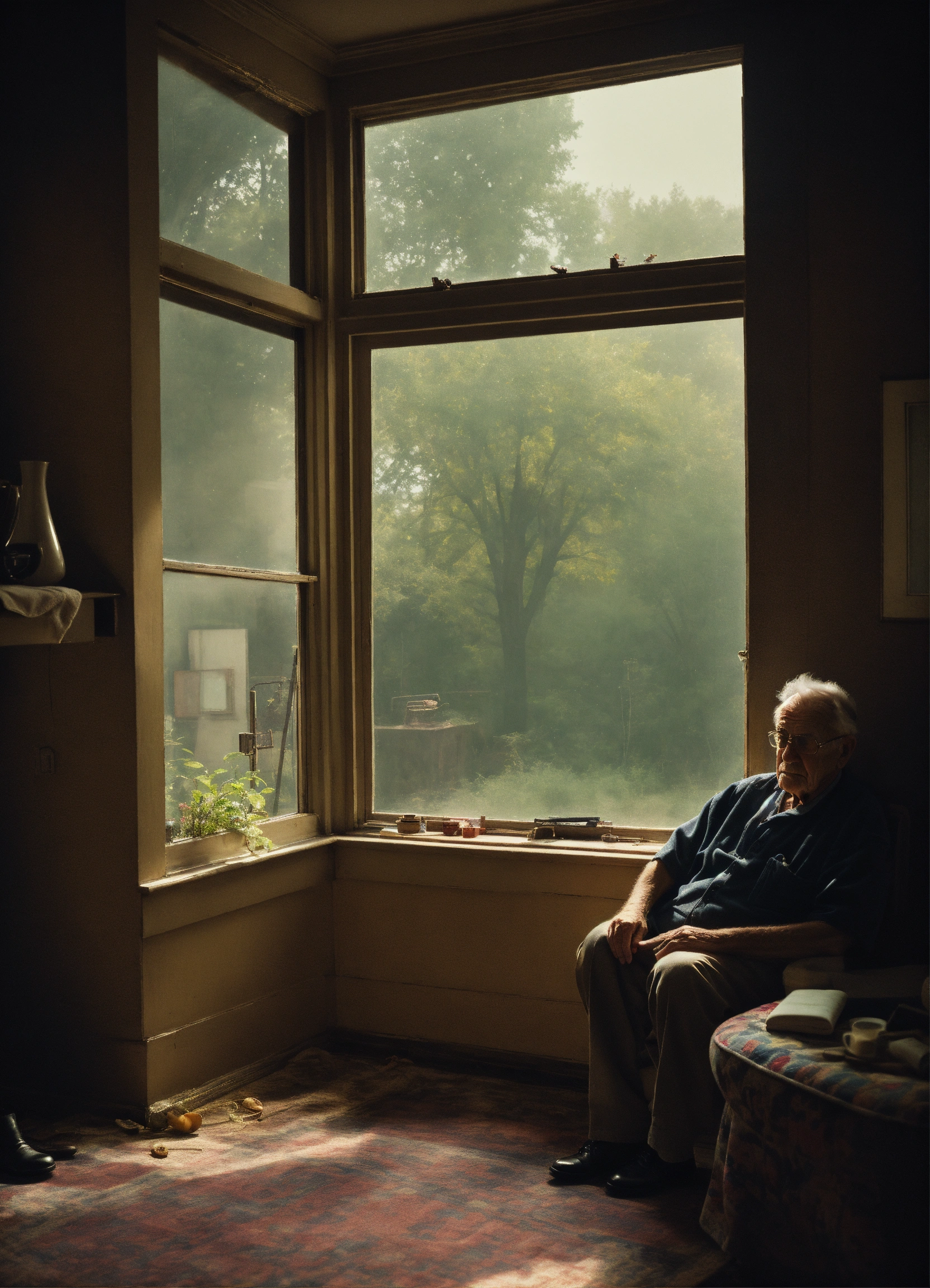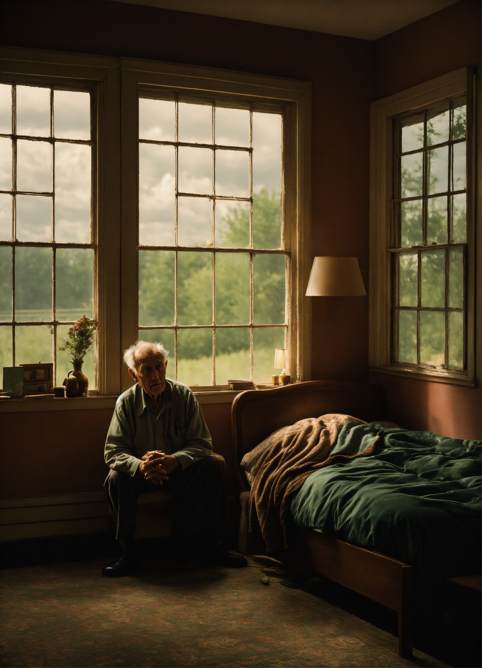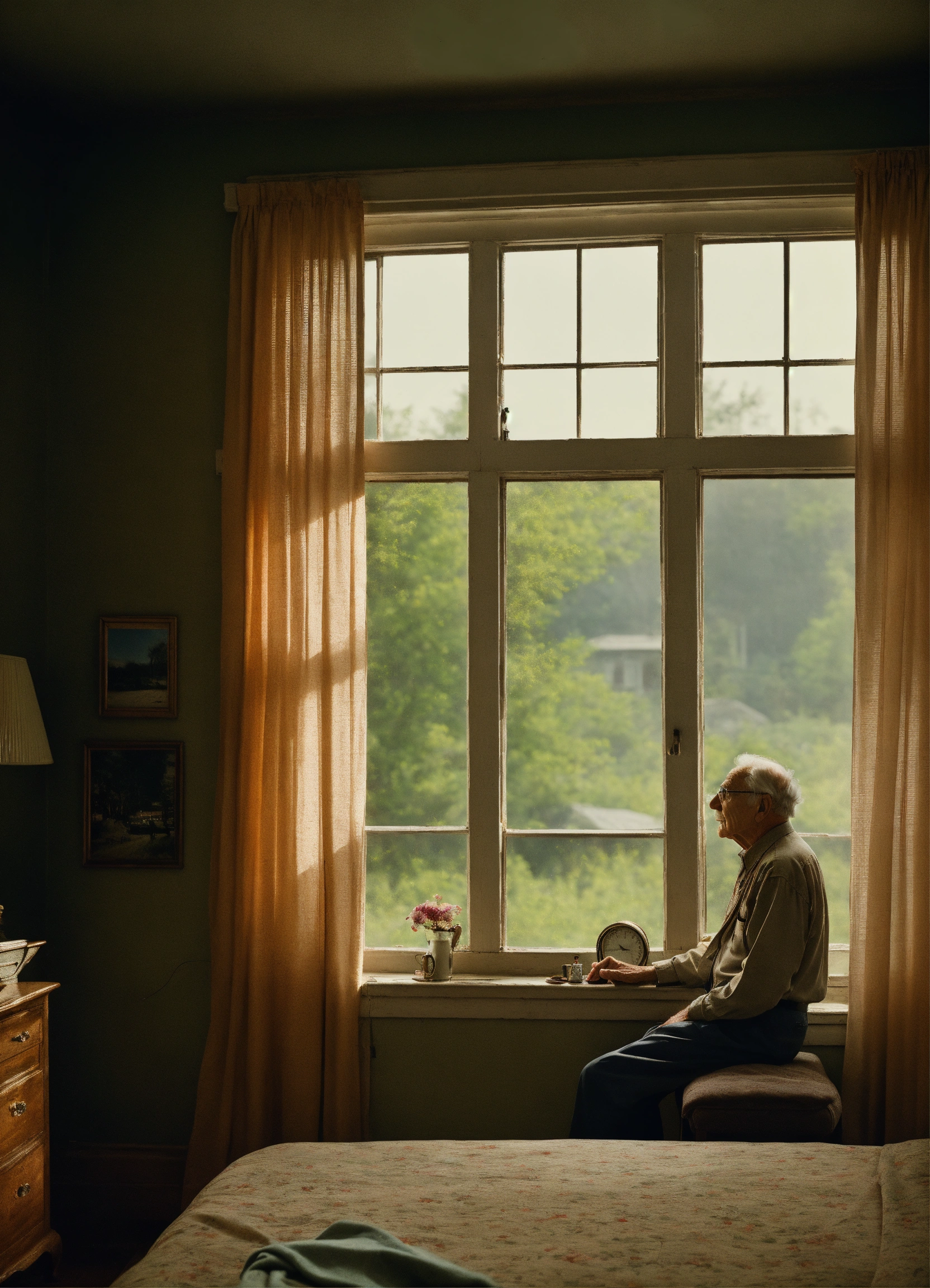 A photograph of an old man looking out of a large window, gregory crewdson style of drab retro american bedroom composition
