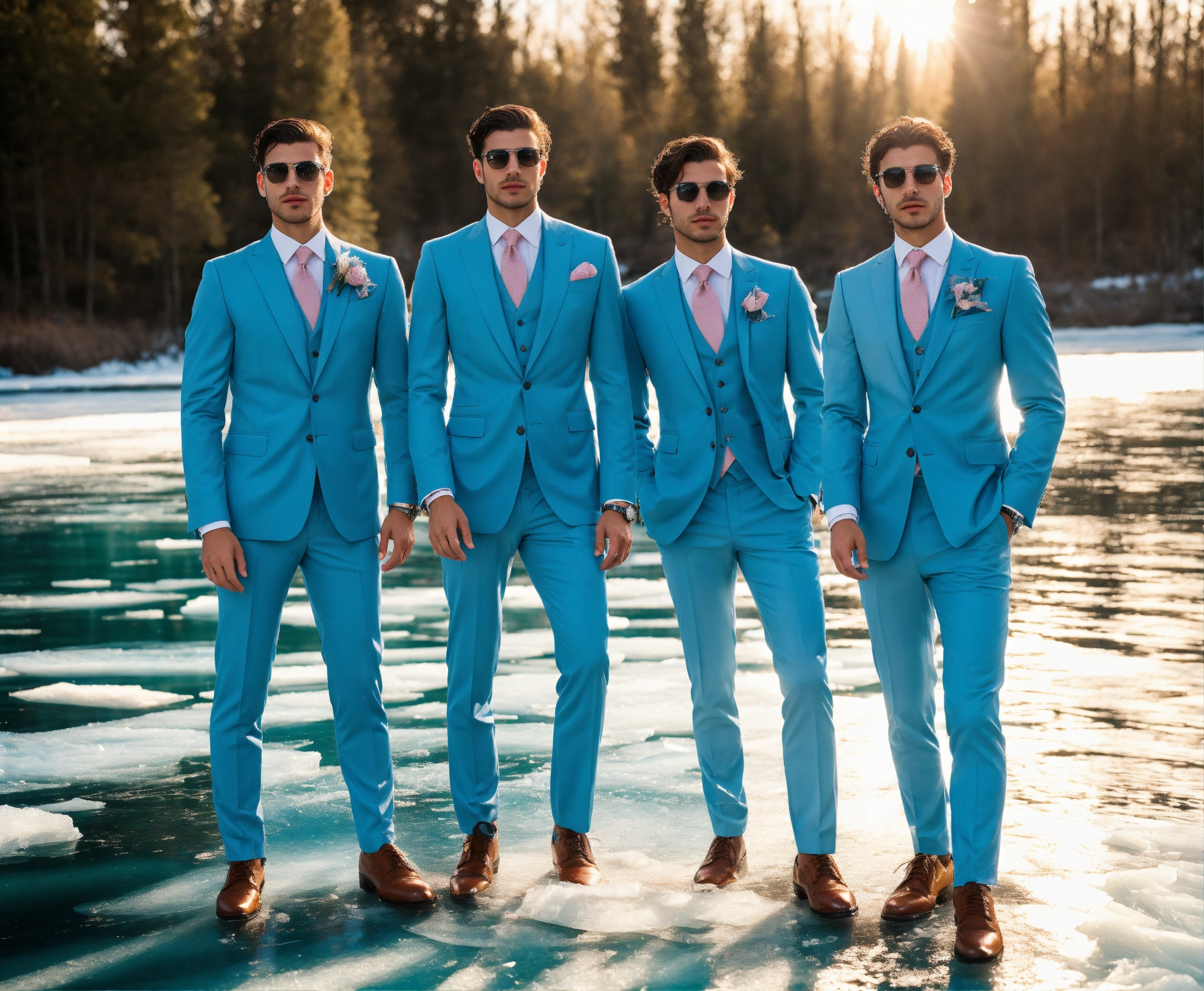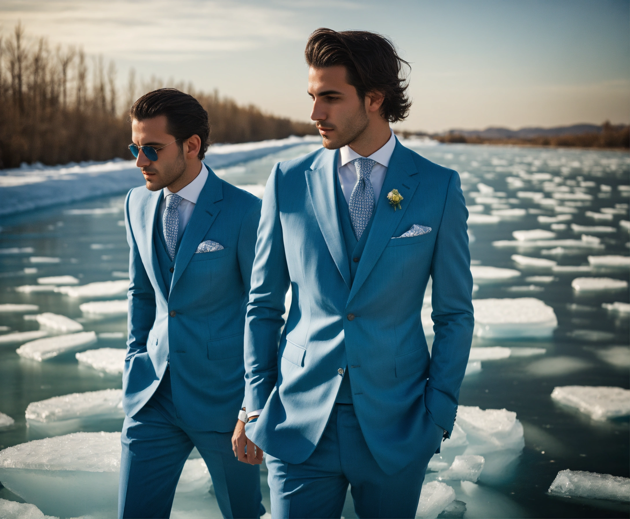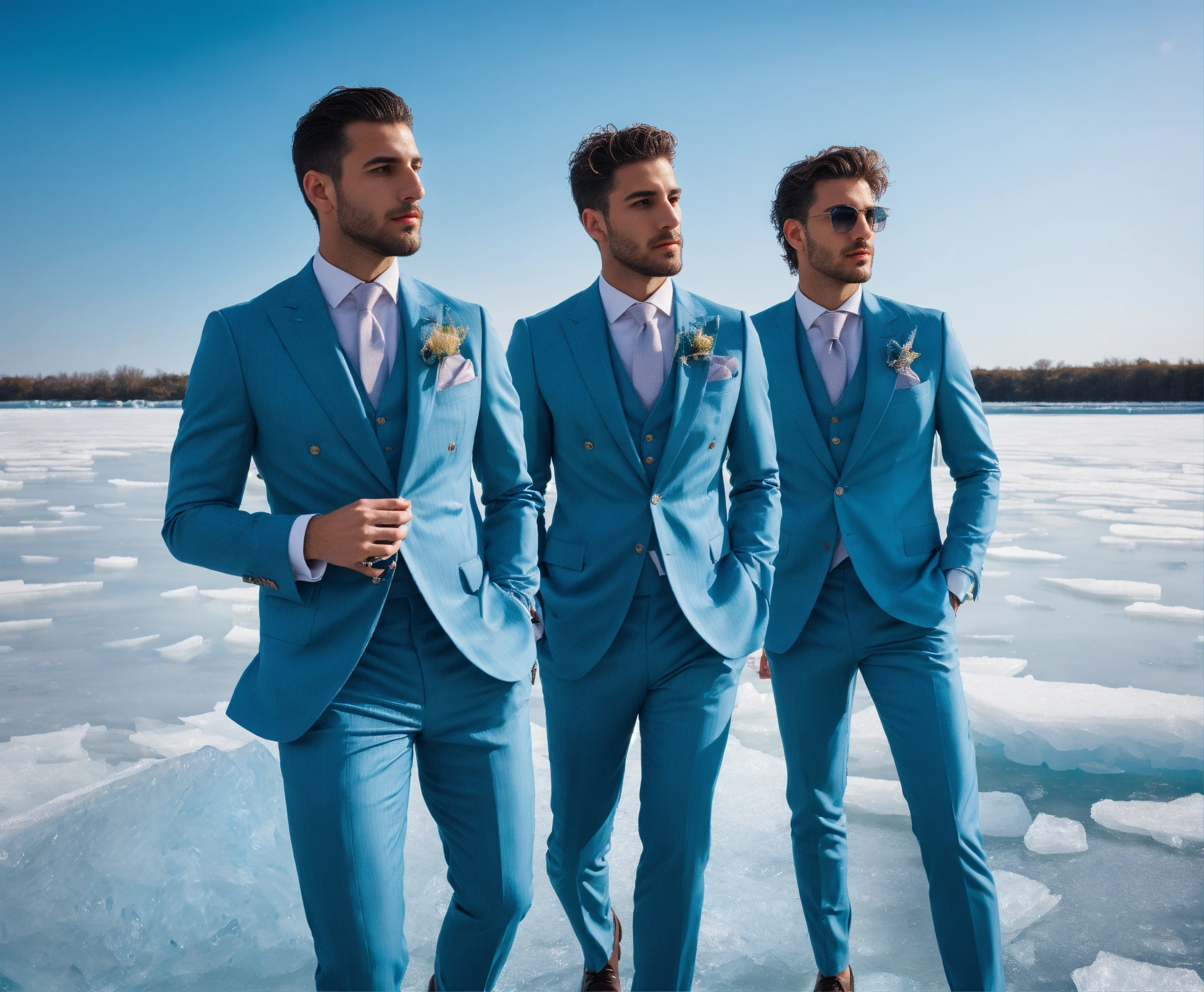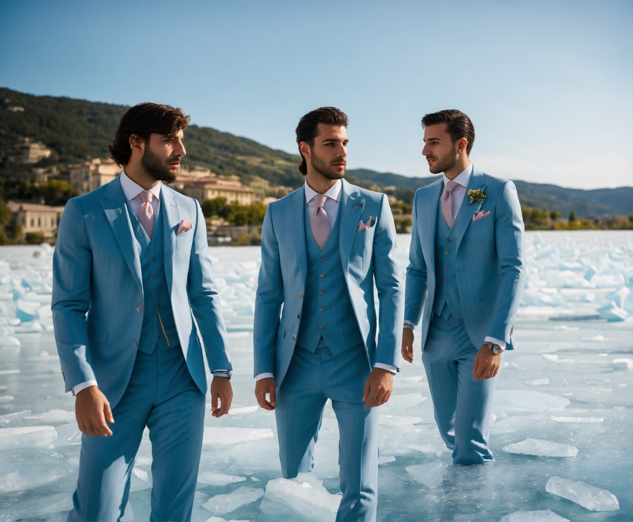 Three young italian male gentlemen in light blue pinstripe suit in the ice under sunshine