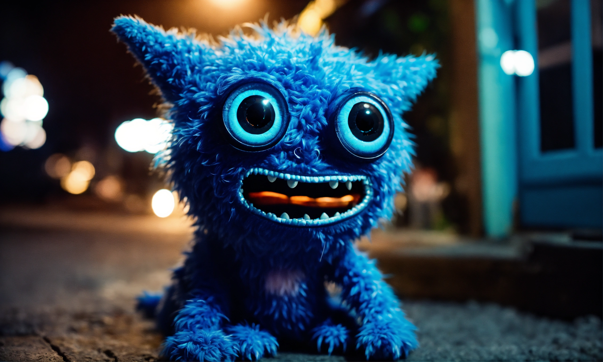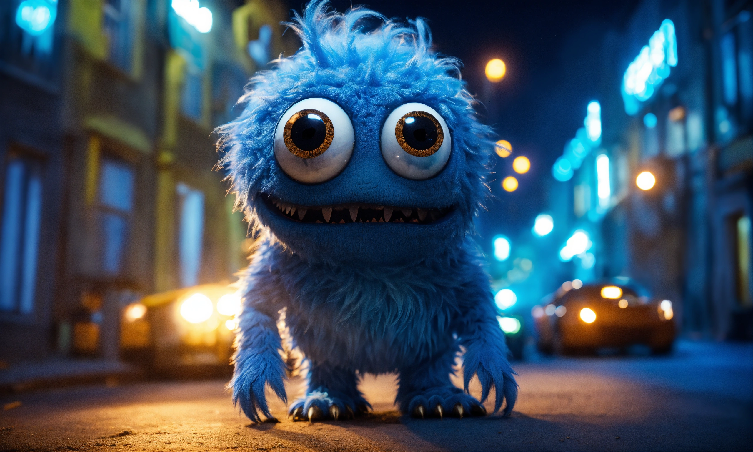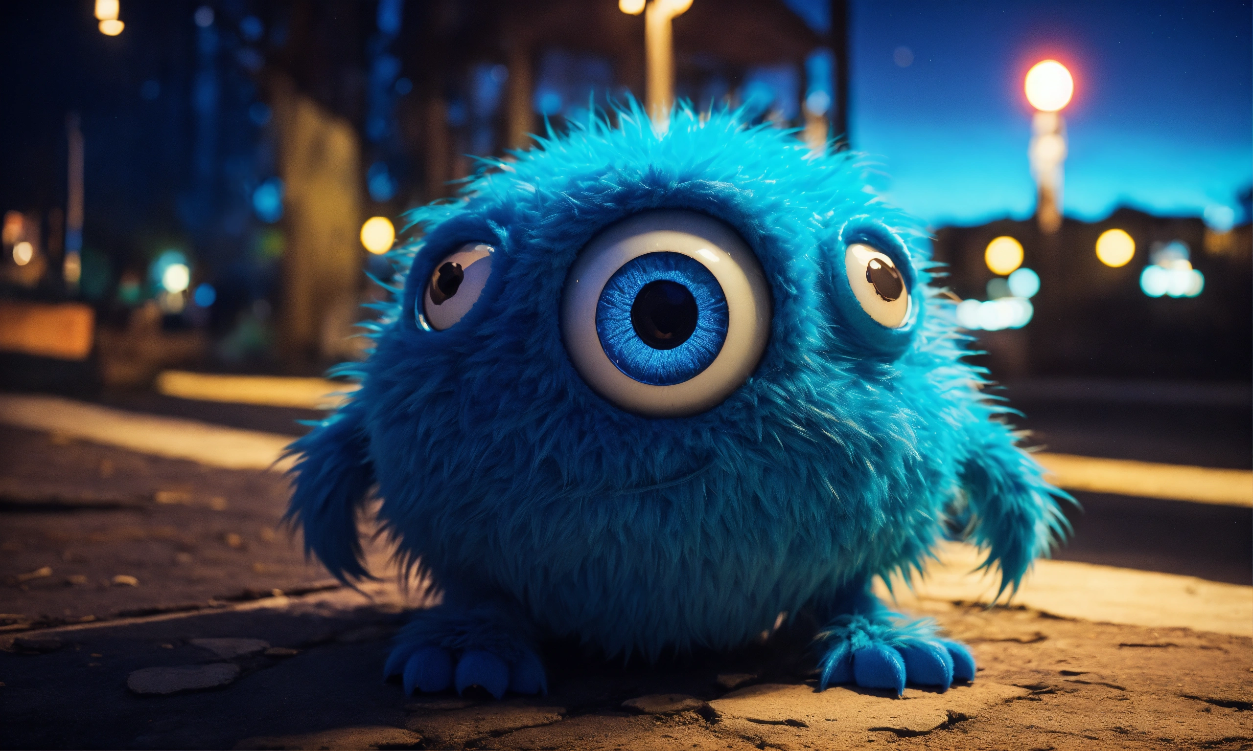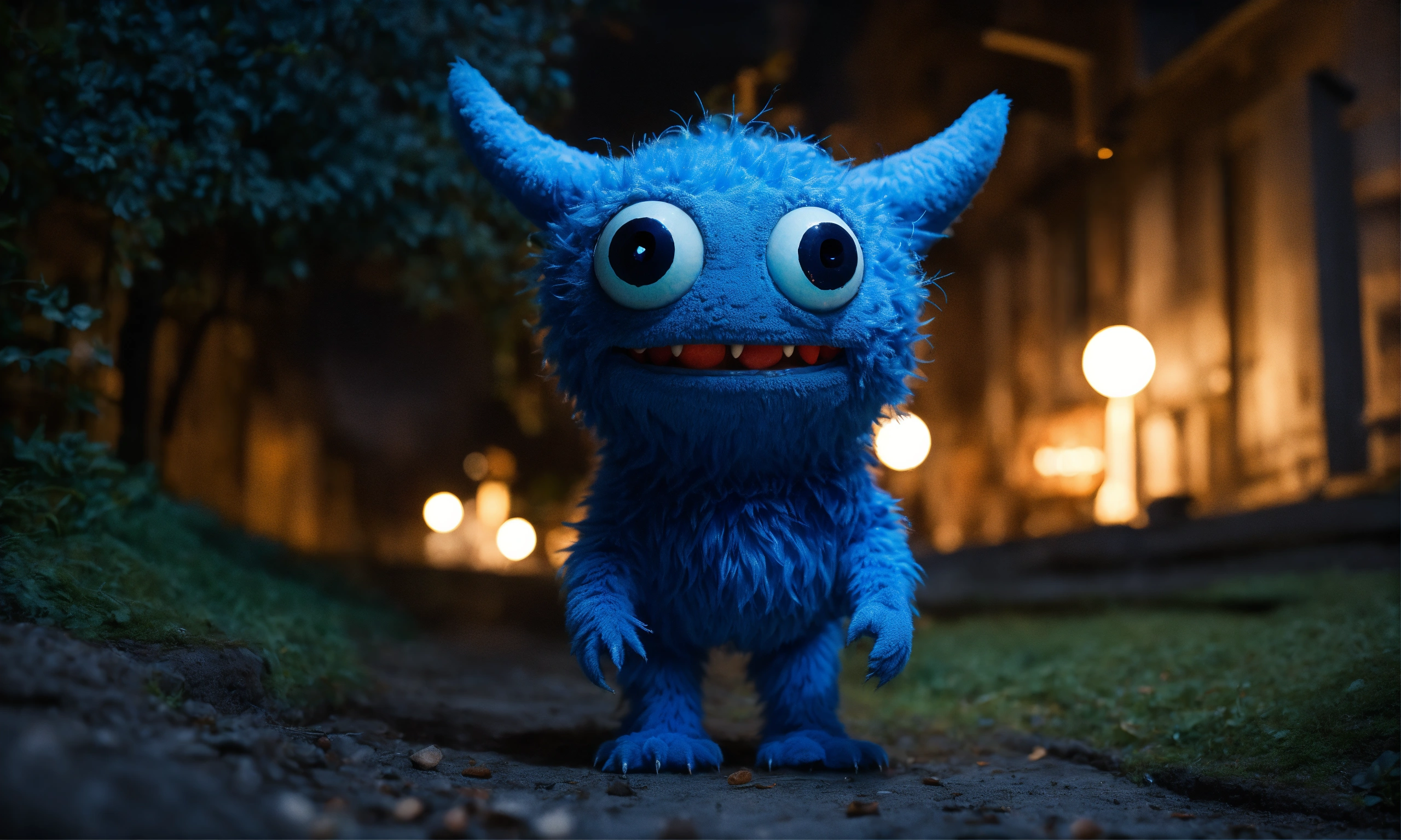 Very cute, realistic blue monster whit many eyes standing in background complete dark, unsettling, wide angle, night time, shot on leica