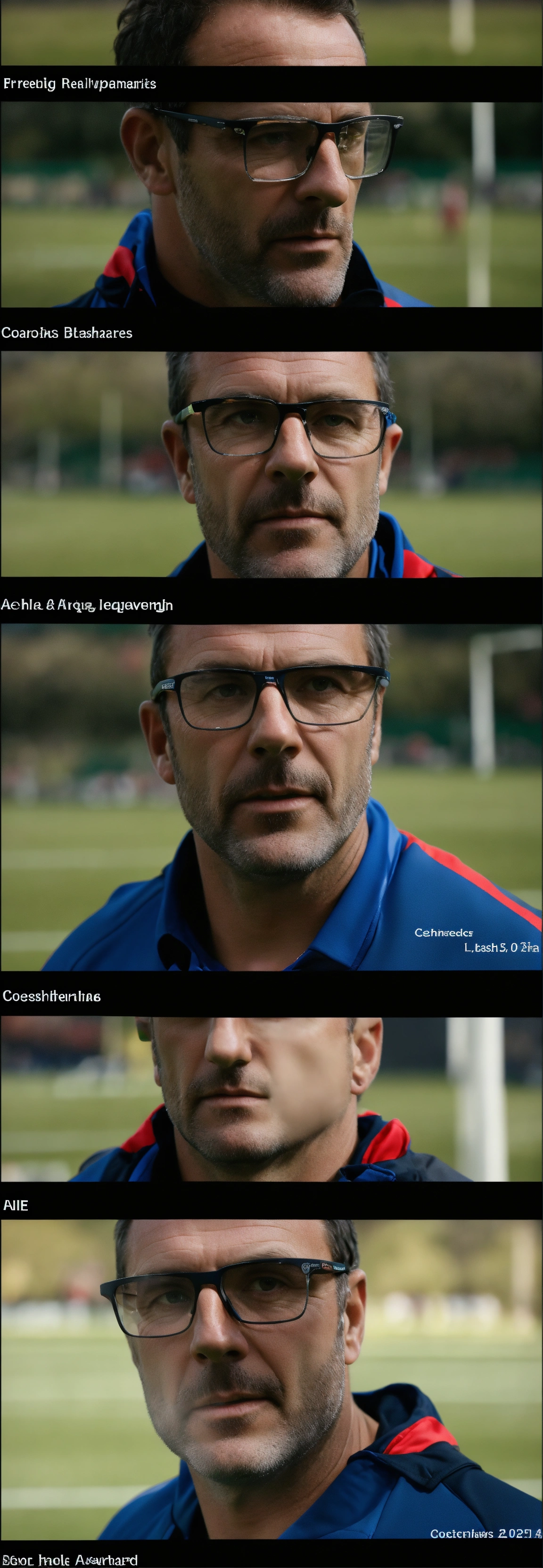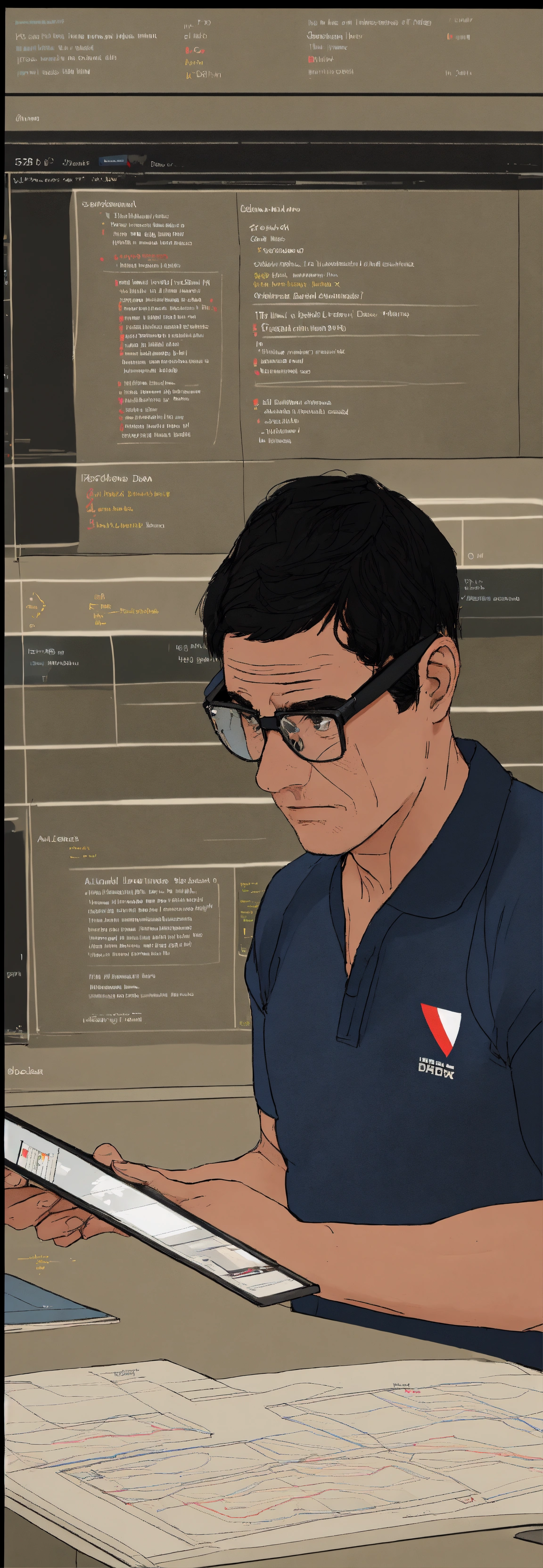 Portrait of a french rugby coach wearing a pair of oversized black, rectangular frames with thin temples. the frames are slightly wider at the top than at the bottom, and the lenses are slightly tinted. the coach is analyzing. lots of screens with sophisticated data dashboards and diagrams. boards with strategy sketches. video analysis.