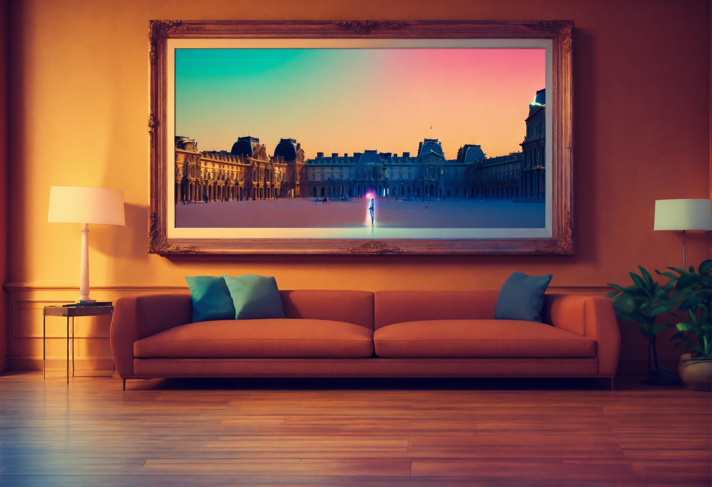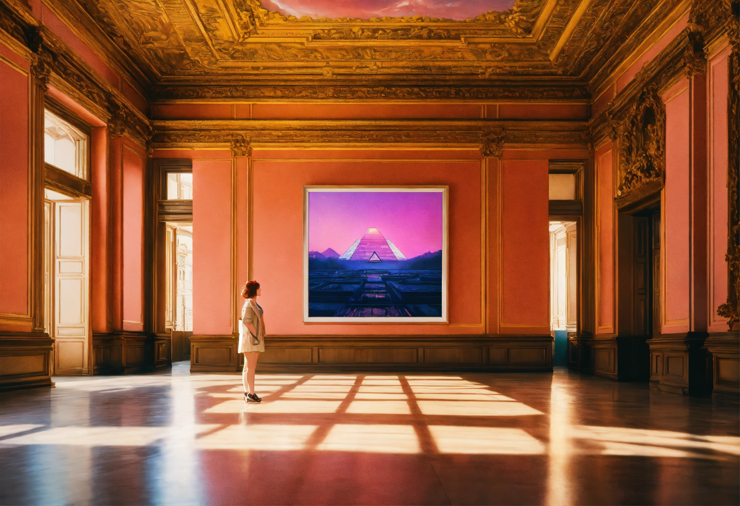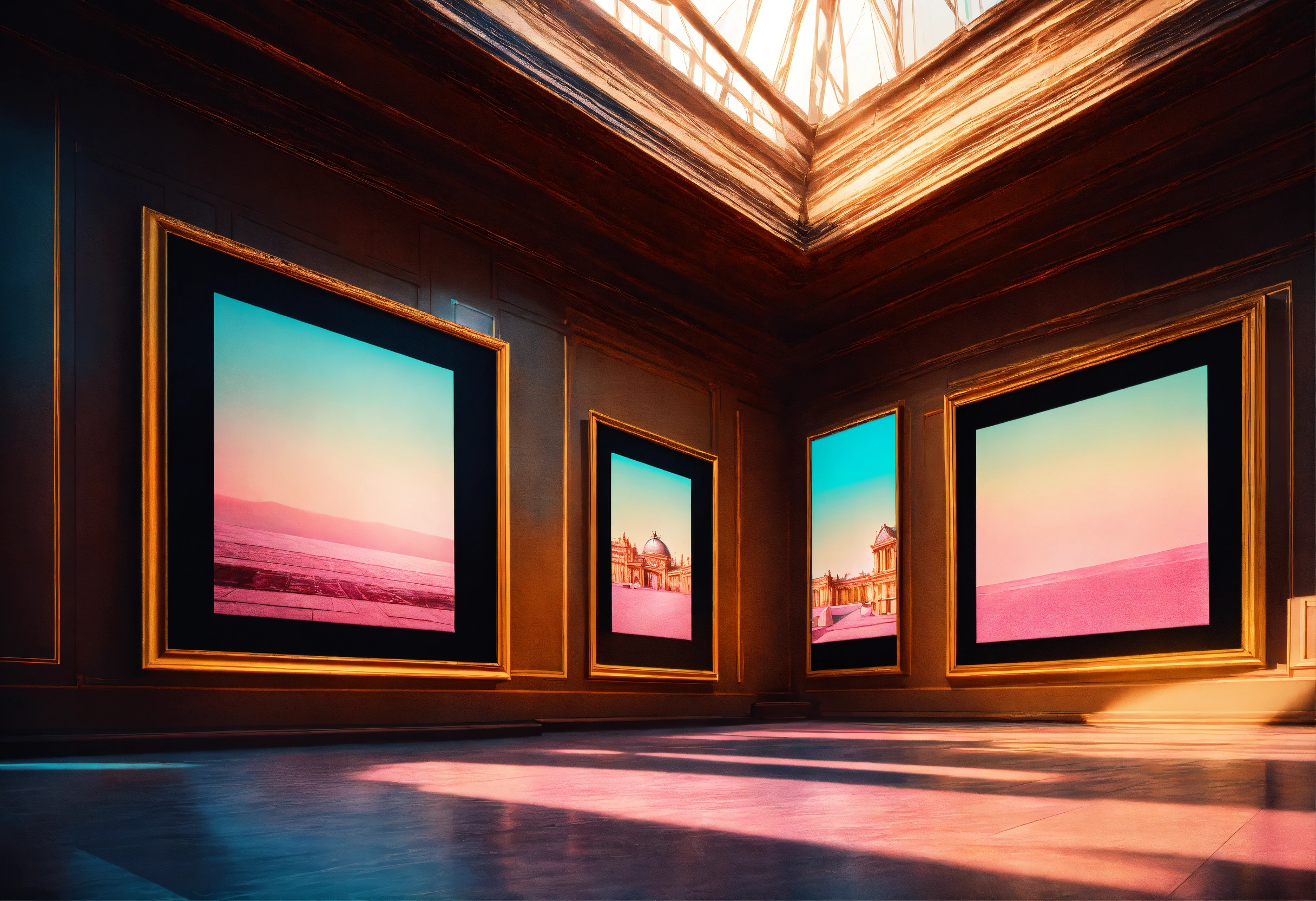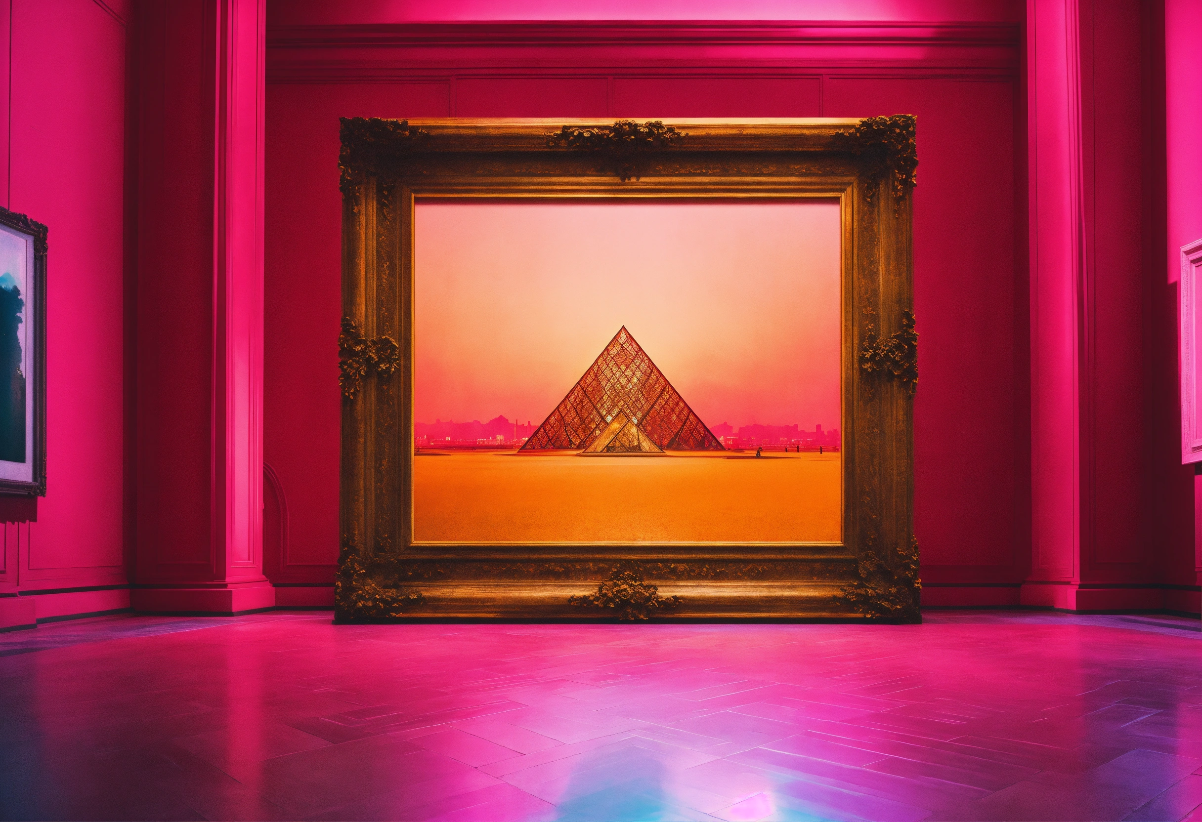 A beautiful, sharp focus, large picture frame on the wall. in the middle of the louvre. in a large room. wide angle. vaporwave ombre rendering. by chris moore. by edward hopper. beeple colors. ambient occlusion. digital matte painting. metropolis filmic.