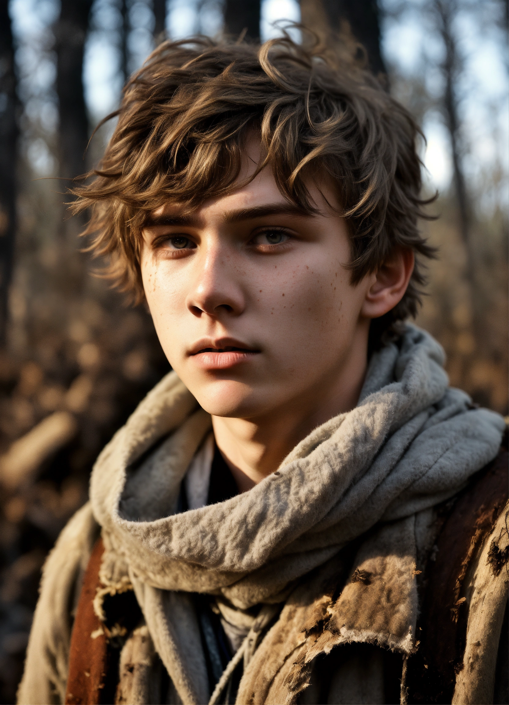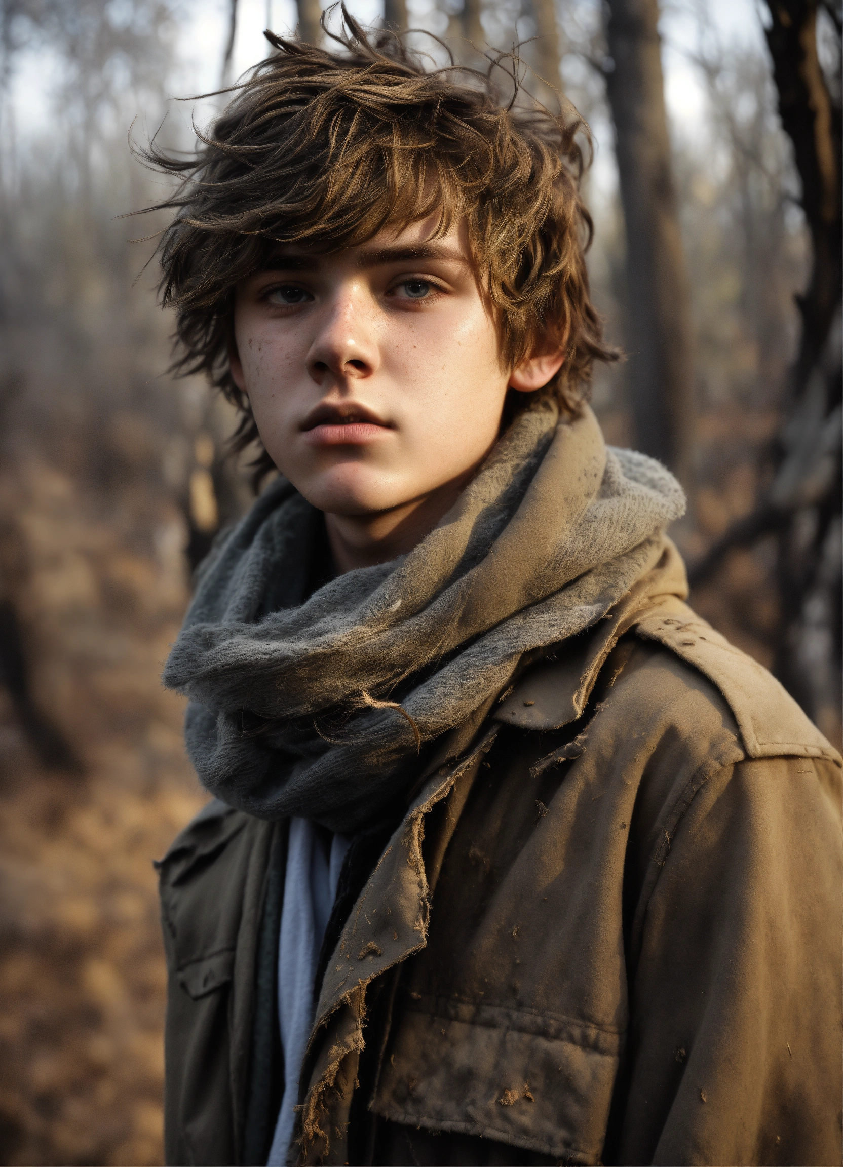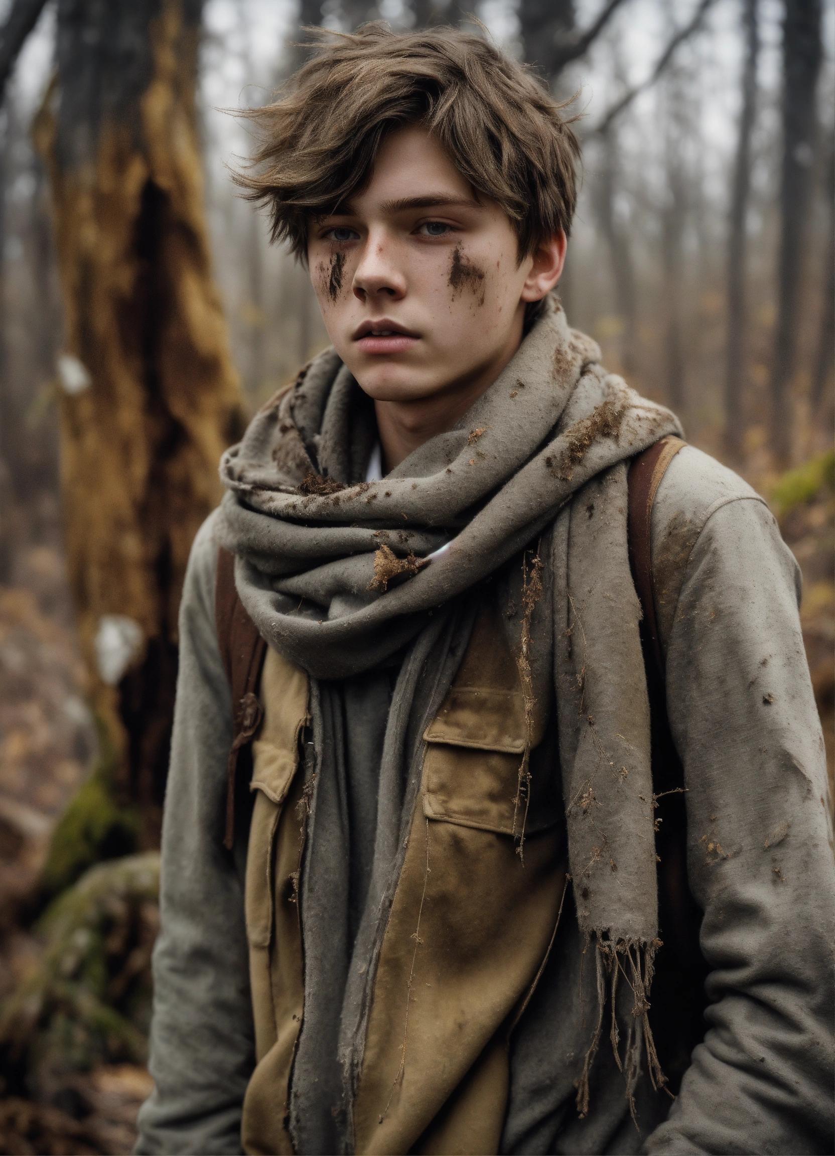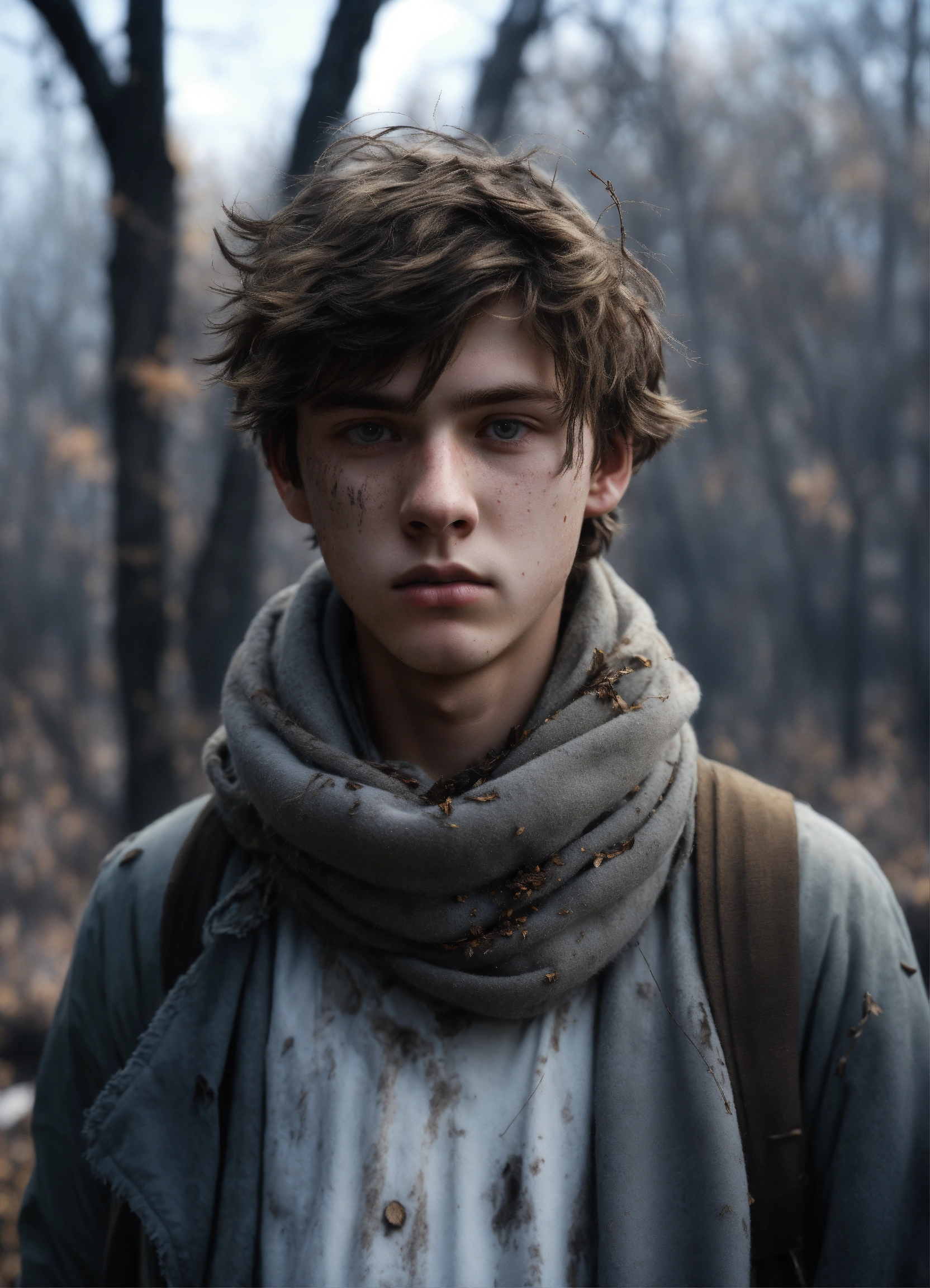 An ultra realistic photograph of a white 16 years old boy, with dirty face, thin lips, dark blonde hair, brown slanted eyes, messy hair, white skin, sad expression, wearing a scarf and post-apocalyptic gray warm clothes, in the background, a forest of leafless dead trees, ashes in the air, hyperrealistic, hyperdetailed, 4k