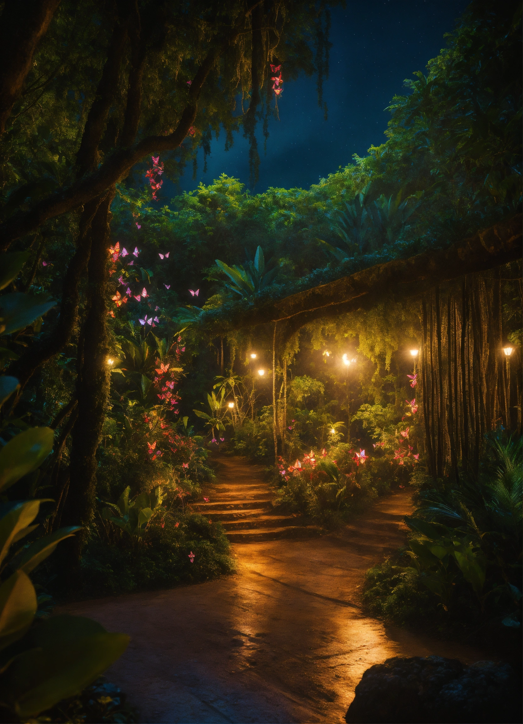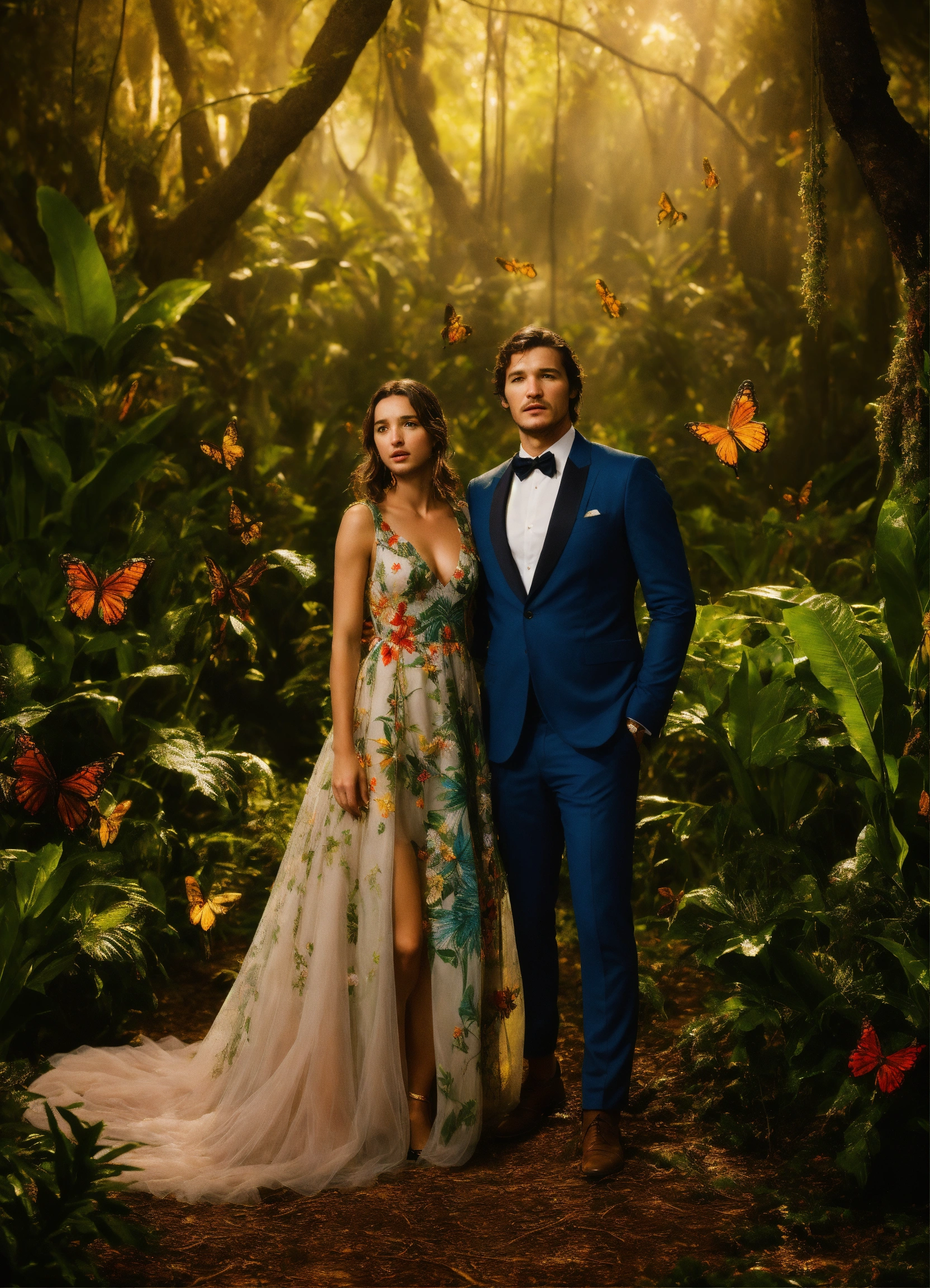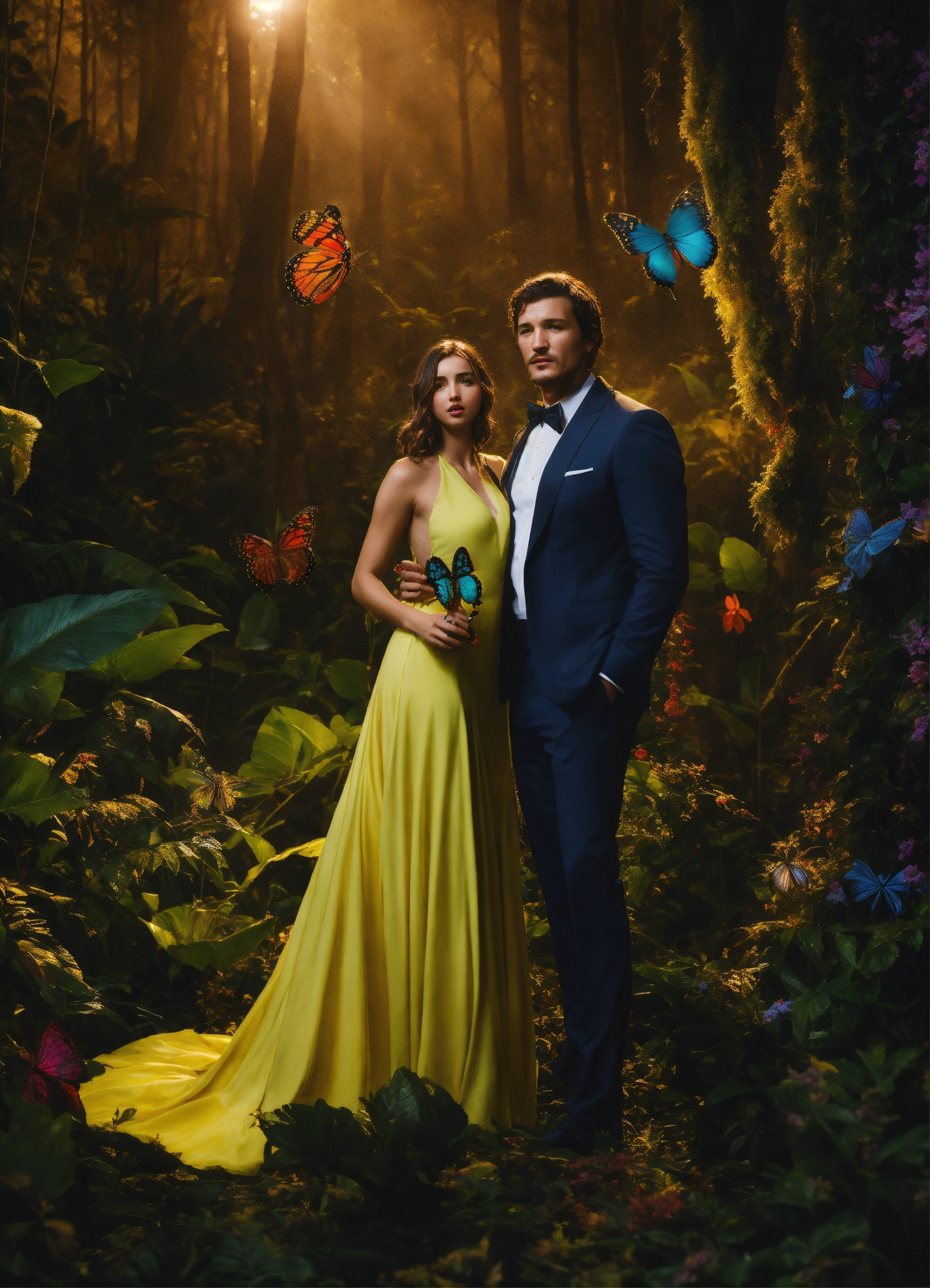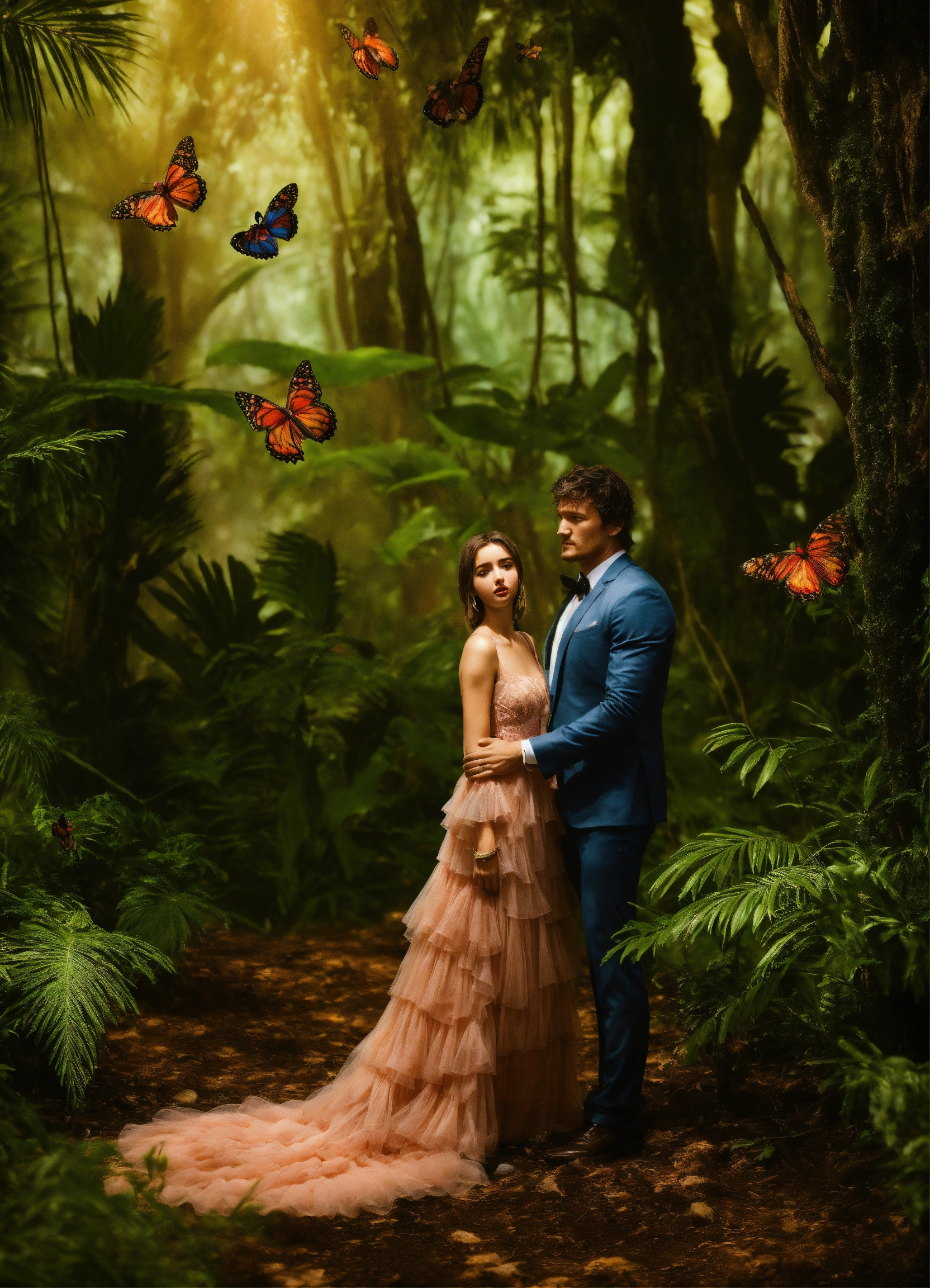 Pedro pascal con smoking y ana de armas con un vestido de gala están abrazados dentro de una jaula formada por ramas, raíces y lianas que salen de la tierra y de los árboles como manos gigantes y los envuelven y sostienen en el aire, en medio de un exuberante bosque tropical nocturno con mariposas y luciérnagas. hyper realistic, high definition, ambiente mágico, oscuro y colorido