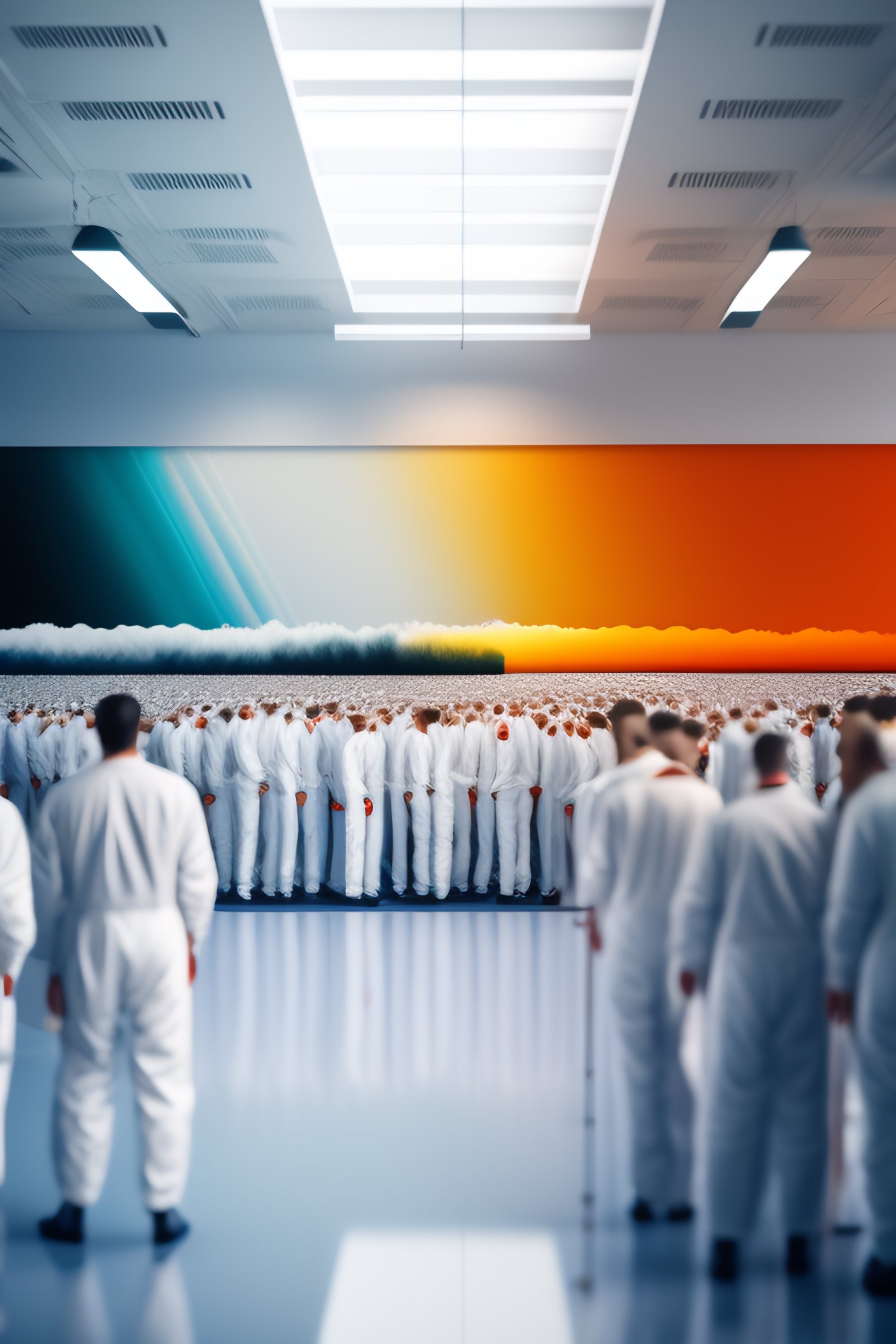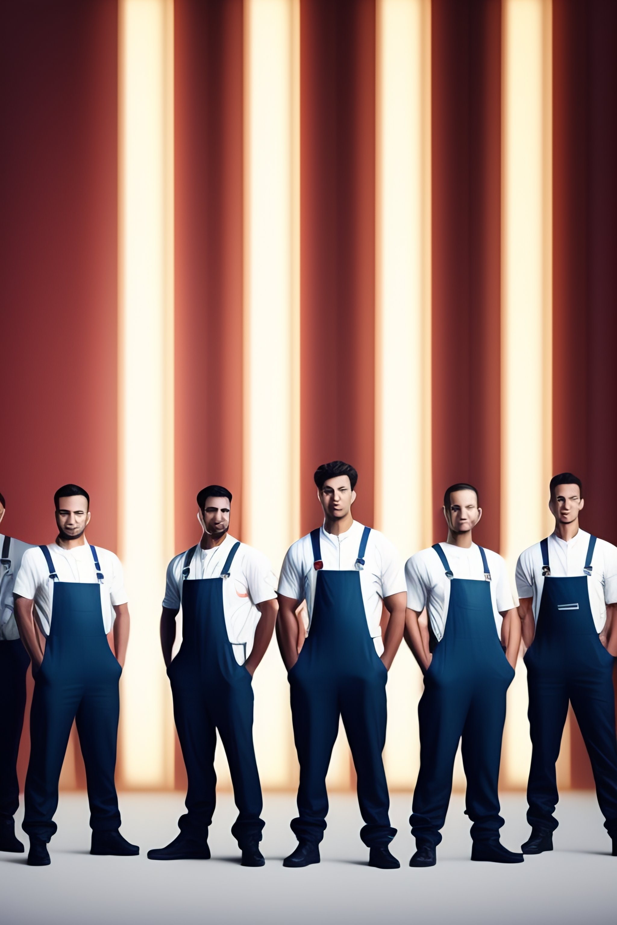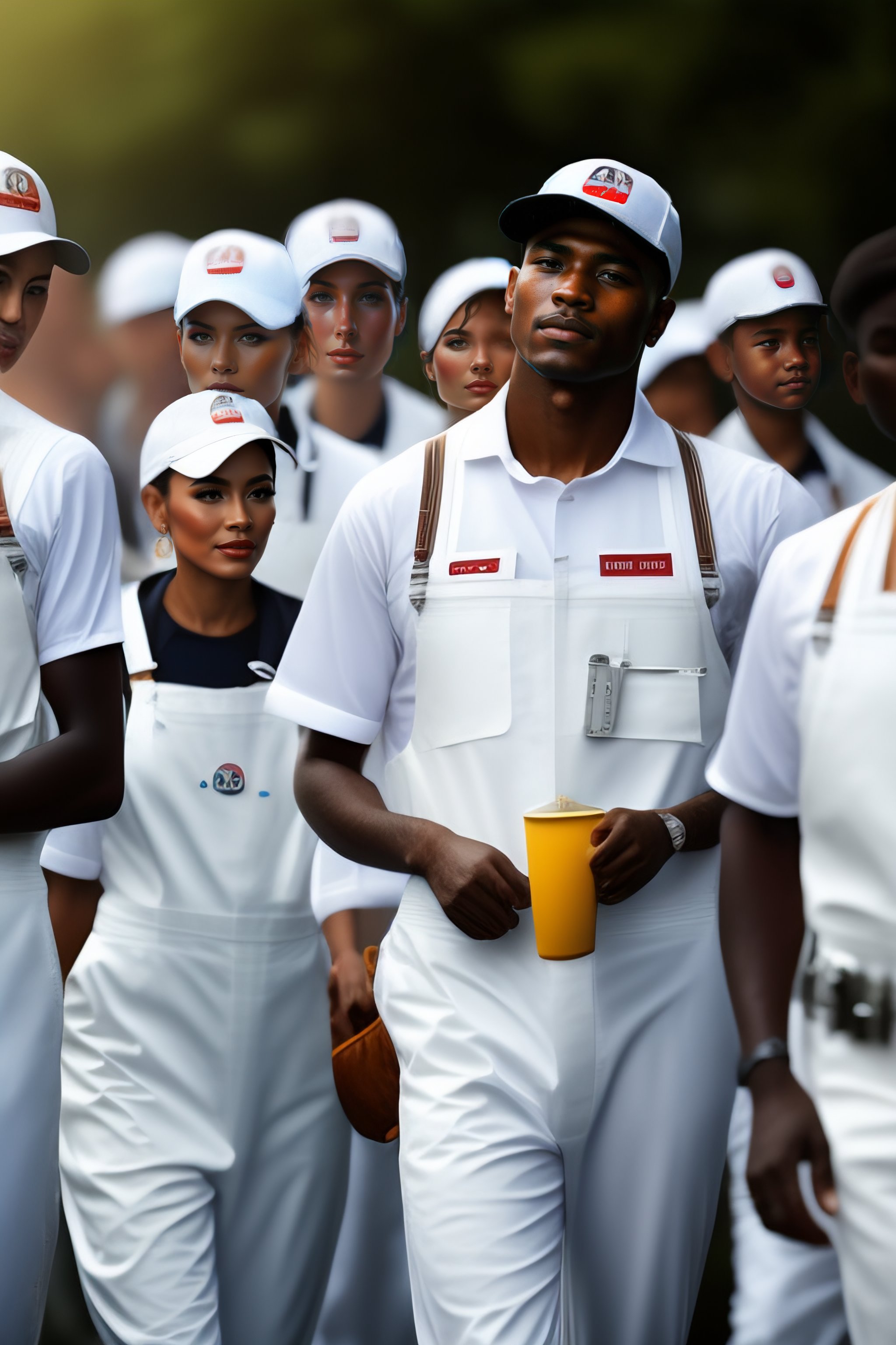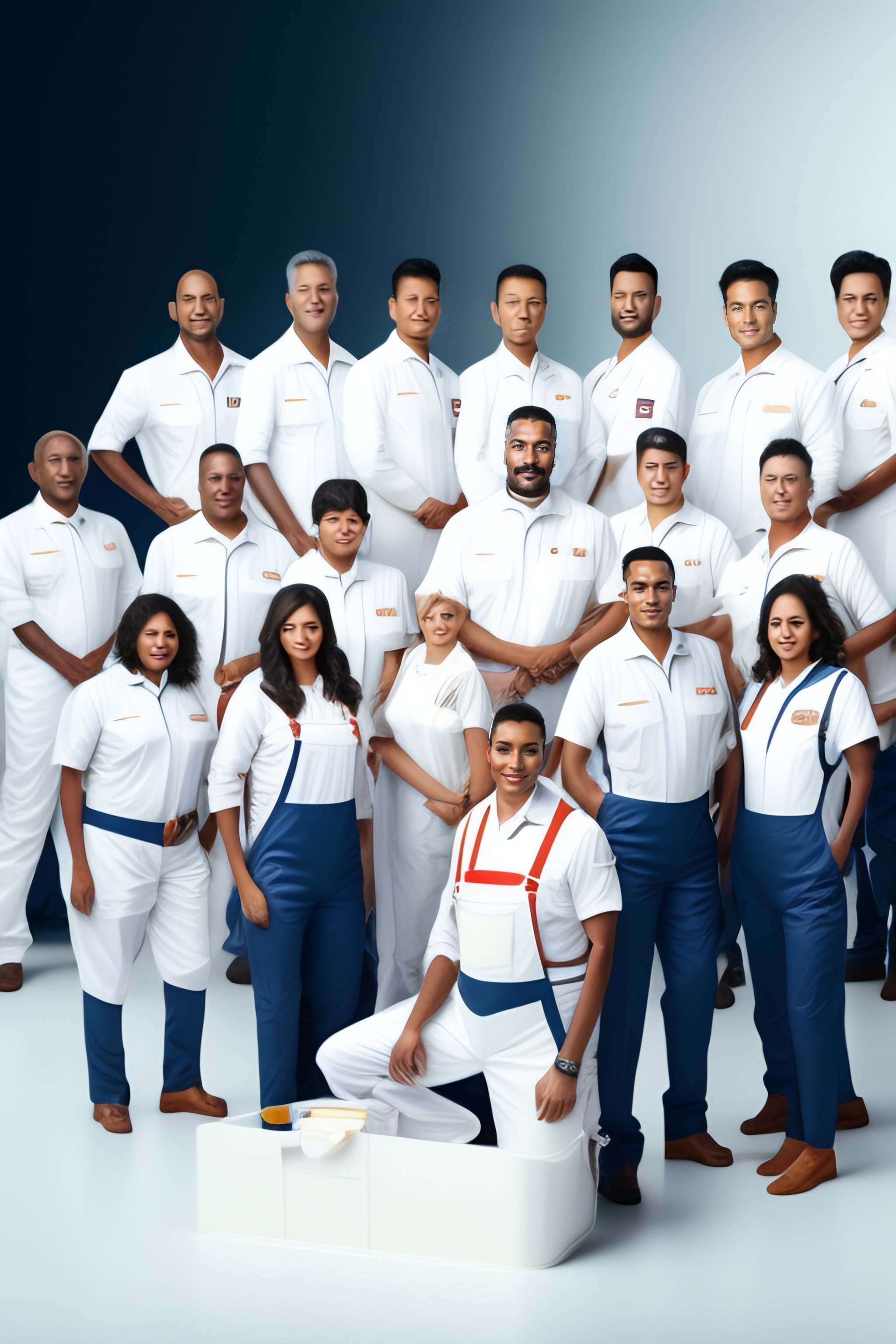 A big crowd of painters wearing white uniform overalls on white background