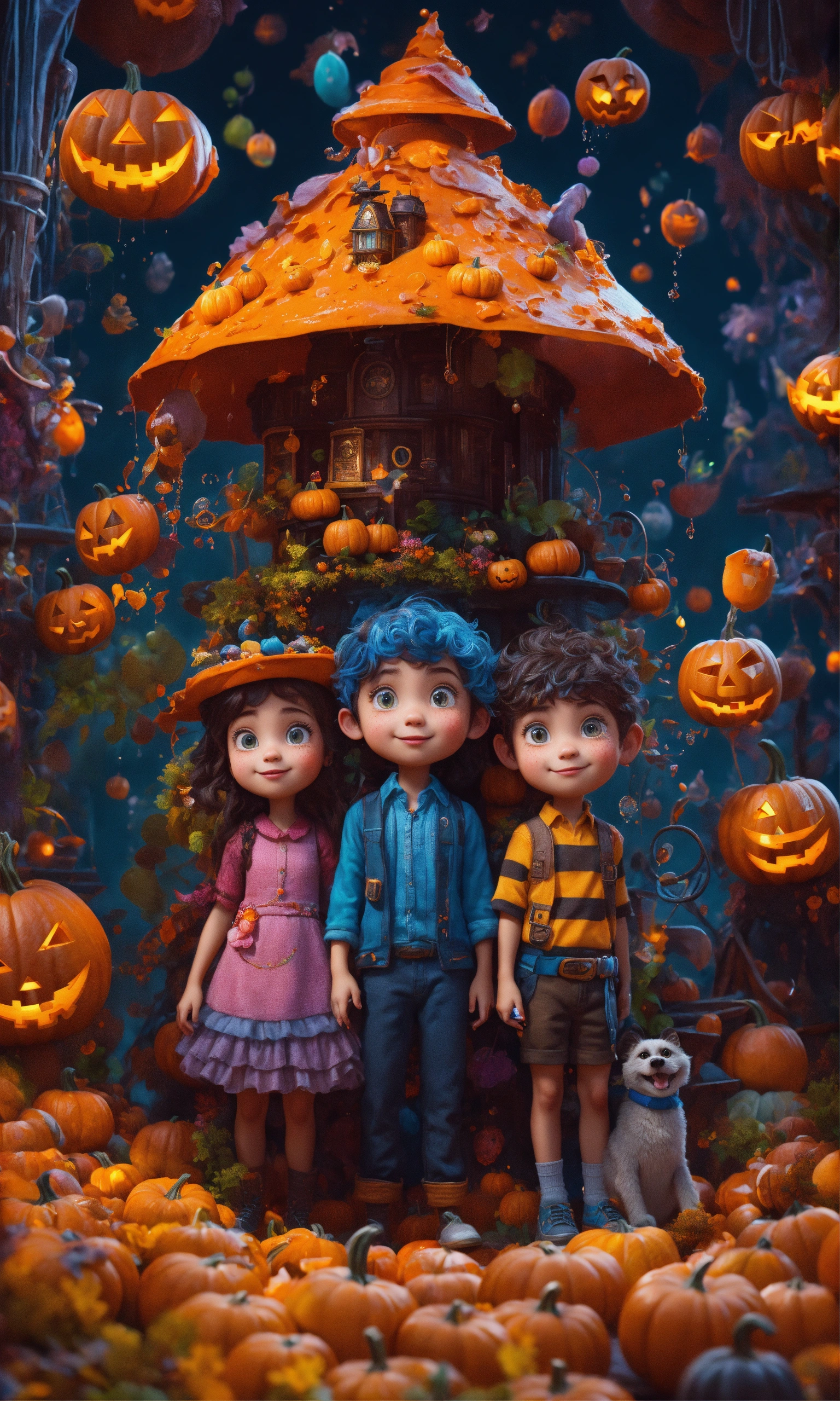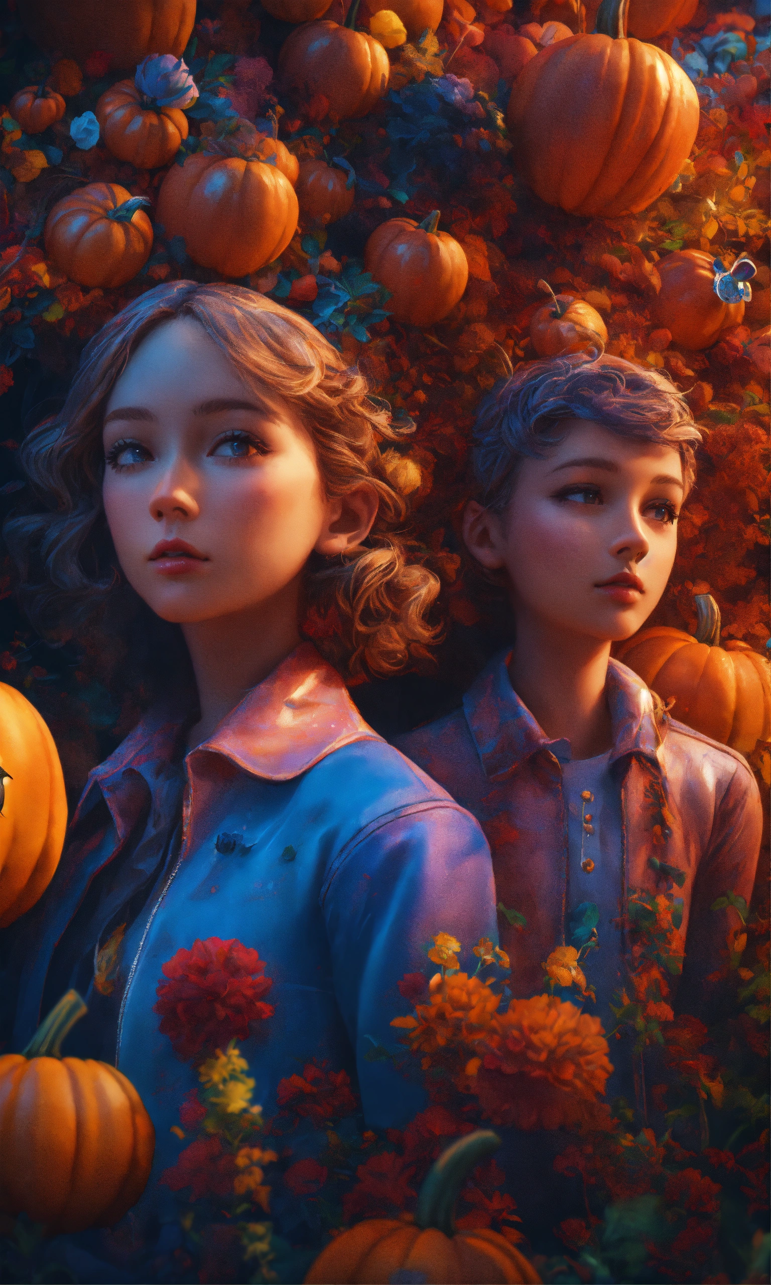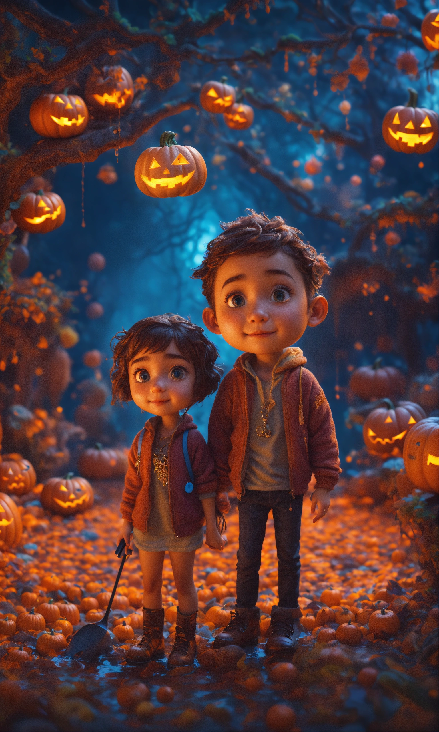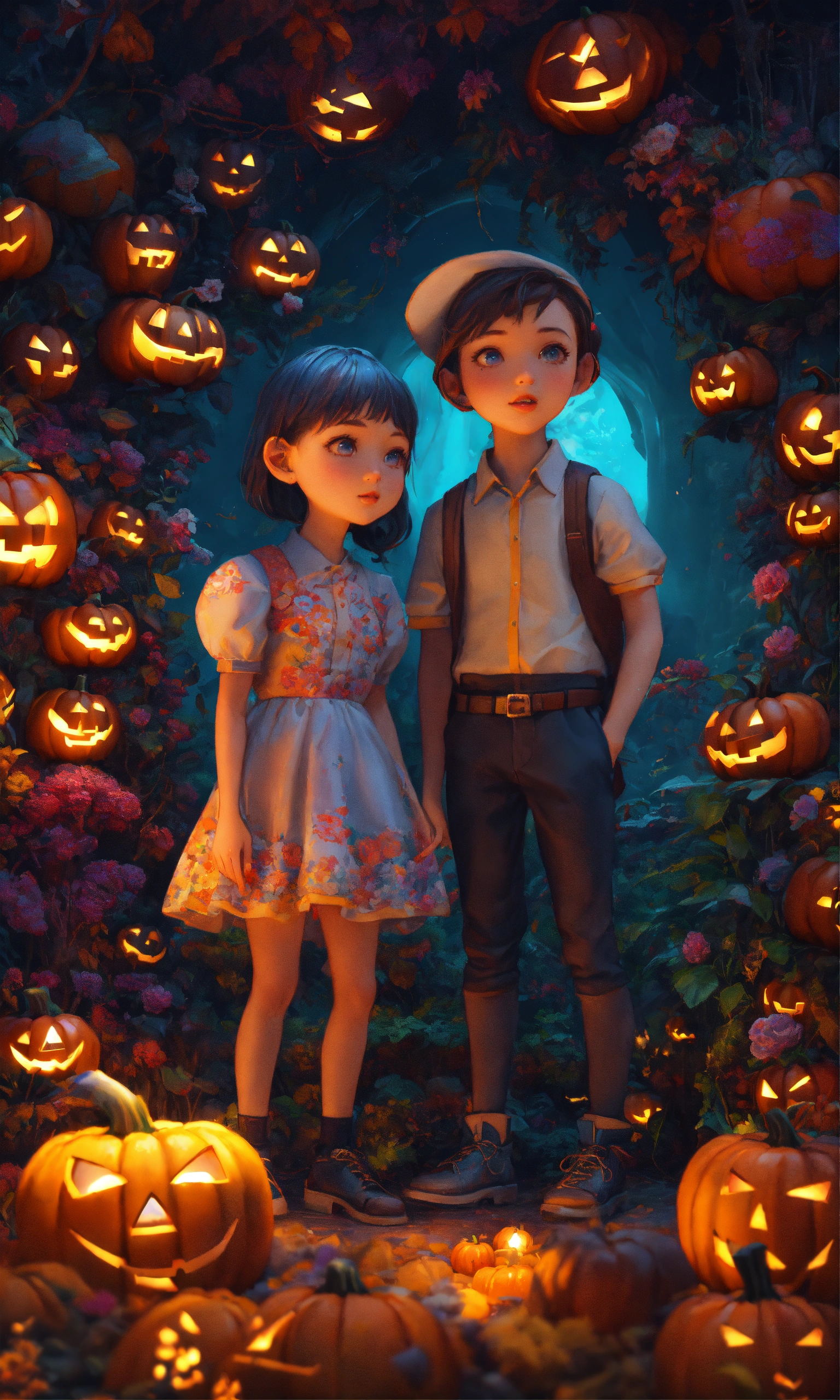 Unsplash art, a quirky portrait of a cute girl and boy couples 3d, pixar style, halloween colors, hyper detailed intricately detailed, fantastical, intricate detail, splashy, fantasy, concept art, 8k resolution, masterpiece, melting, complex background, intricate detailed, dark colors, fantasy, concept art, digital art, intricate, oil on canvas, masterpiece, expert, insanely detailed, 4k resolution.