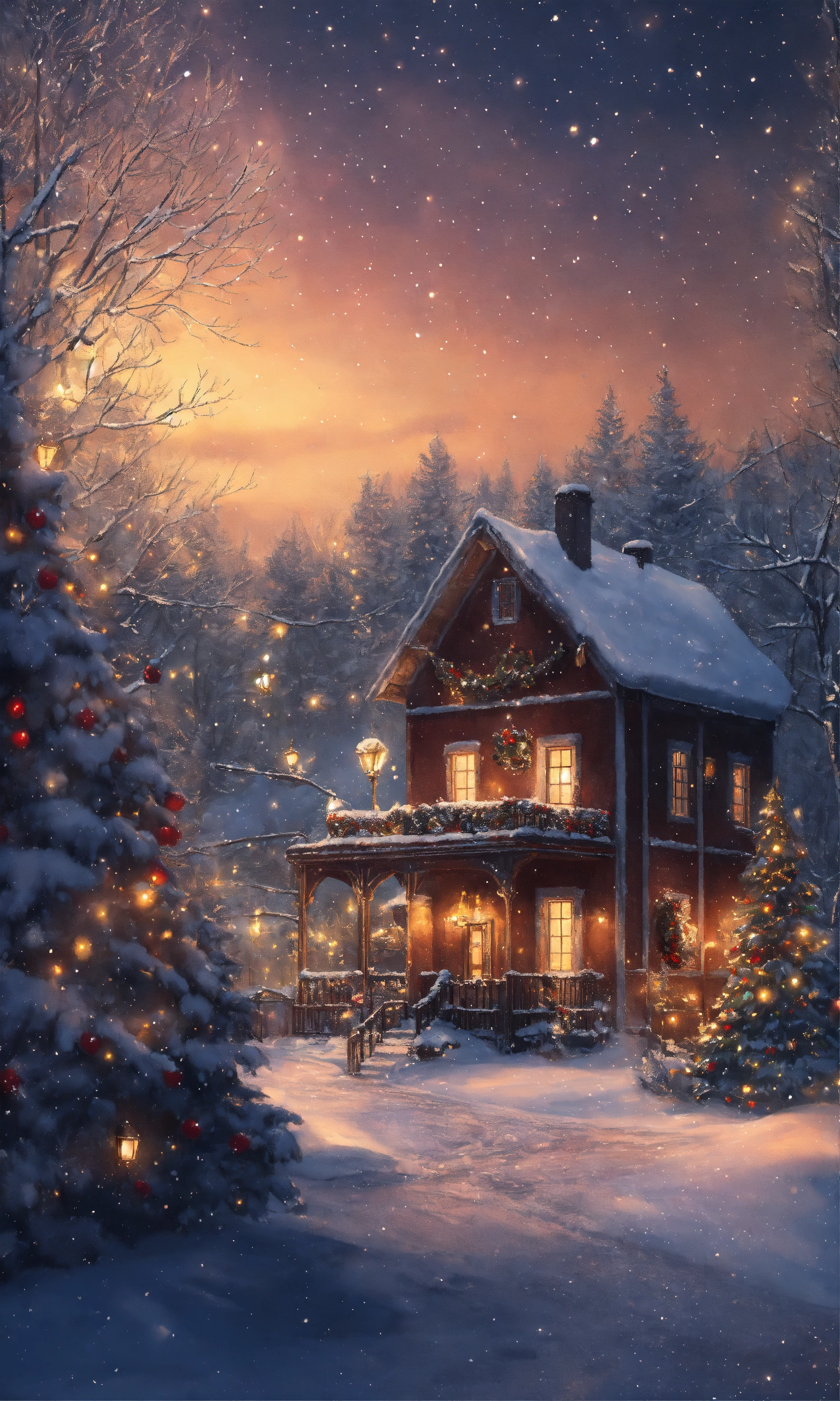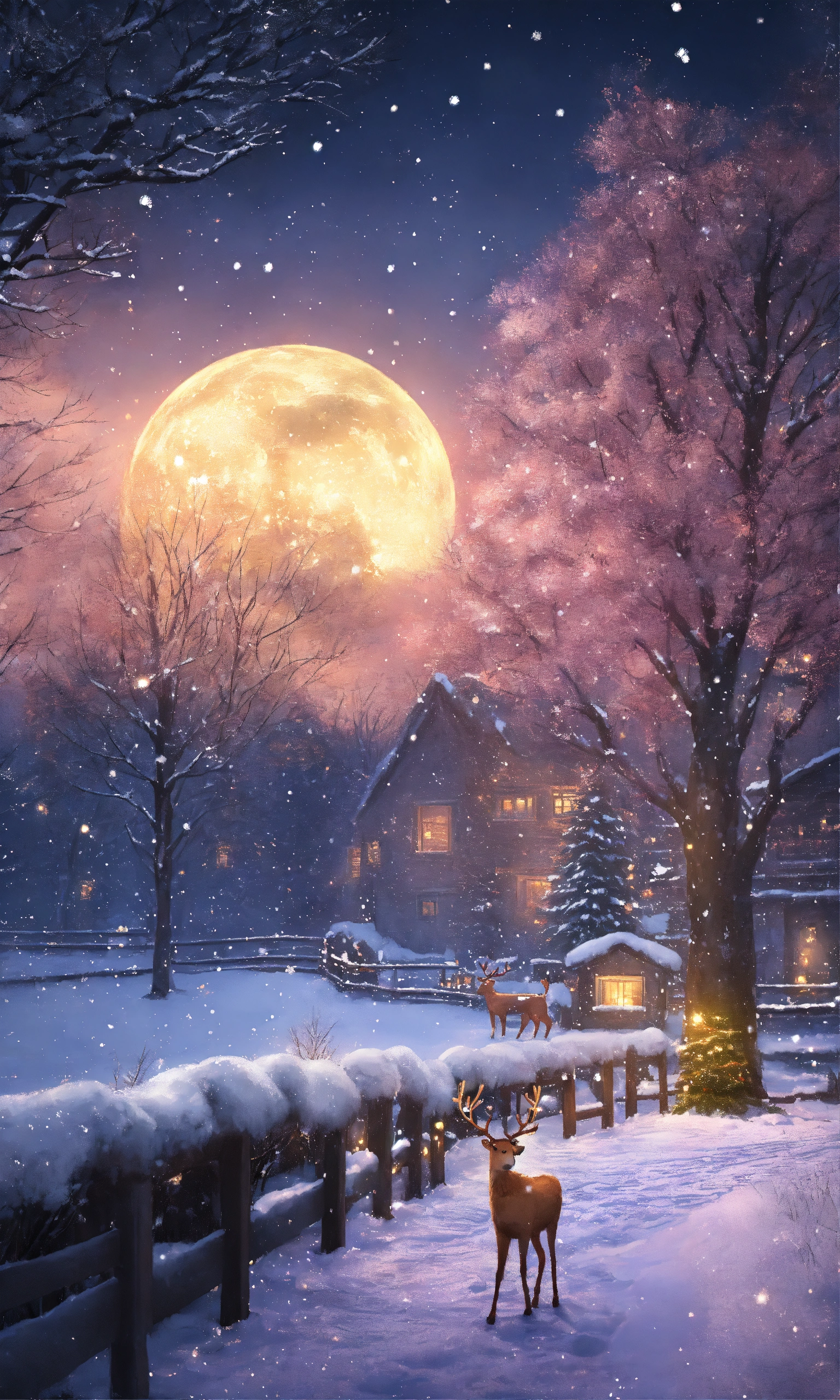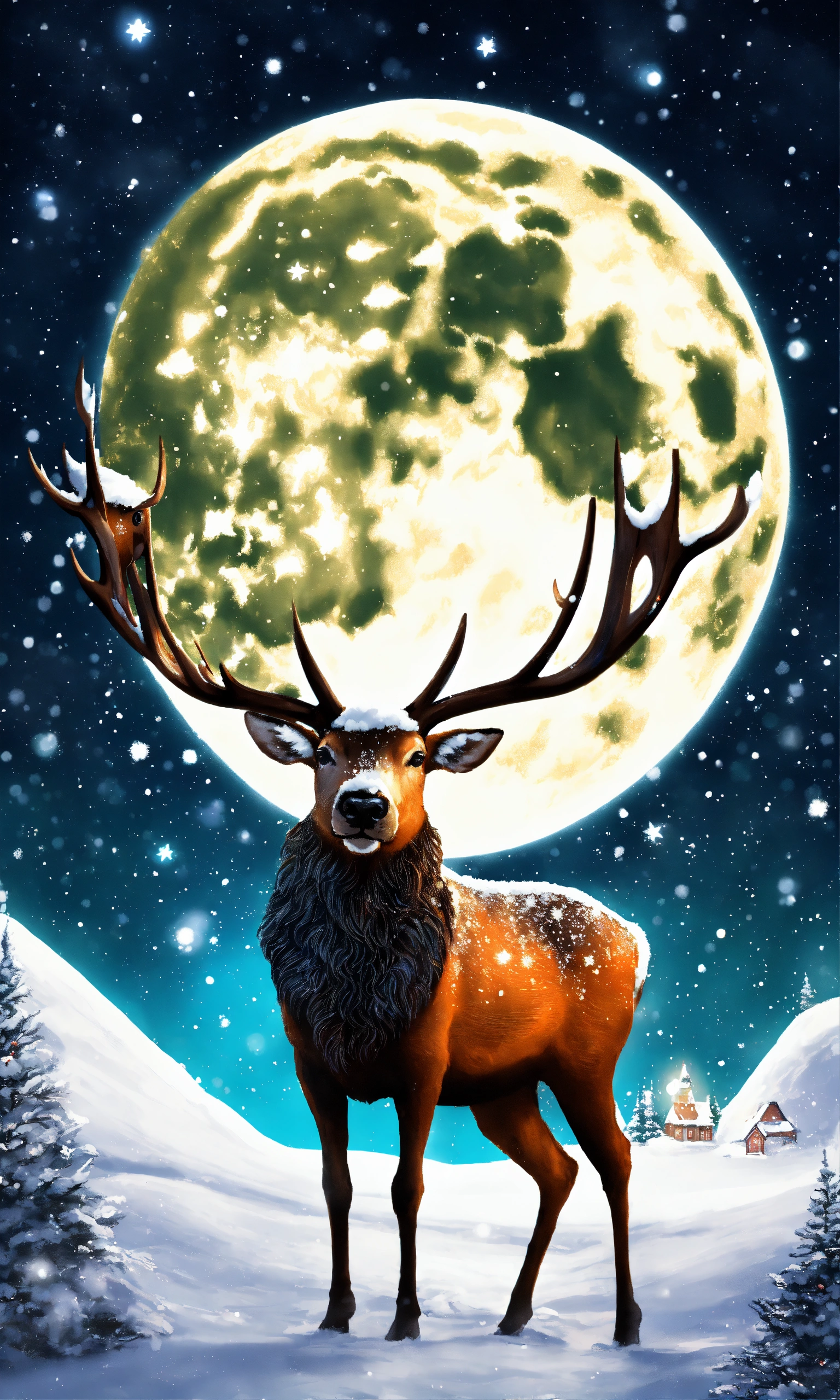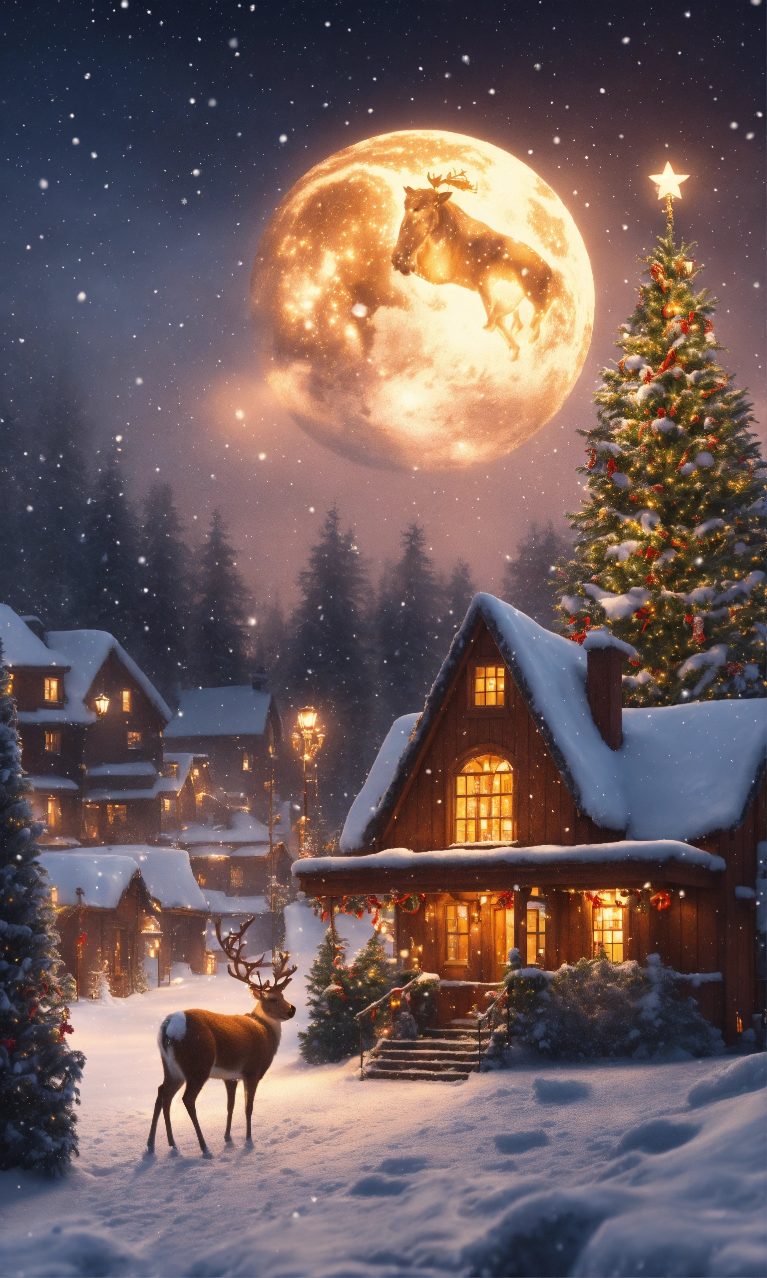 Christmass time, snowy day, highly detailed, ultra trealestic, night time stars, santaclouse raindeer