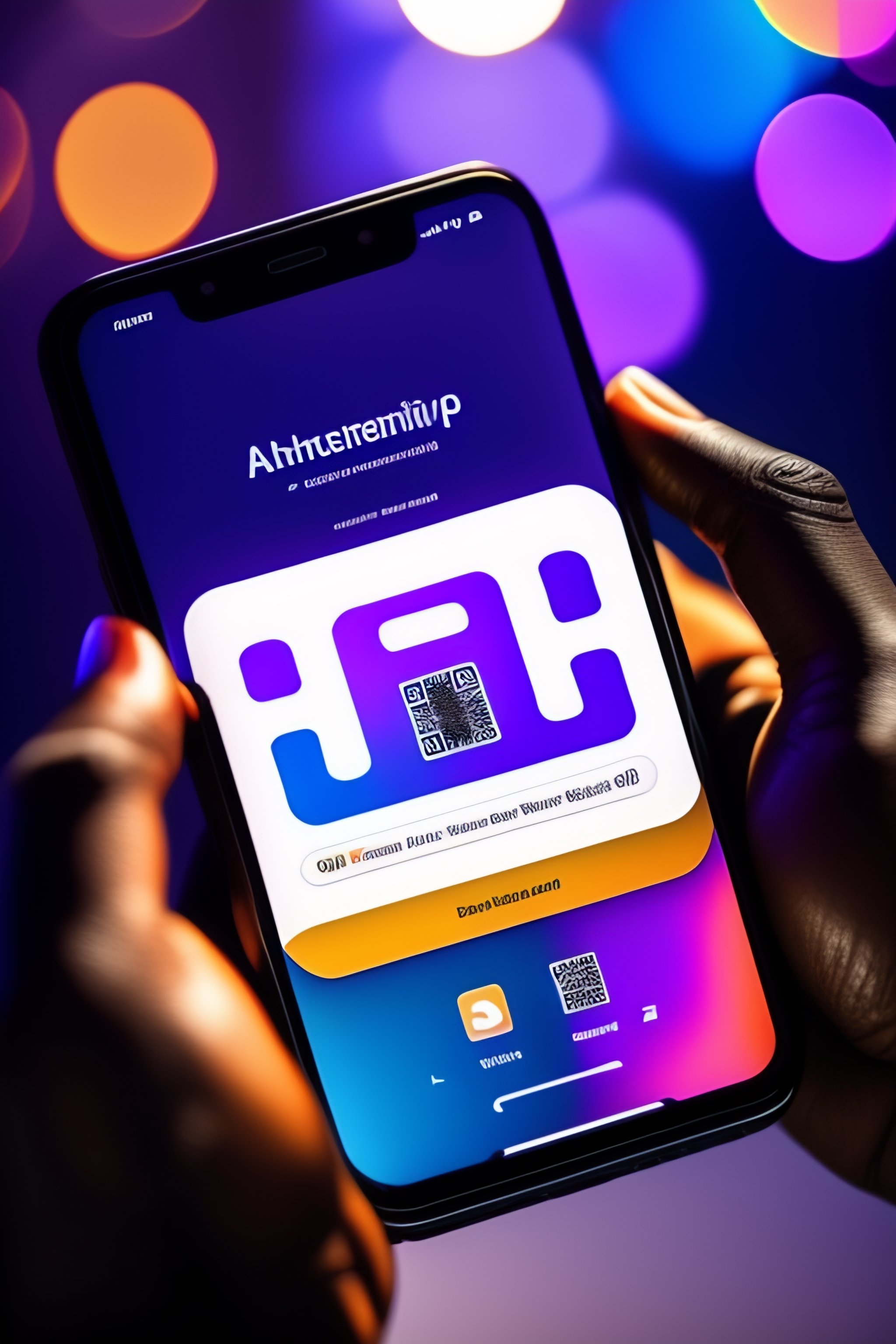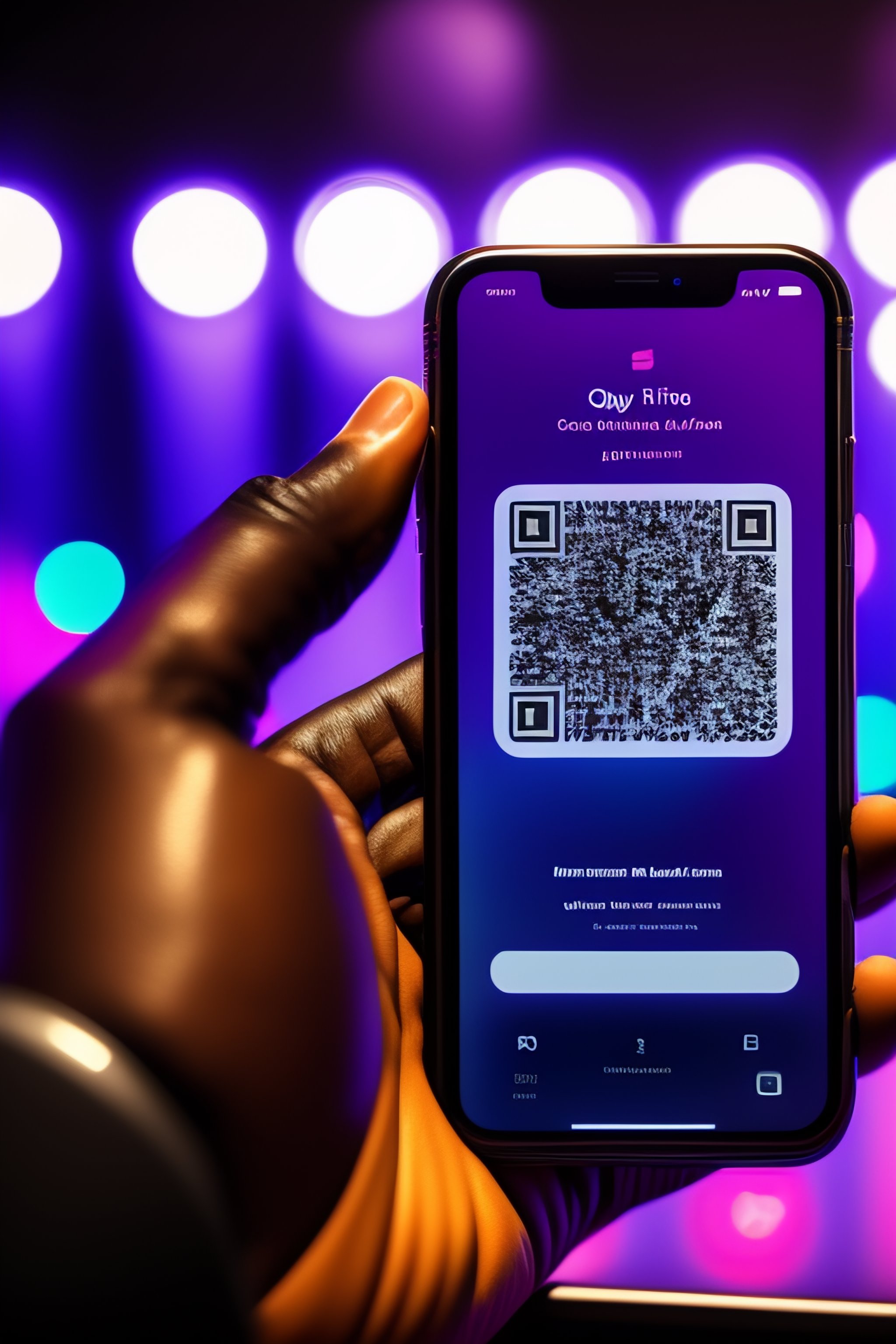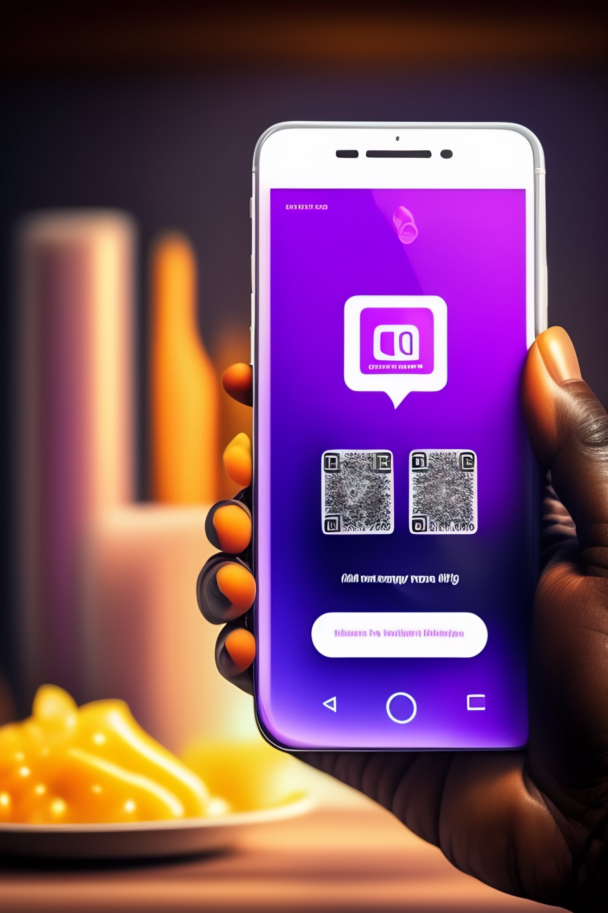 An african entrepreneur happily showing a qr code displayed on their iphone 14 screen, 5 fingers, perfect hand, purple cinematic lighting.