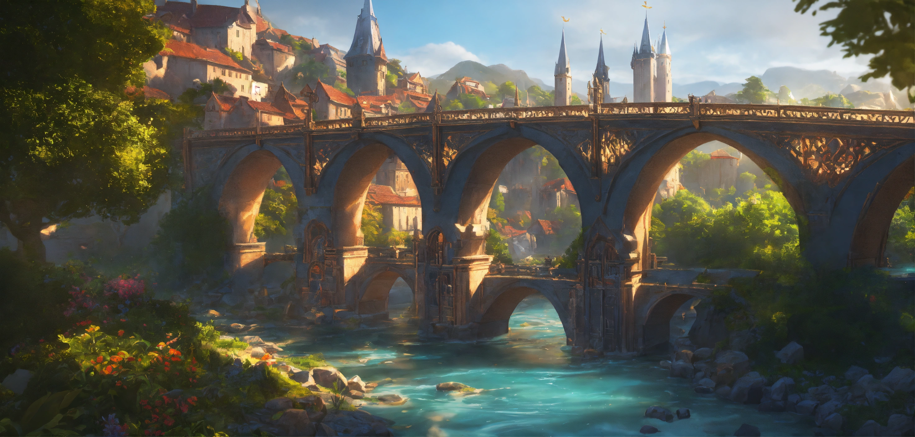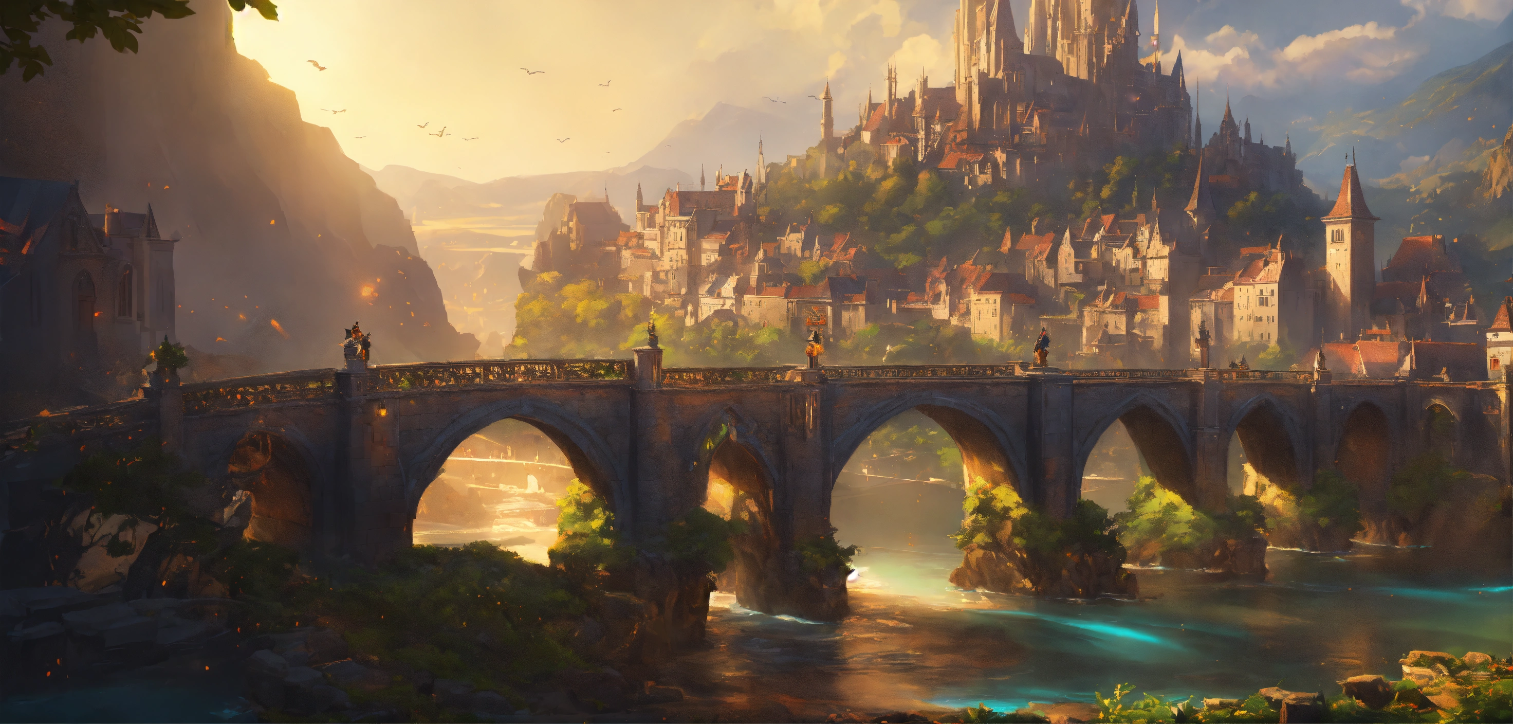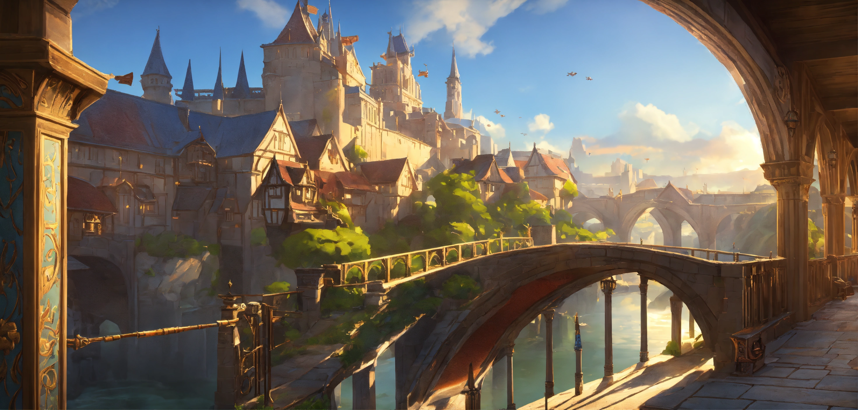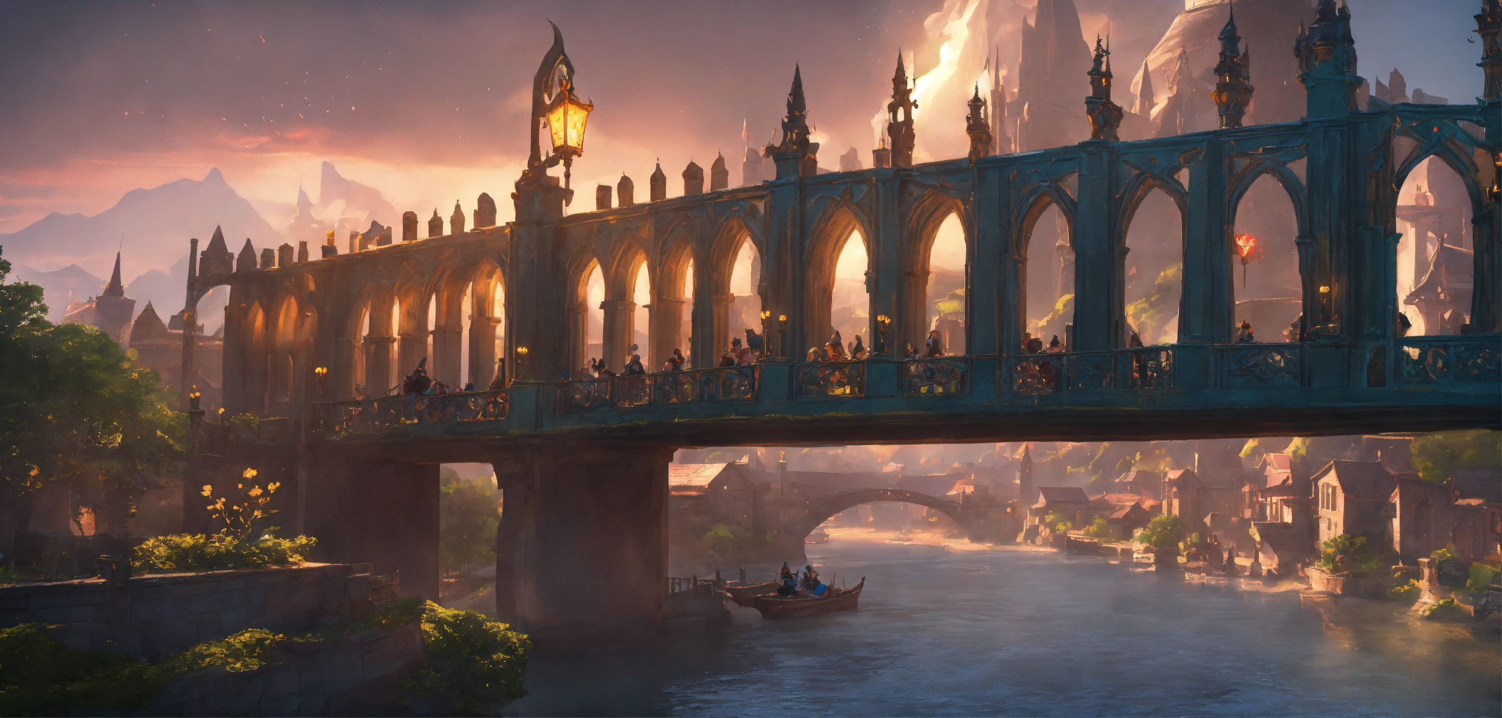 A highly detailed league of legend dynamic illustration of fantasy bridge with medieval city, by joshua raphael, by artgerm, by huyy nguyen, by cj xander, by jennifer wuestling, by diep duong van, by huyy nguyen, by grafit studio, volumetric lighting, 3d render, 4k resolution, trending on artstation, masterpiece, close up frame, cinematic shot