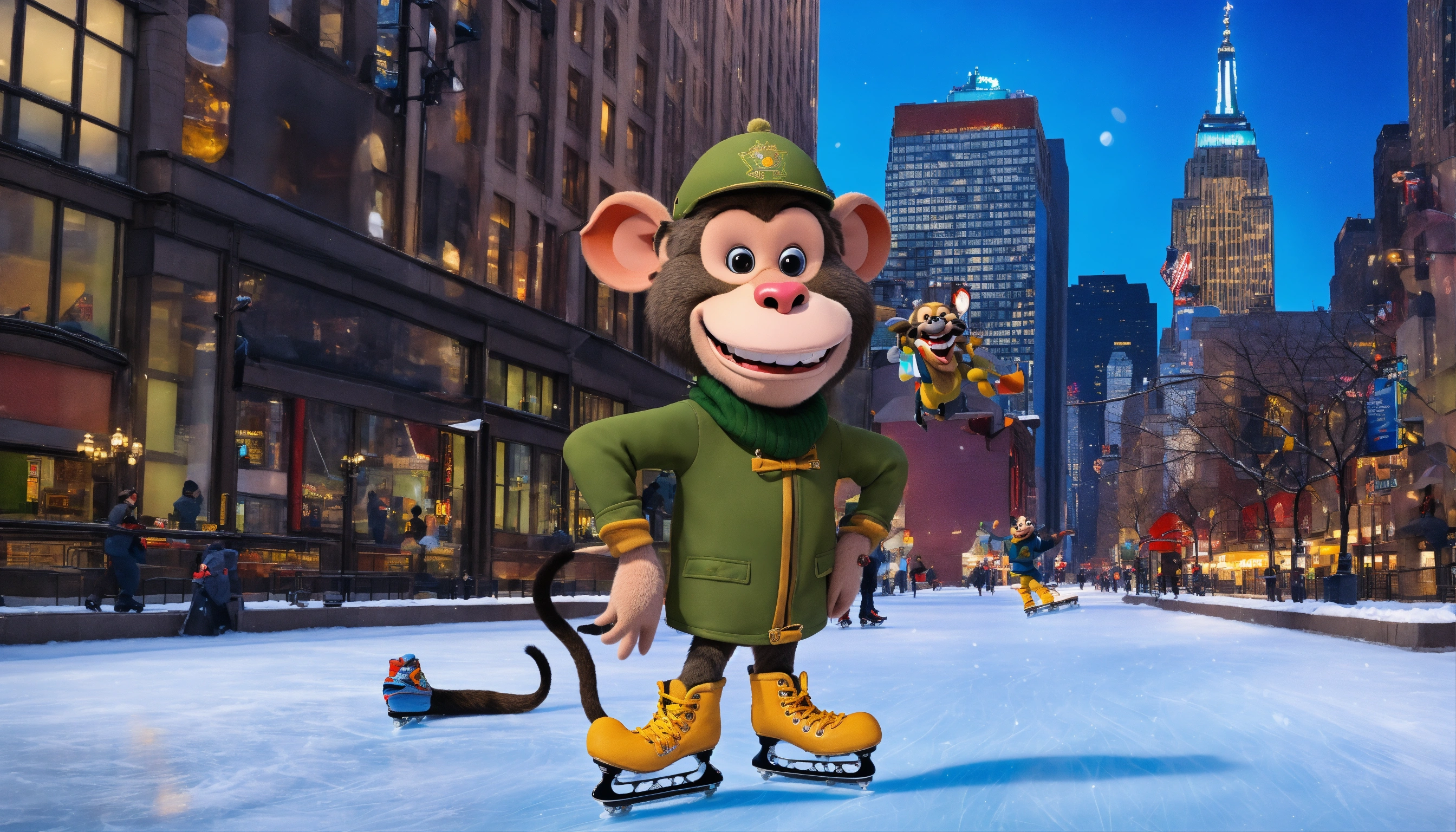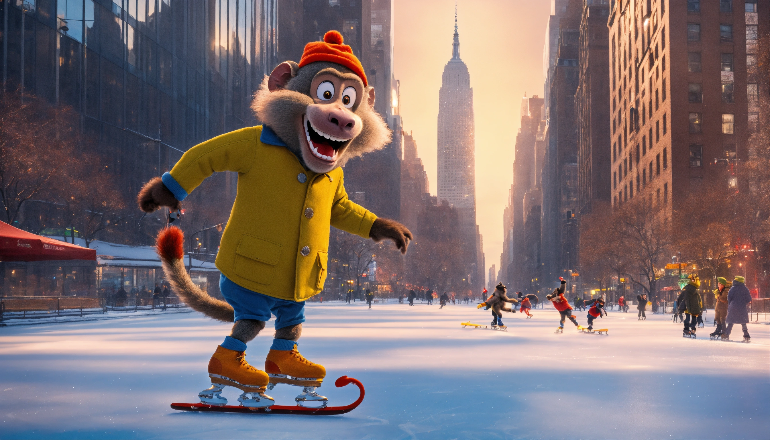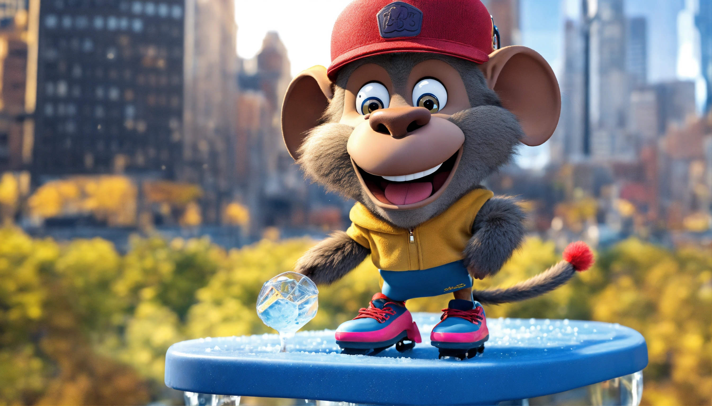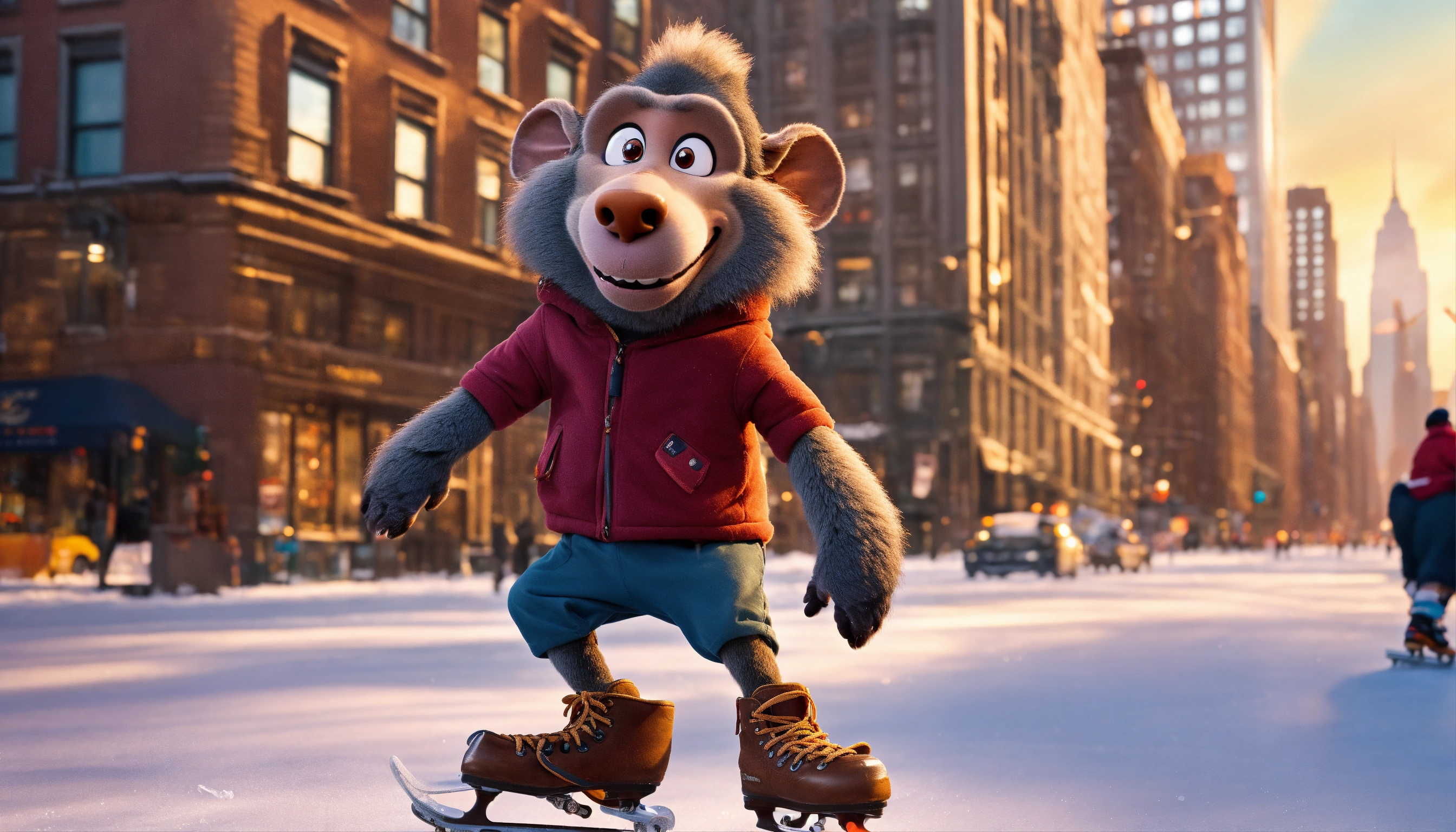 Create a cartoon character for bobby the baboon, wearing ice skates, with a big grin on gin face. he skates on the ice in new york city landscape
