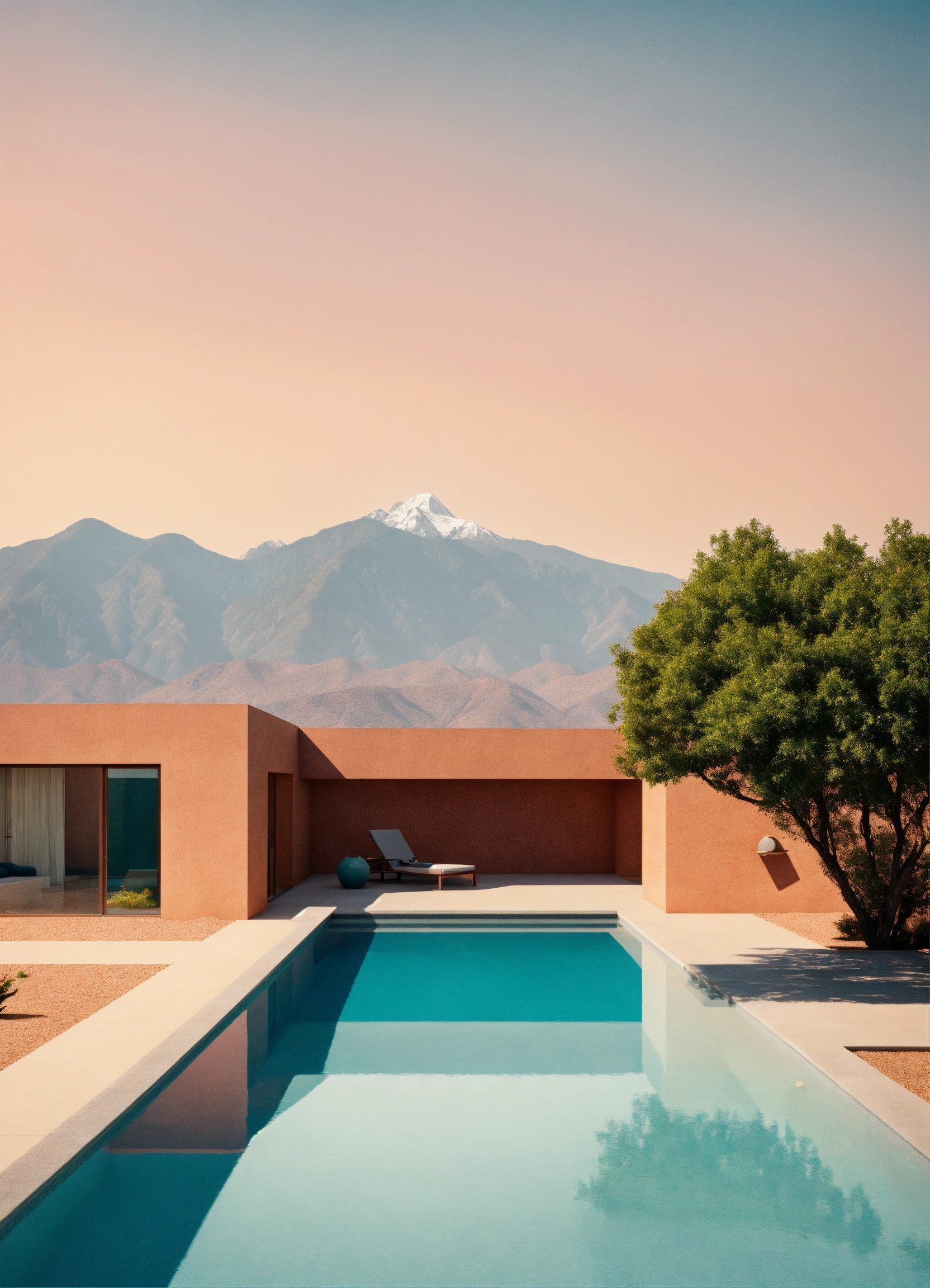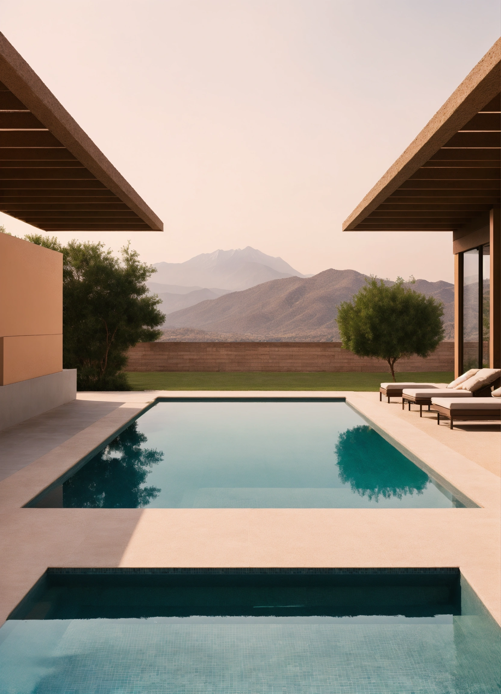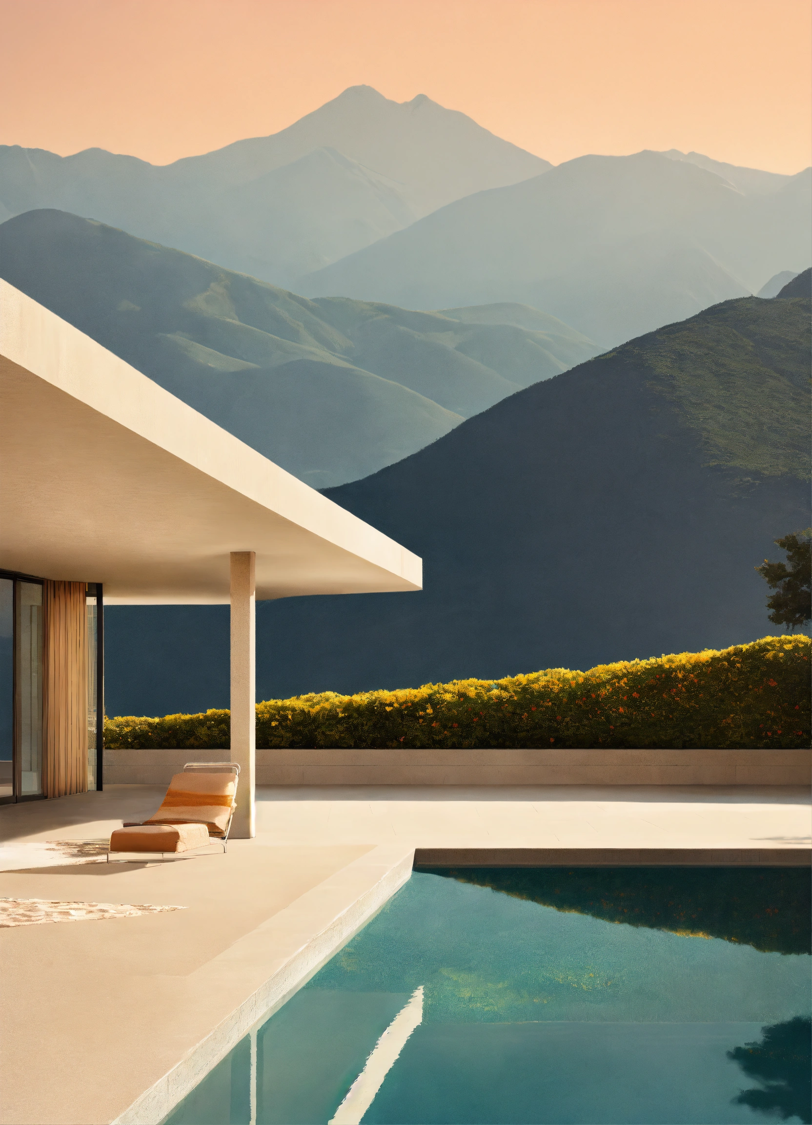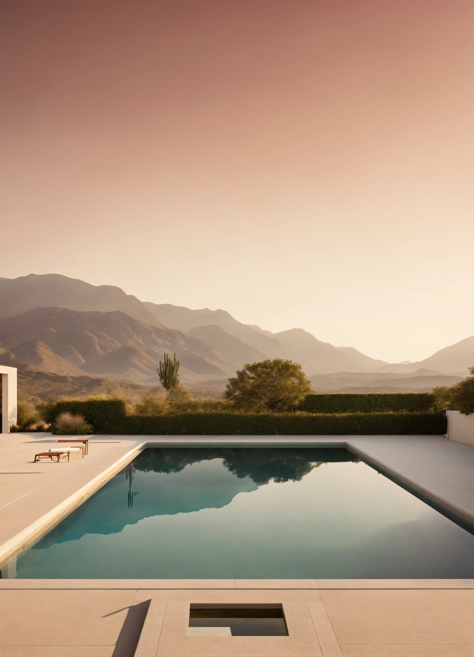 An image geometrically composed of a minimalist yard with a pool and mountains in the horizon