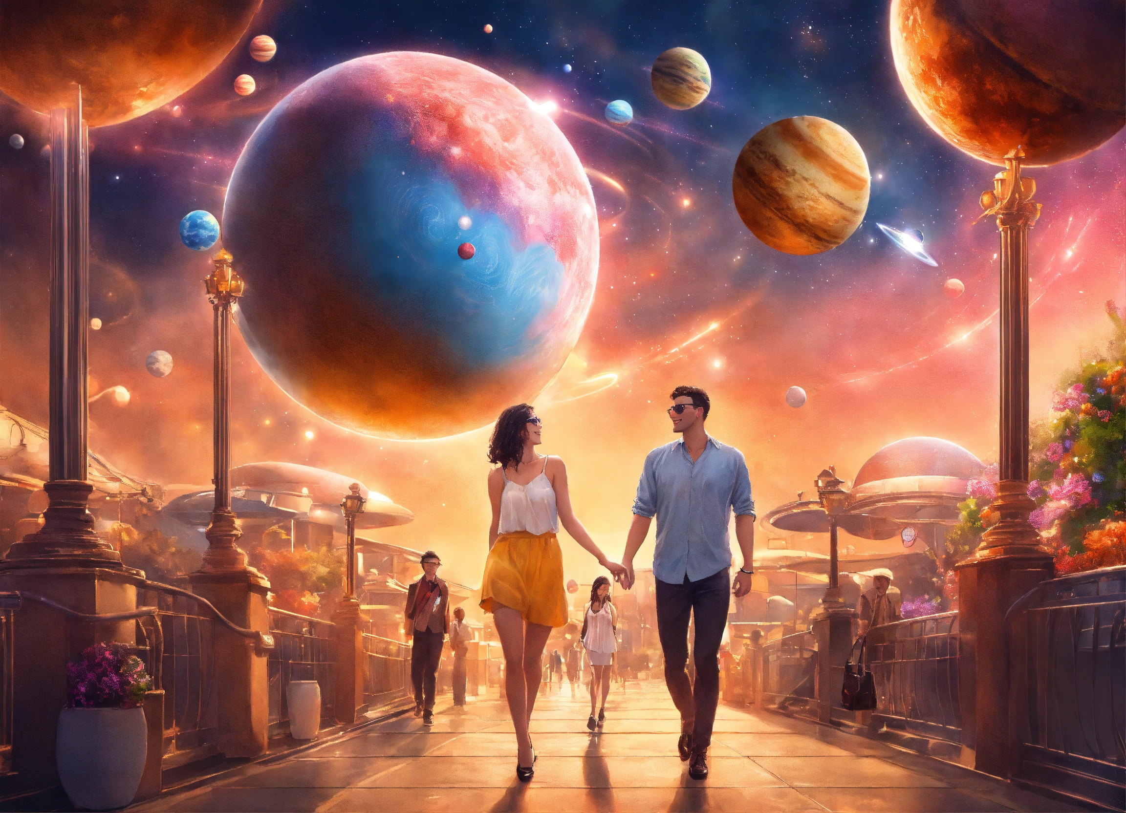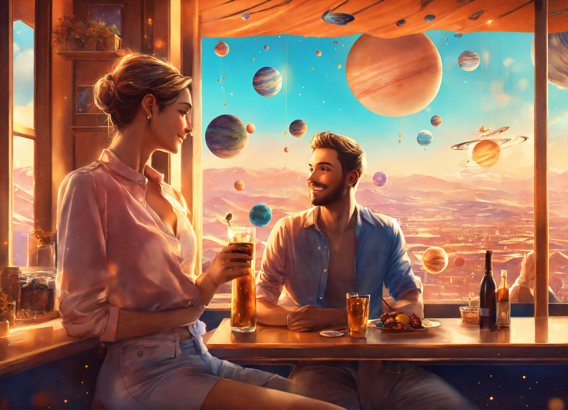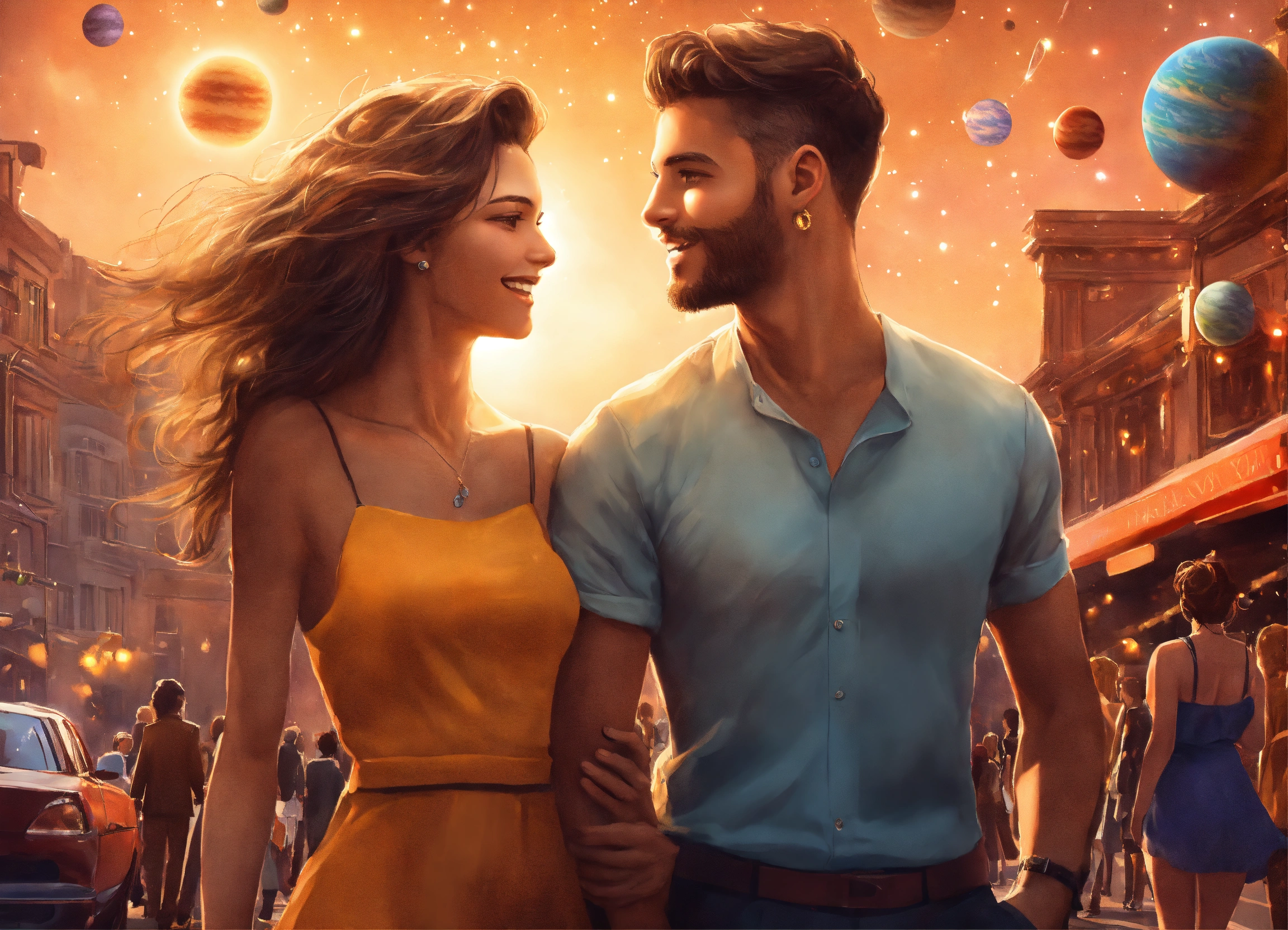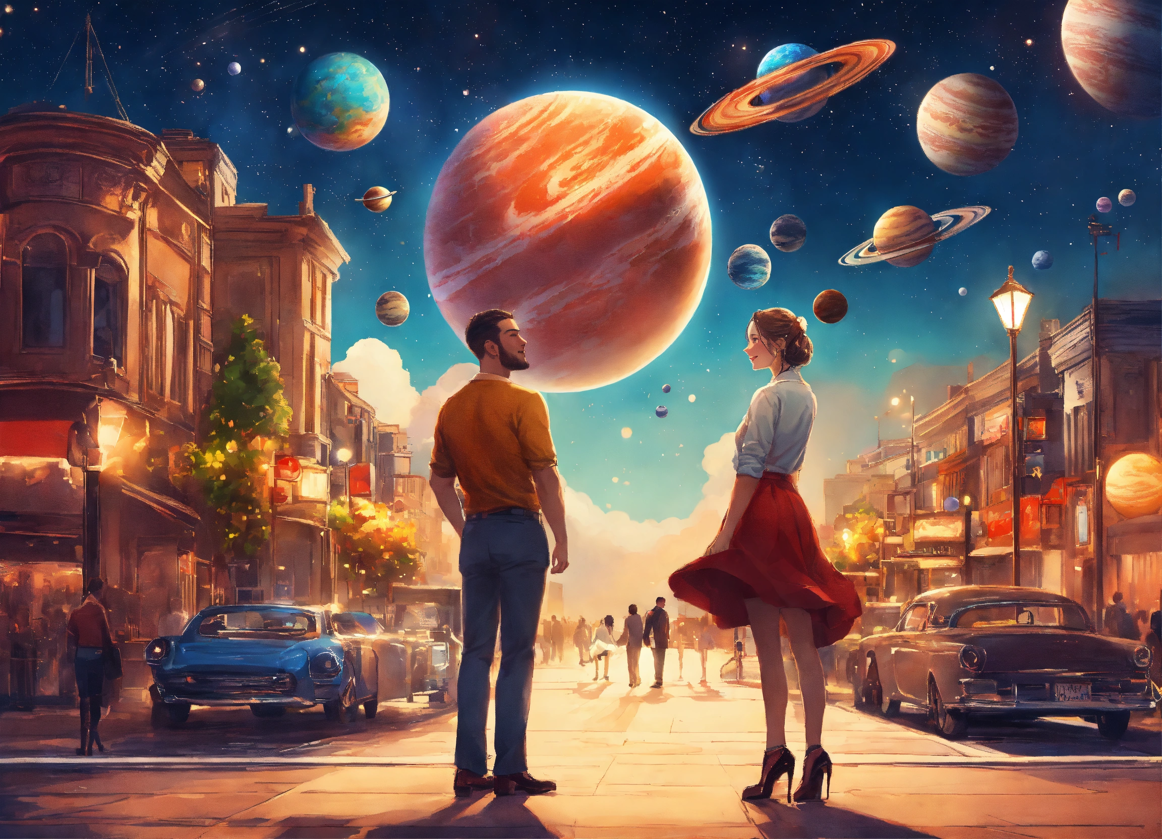 Realistic detailed man and woman met in a dating club, they are successful, happy, independent, against a background of a parade of planets in the daytime