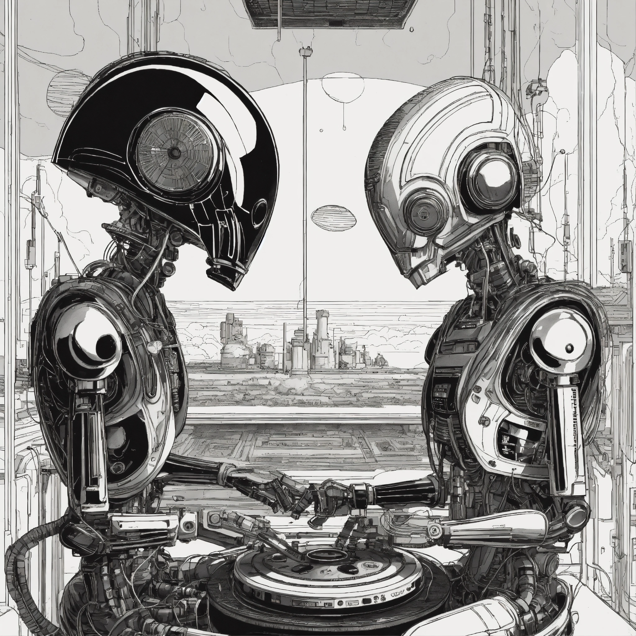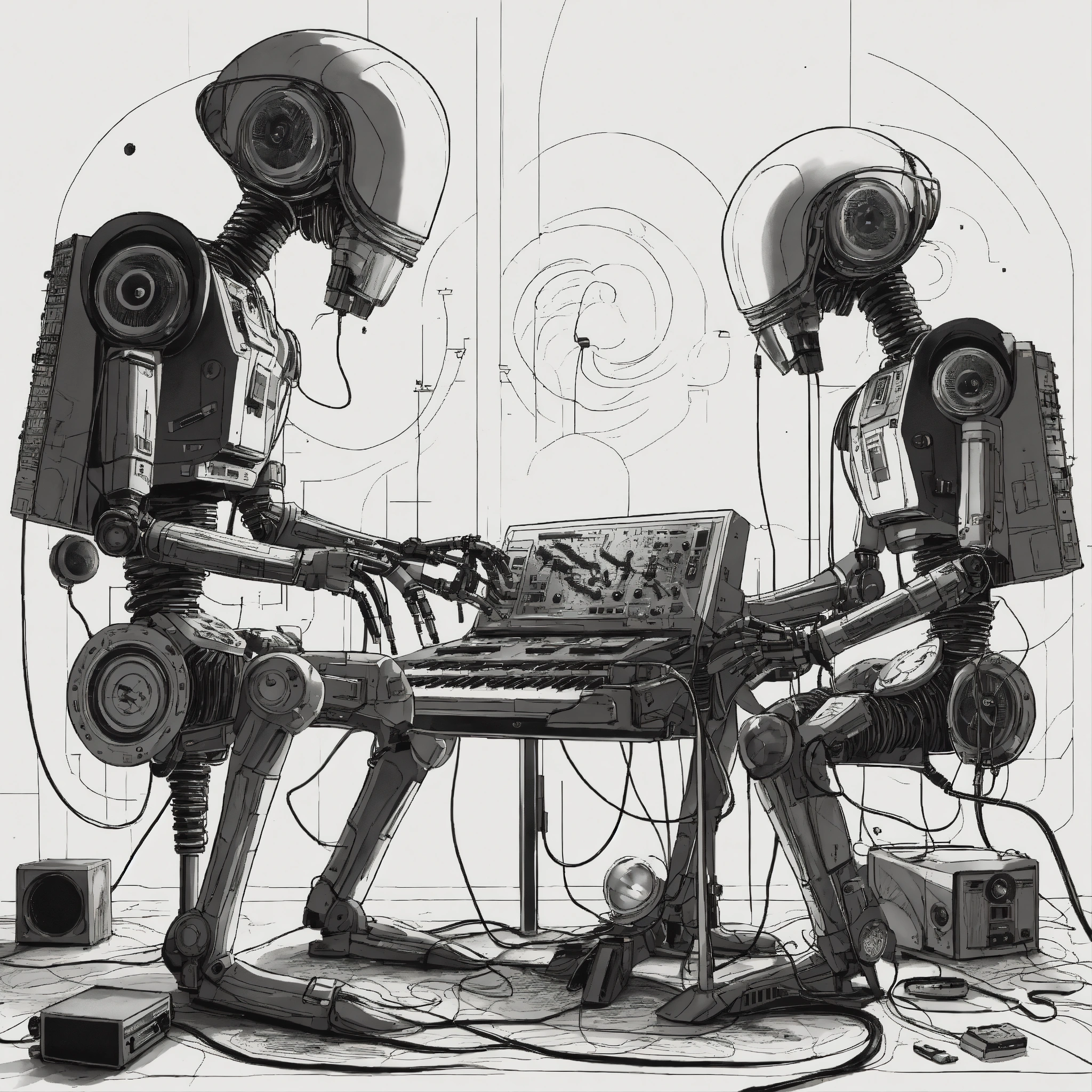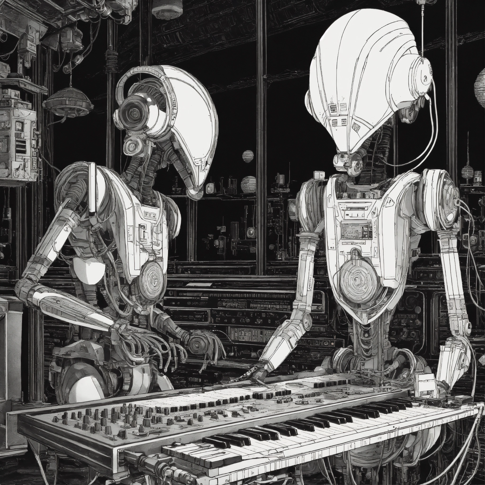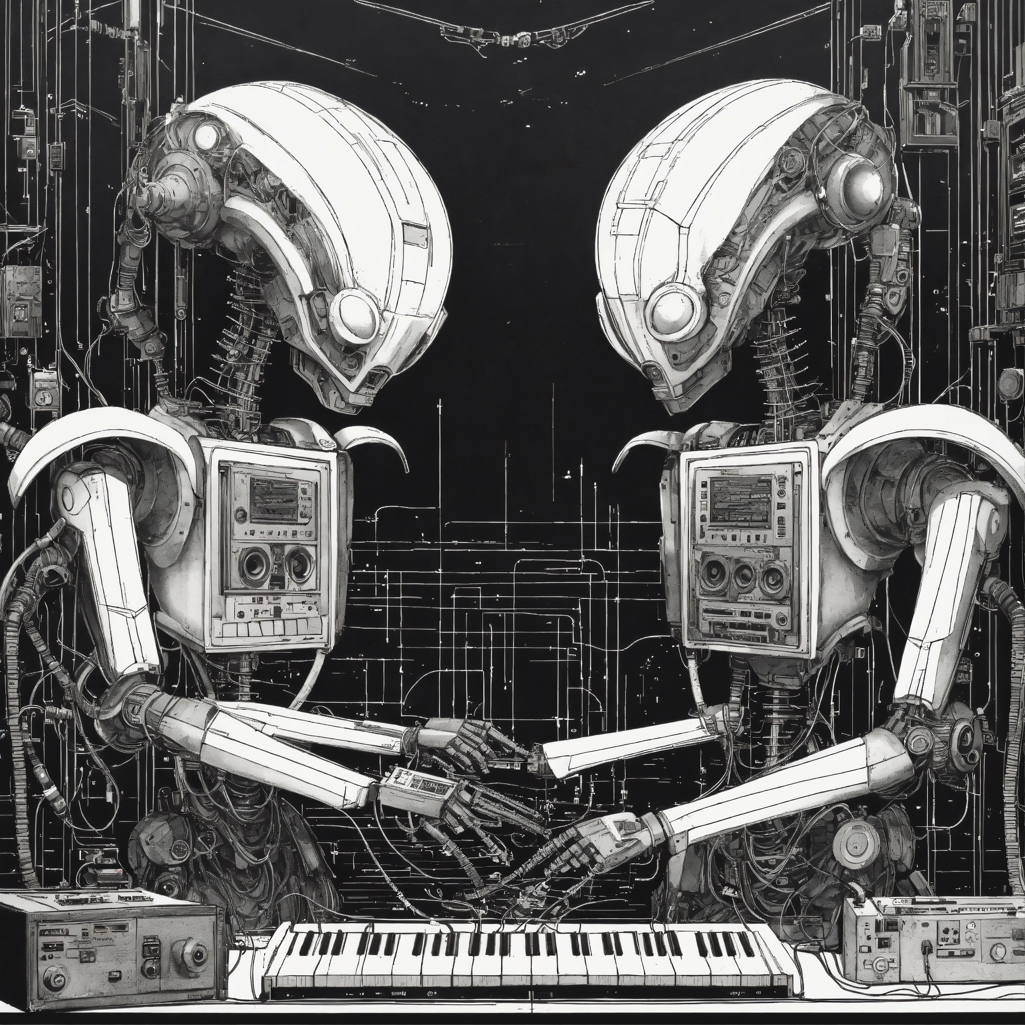 Intricate detailed artwork of two alien techno droids using ancient synthesizer playing music, in the style of moebius, wires, surrounded by huge speakers, black and white ink