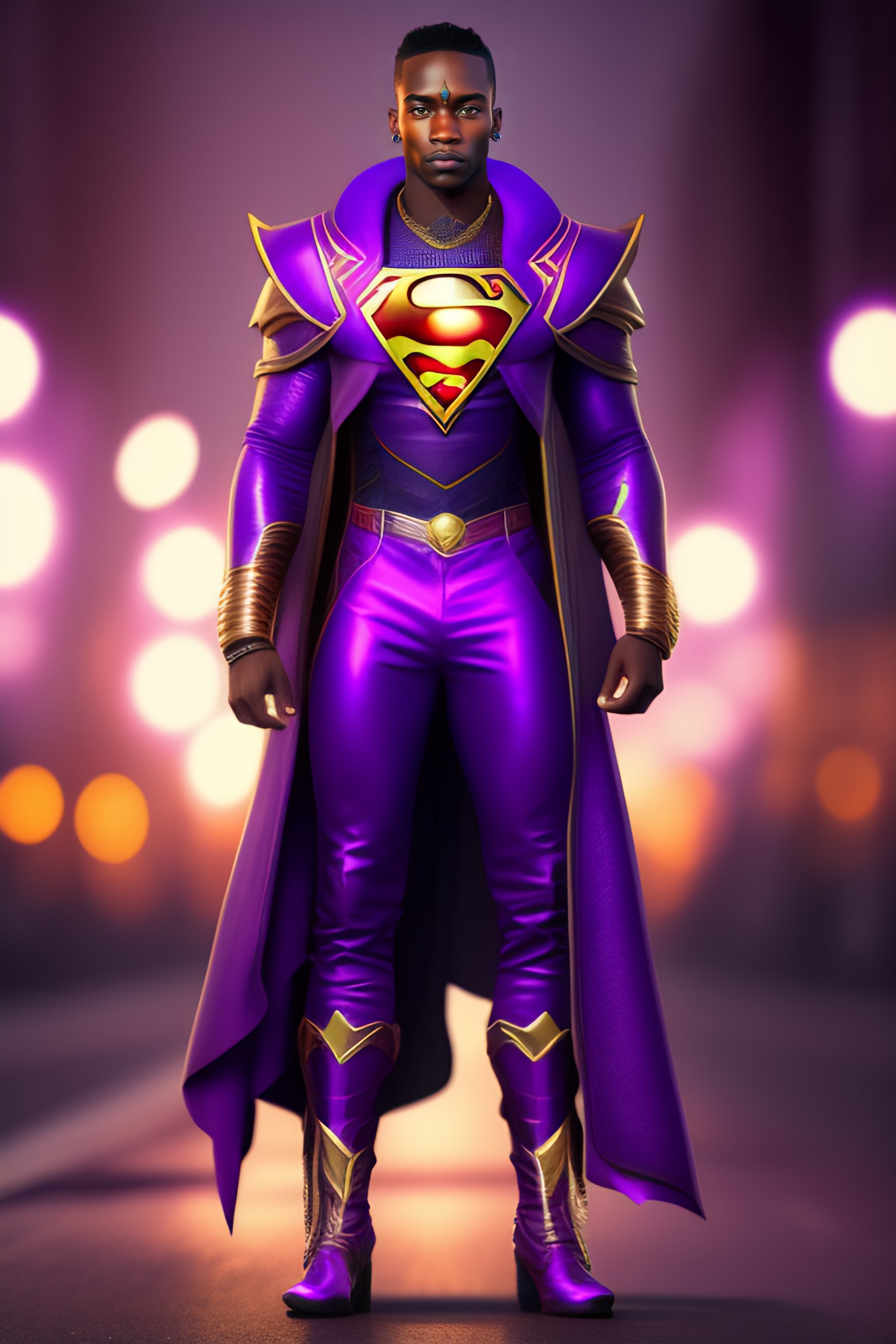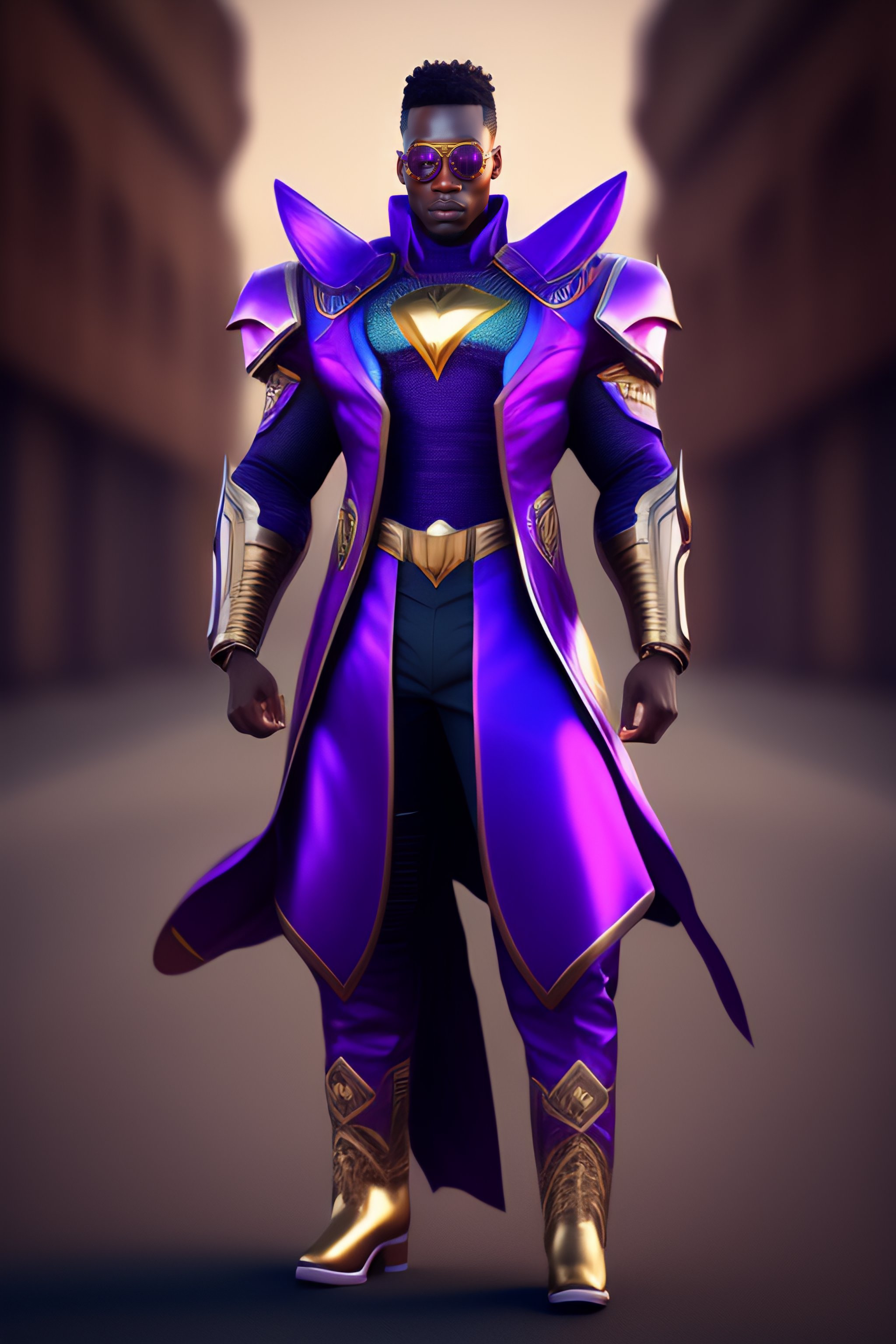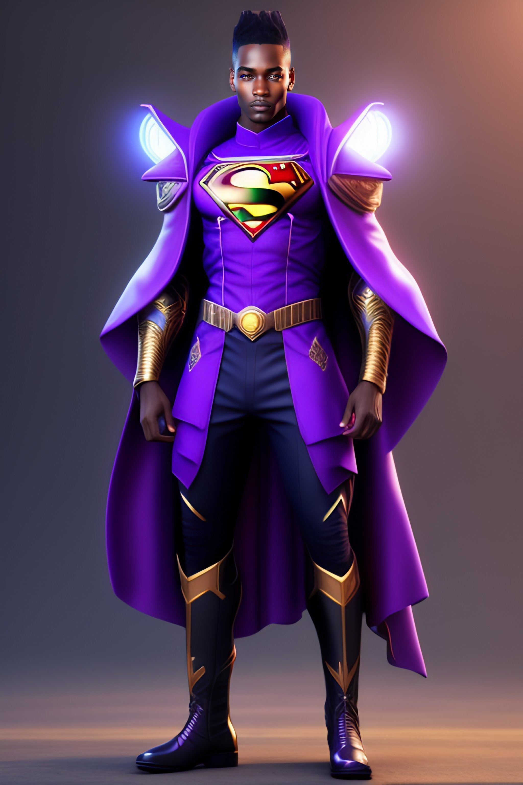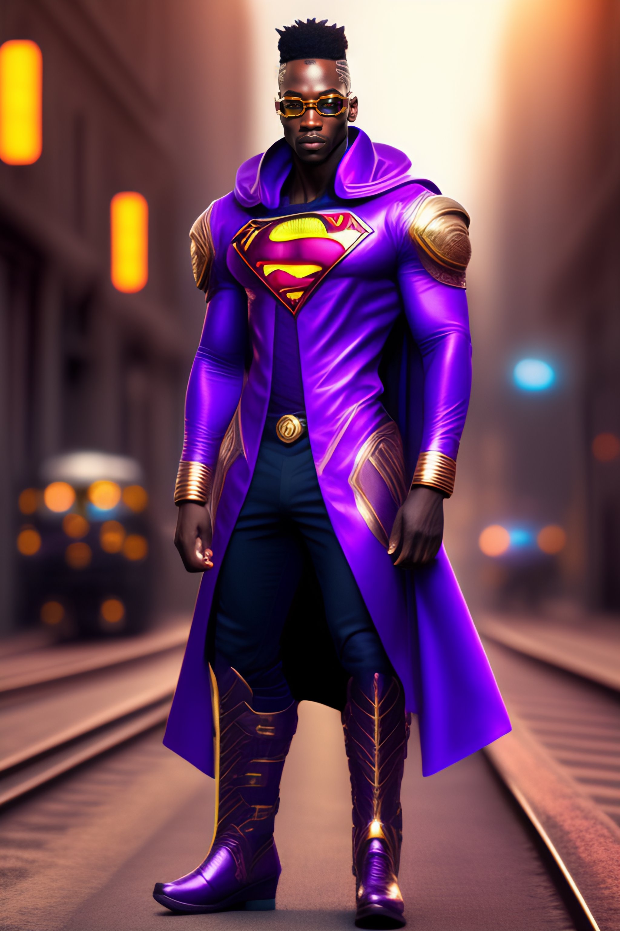 Young african superman stunning cyberpunk steampunk purple clothes realistic 3d render --q 5 --ar 1:1