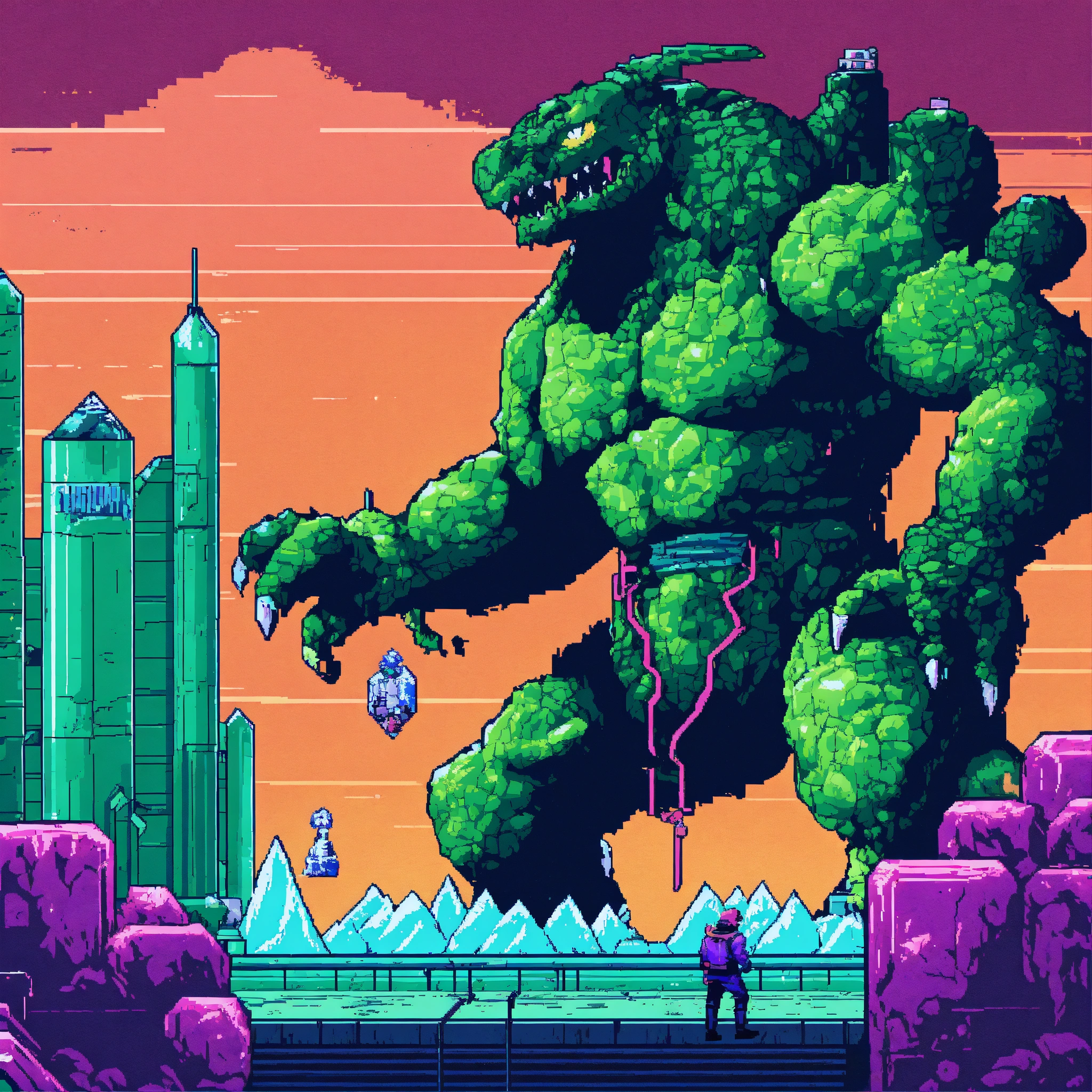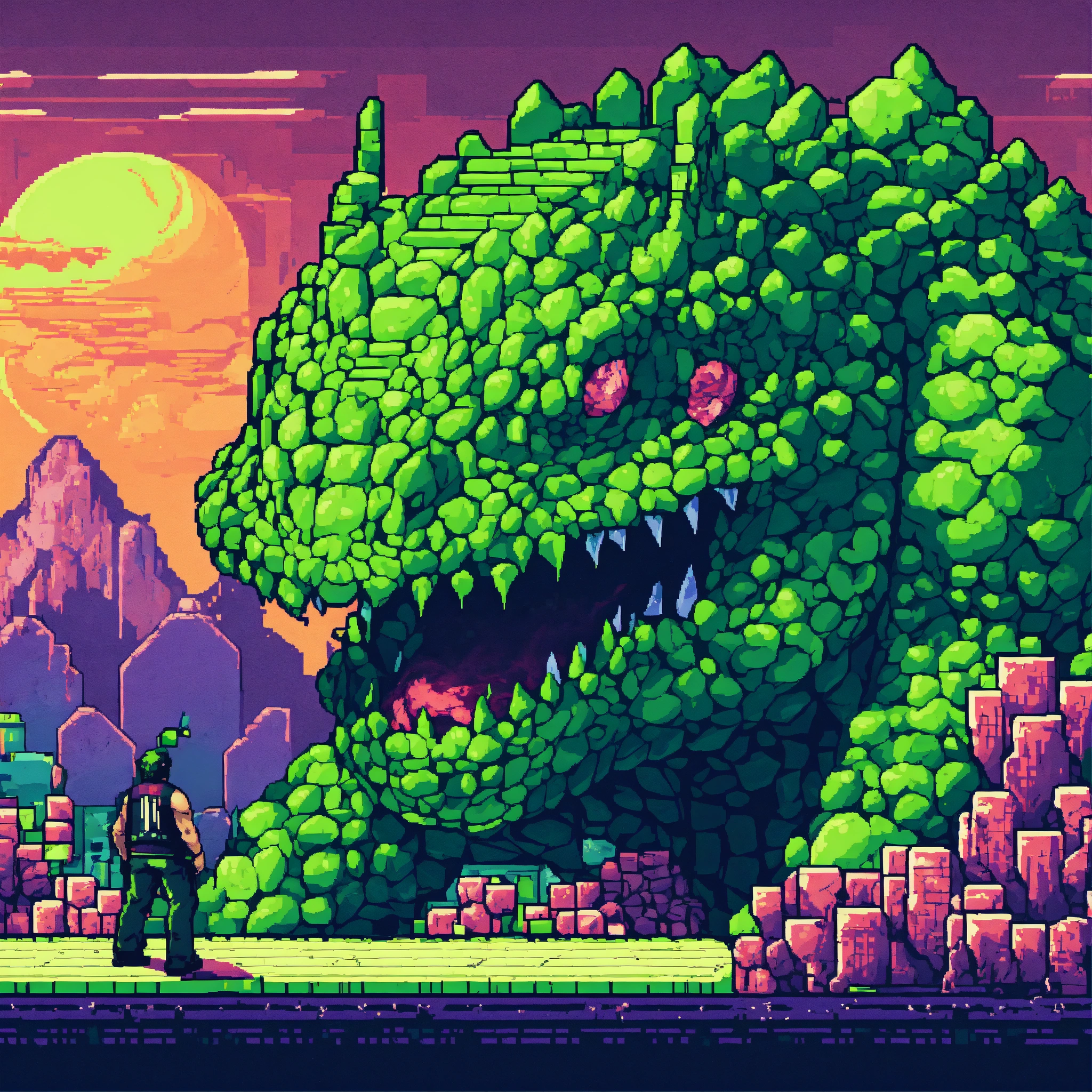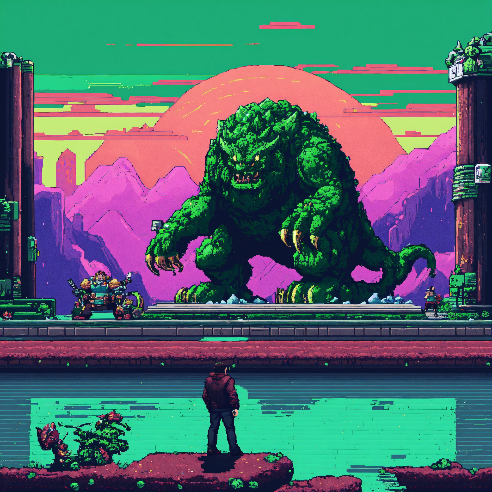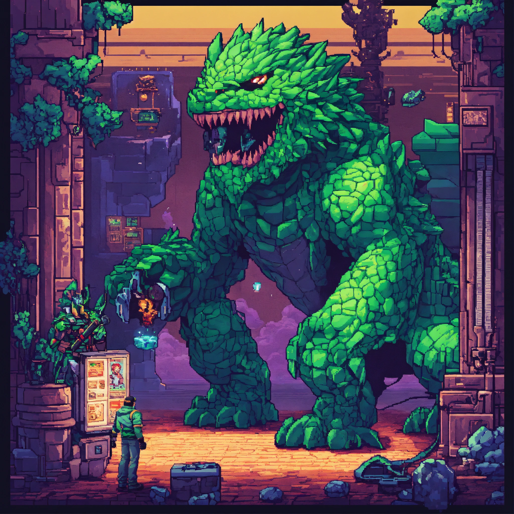 Retro green and blackpixel art with a guy looking at a final boss monster