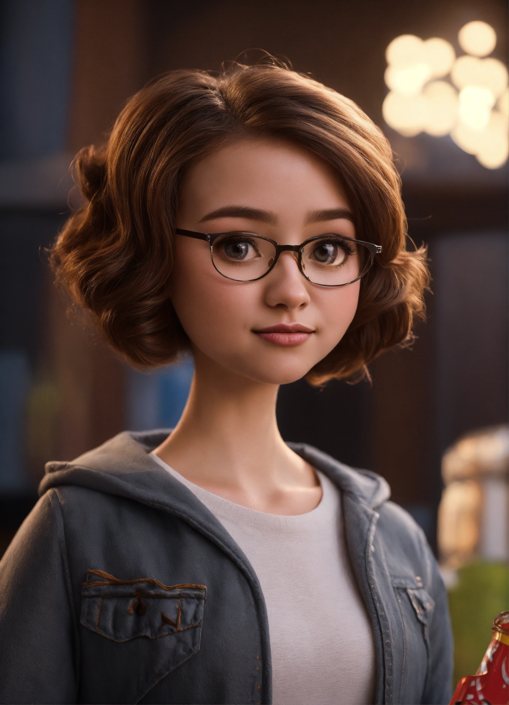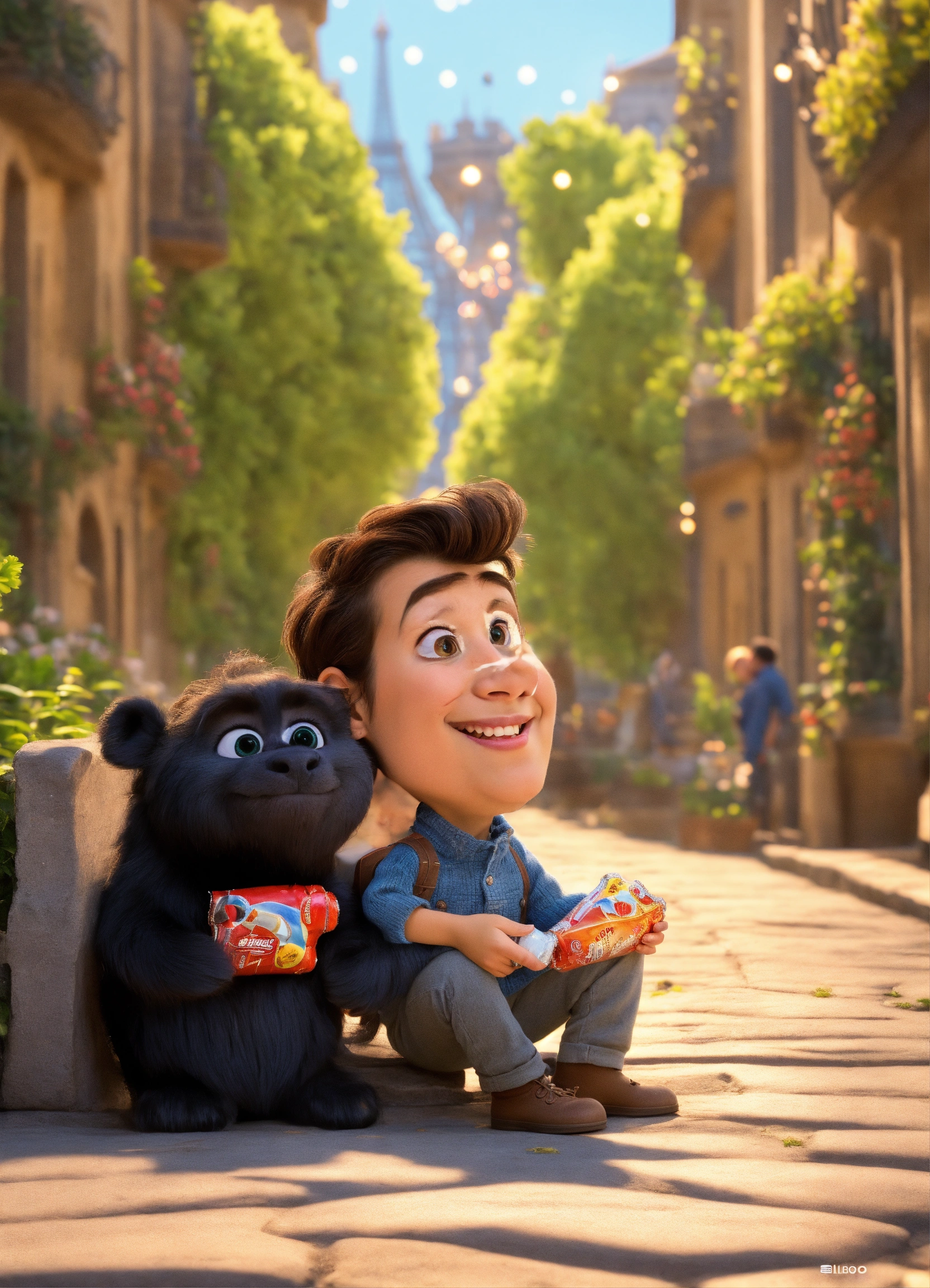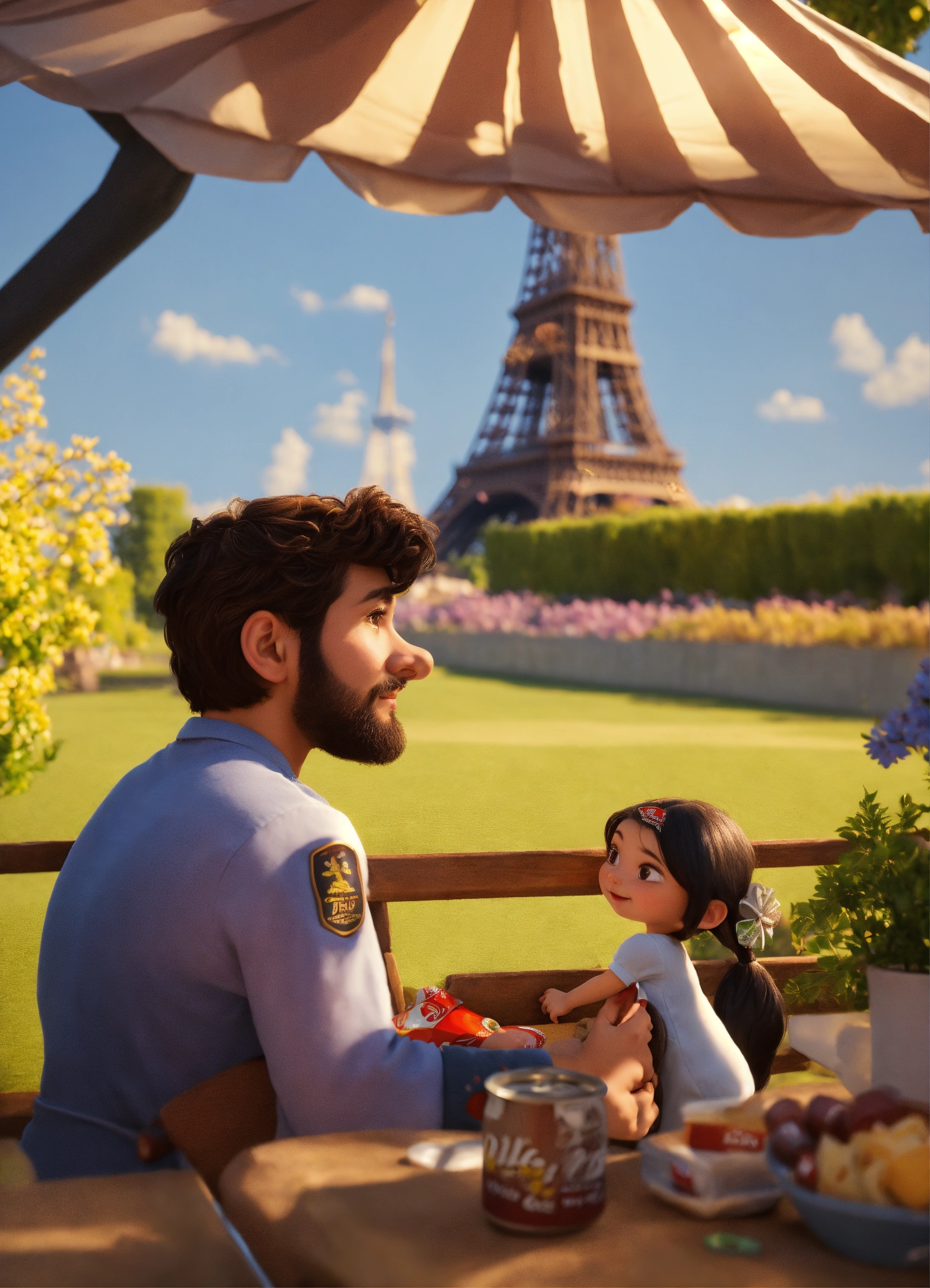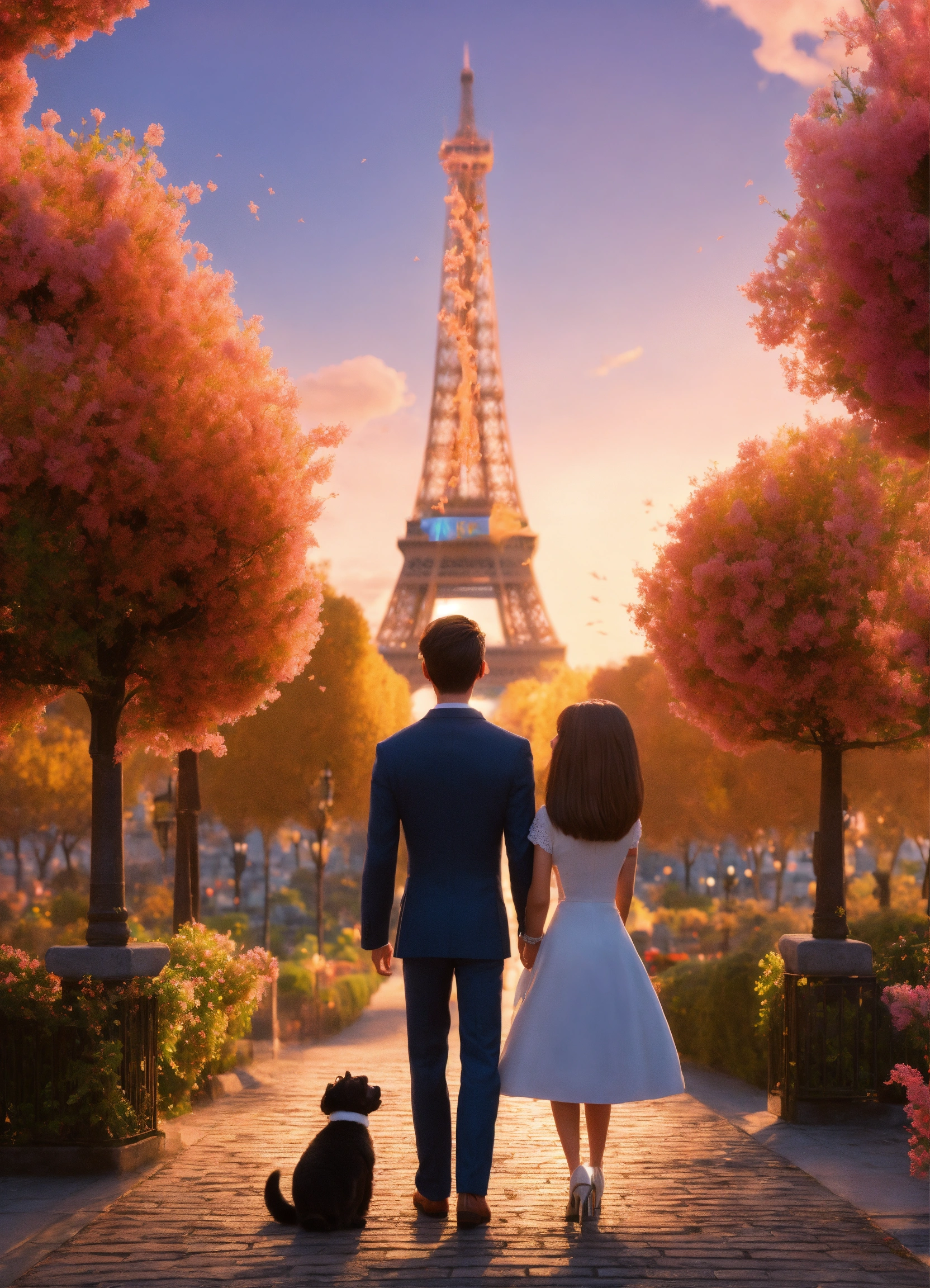 Crea al estilo animación de 3d de pixar una imagen de unos novios brazados, besándose, ella de estatura pequeña, de cintura estrecha y amplias caderas, piel blanca y pelo negro lacio, suelto y ondulado en las puntas. él alto, delgado de piel blanca y pelo negro un poco largo con una cola en su cabeza y con una barba bien tupida, de fondo la torre de parís.
