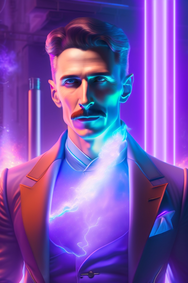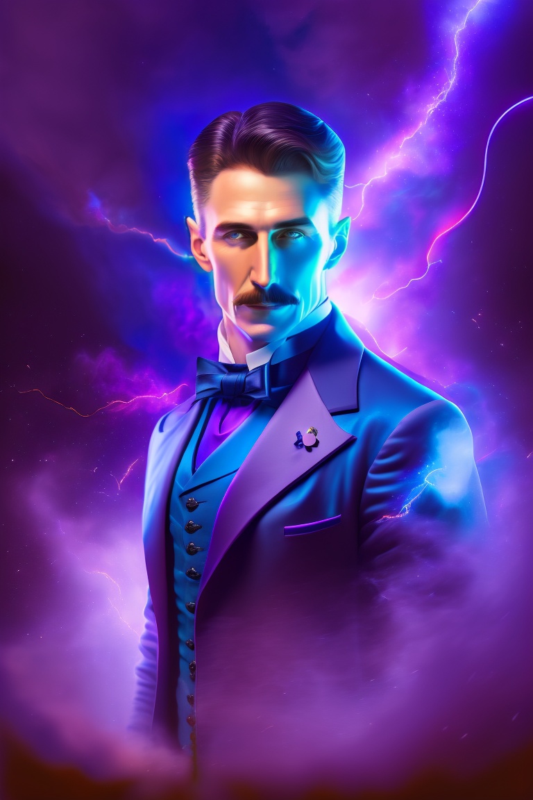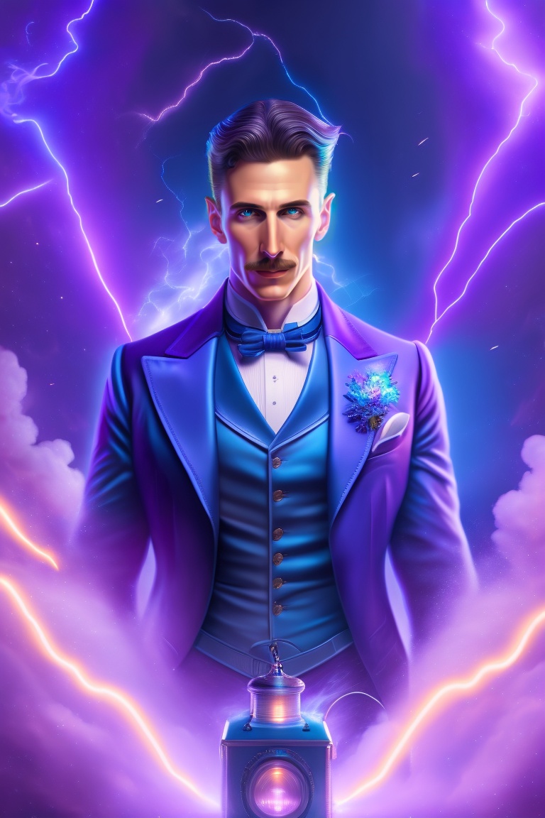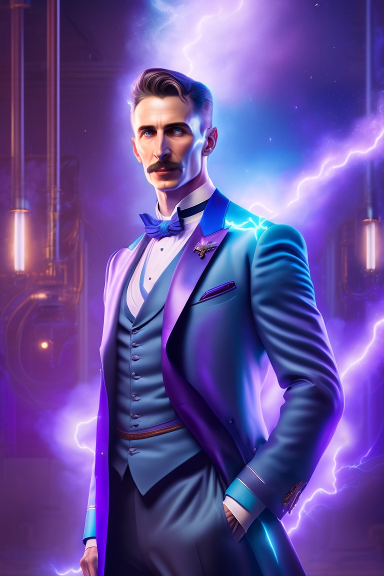 Subject: nikola tesla, surrounded by a mesmerizing display of electricity pouring from behind him. medium: hyper-realistic digital portrait with a sci-fi touch. composition: full-body portrait of tesla in a dynamic pose, arms slightly extended, with industrial laboratory backdrop and antique machinery. lighting: soft, ambient lighting highlighting tesla's face and the crackling electricity. color: cool tones dominated by blues, purples, and electric hues. mood: wonder and scientific marvel. camera setup: high-resolution dslr with a 50mm f/1.4 prime lens. aperture priority mode, low iso, and moderate shutter speed. sturdy tripod for stability. style: niji model version 5 with a mix of realism and sci-fi. special instructions: create dynamic and mesmerizing electricity effects. include tesla's iconic bowtie and fashion style. goal: capture tesla's visionary genius and the awe-inspiring power of electricity in a futuristic setting.
