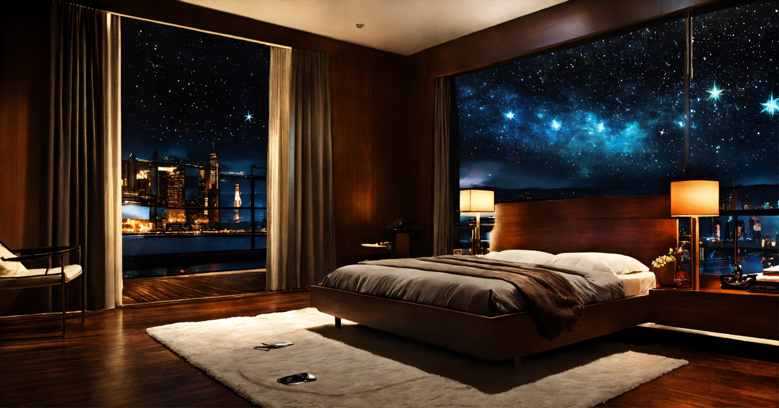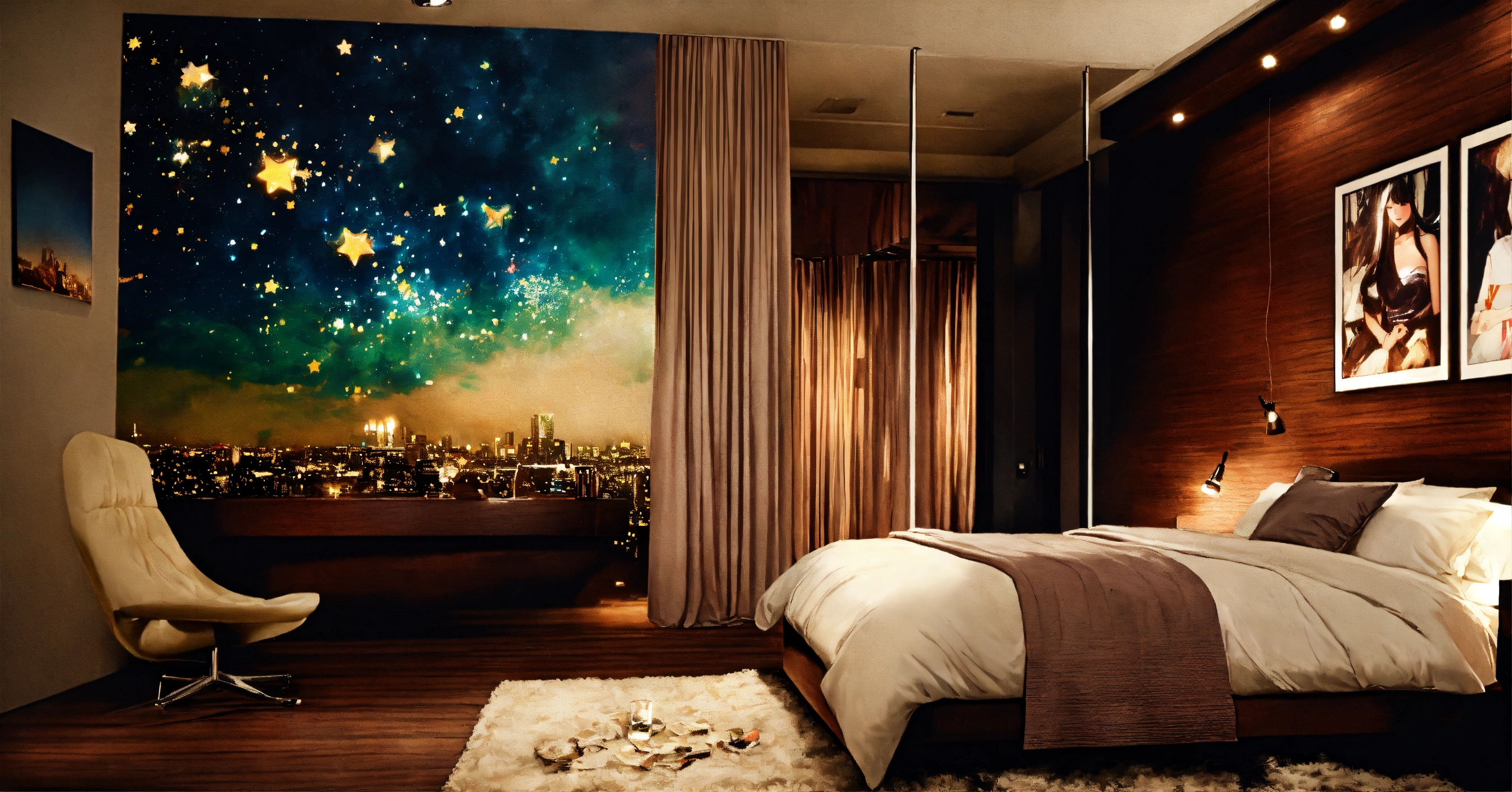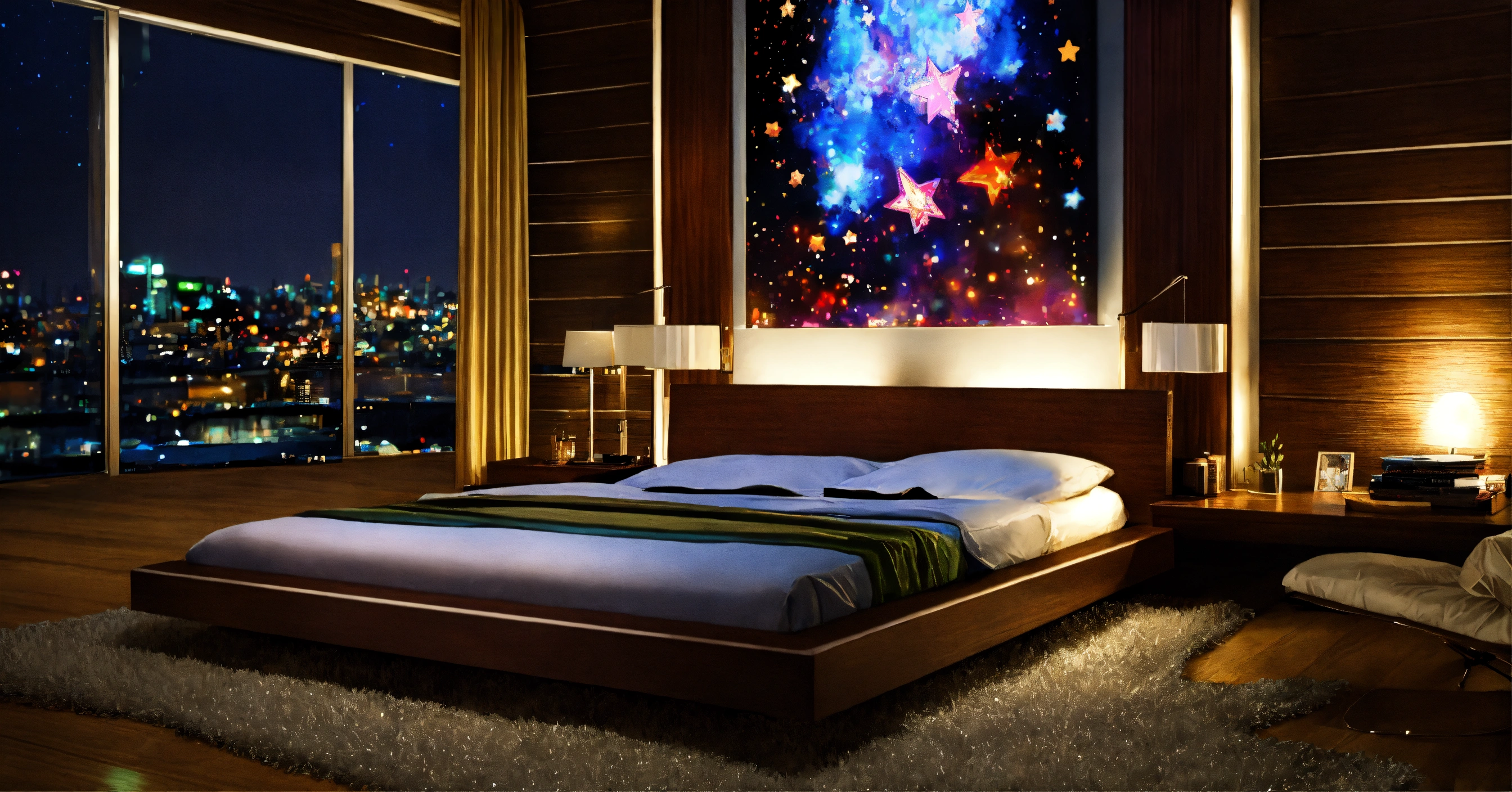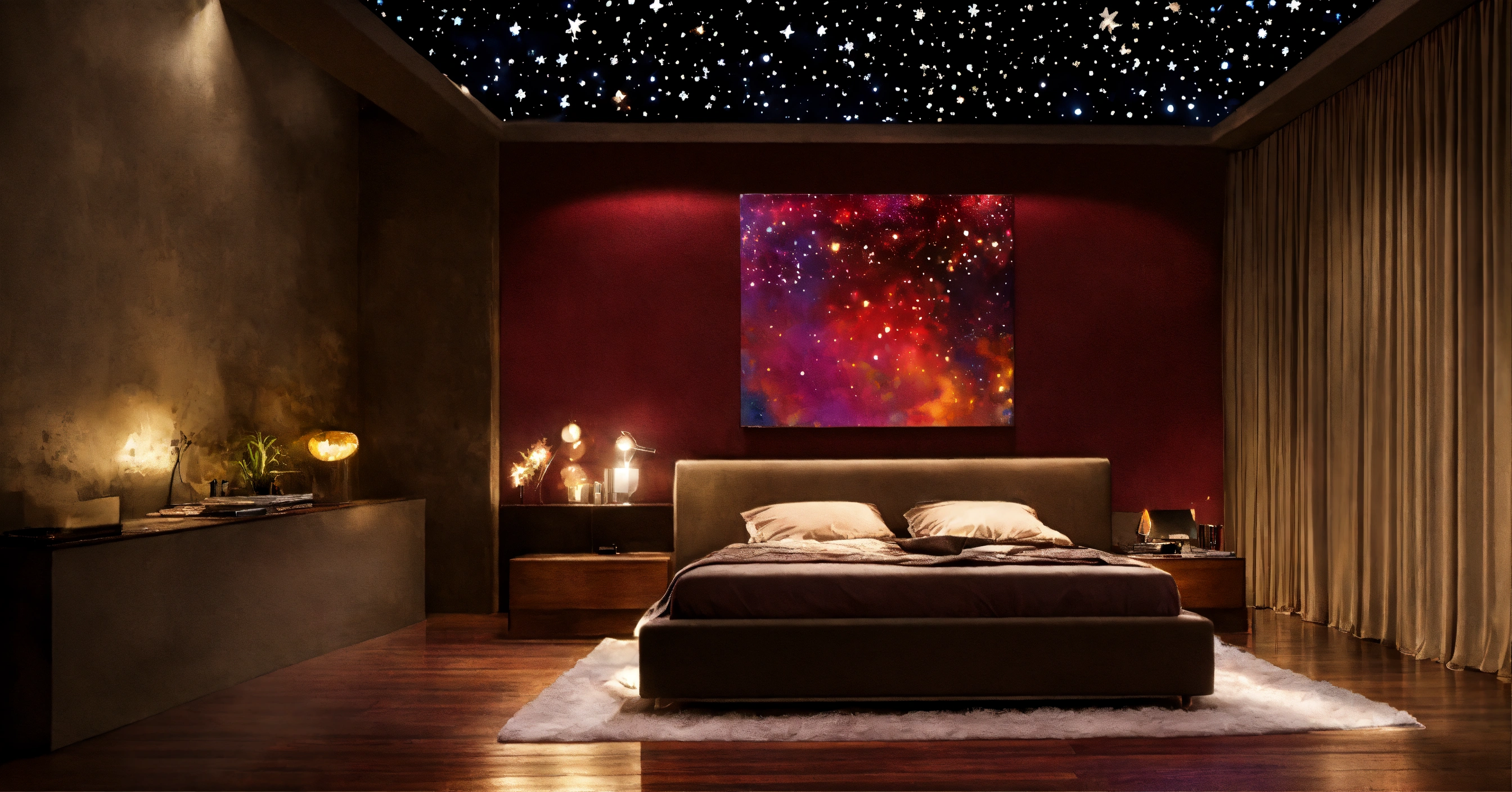 Dark colored bedroom cool night celiing with stars fluffy rug dark wood big bed romantic grafitti