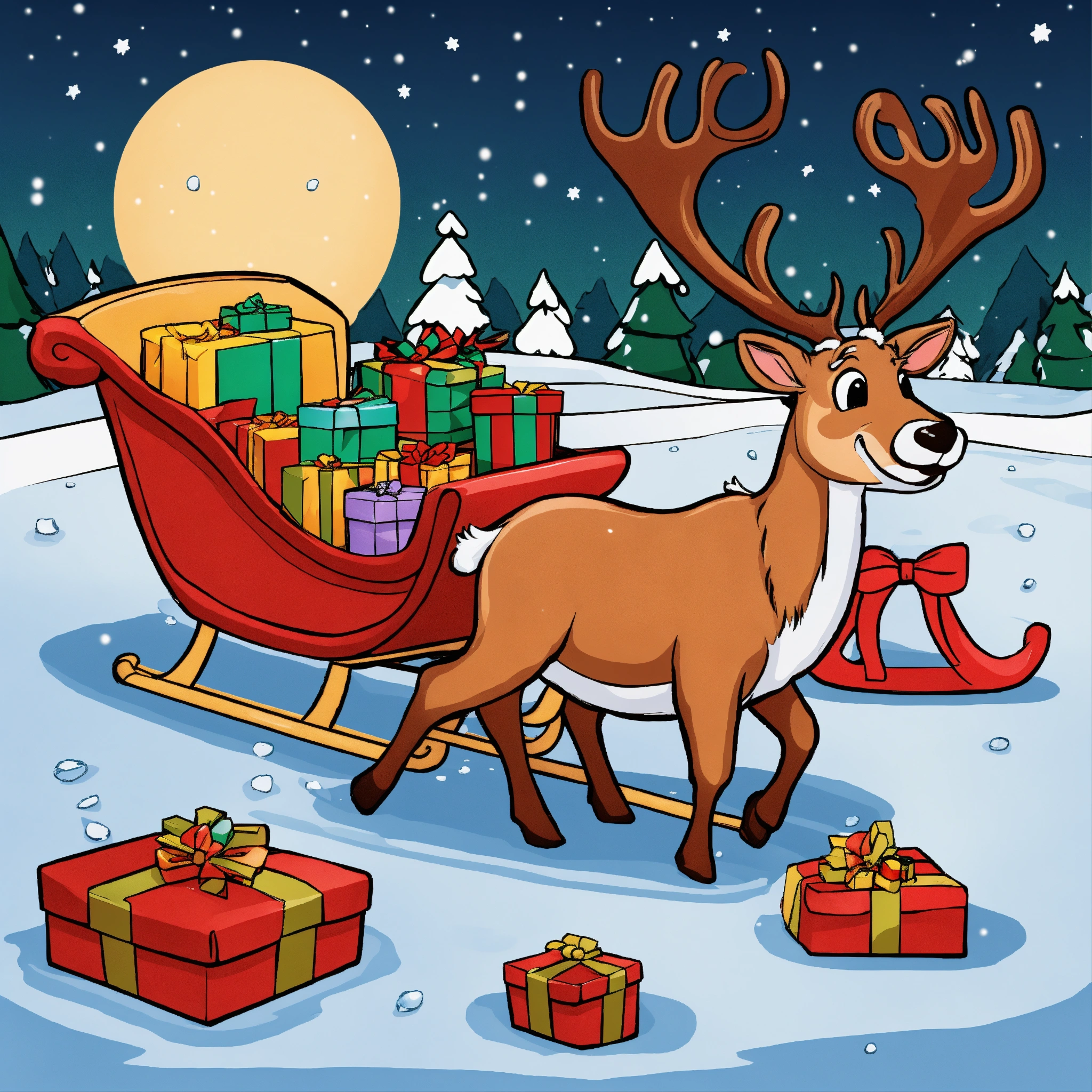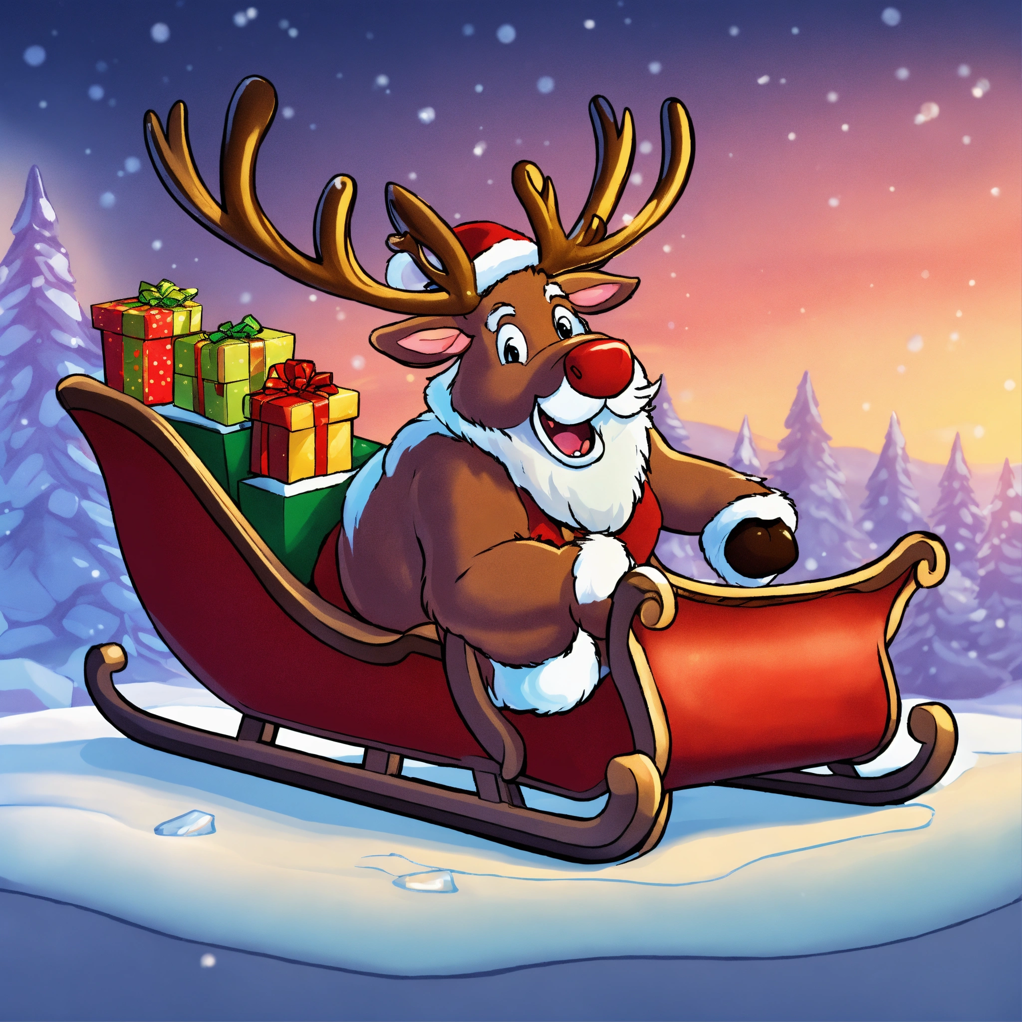 lying down on ice in front of sleigh full of gifts