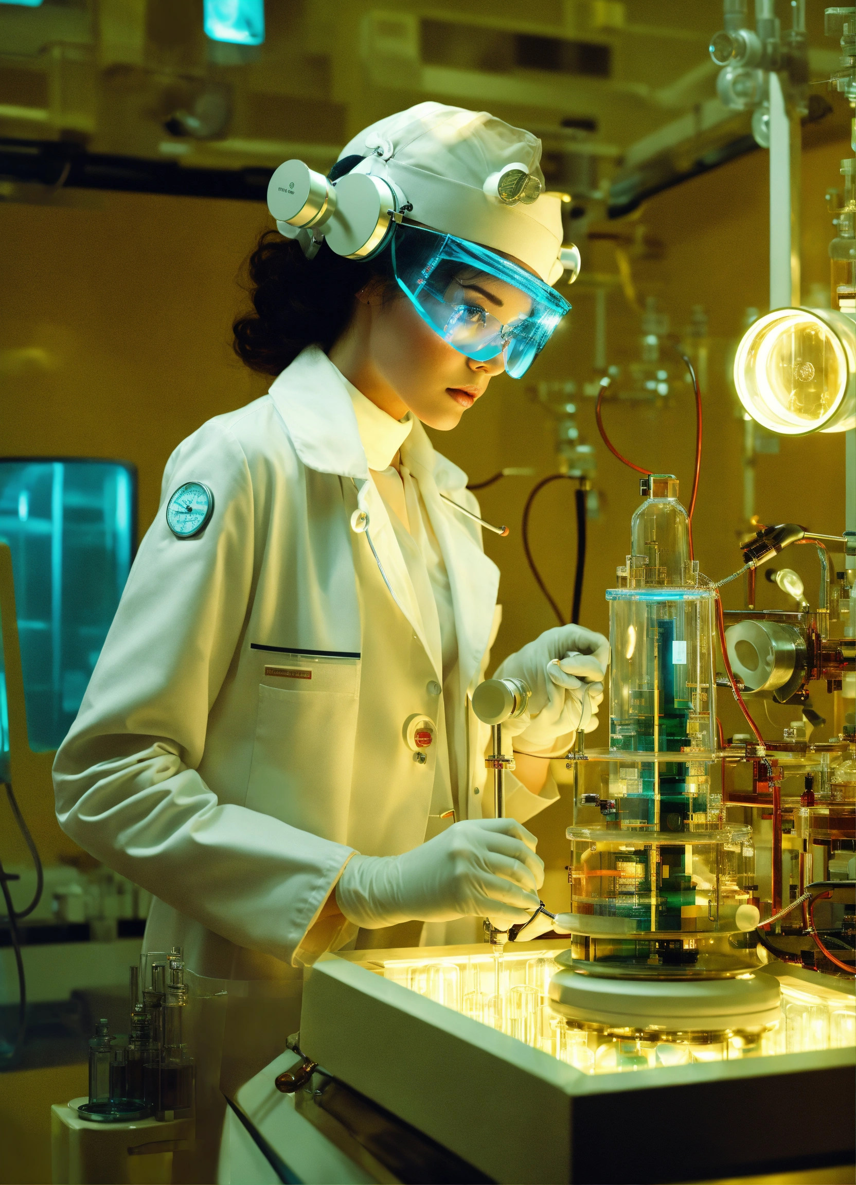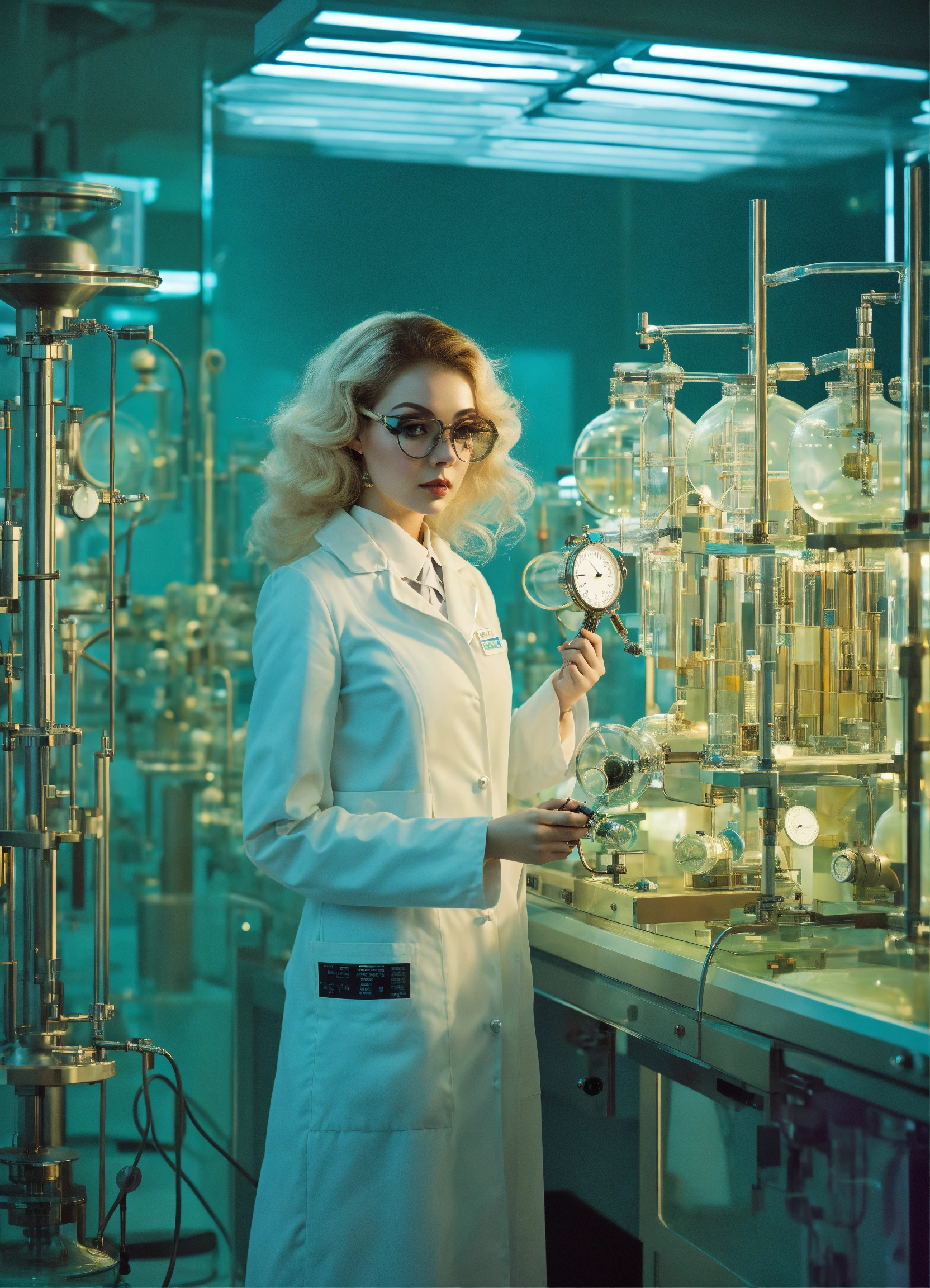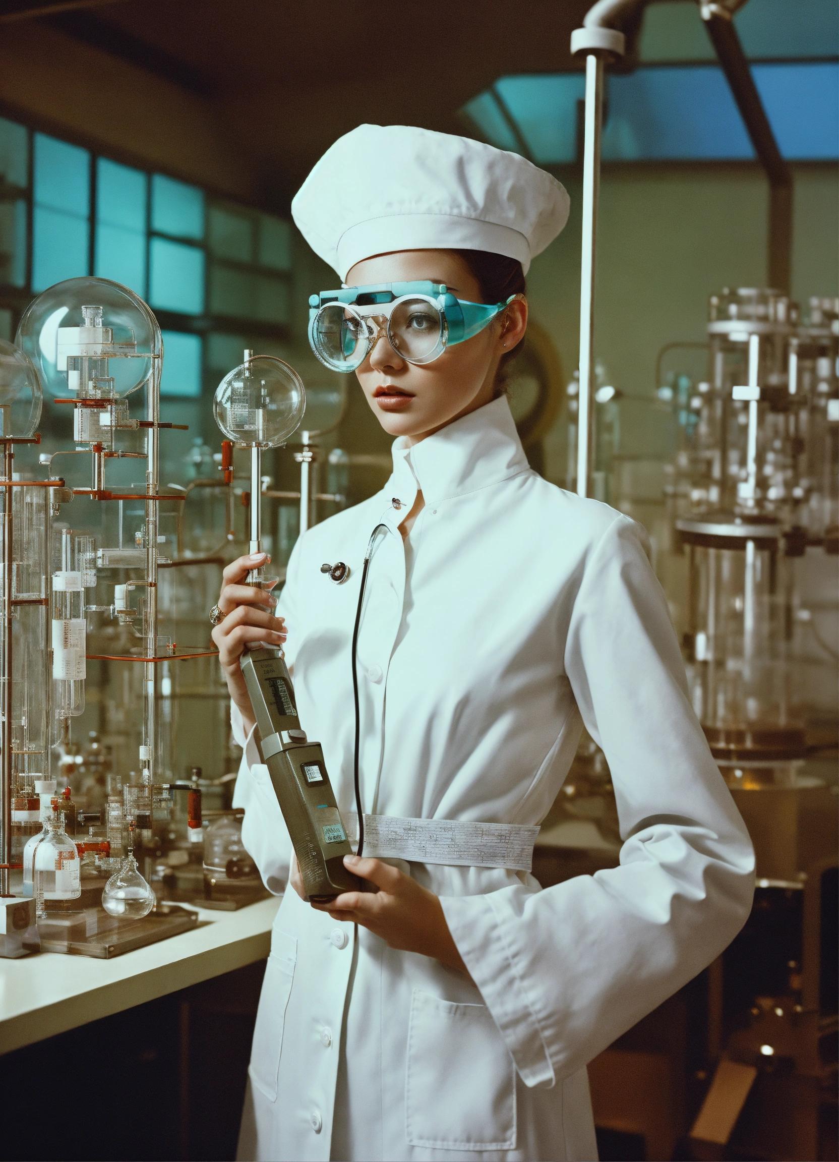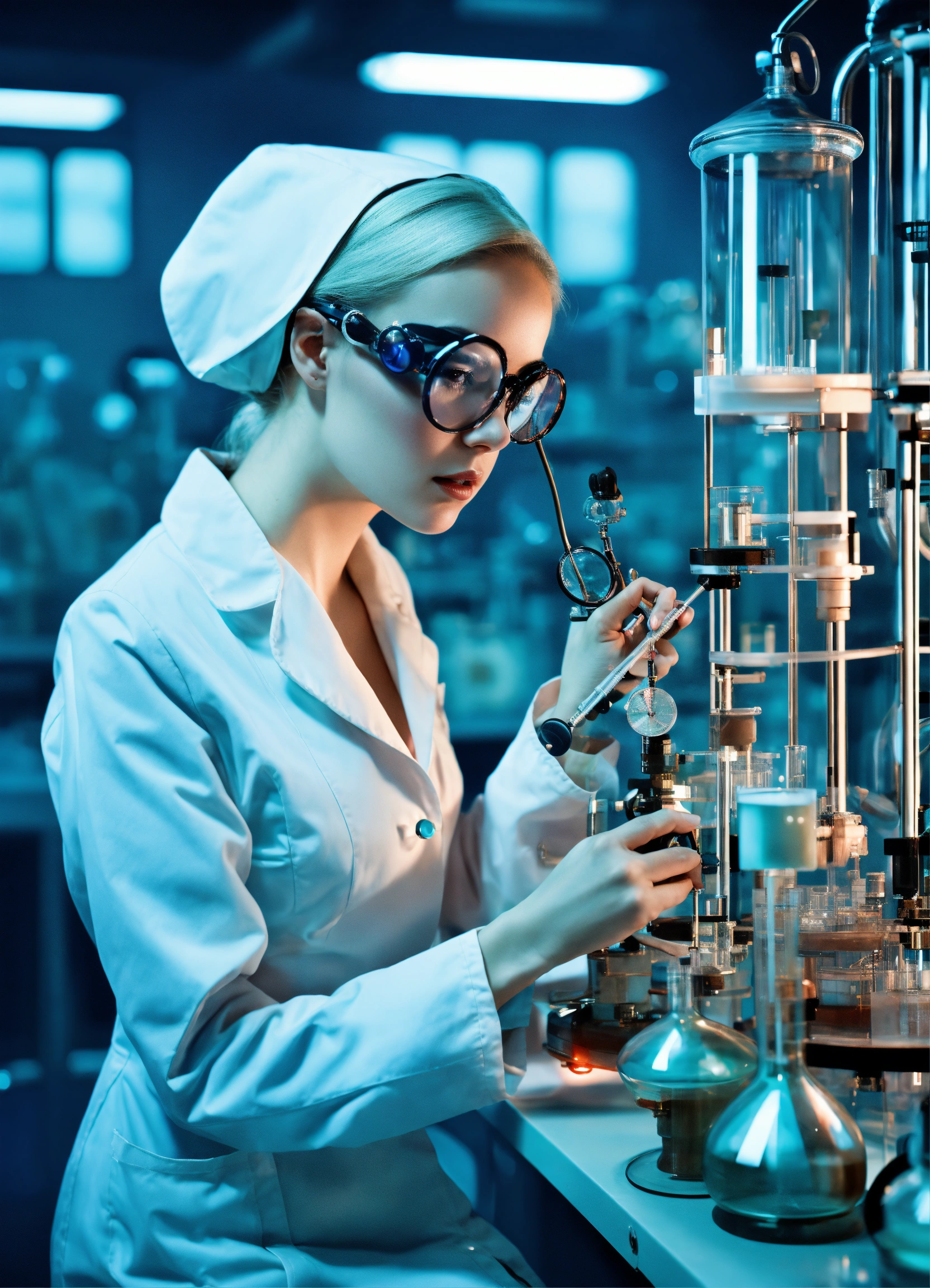 Photography in a futuristic sci fi laboratory, 60's gorgeous night nurse woman in short white coat with stethoscope, wearing large transparent glasses, handling a measuring instrument in a laboratory full of glass stills and machines, preparing an experience, 80 degree view, art by sergio lopez, natalie shau, james jean and salvador dali