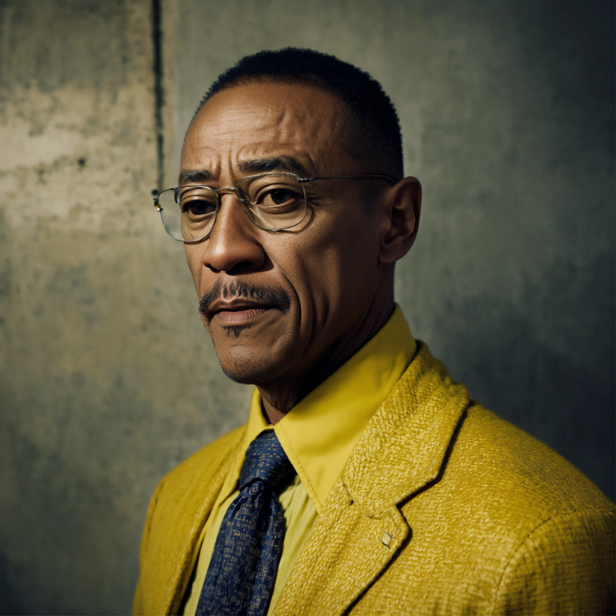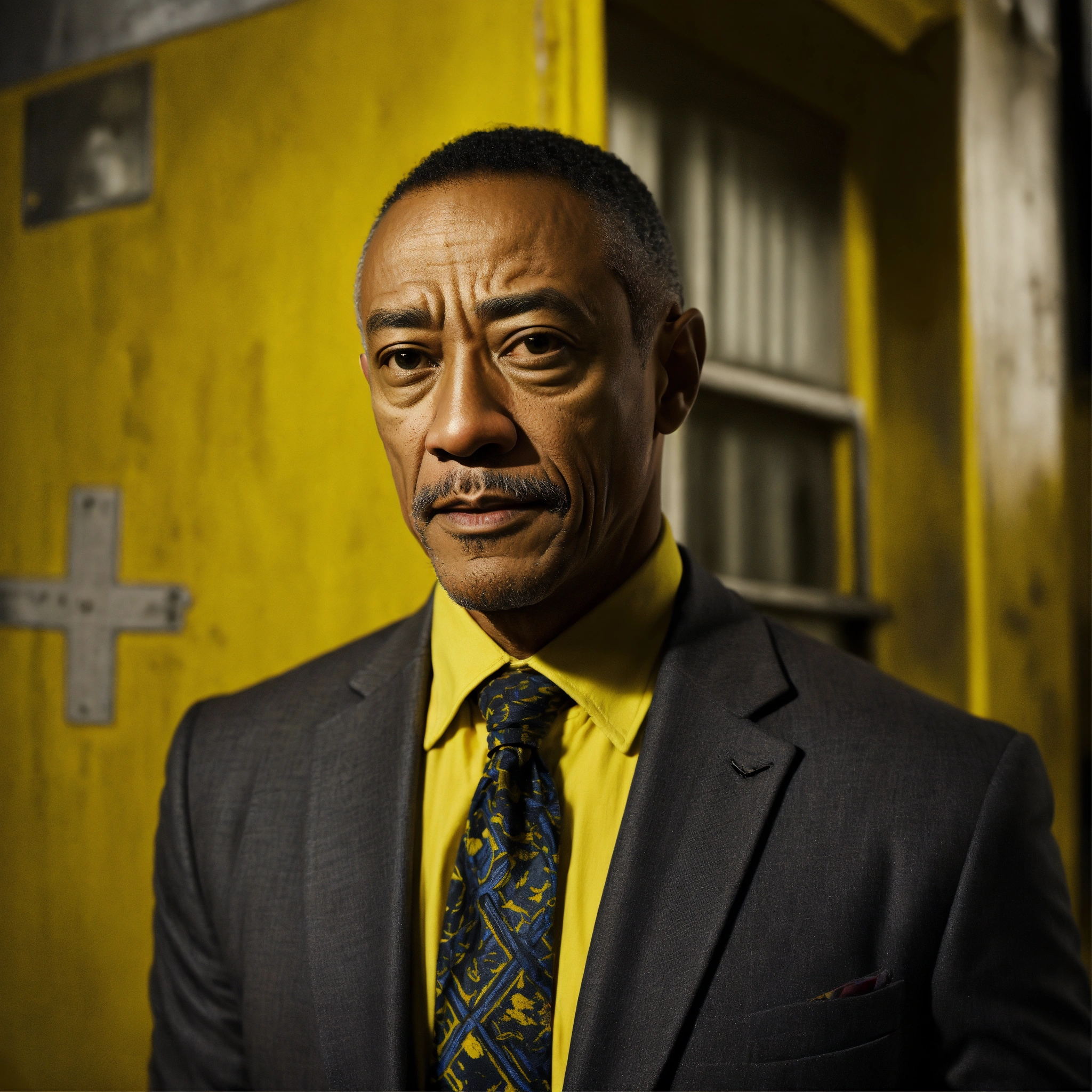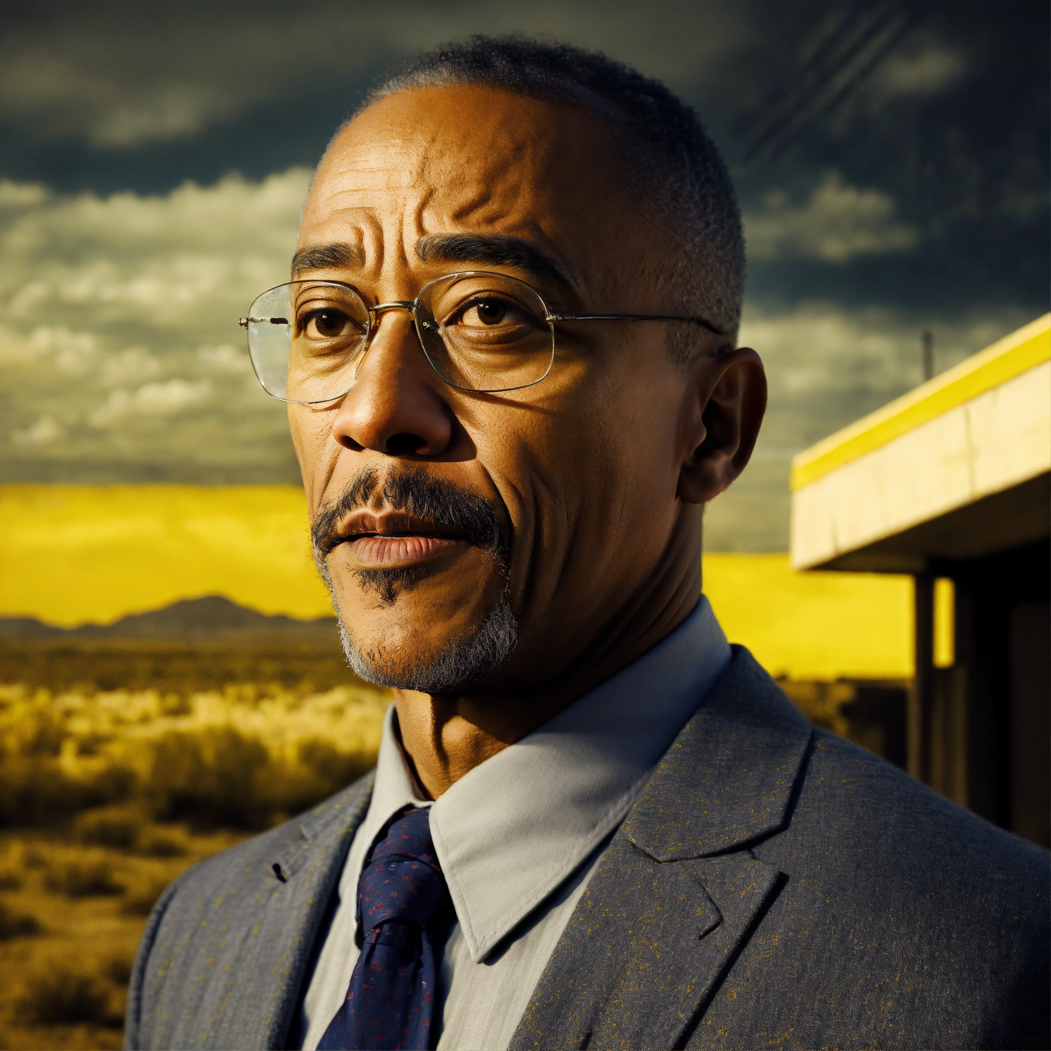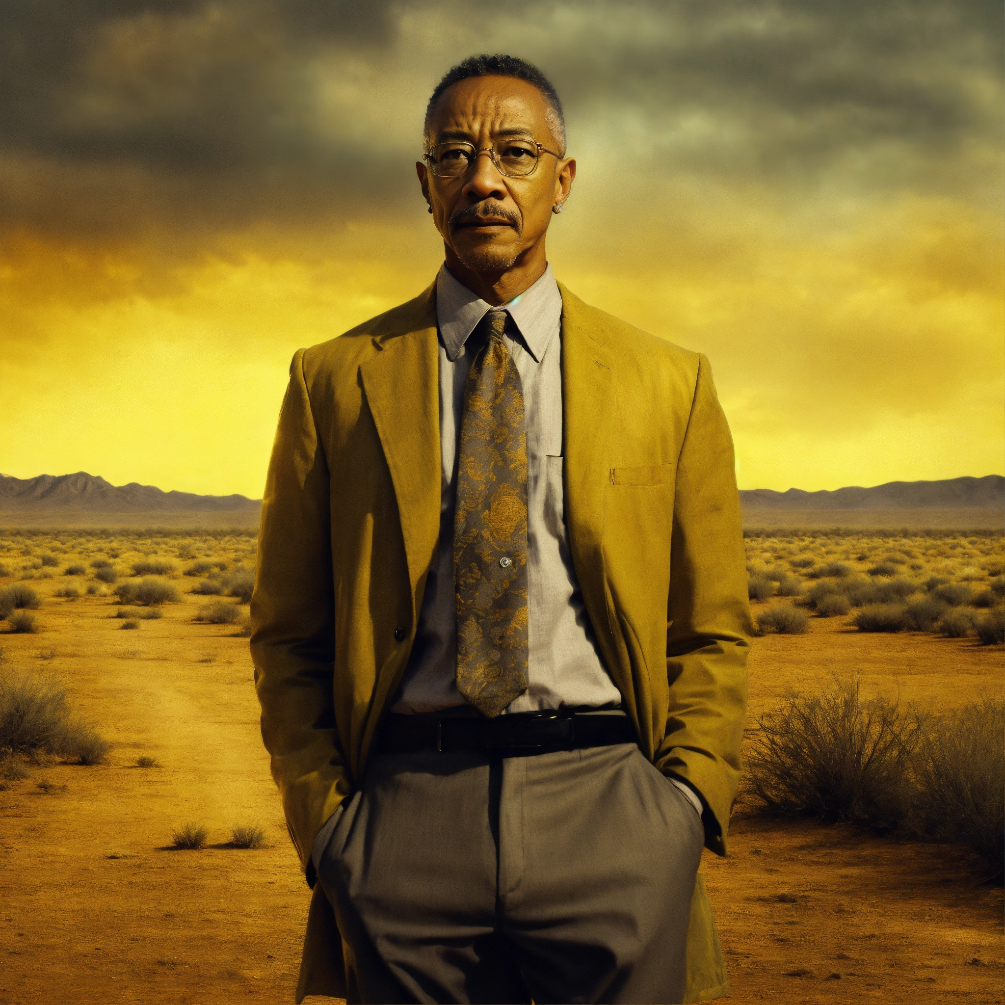 Giancarlo esposito, gus fring, impressionism, moody, breaking bad, desolate wasteland, yellow shirt, grey suite, profile picture