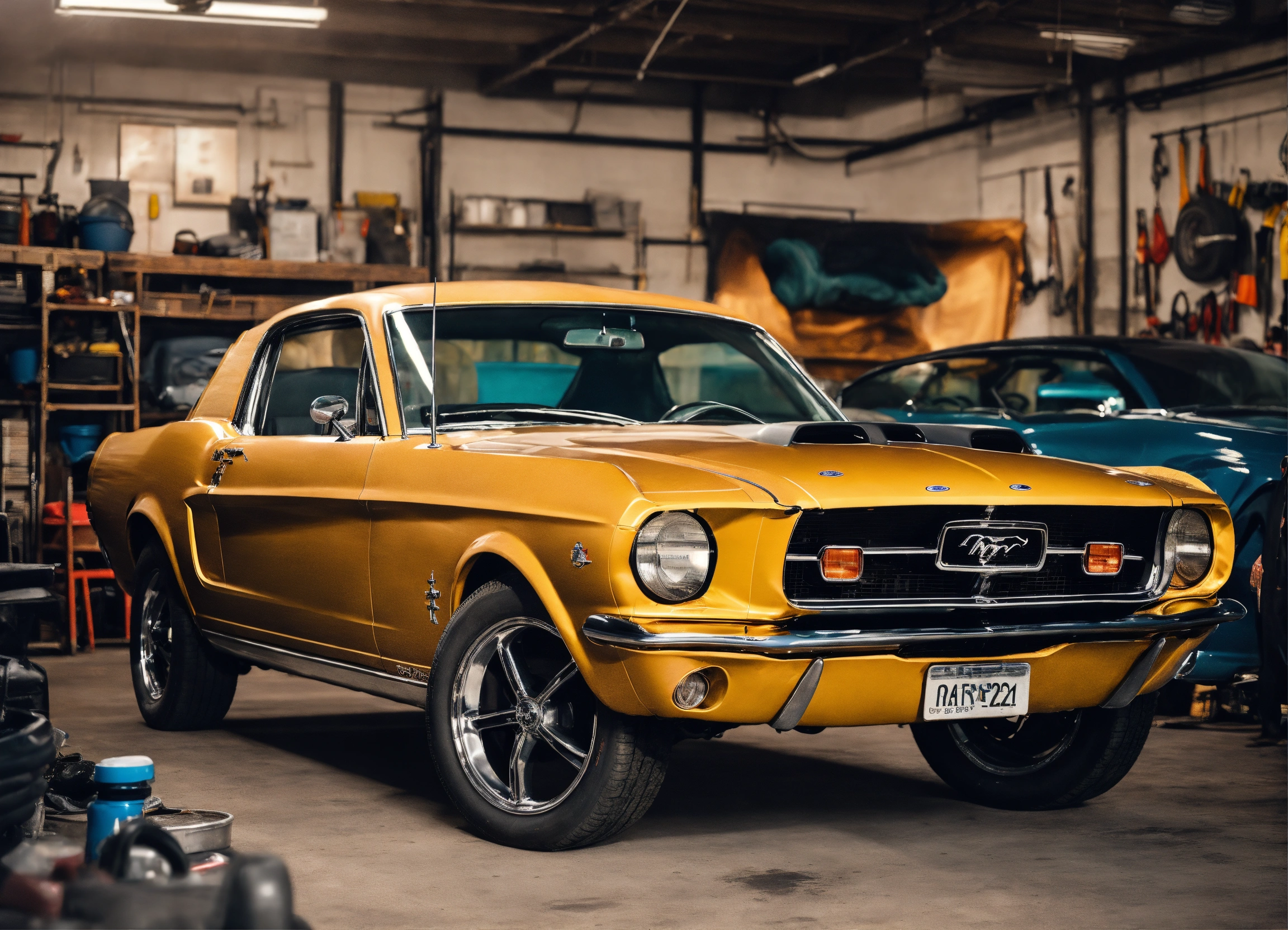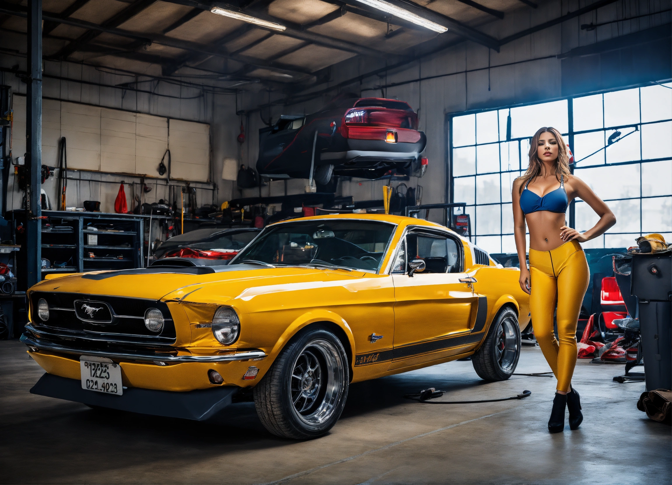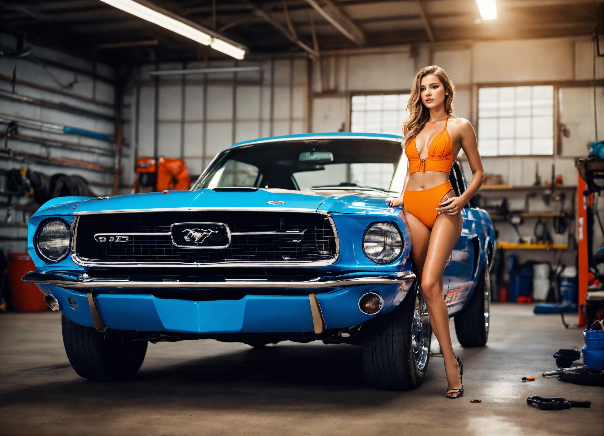 Fashion model swimwear shooting in a commercial auto repair garage, no cars inside, modern, hyper realistic detailed photograph, ford mustang 2023