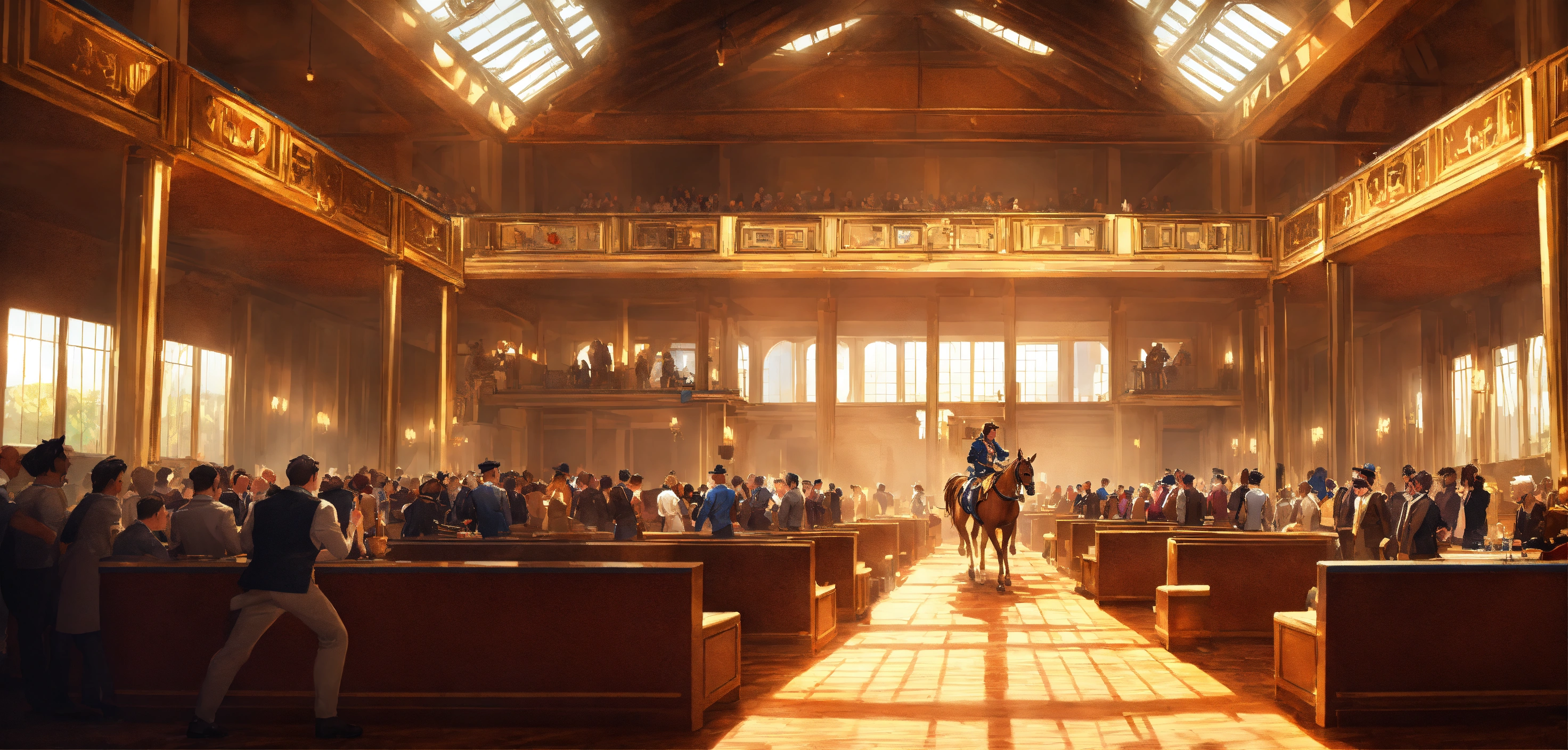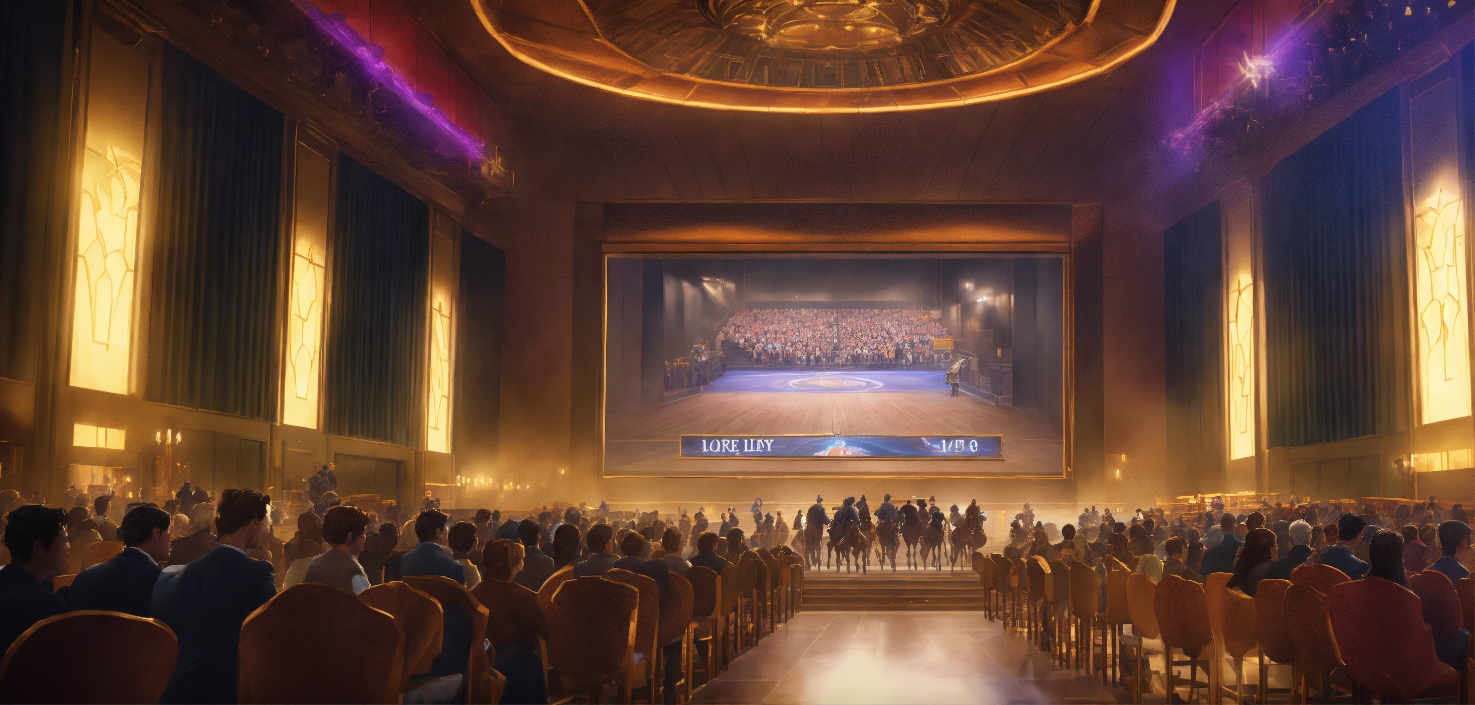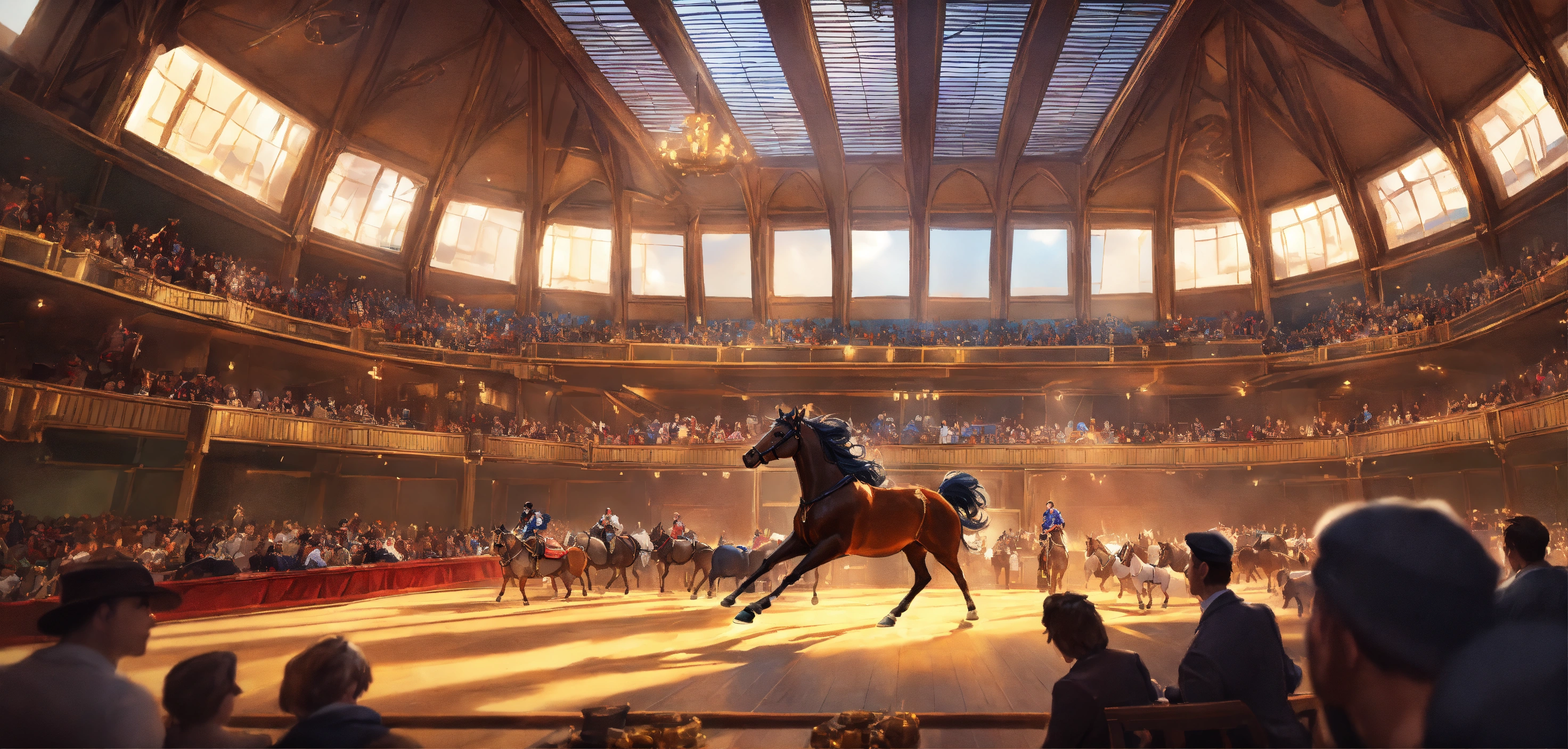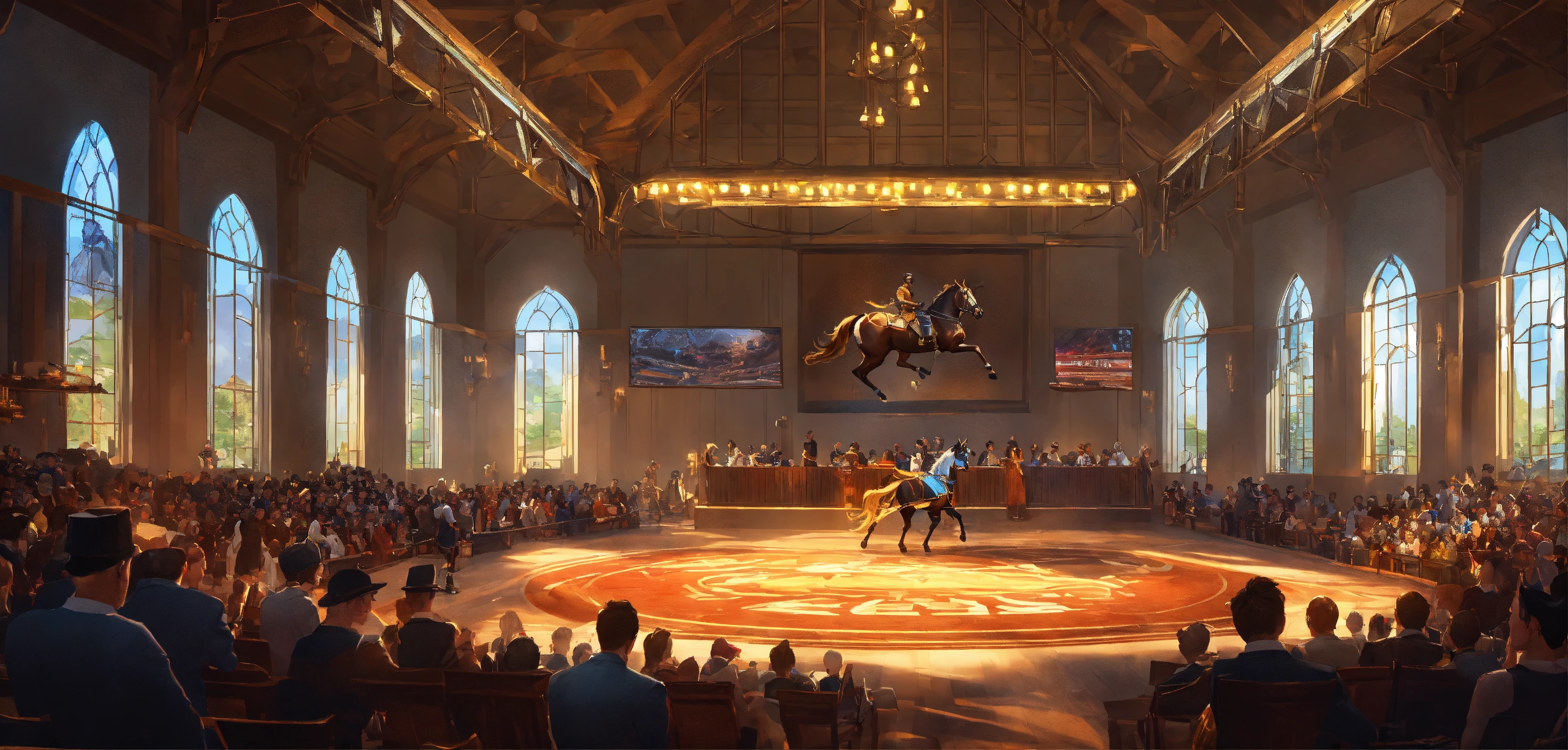 A highly detailed league of legend dynamic illustration of the horse auction in modern event hall by joshua raphael, by artgerm, by huyy nguyen, by cj xander, by jennifer wuestling, by diep duong van, by huyy nguyen, by grafit studio, volumetric lighting, 3d render, 4k resolution, trending on artstation, masterpiece, close up frame, cinematic shot, sport competition, epic, keeneland sales, inside hall with stands, lot of armchairs with people, one horse in centre only, evening, hall without windows
